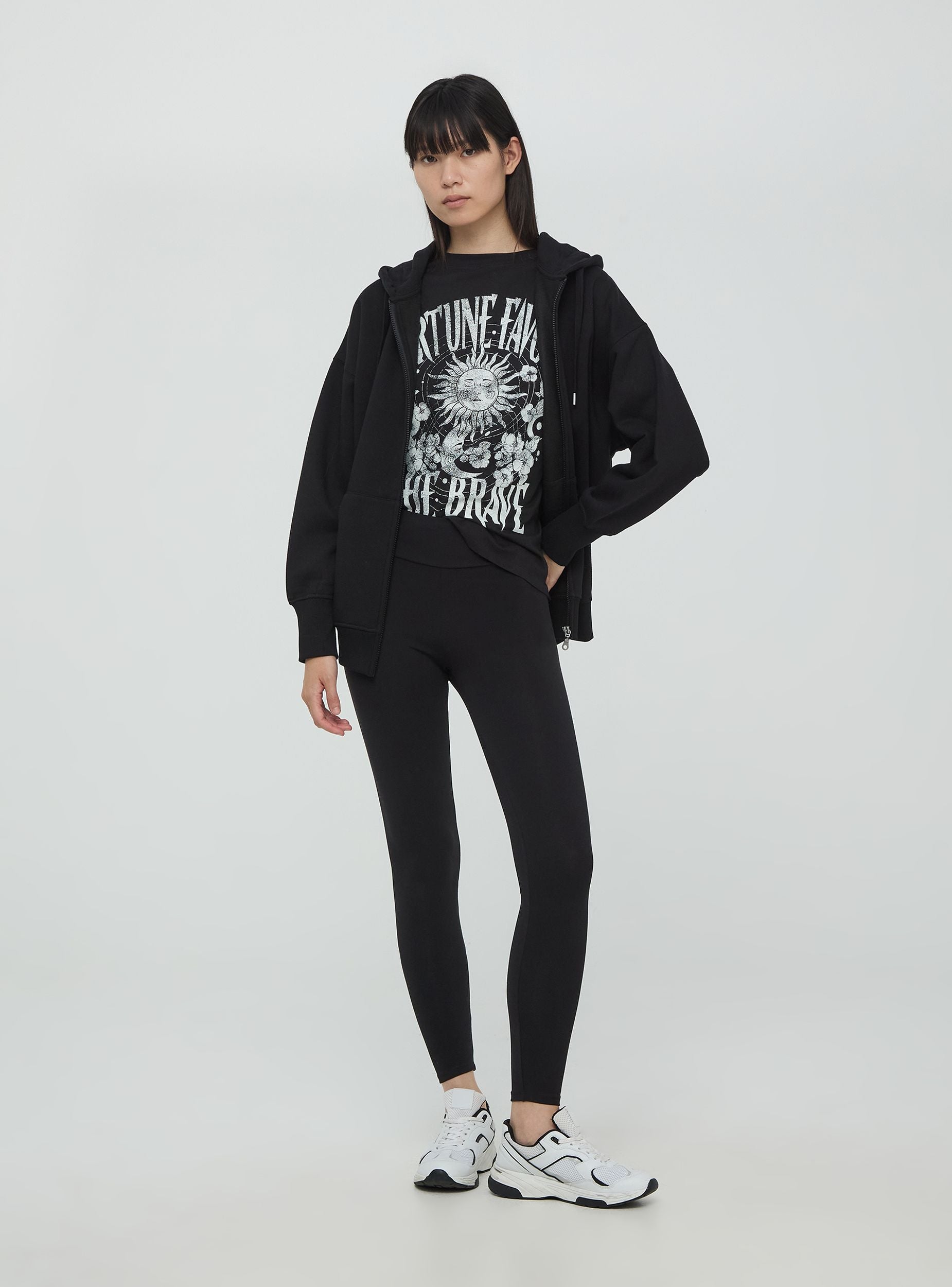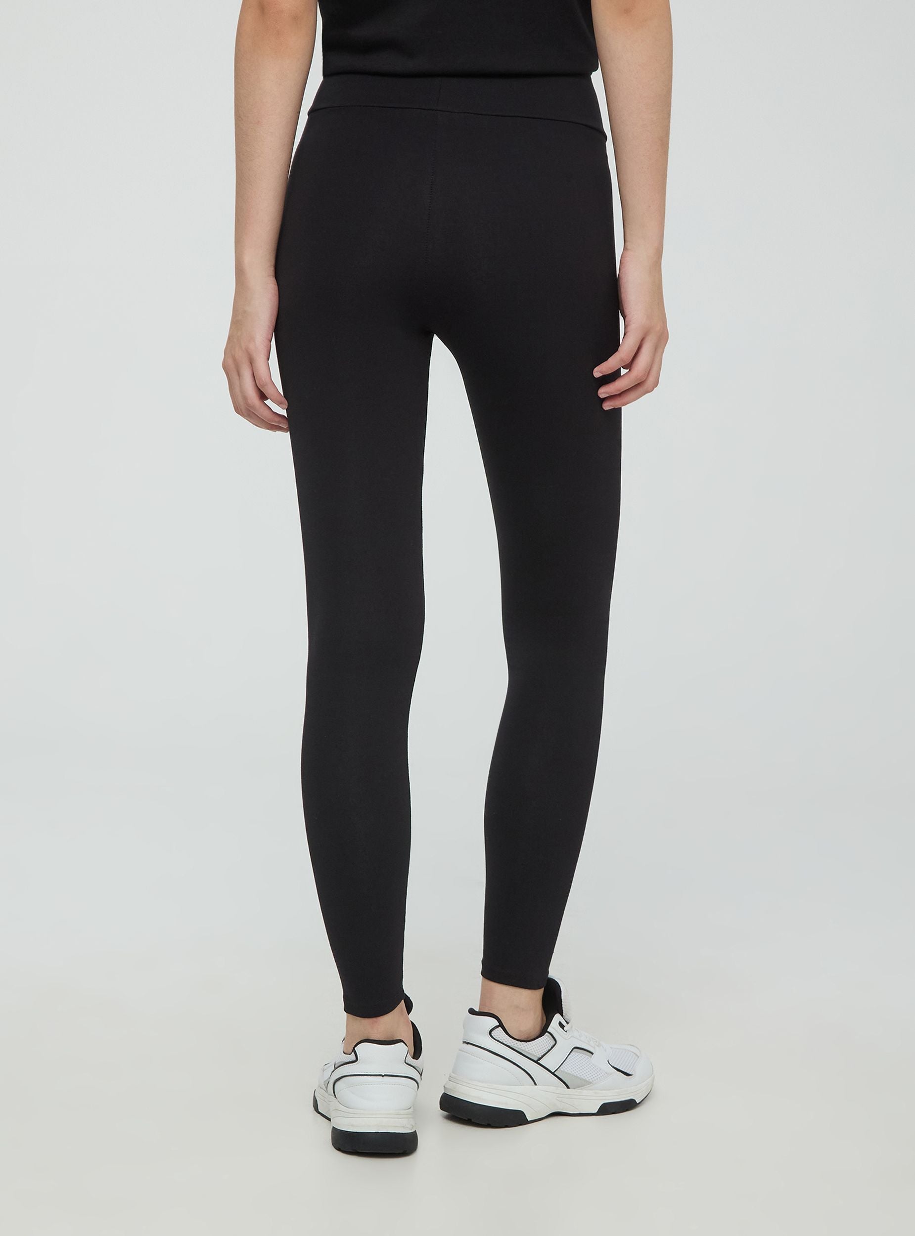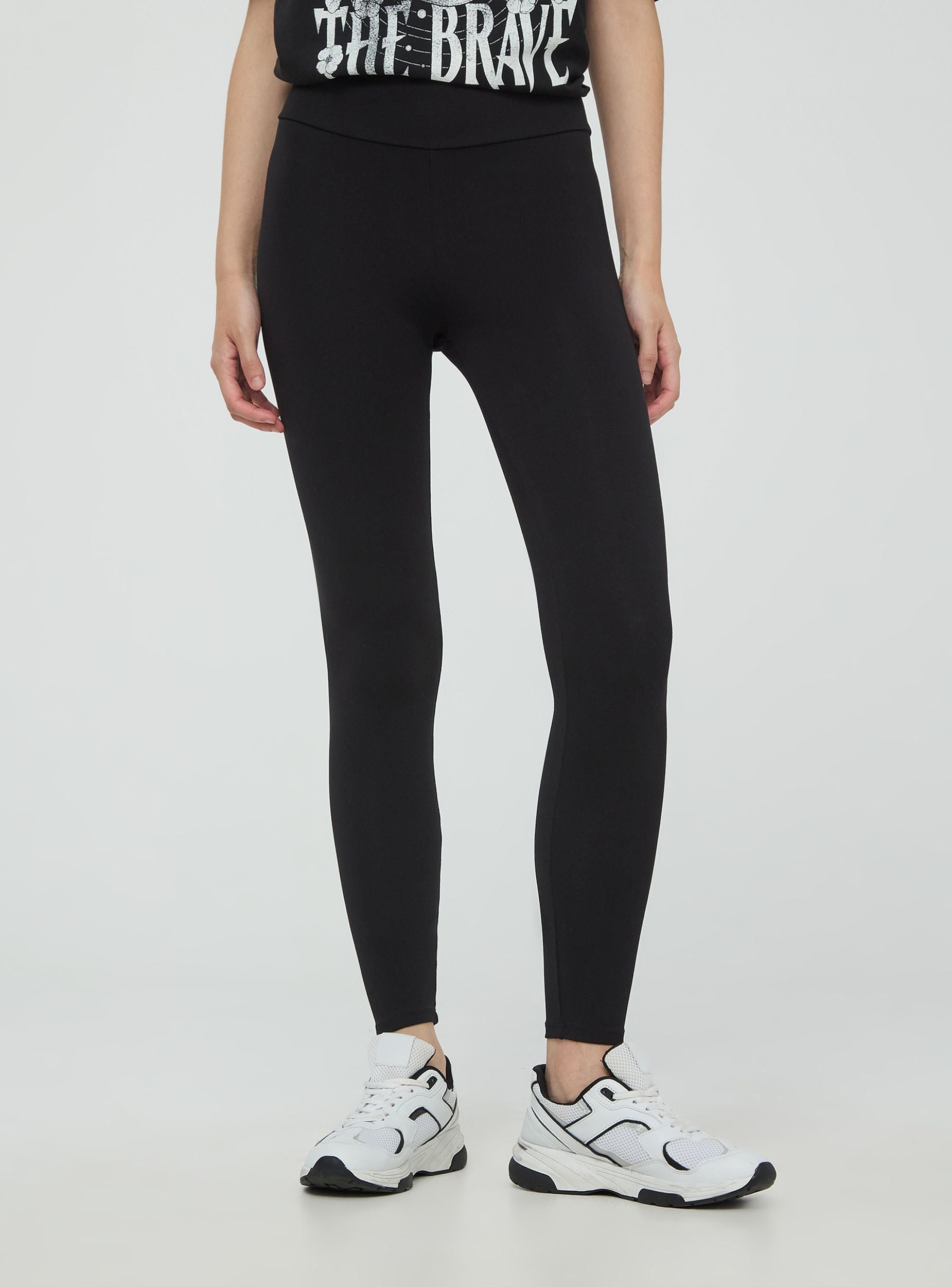 High-waisted women's leggings made from heavy stretch fabric in solid colours. They offer a snug and comfortable fit, perfect for everyday wear and sports activities, ensuring support and freedom of movement.