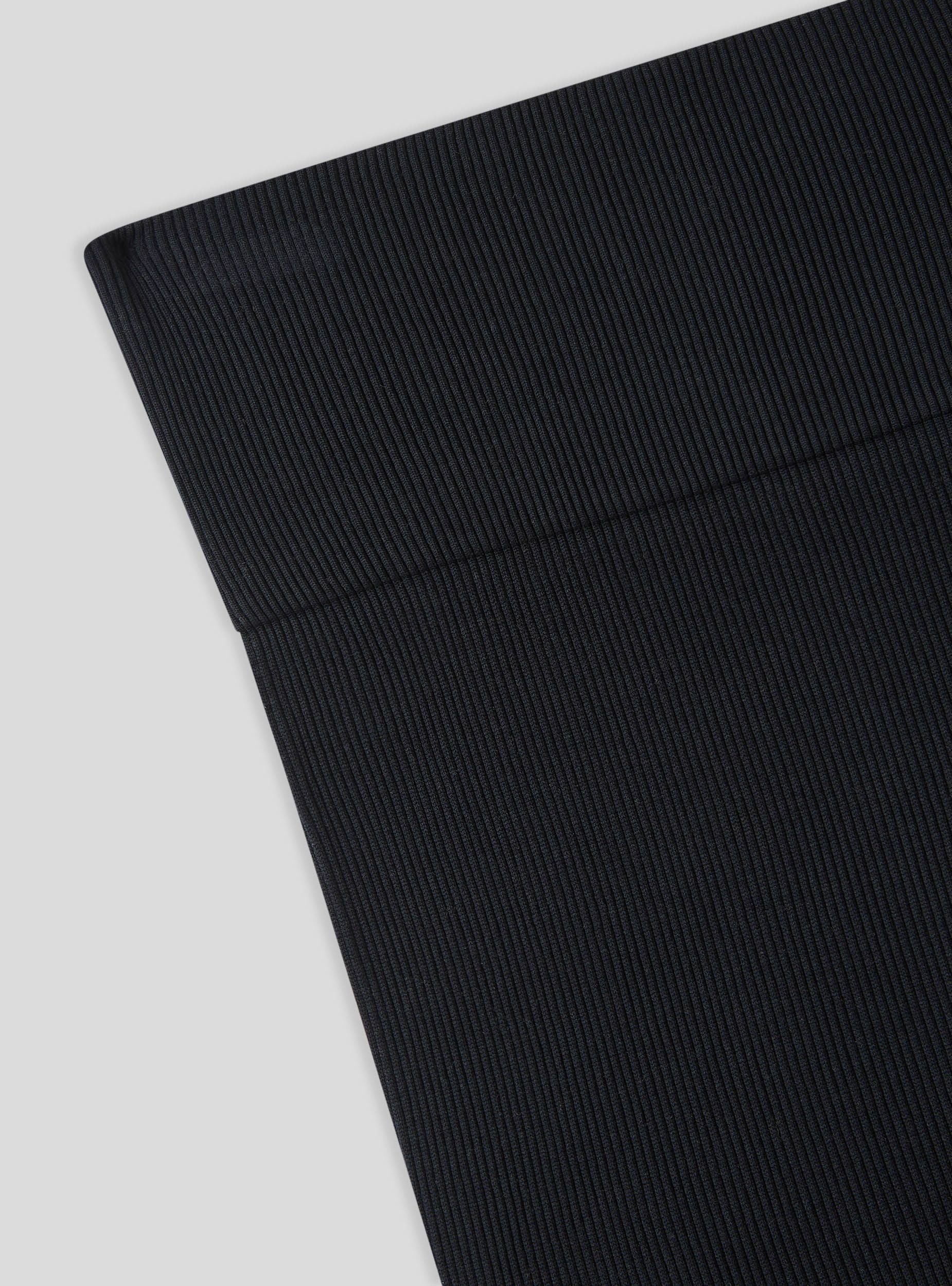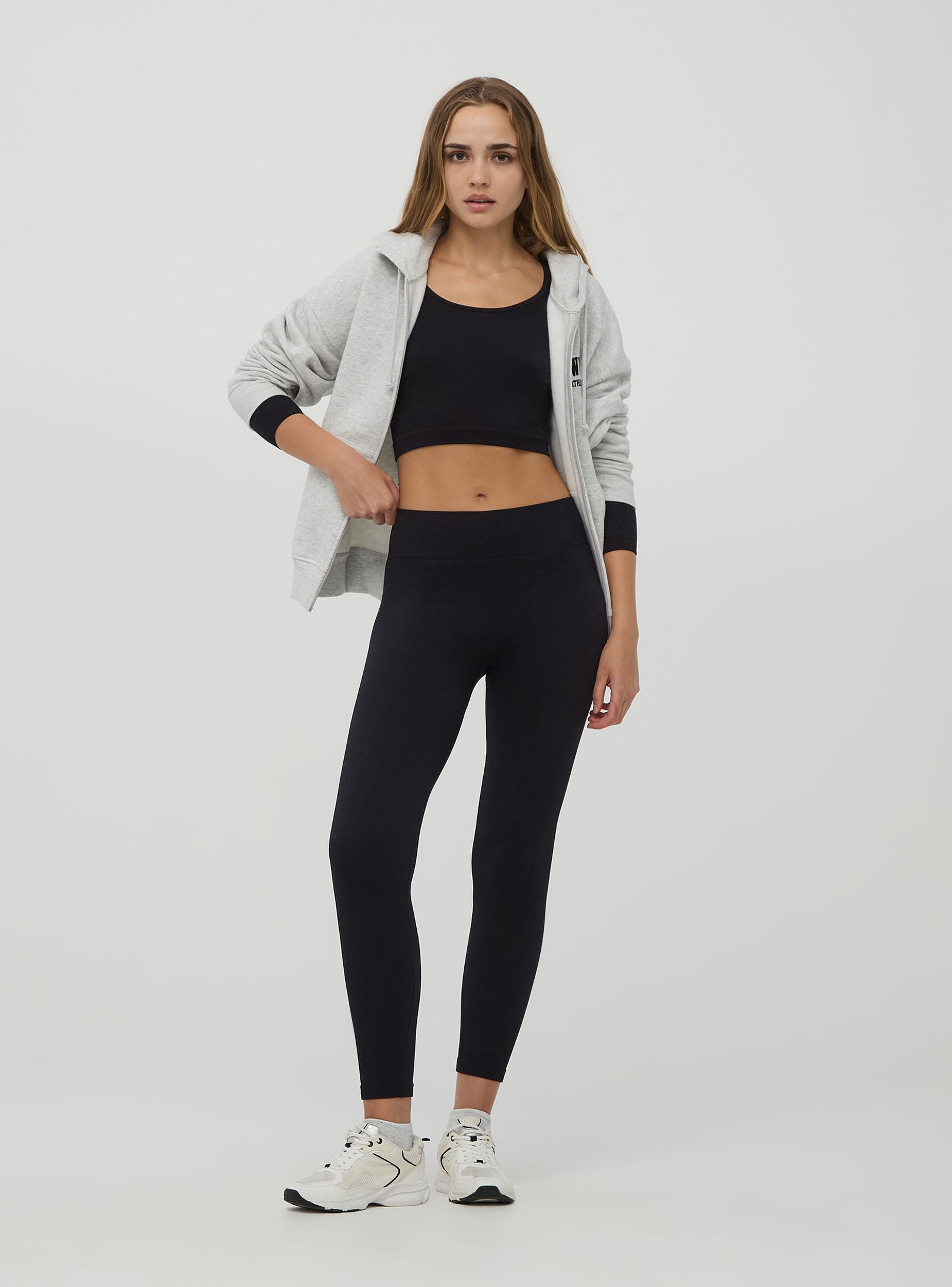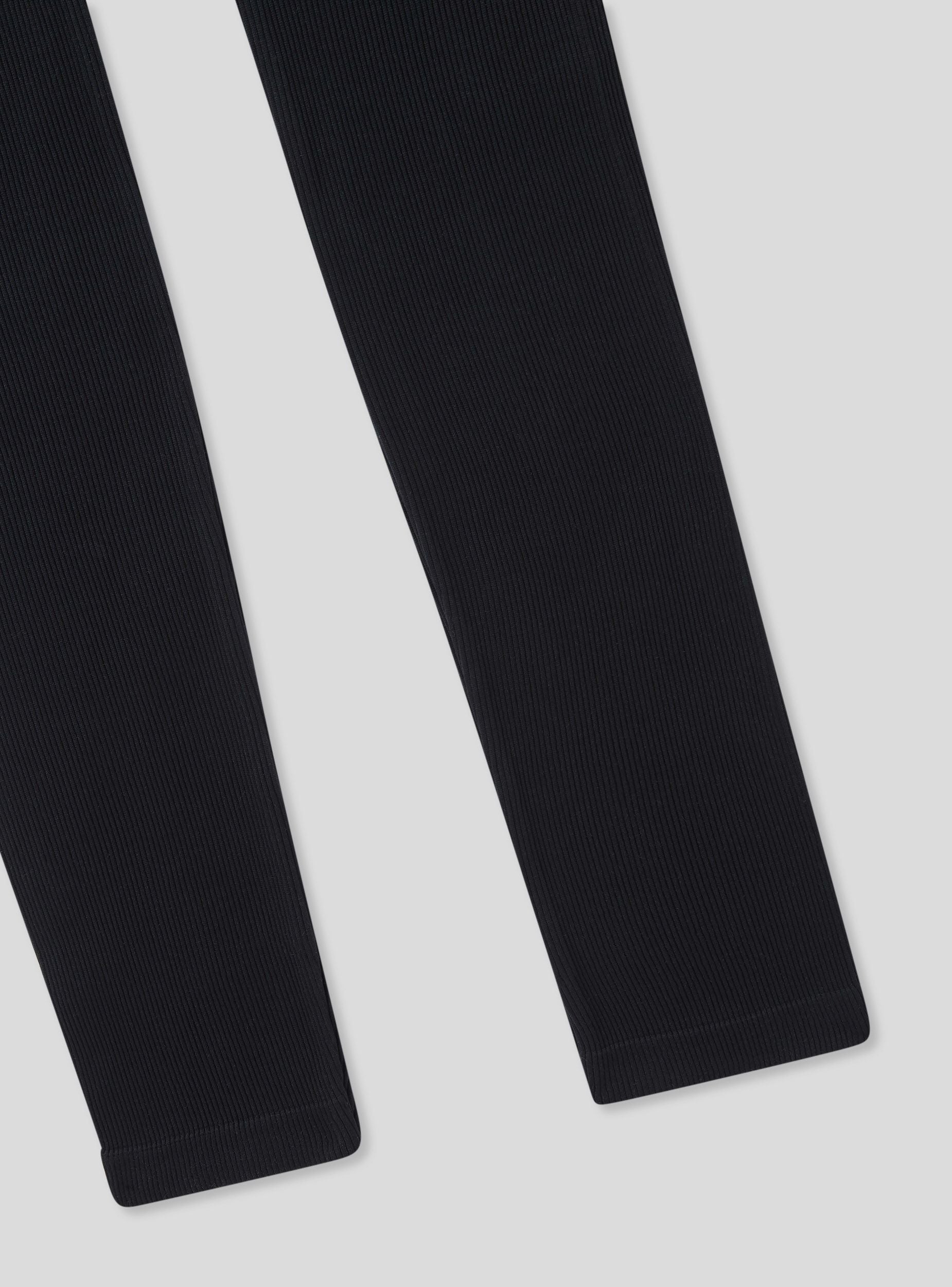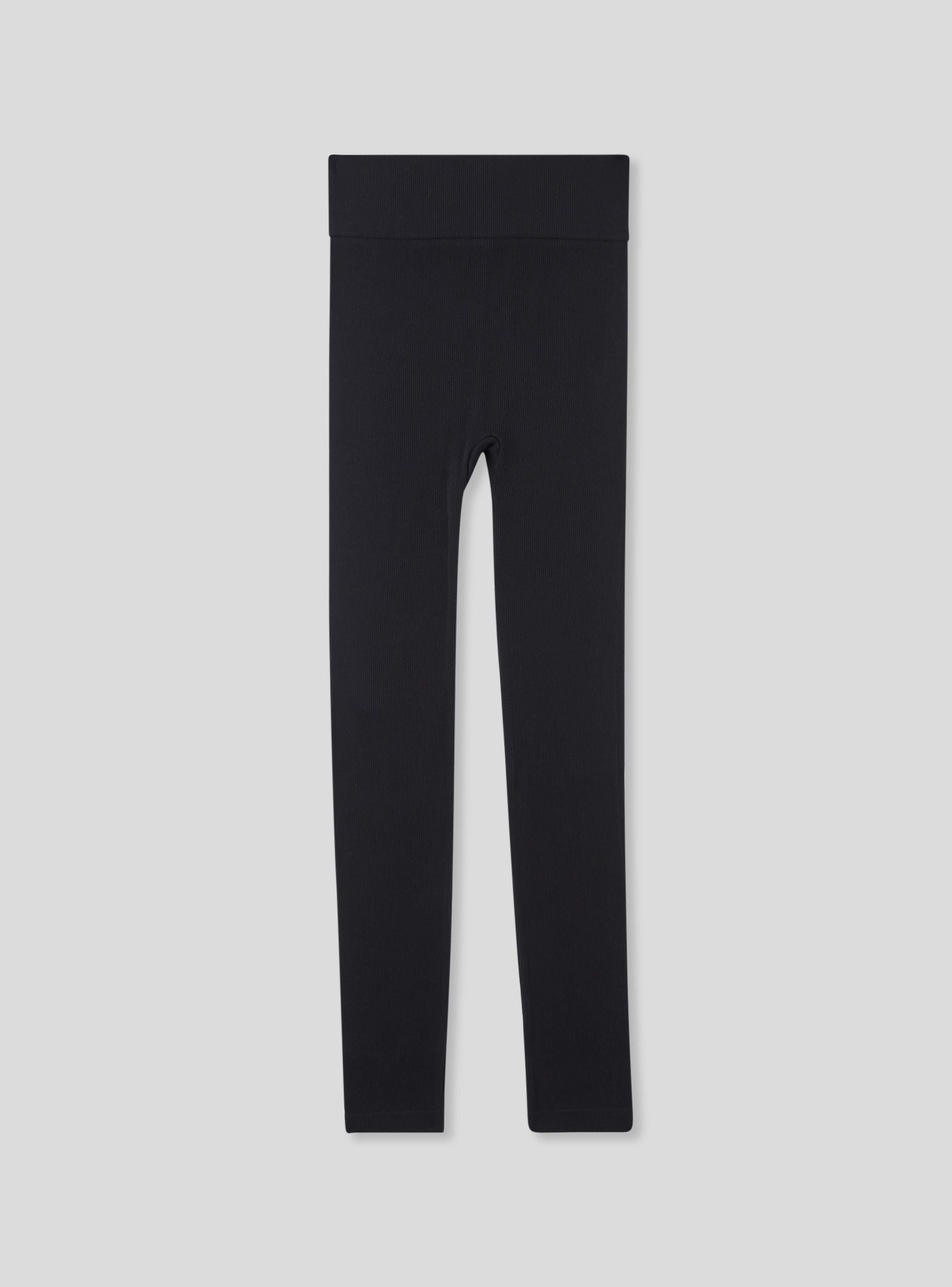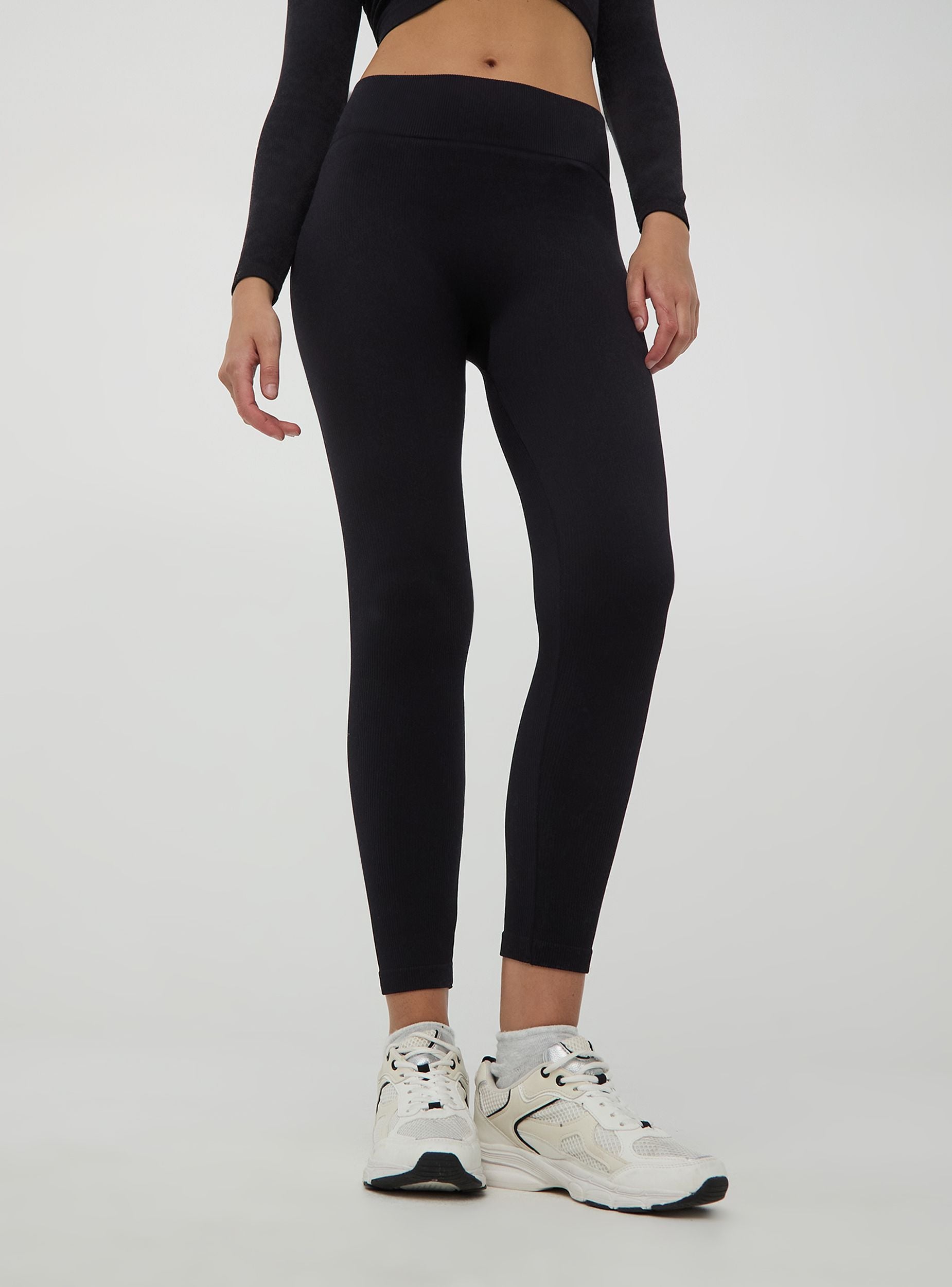 High-waisted long women's leggings with waistband. Made from solid-colour stretchy ribbed fabric. Seamless design for excellent comfort. Perfect for a casual look or for training. Fitted style.
