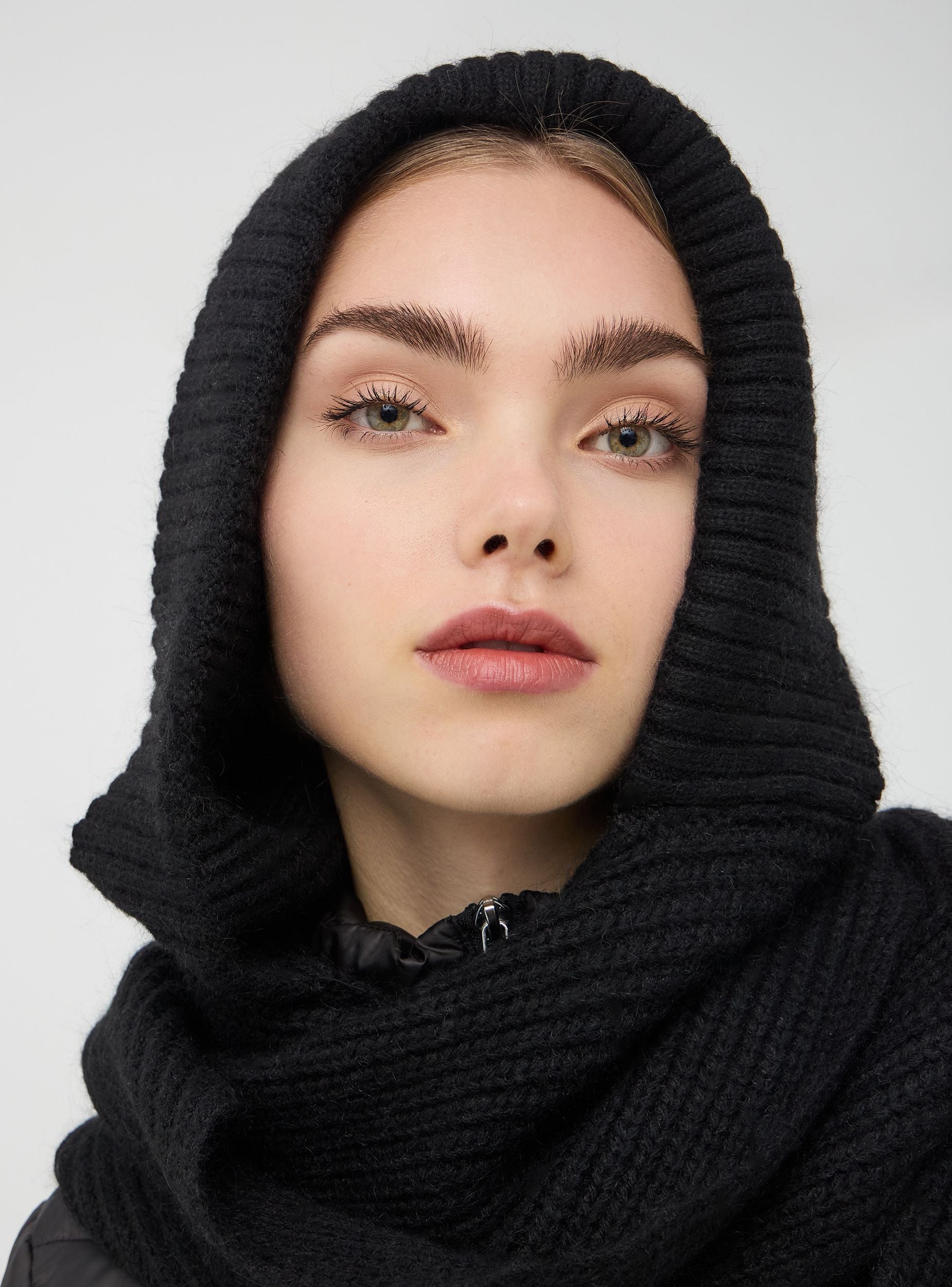 Women's beanie-scarf, made of solid colour knit. Perfect for keeping warm during the cold winter days.