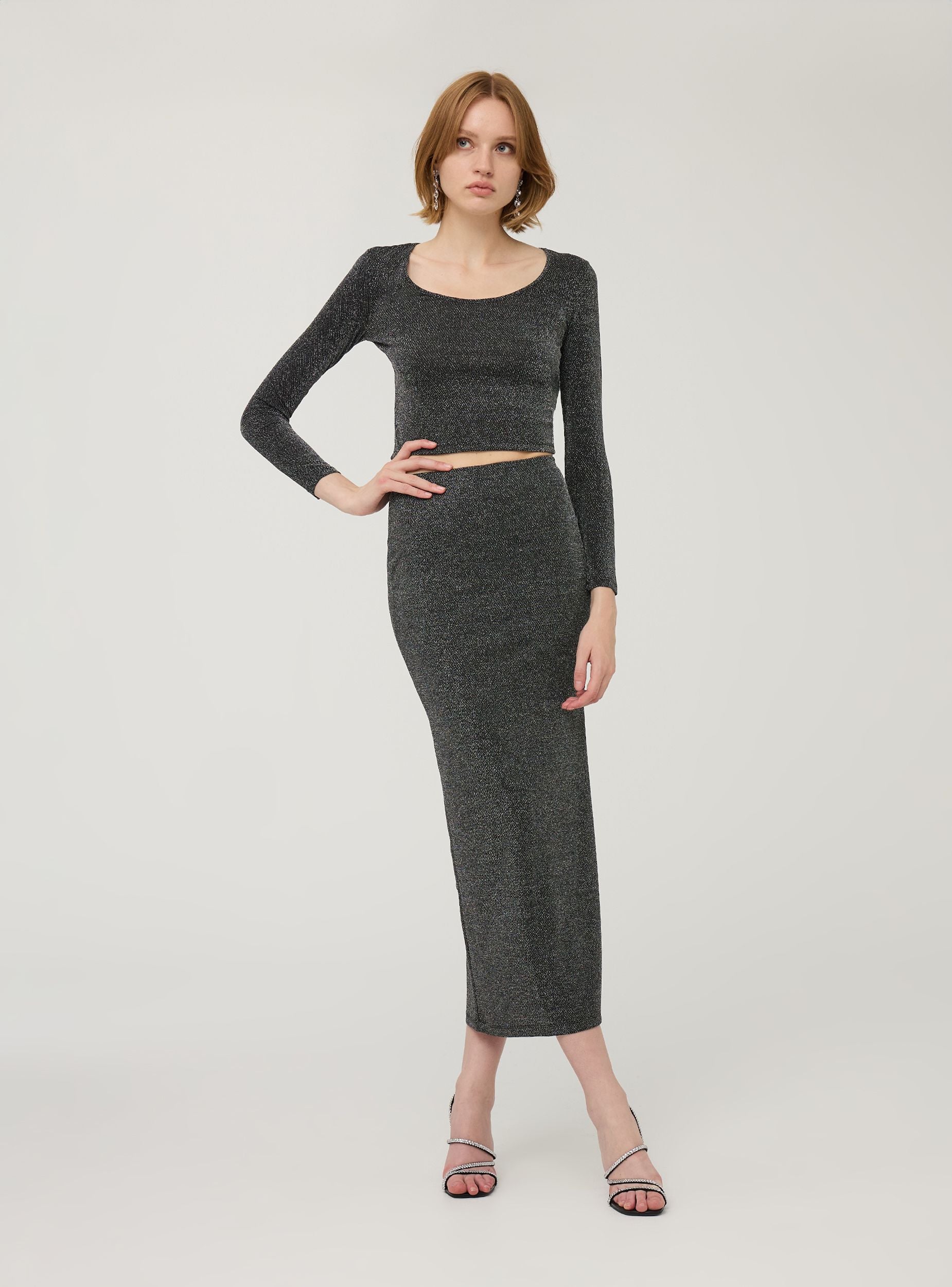Long column dress for women with a side slit, characterised by a fitted silhouette that enhances the shape. The elegant and modern design is enriched with lurex details that provide a sparkling effect. The garment is completed with an elasticated waistband for optimal comfort.