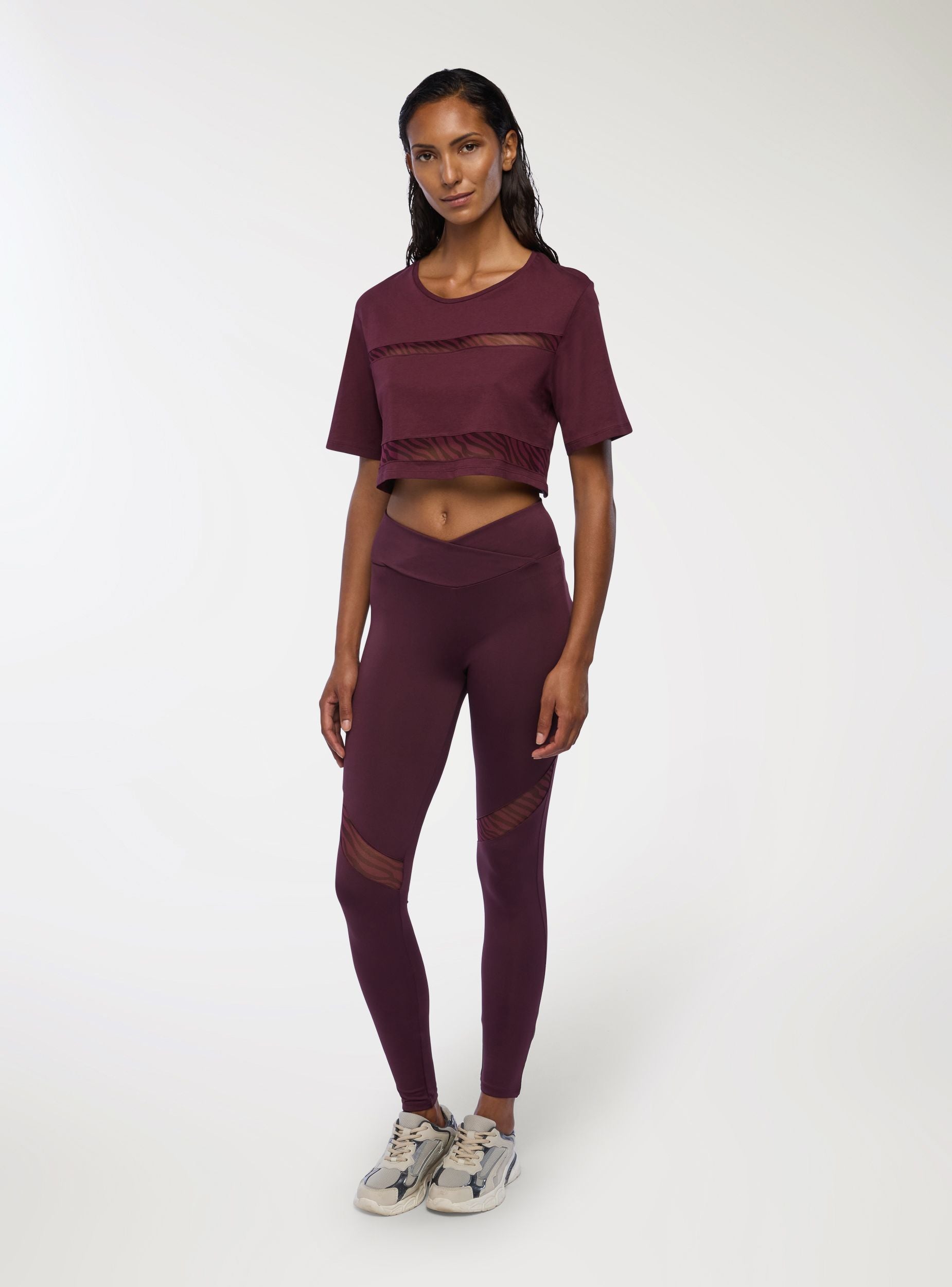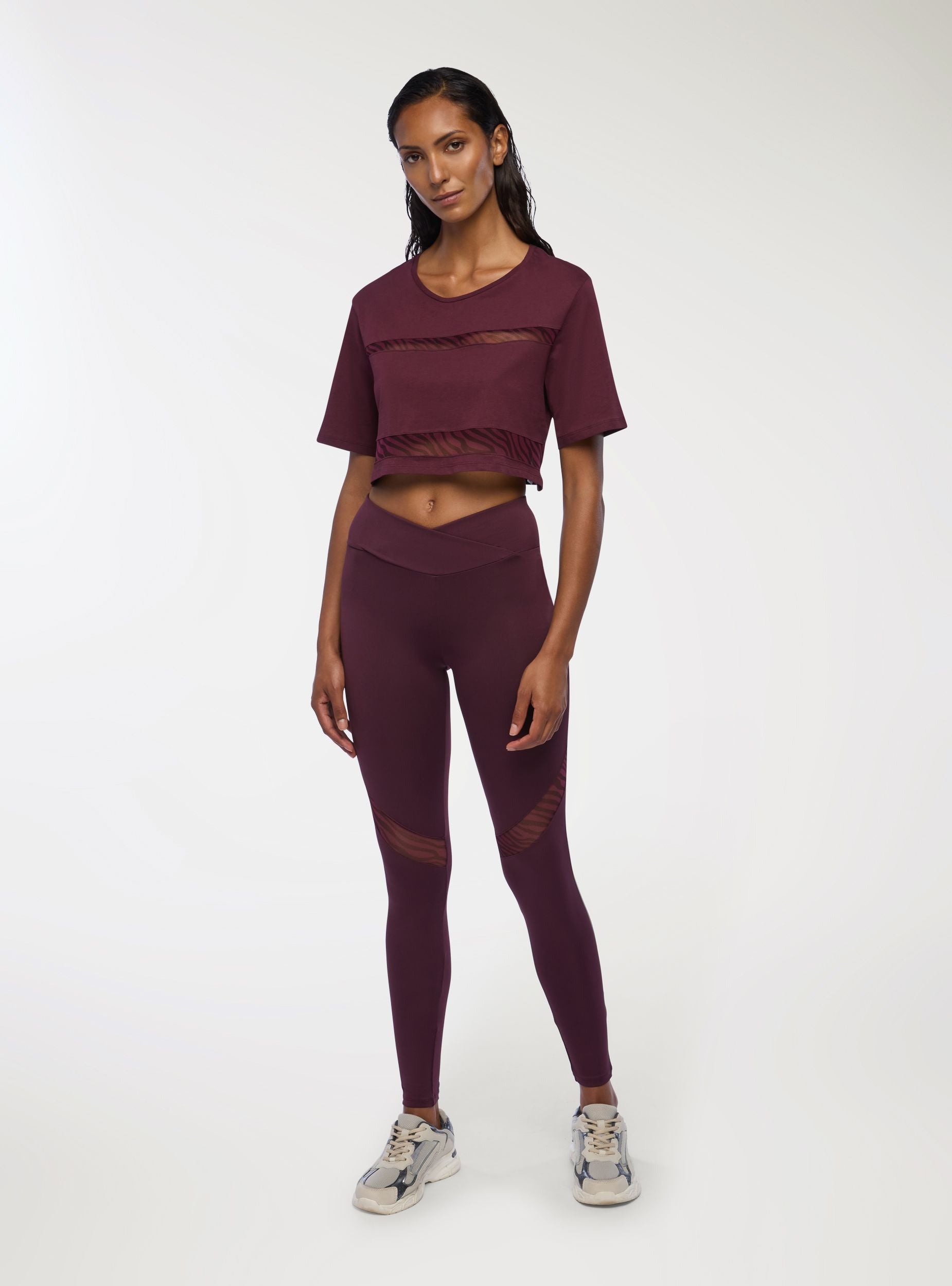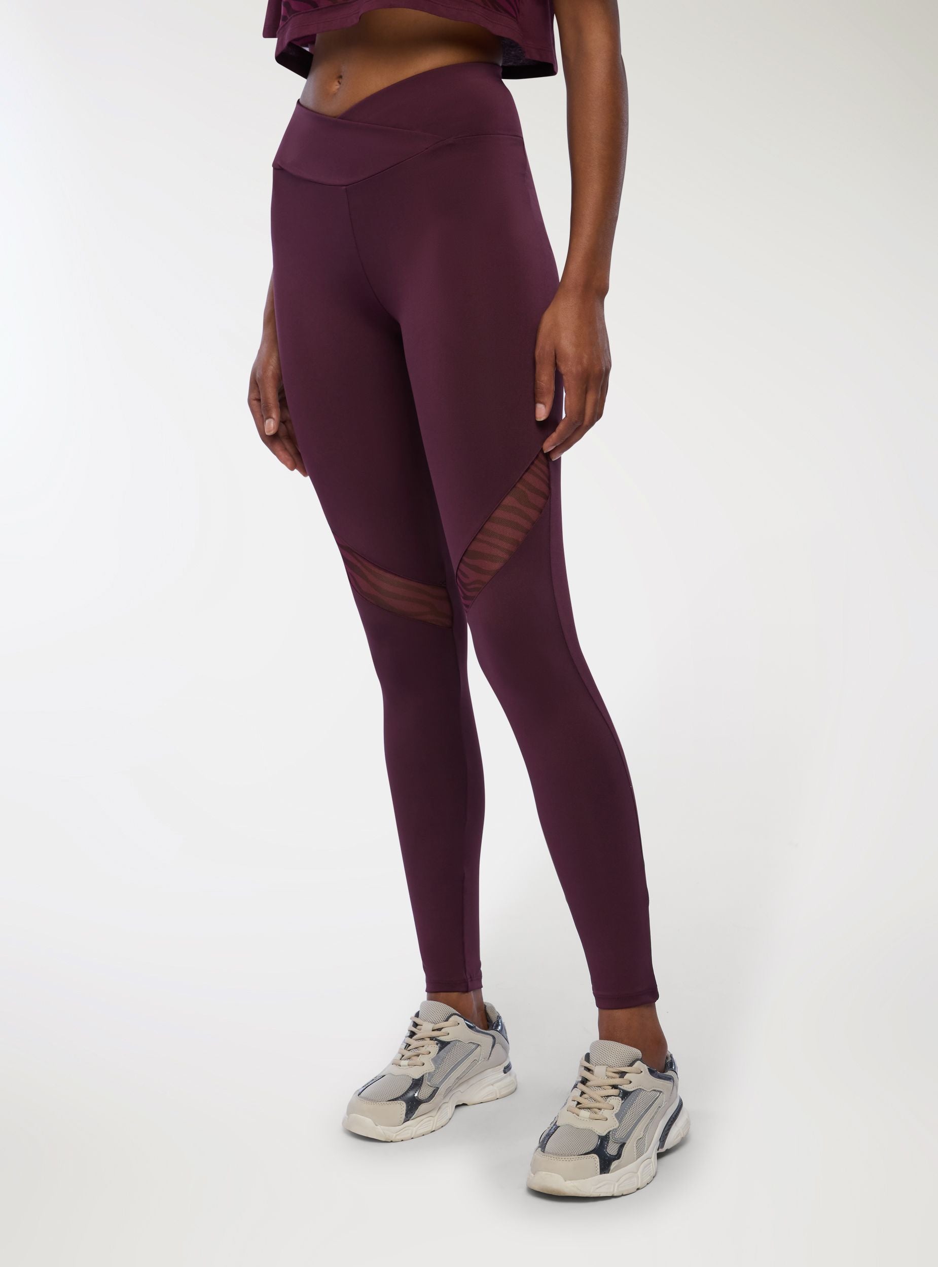 Women's leggings with animal print details, ideal for a sporty and dynamic look. They feature a tight fit that enhances the silhouette, with transparent details adding a touch of style. Perfect for workouts or a casual outfit, they pair easily with sports tops or oversized t-shirts. The high waist ensures comfort and support during physical activity.