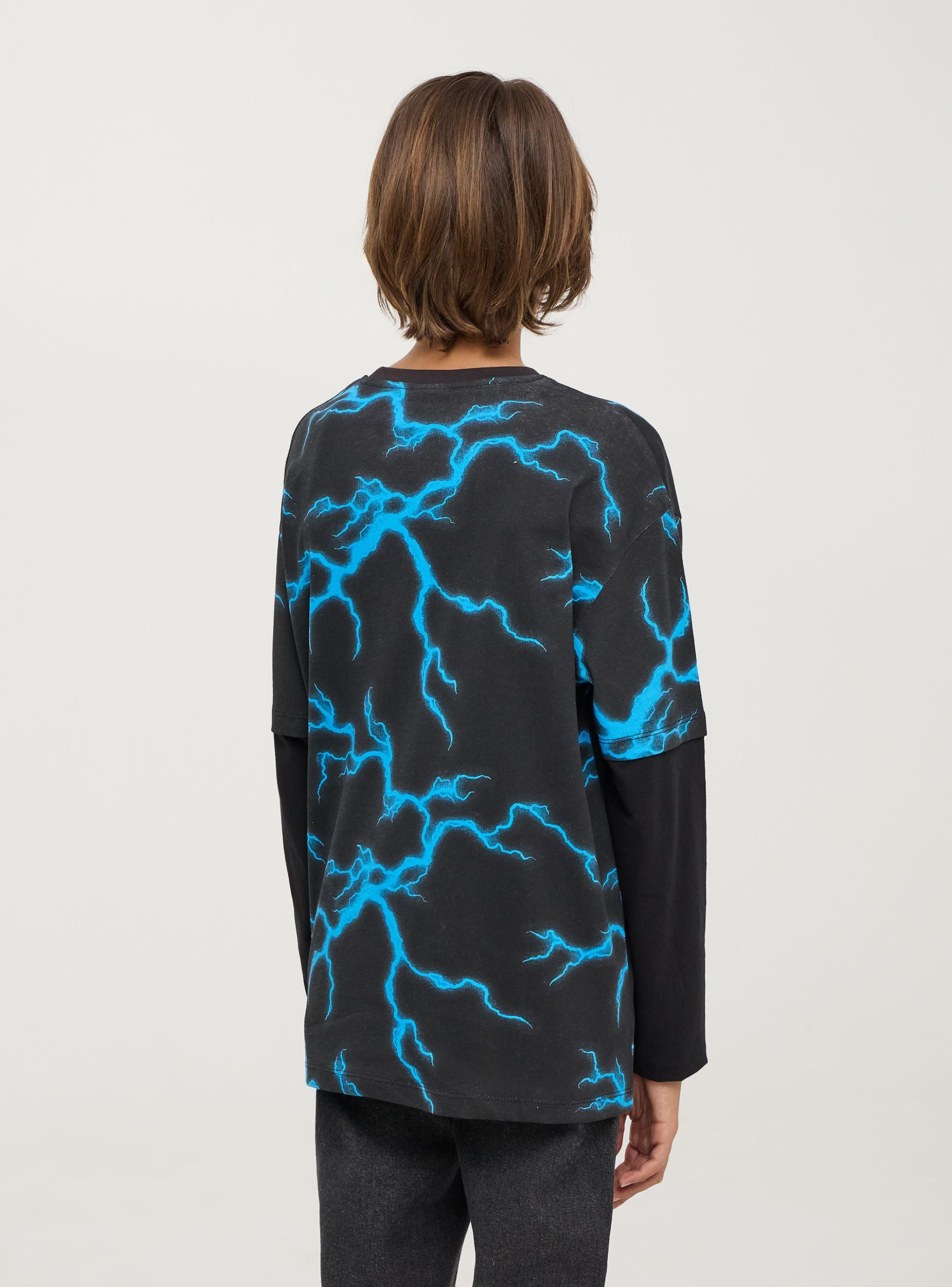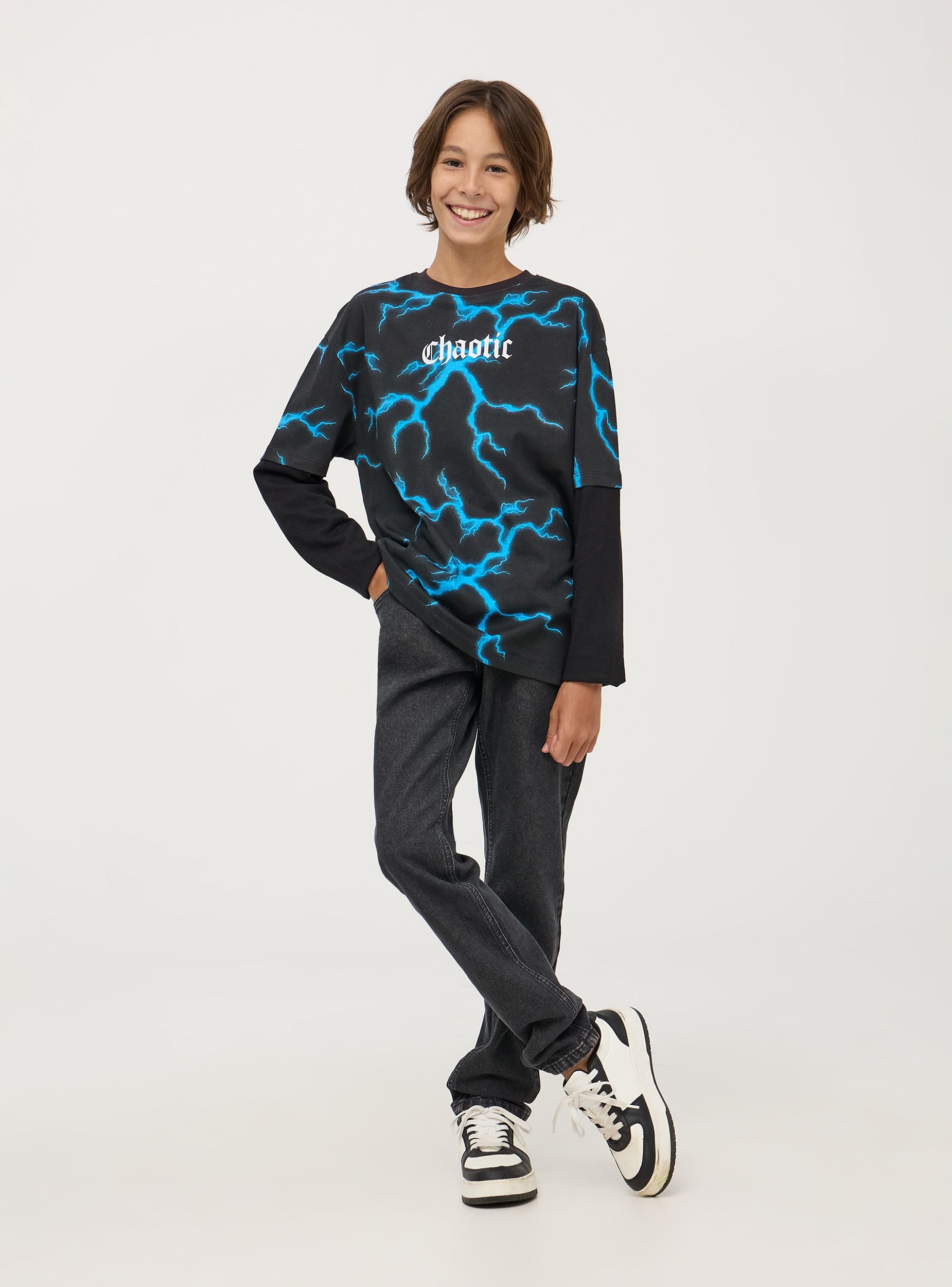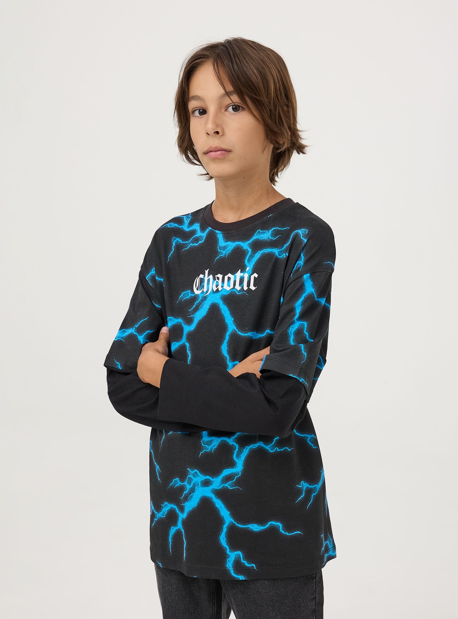 Long-sleeved children's top made from soft cotton. The fabric is enhanced by a vibrant electric blue lightning print that gives a dynamic and original look. The top features a white "Chaotic" print on the chest. Regular fit, ideal for a casual look. Perfect for outings with friends and daily activities, it adds a bold touch to any outfit. The long sleeves create a double sleeve effect.Details