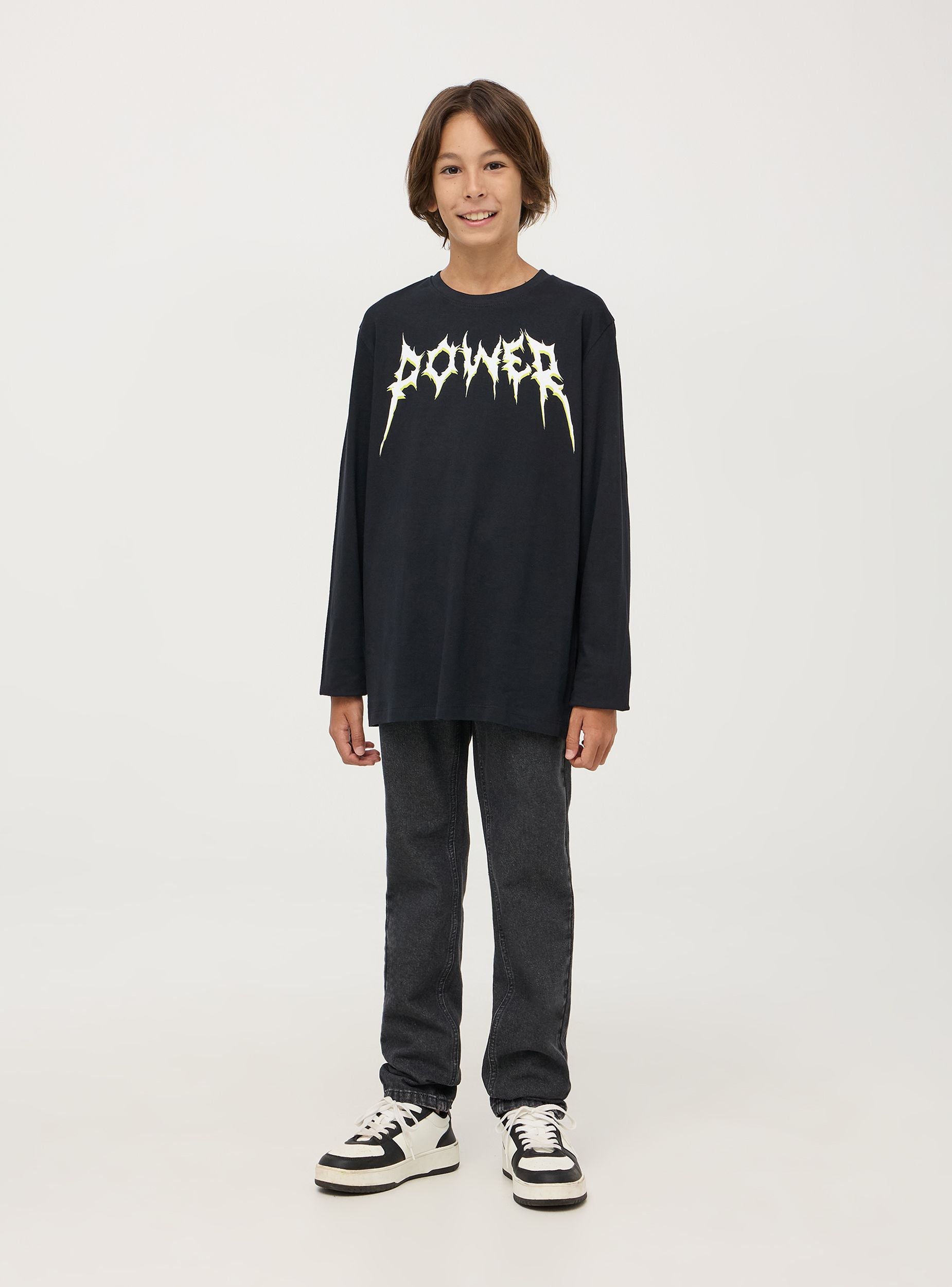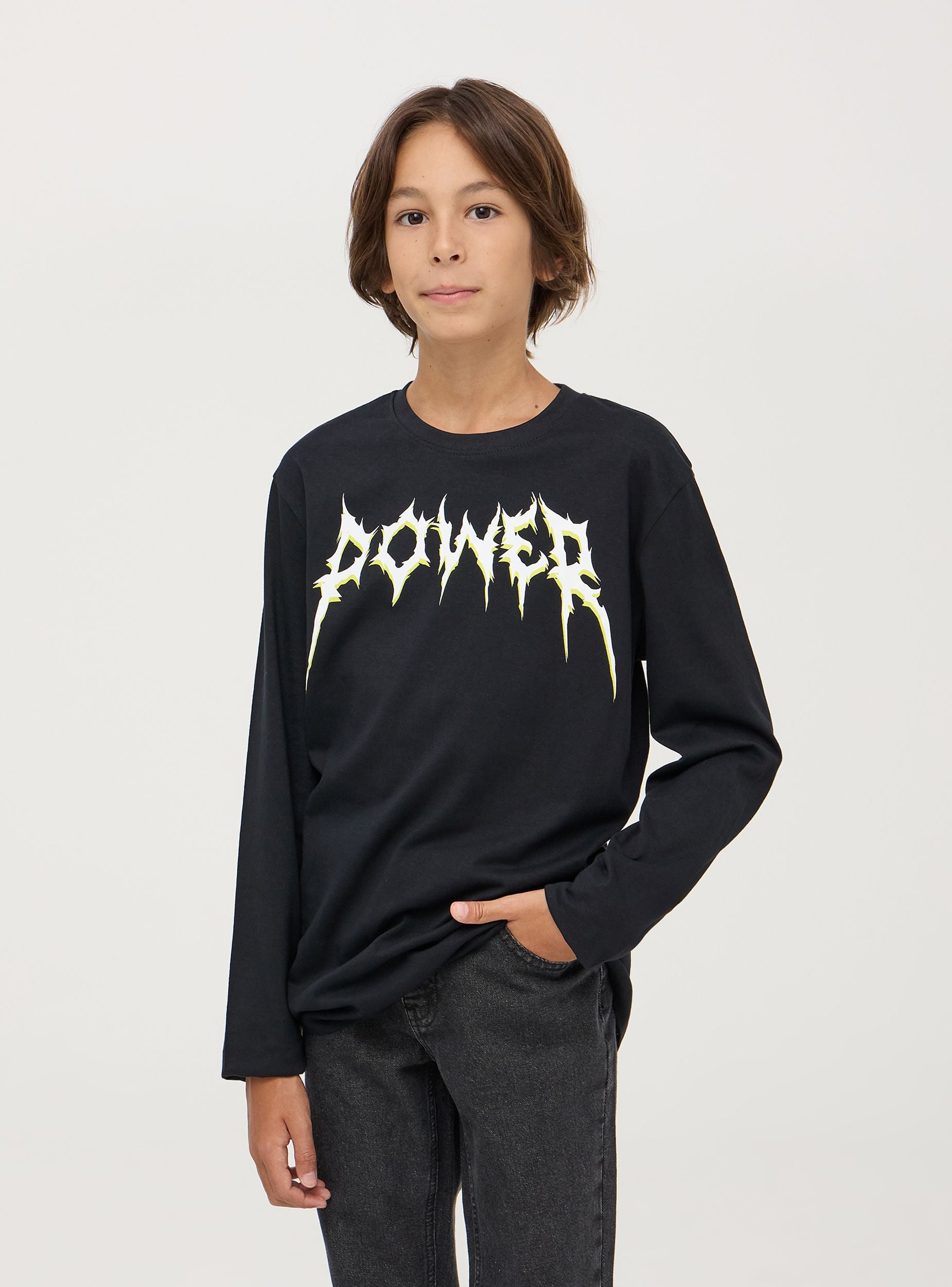 Long-sleeved top made from soft cotton that ensures comfort all day long. Enhanced with a front print featuring the word "Power" in a bold and dynamic style. The design is minimalist with a regular fit, ideal for a casual and sporty look. Perfect for leisure time or school.Details