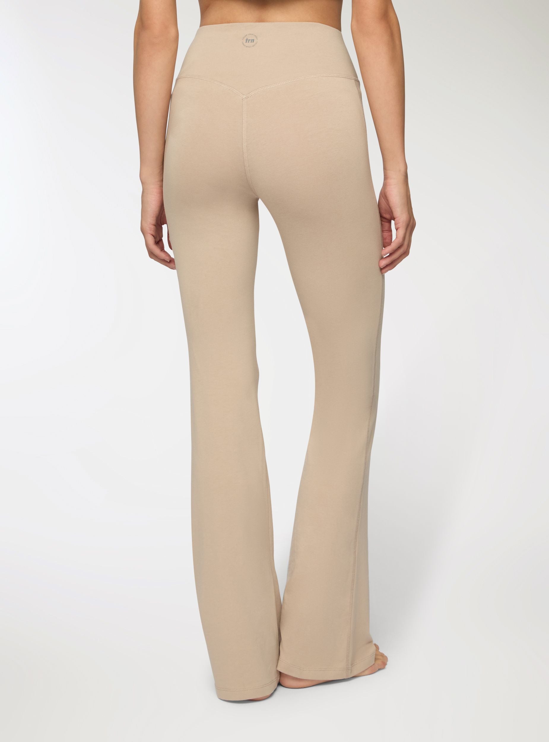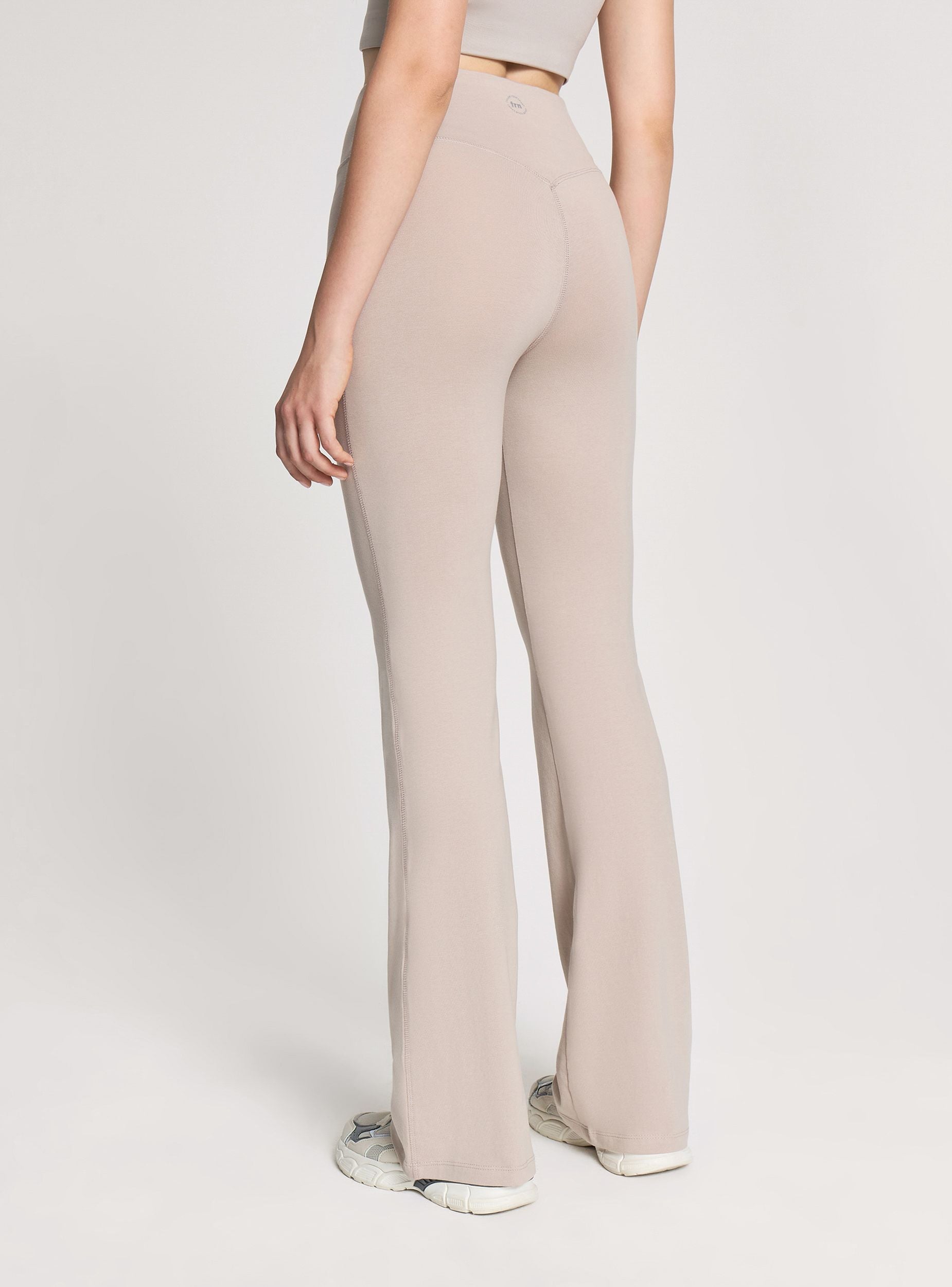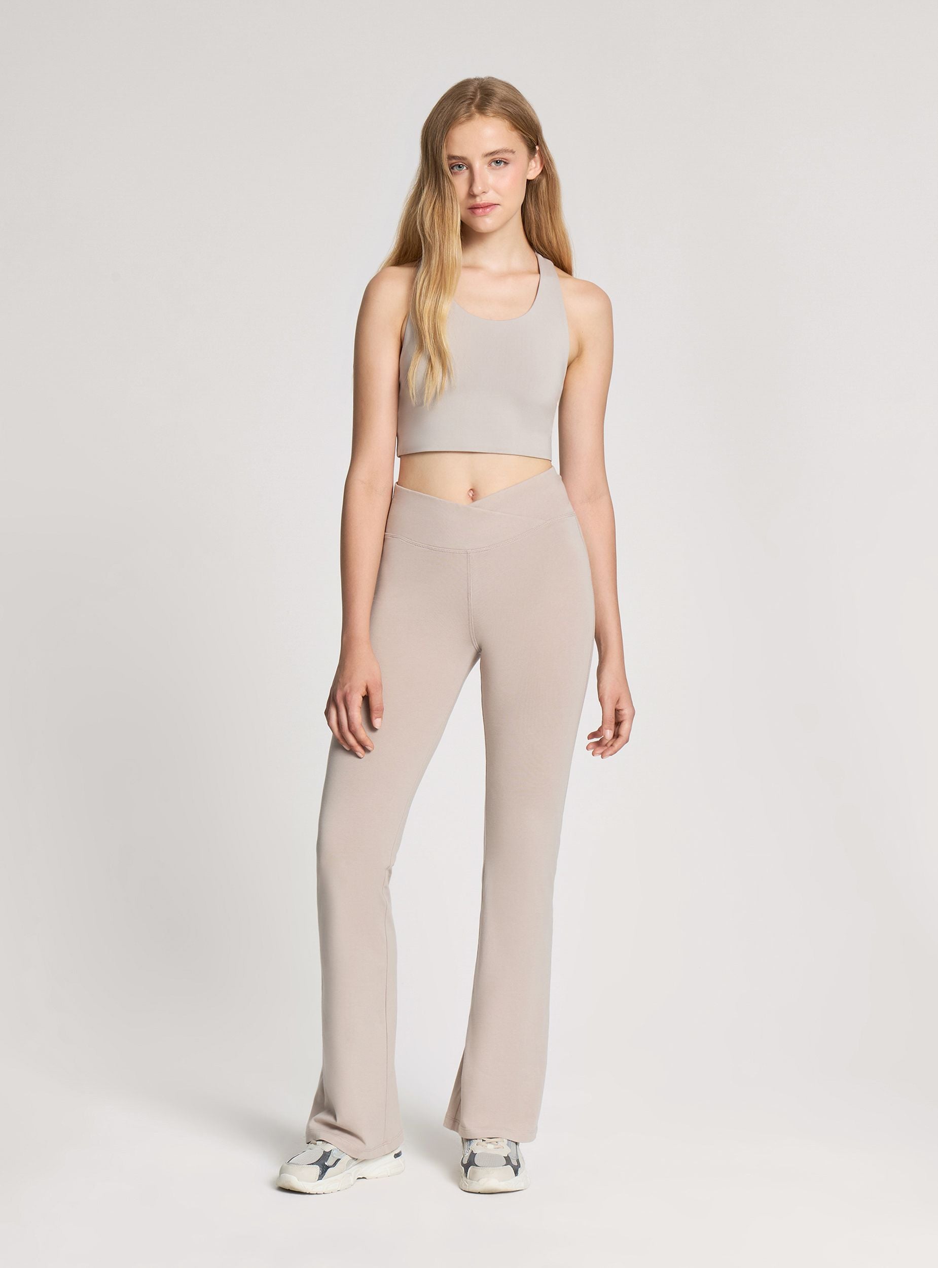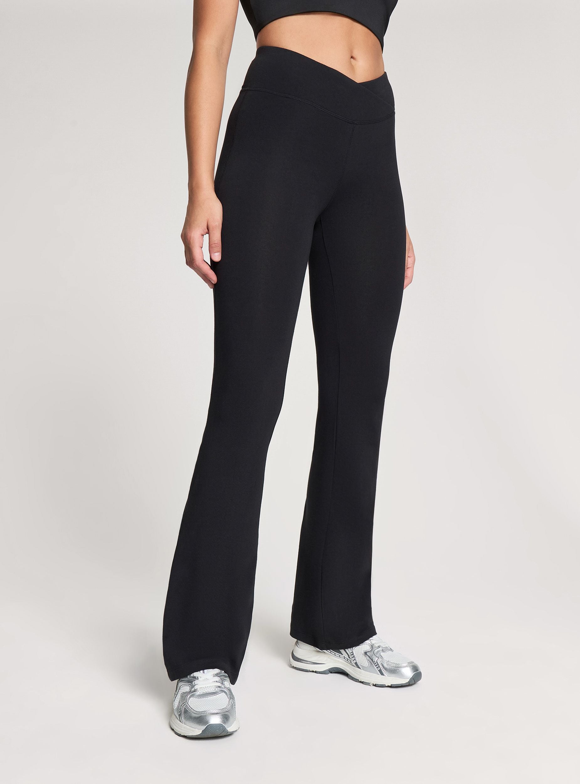 Pack containing two women's long sports leggings, featuring a snug fit and a flared design. The high waist with a crossed detail adds a touch of style and comfort. Ideal for a casual and modern look, they pair perfectly with oversized t-shirts or crop tops. Versatile for various occasions, they are perfect for leisure time or a chic sporty outfit. Active line.