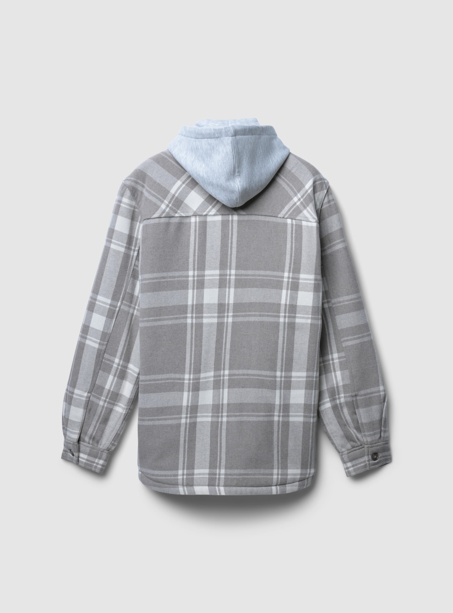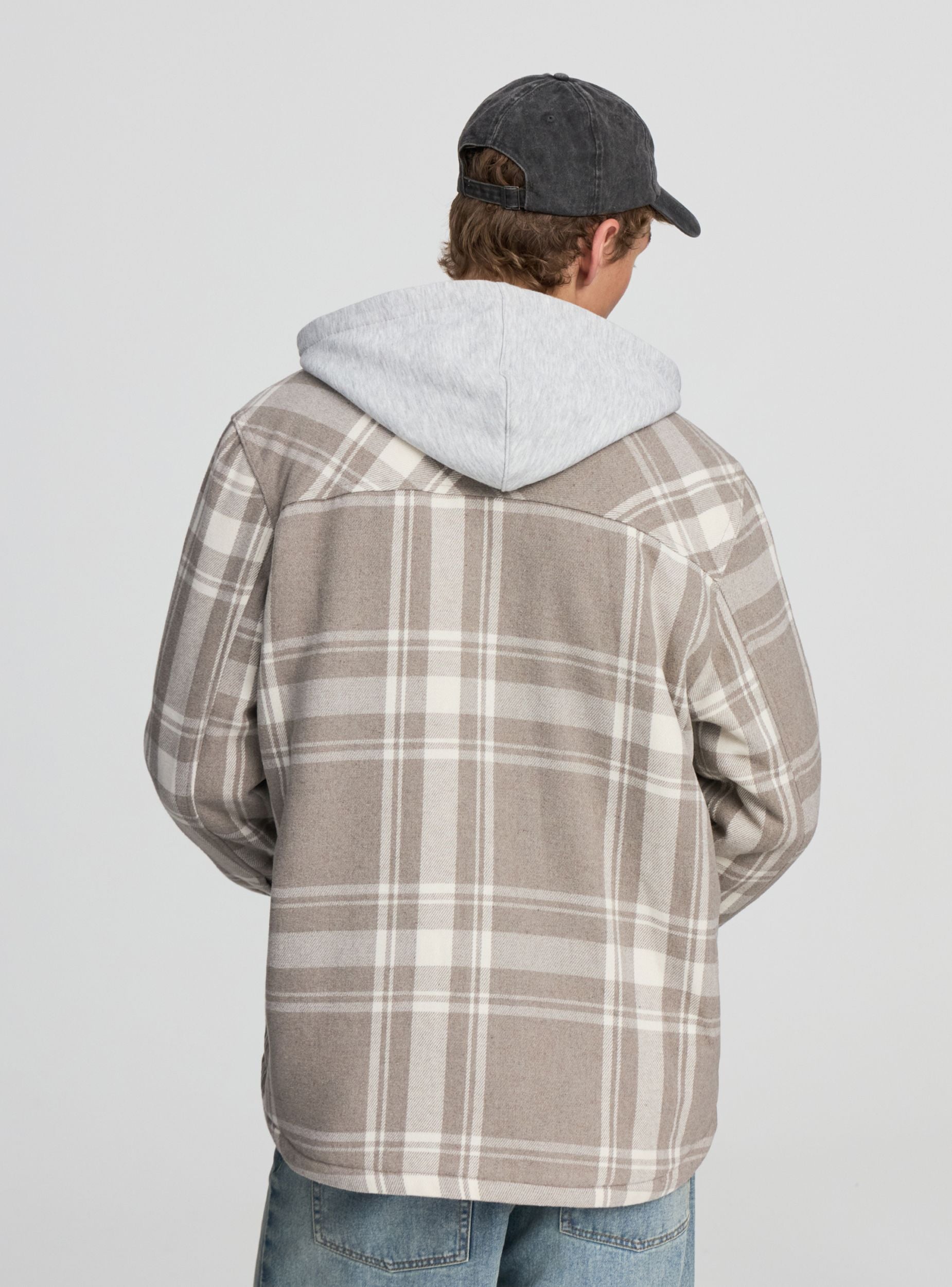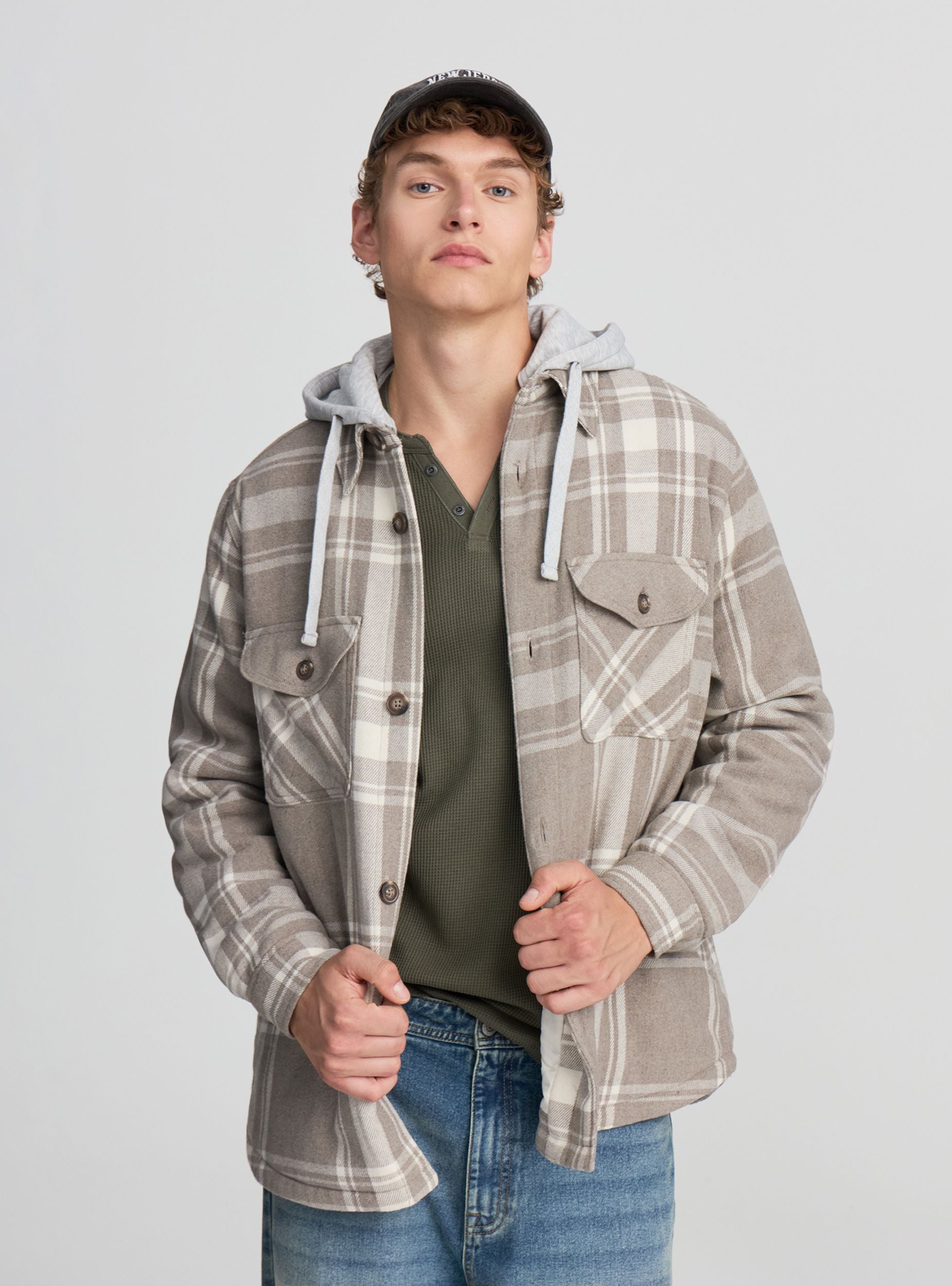 Men's padded jacket with a drawstring hood, ideal for a casual and versatile look. It features a check pattern that adds a touch of style to the design. Equipped with button closure, chest pockets with flaps and buttons, and an internal pocket with Velcro. This jacket offers comfort and practicality for cooler days. Perfect to pair with jeans and T-shirts for a casual outfit.Details