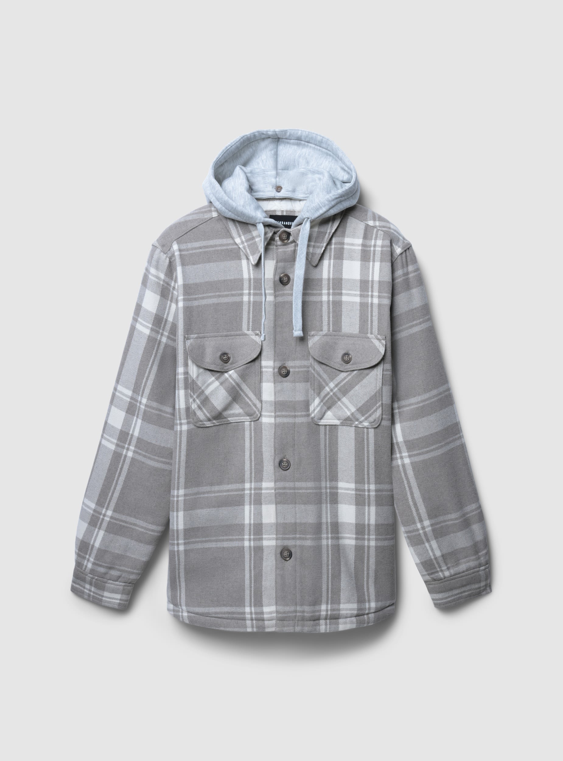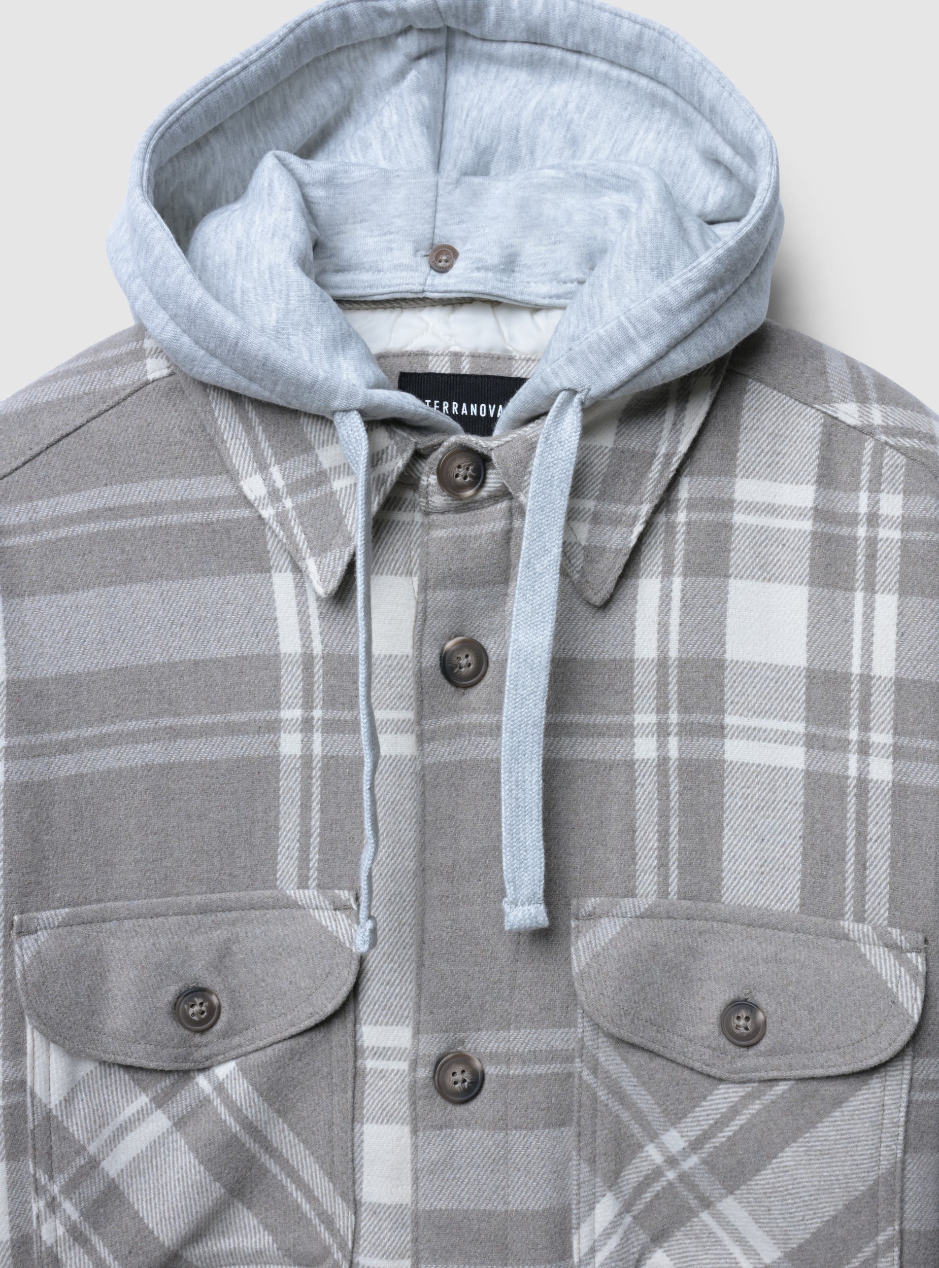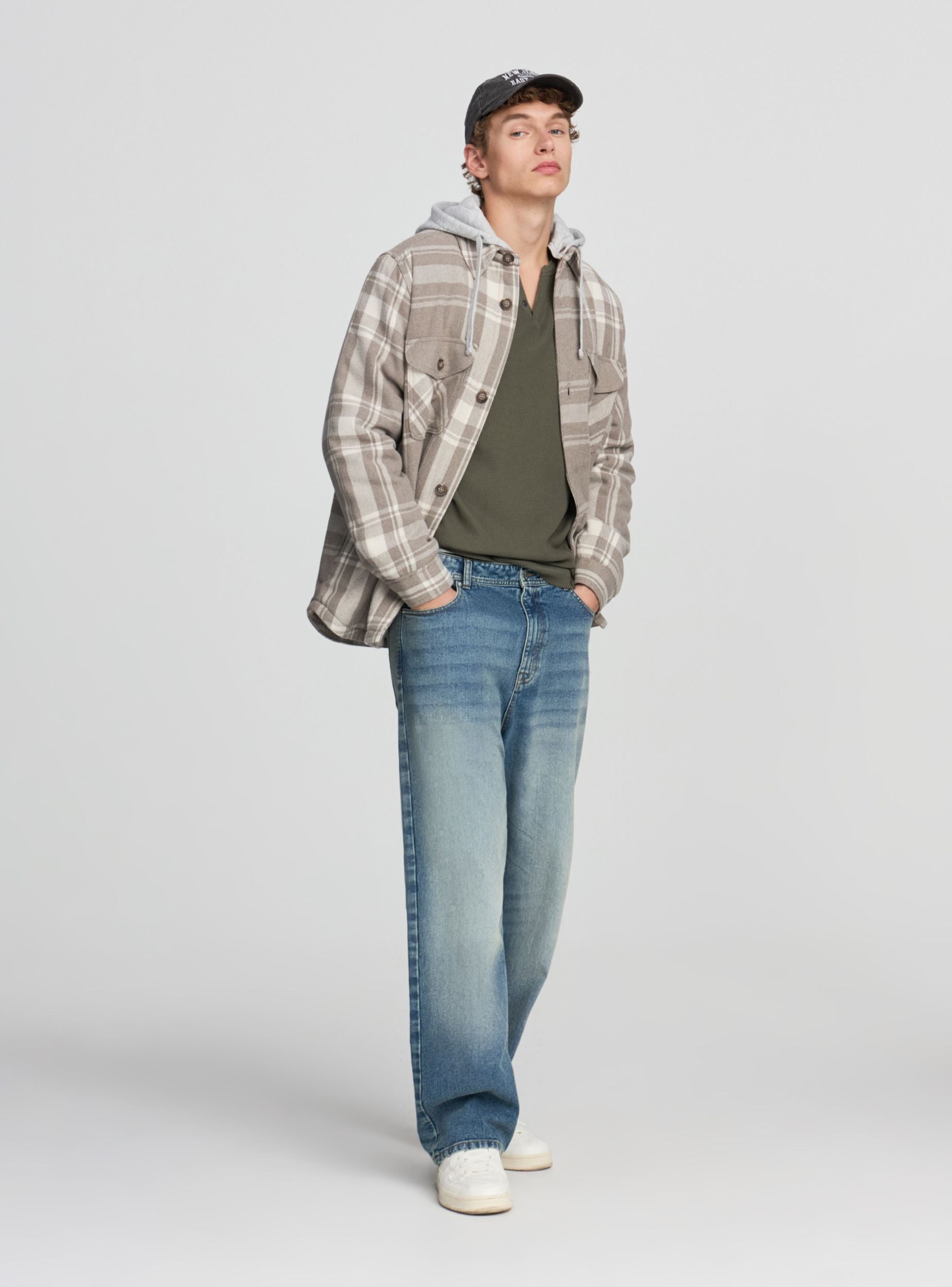 Men's padded jacket with a drawstring hood, ideal for a casual and versatile look. It features a check pattern that adds a touch of style to the design. Equipped with button closure, chest pockets with flaps and buttons, and an internal pocket with Velcro. This jacket offers comfort and practicality for cooler days. Perfect to pair with jeans and T-shirts for a casual outfit.Details