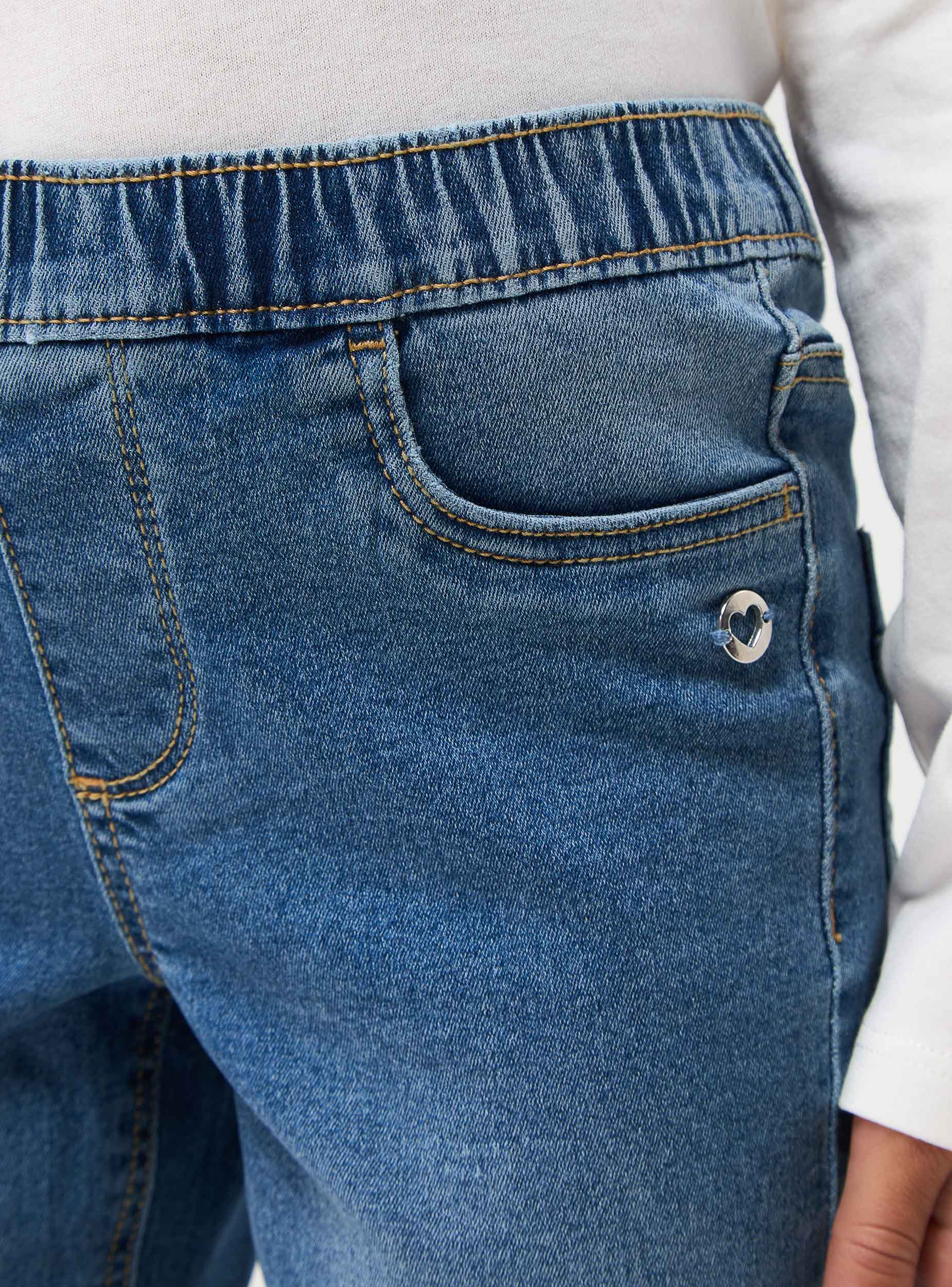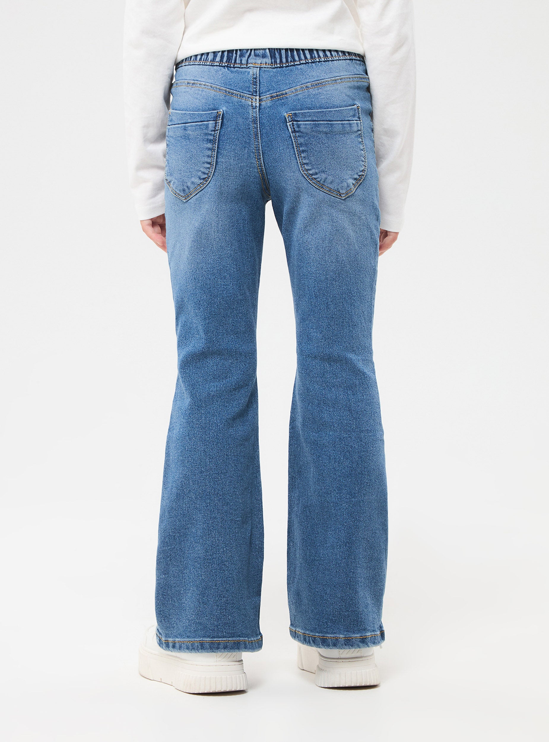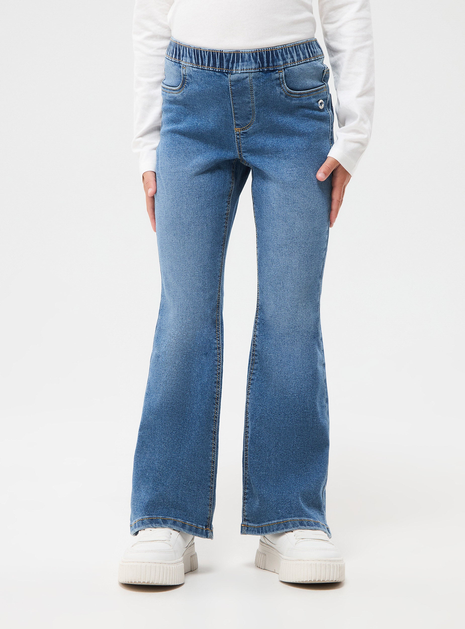 Jeggings da bambina con elastico in vita e tasche laterali. Lavaggio blu denim medio. Modello a zampa.