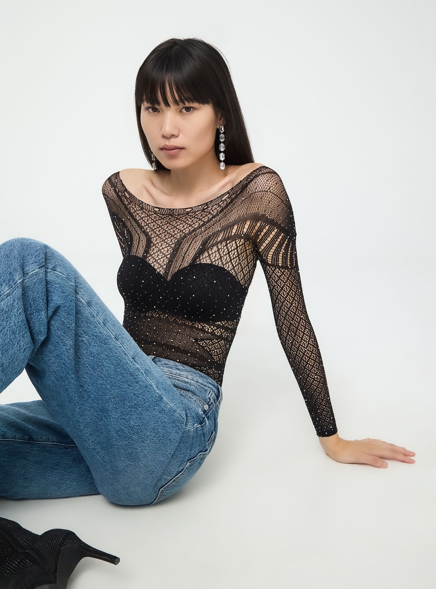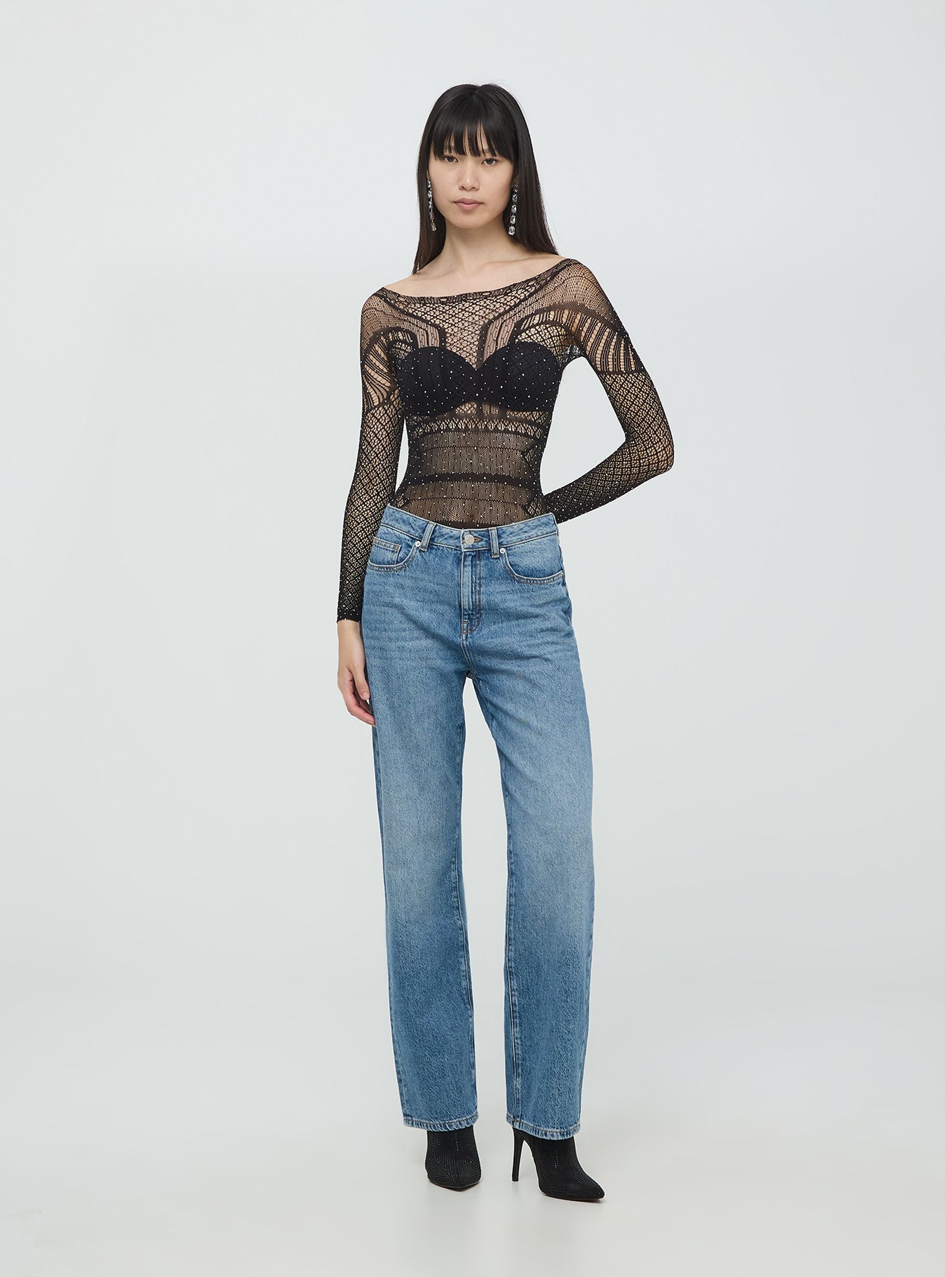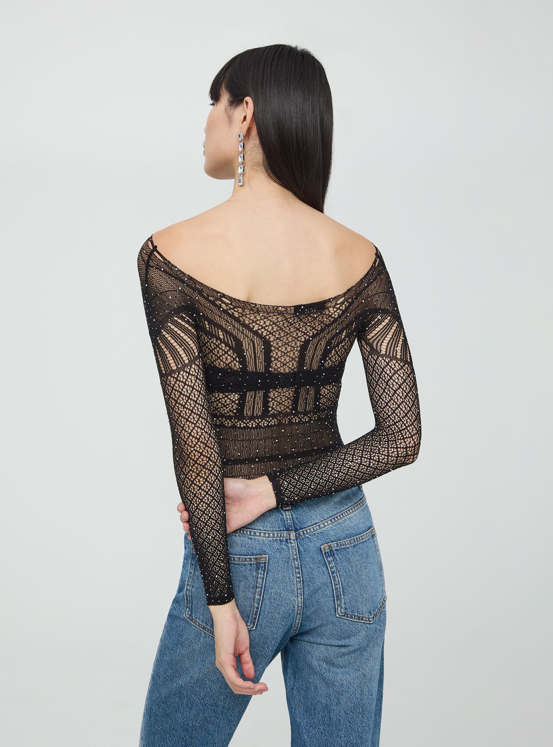 Elegant women's bodysuit made of stretchy fabric with a fitted silhouette, crafted from lace and adorned with rhinestones. The long sleeves and wide round neckline add a sophisticated touch, perfect for special events.Details