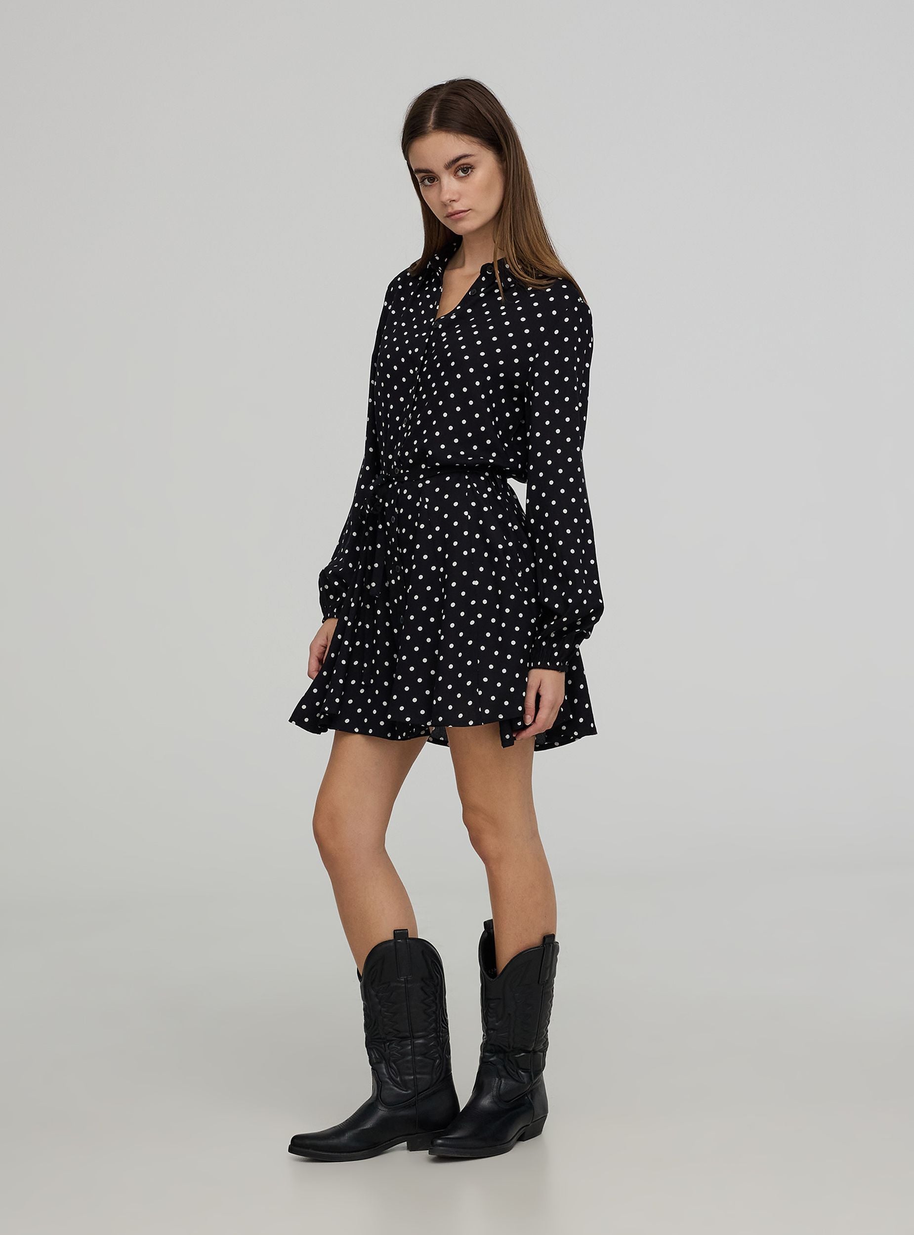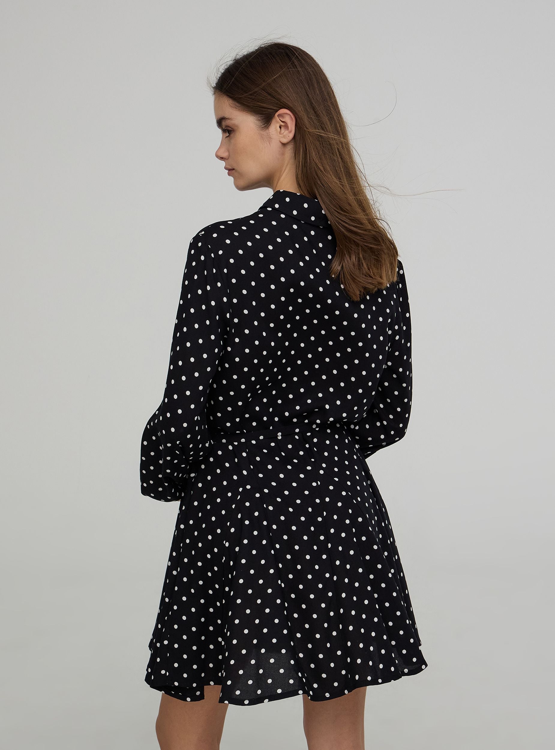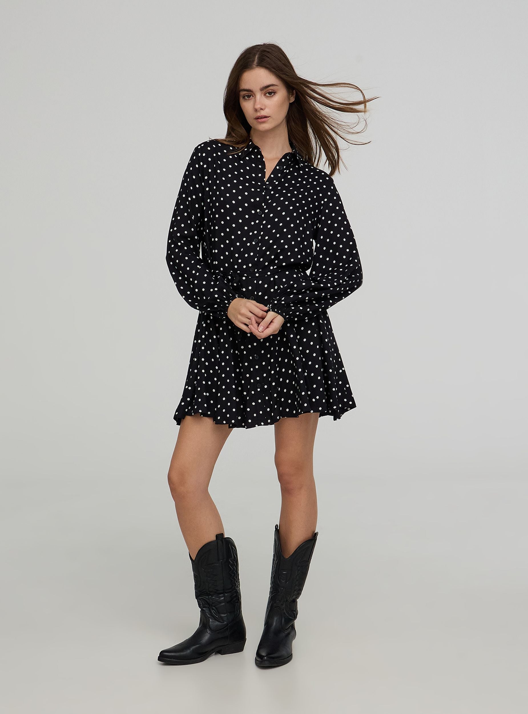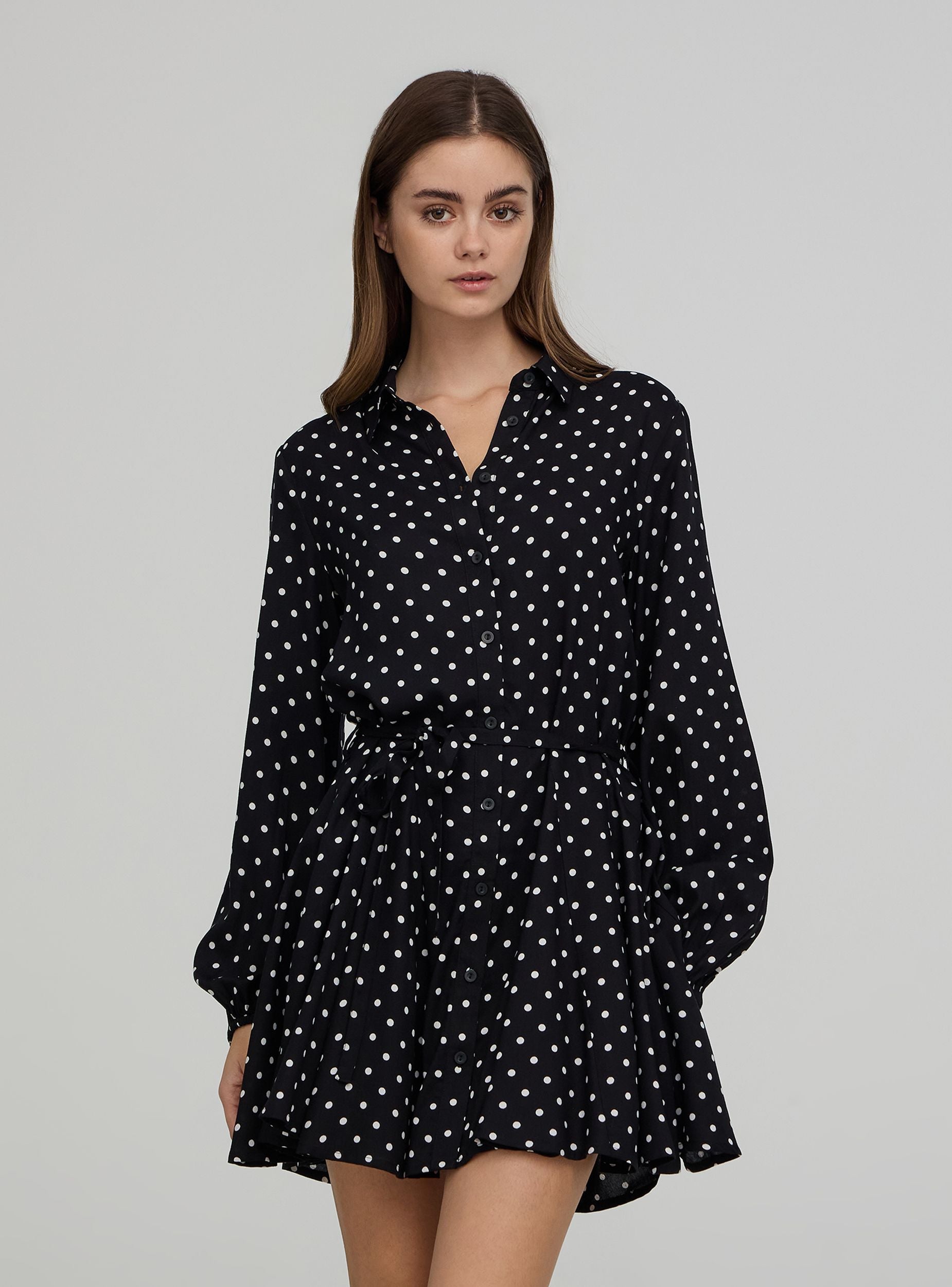 Women's black shirt dress with a vibrant white polka dot print, featuring a front button closure, classic collar, and long sleeves with elasticated cuffs. The fit is loose, with a waist belt to enhance the silhouette. Ideal for casual occasions or elegant evenings.Details