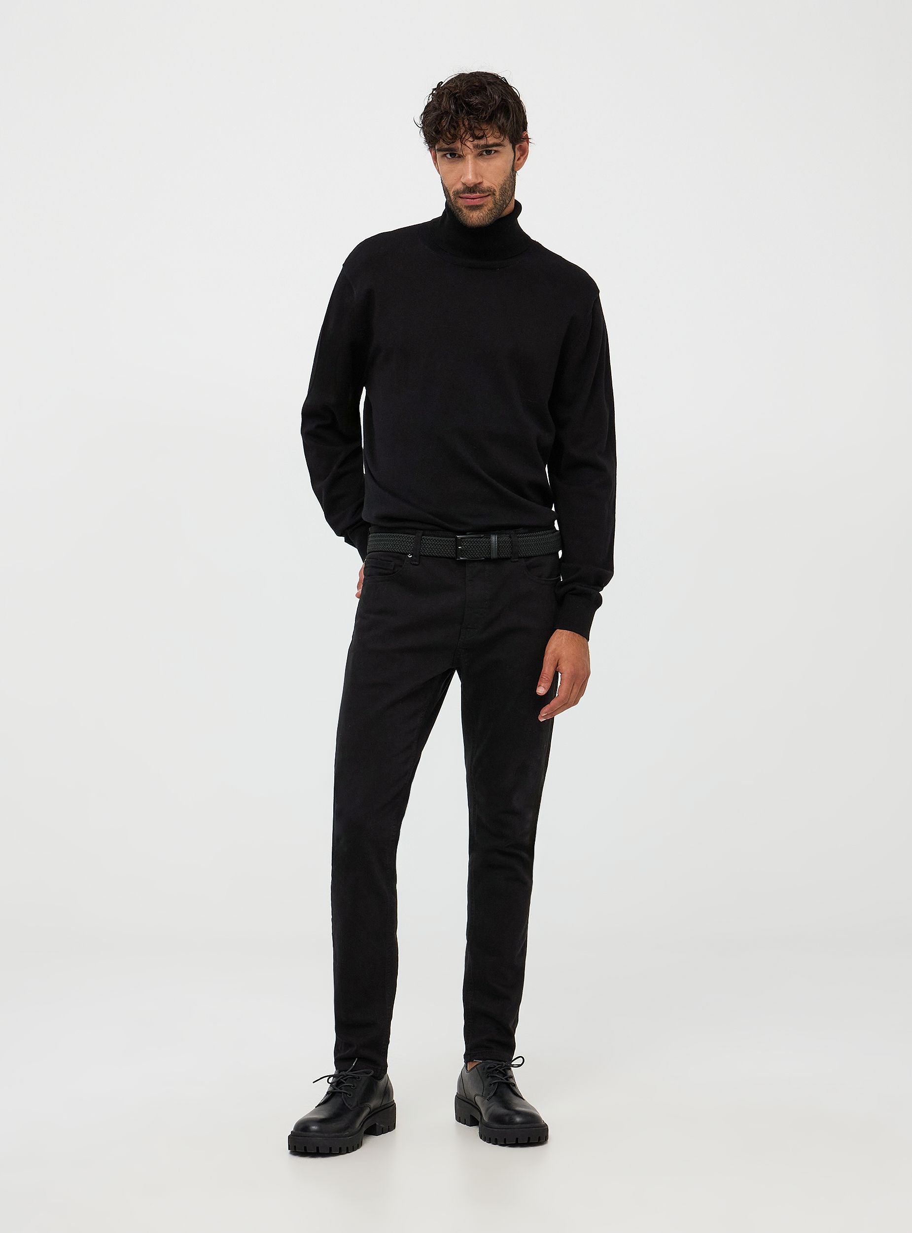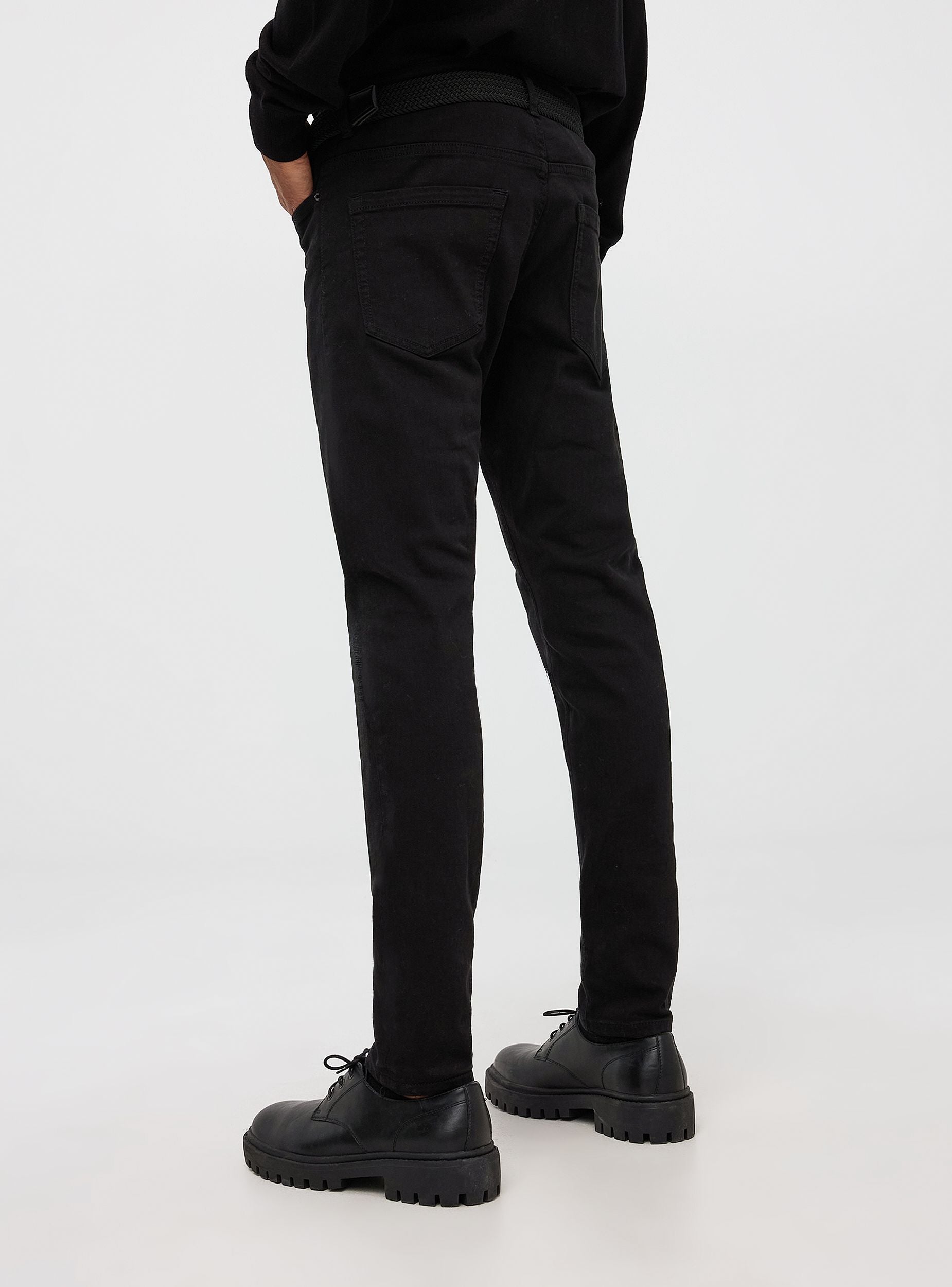 Men's trousers, 5-pocket style, button and zip closure, belt loops at the waist. Solid colour stretchy fabric. Slim fit.Details