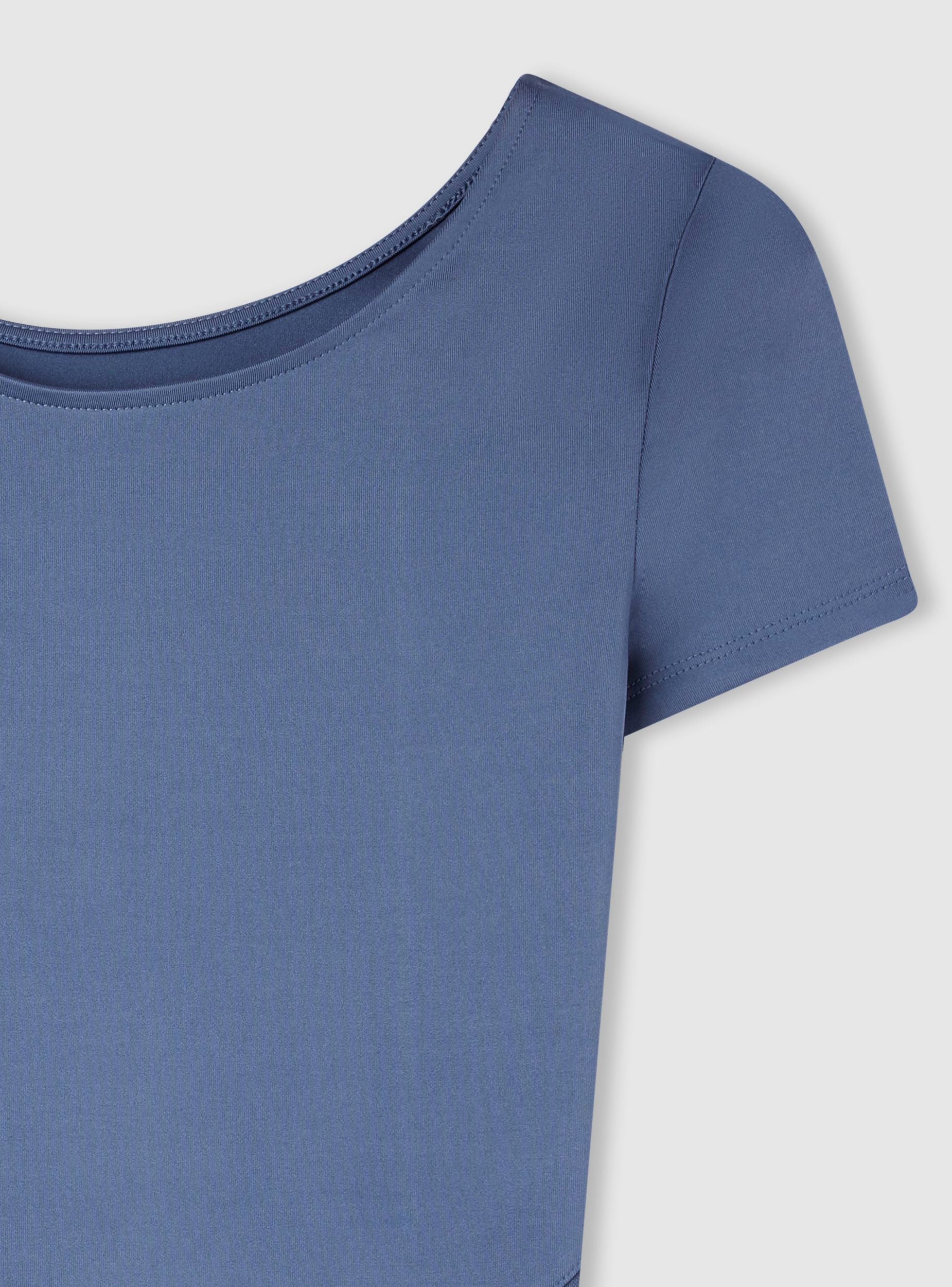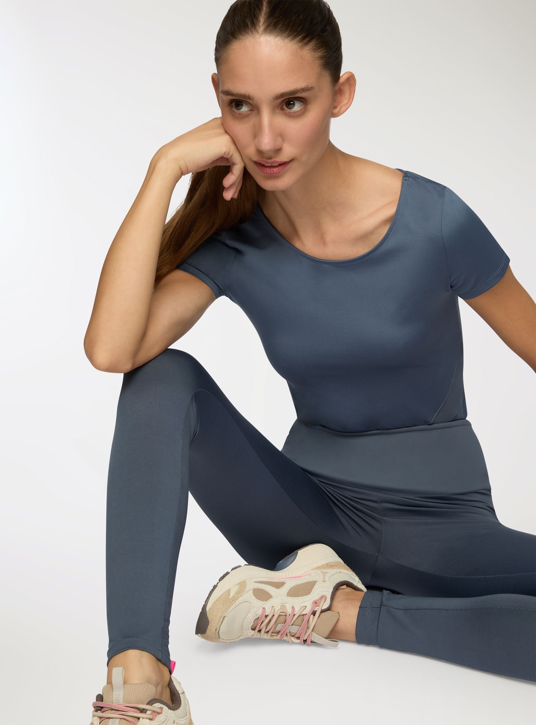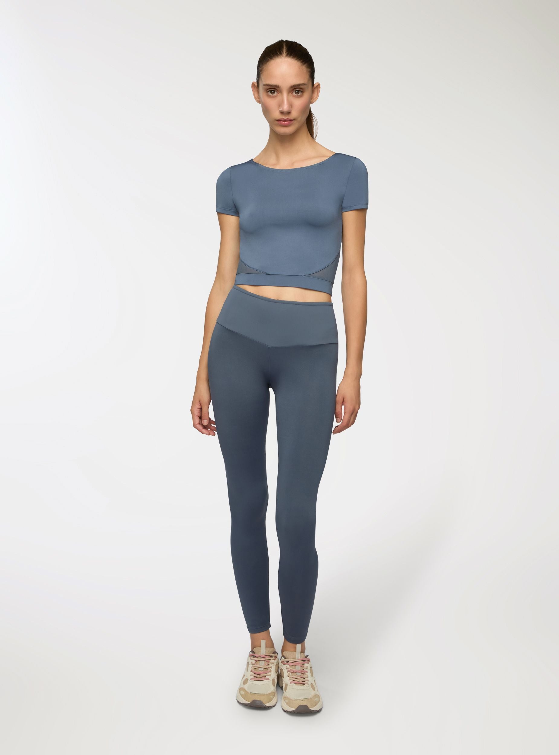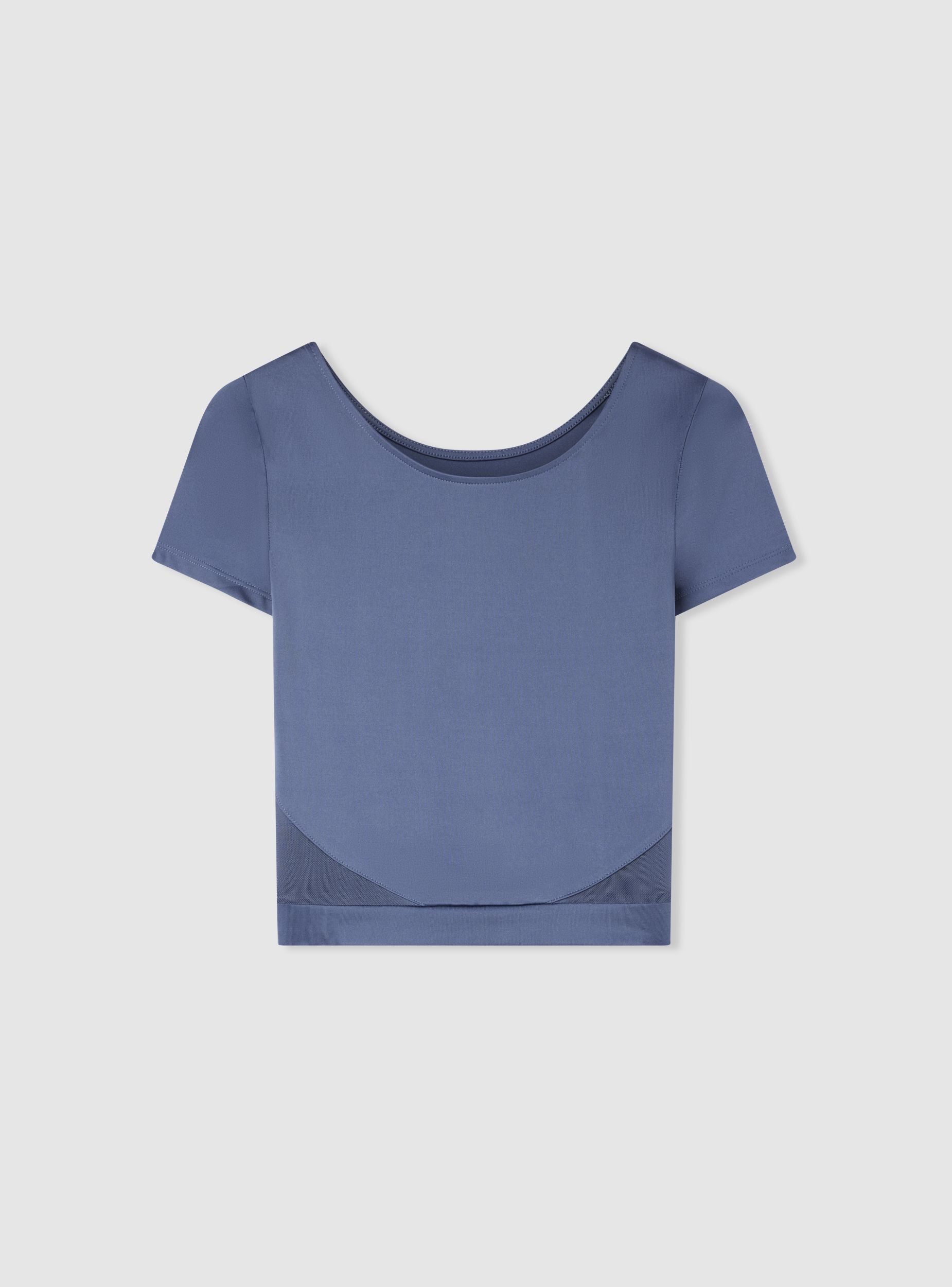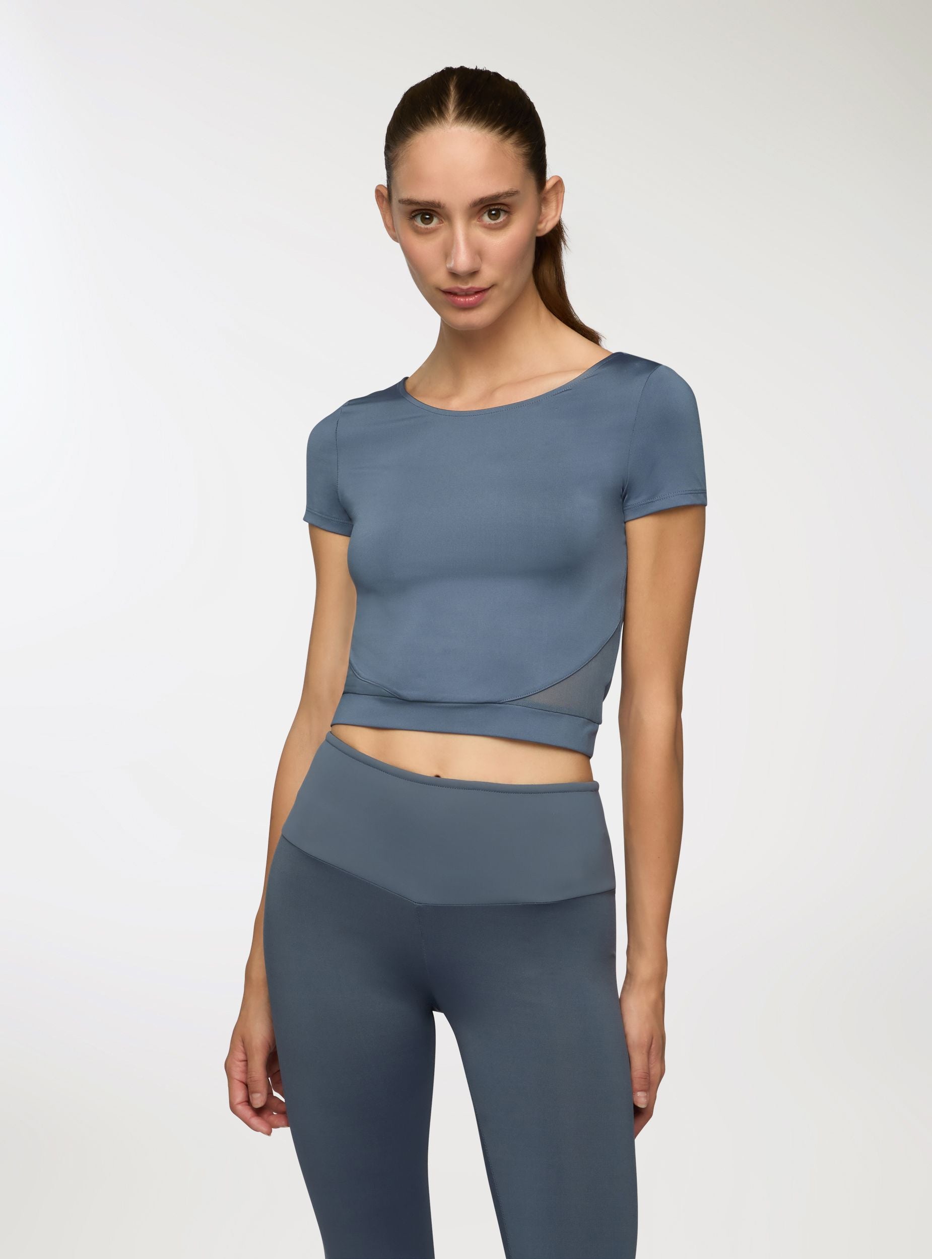 Women's crop sports t-shirt with a fitted cut, ideal for casual and dynamic looks. The minimalist solid colour design easily pairs with leggings or sports trousers for a versatile style. The short sleeves and wide neckline enhance the silhouette, while the semi-transparent tulle detail adds a modern and feminine touch. Perfect for leisure time or sporty outfits. Active line.