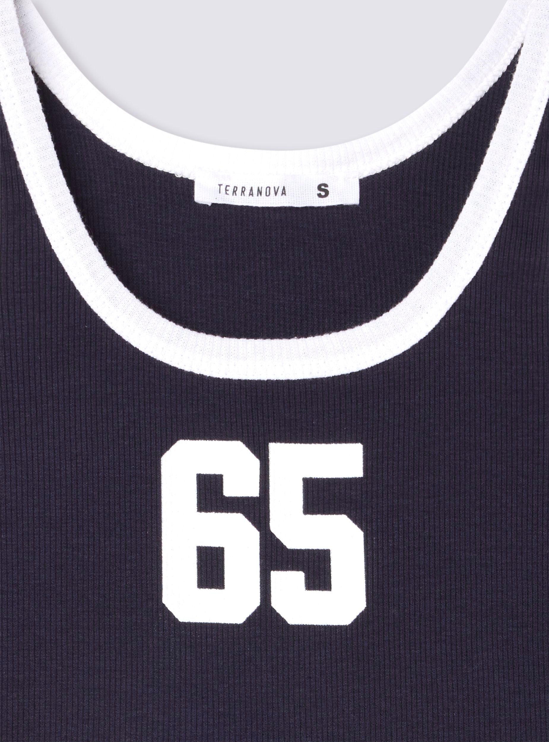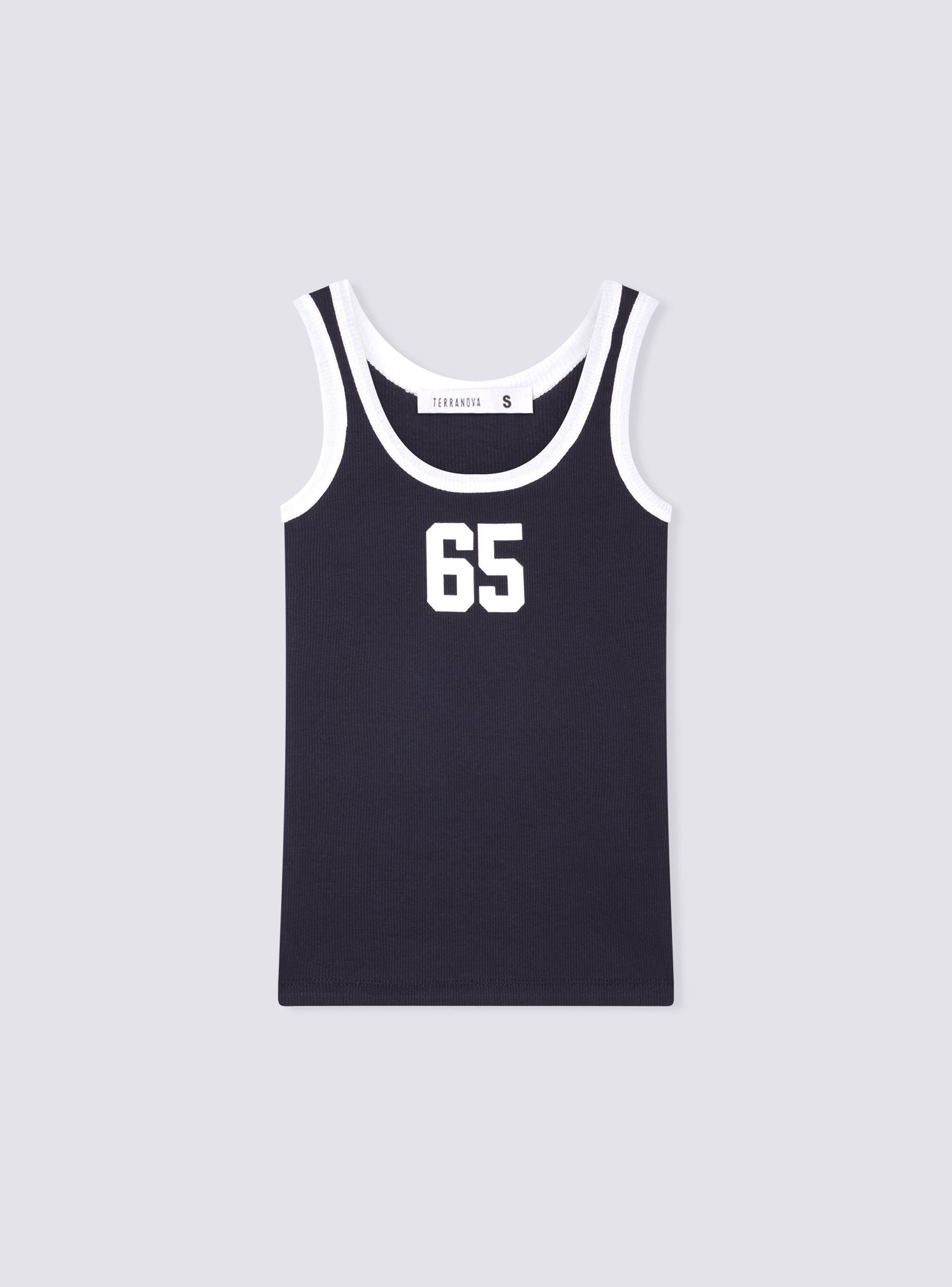 Women's tank top with a sporty and casual design. The ribbed fabric features a print with a number in the centre and contrasting edges, ideal for a dynamic and informal look. Perfect to pair with jeans or shorts for a summer outfit. The wide straps and round neckline ensure comfort and freedom of movement. A versatile garment for leisure time and warm days.Details