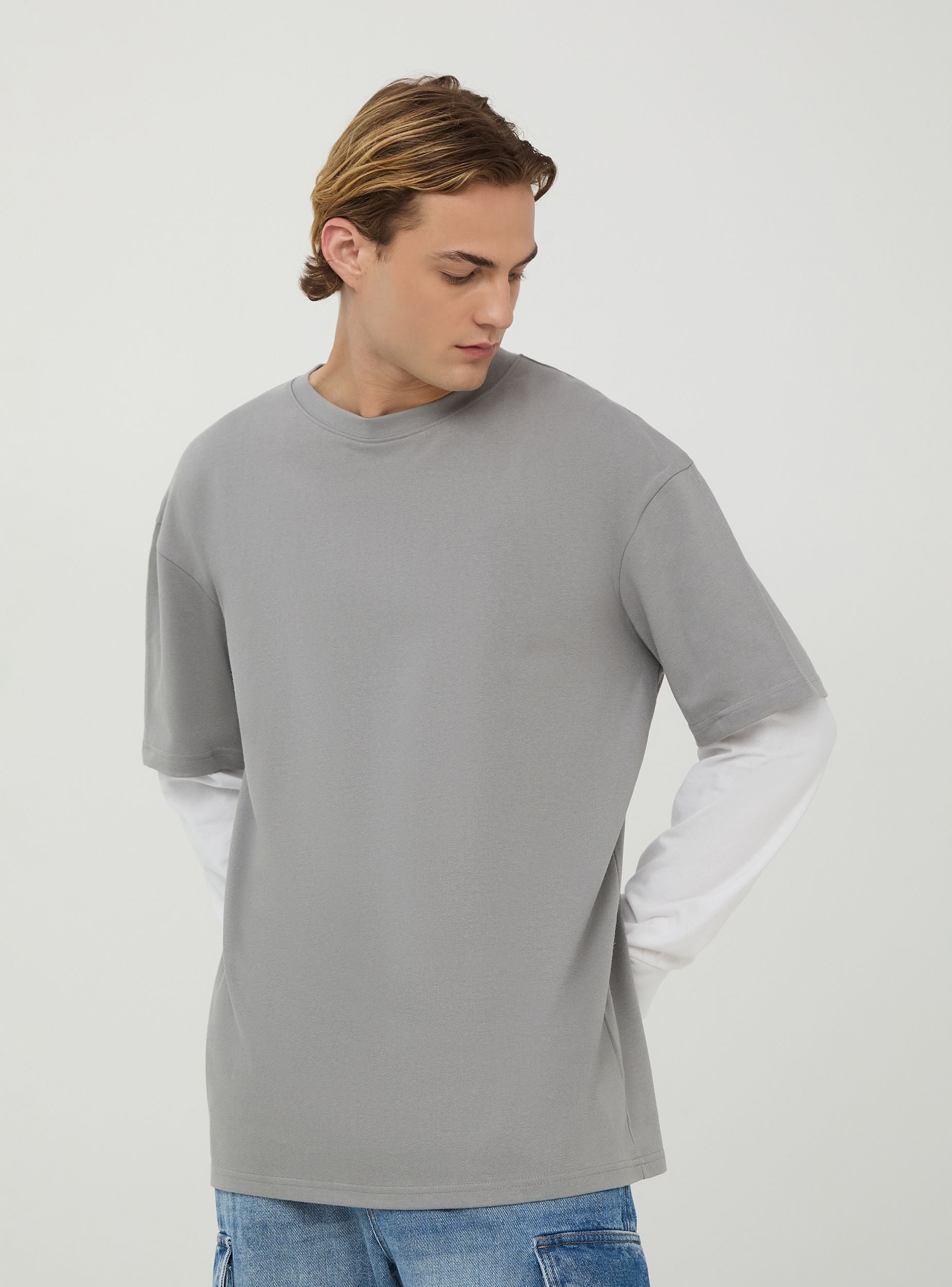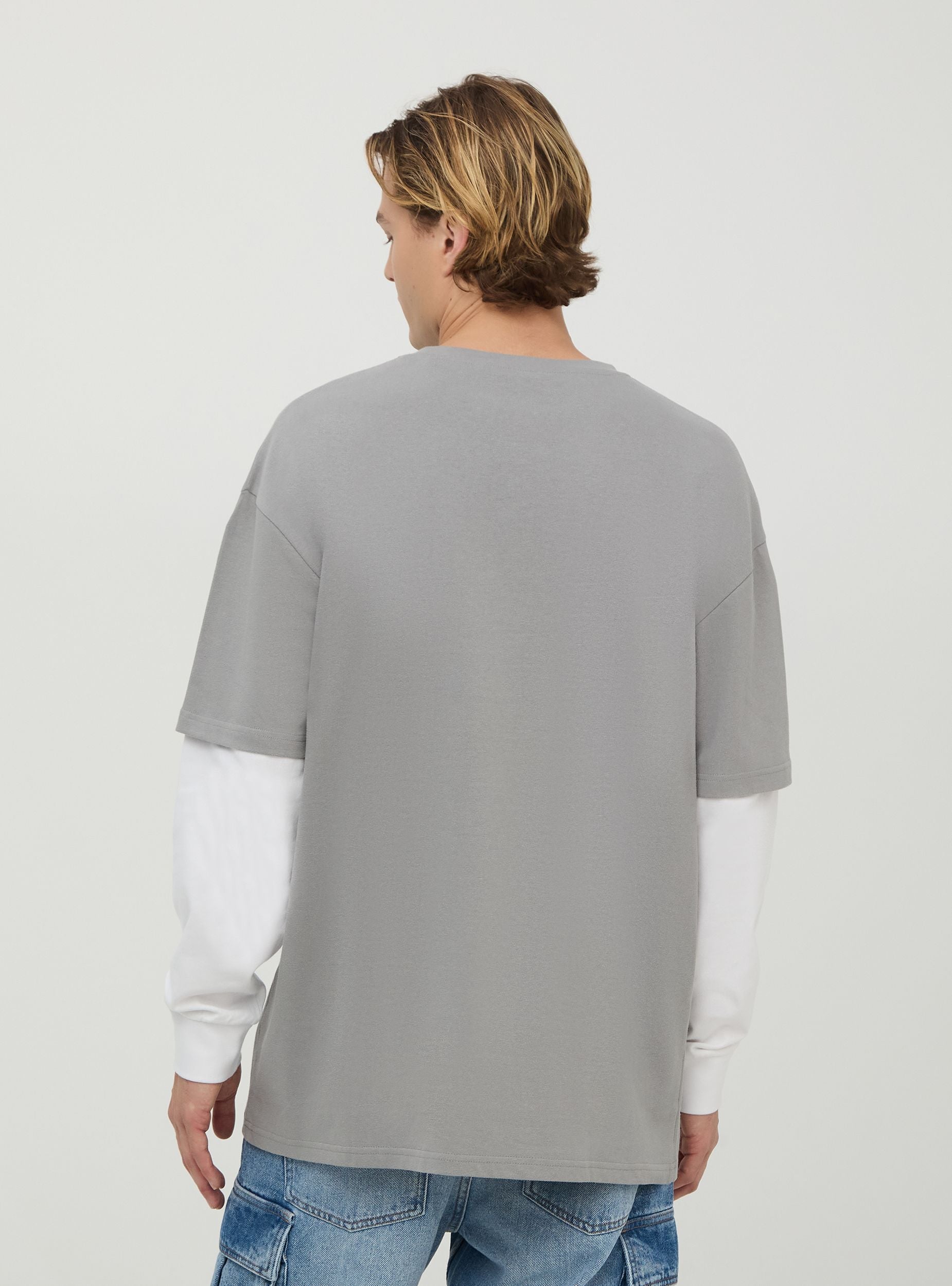 This men's top features a modern design with a double-layer effect, ideal for a casual and trendy look. The loose fit ensures a comfortable and relaxed wear, perfect for everyday use. The top has long sleeves under a short-sleeved t-shirt, creating a stylish and original contrast. This piece is perfect for adding a touch of style to your wardrobe while always maintaining a fresh and contemporary appearance.Details