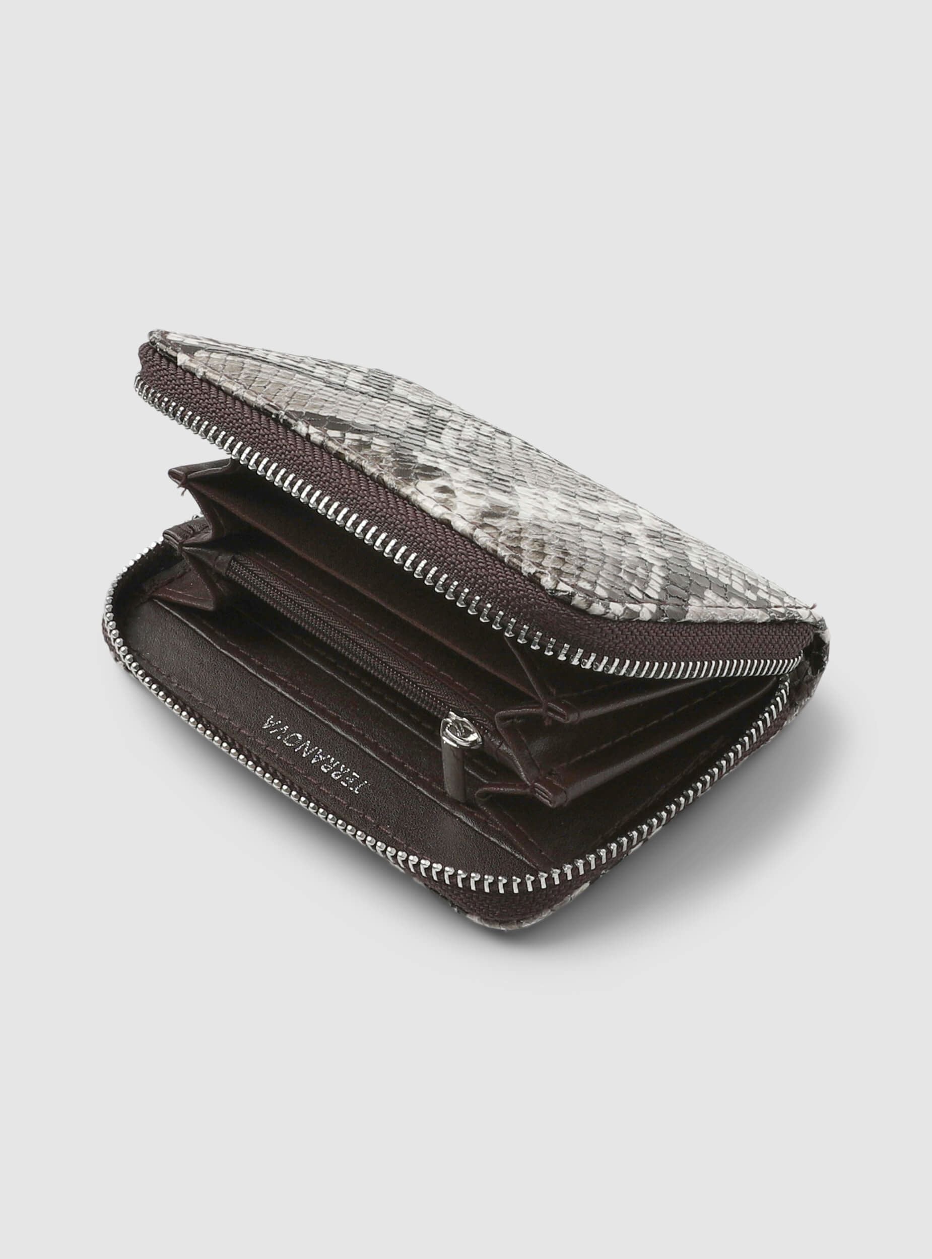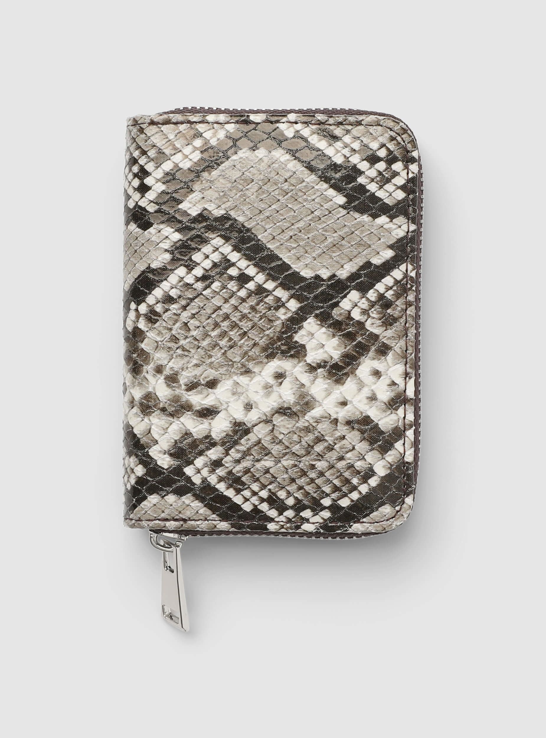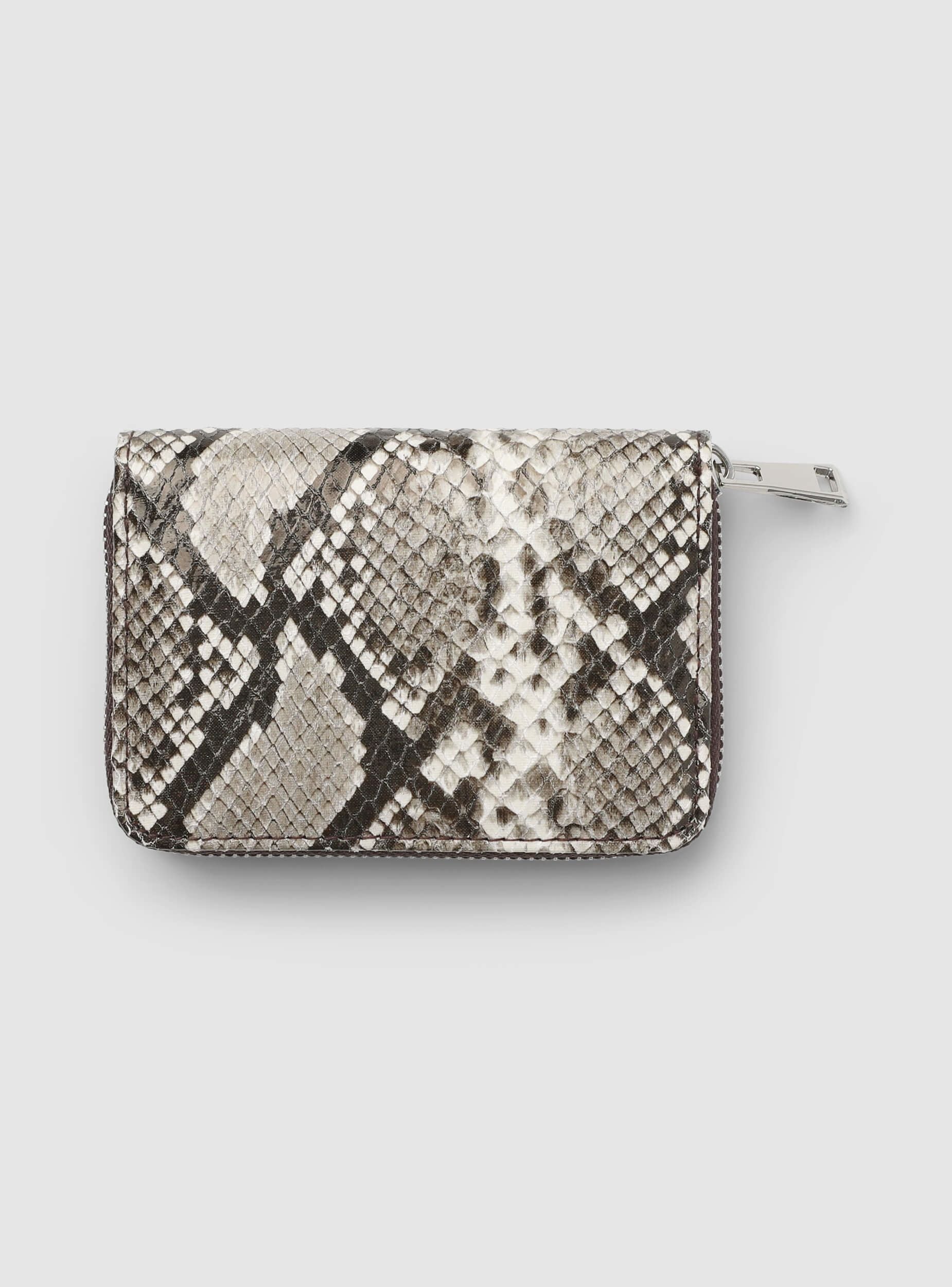 Women's wallet with an elegant and compact design, ideal for organising cards and cash. Perfect for being stored in bags of various sizes, it offers practicality and style for every occasion. The zip closure ensures security and ease of use, while the snakeskin pattern adds a touch of sophistication to the look. Dimensions: Height 9 cm, Length 13 cm, Depth 2.5 cm.
