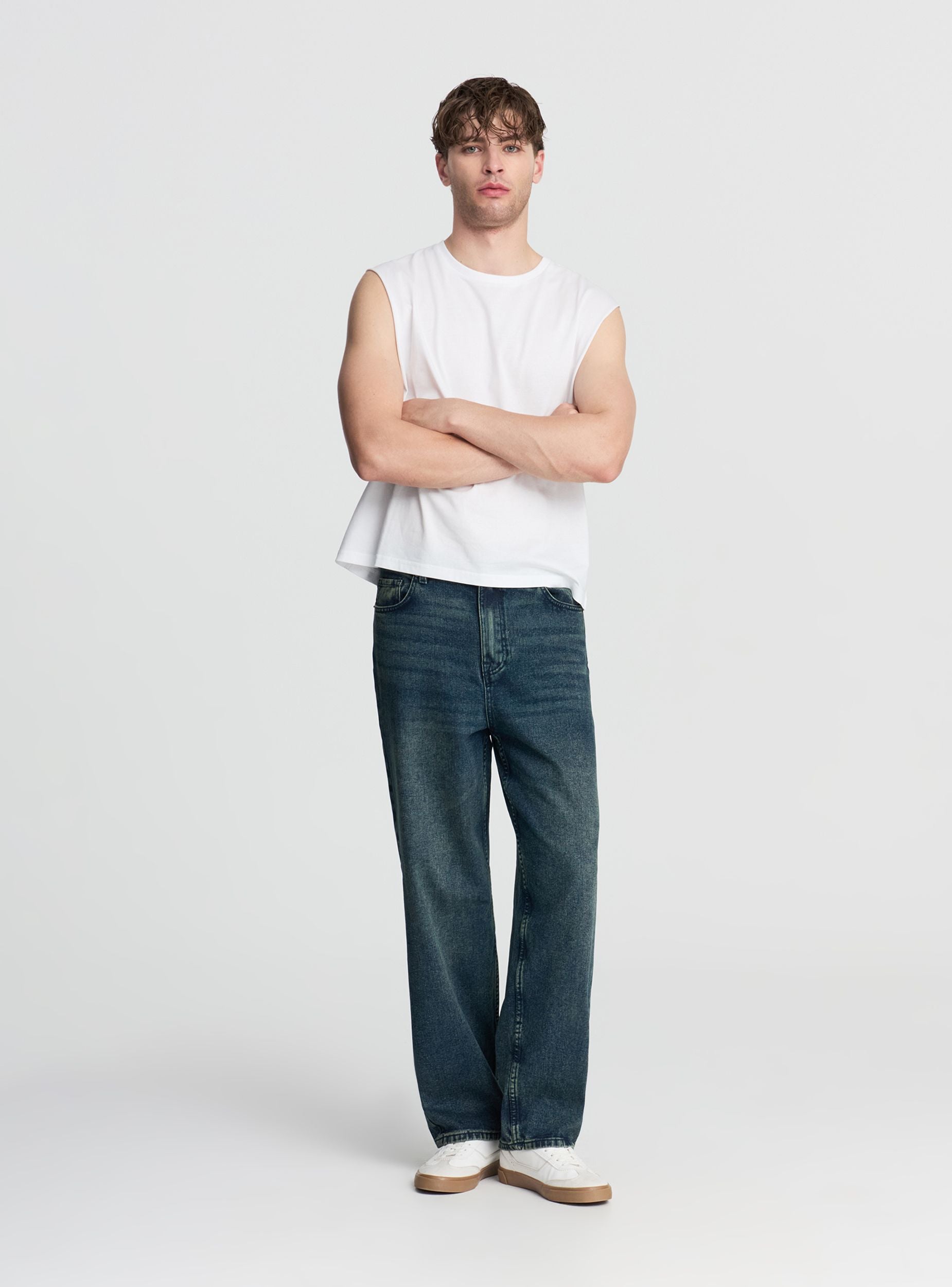 Jeans de hombre de estilo super-baggy con corte amplio y lavado al té, perfectos para un look urbano y moderno. Equipados con cierre de cremallera y botón, trabillas para cinturones y un diseño de cinco bolsillos, se combinan con camisas oversize o camisetas para outfits casuales ideales para el tiempo libre o salidas informales.Detalles