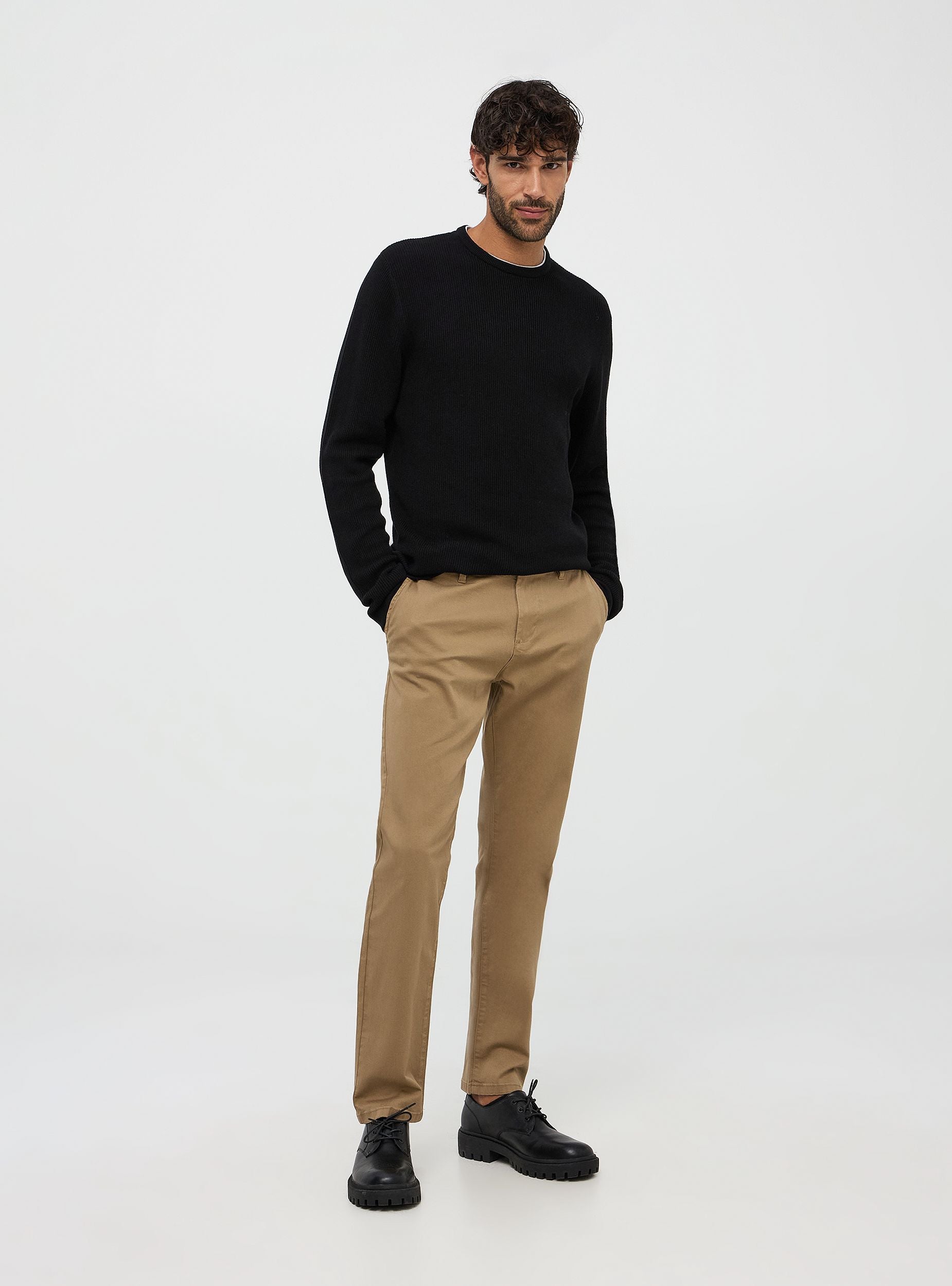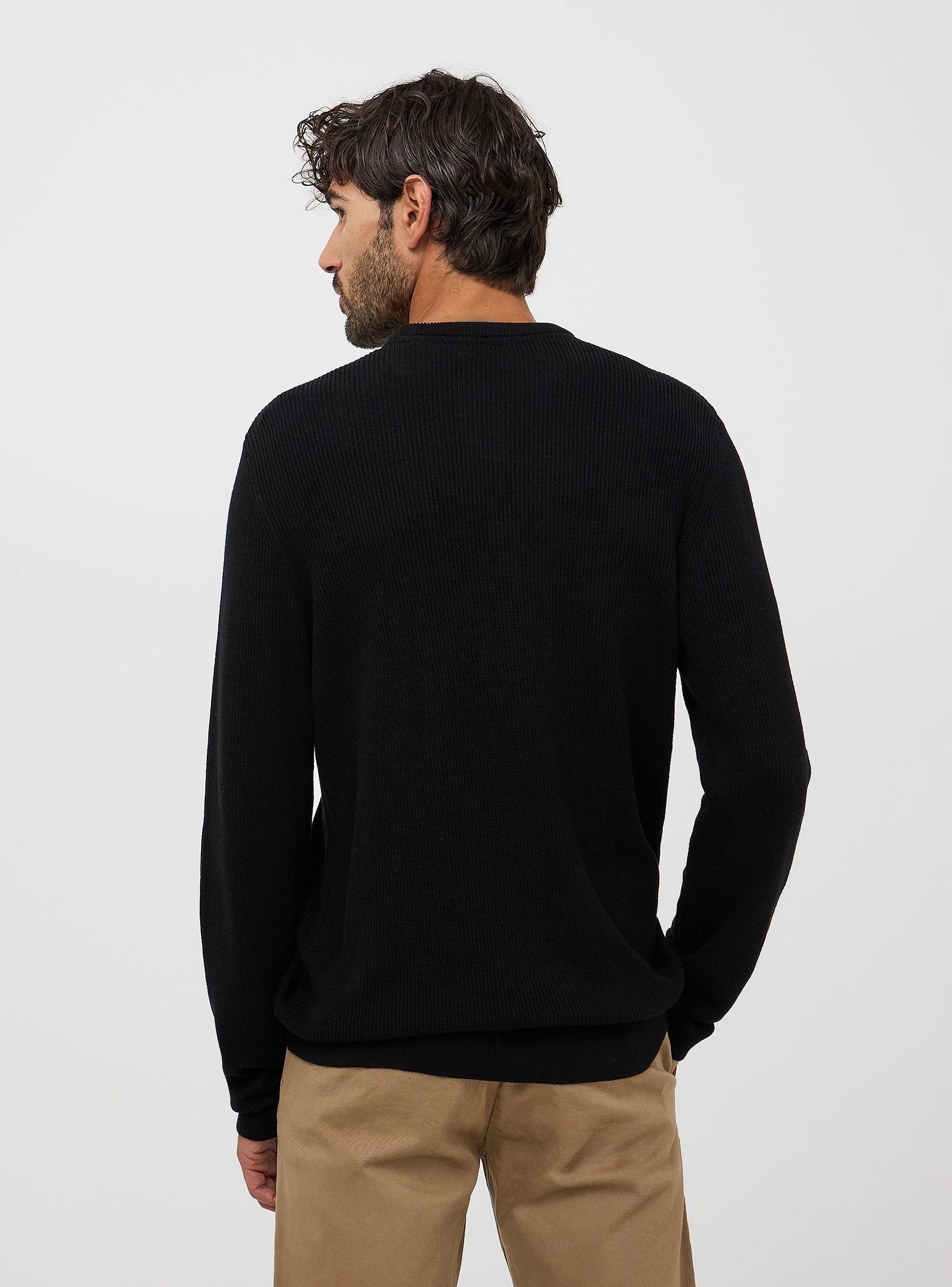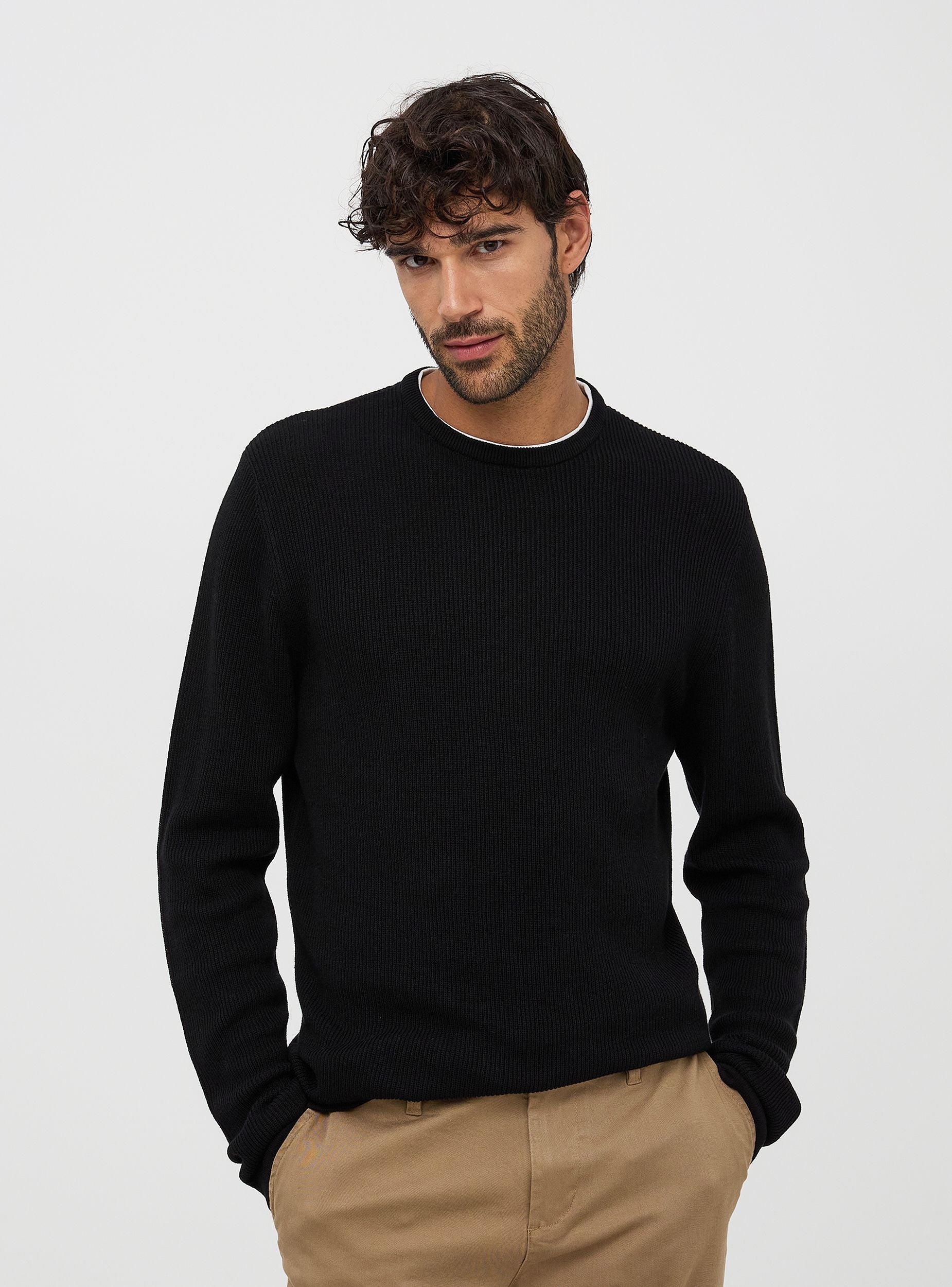 Sudadera de hombre de manga larga con escote redondo, caracterizada por un tejido de canalé que le da un efecto texturizado. El detalle distintivo es el cuello en contraste en blanco que añade un toque de originalidad. La silueta es regular y cómoda, ideal para un look casual y refinado. Perfecta para llevar sola o debajo de una chaqueta en los días más frescos, esta sudadera combina estilo y practicidad, convirtiéndola en una prenda versátil para el guardarropa masculino.