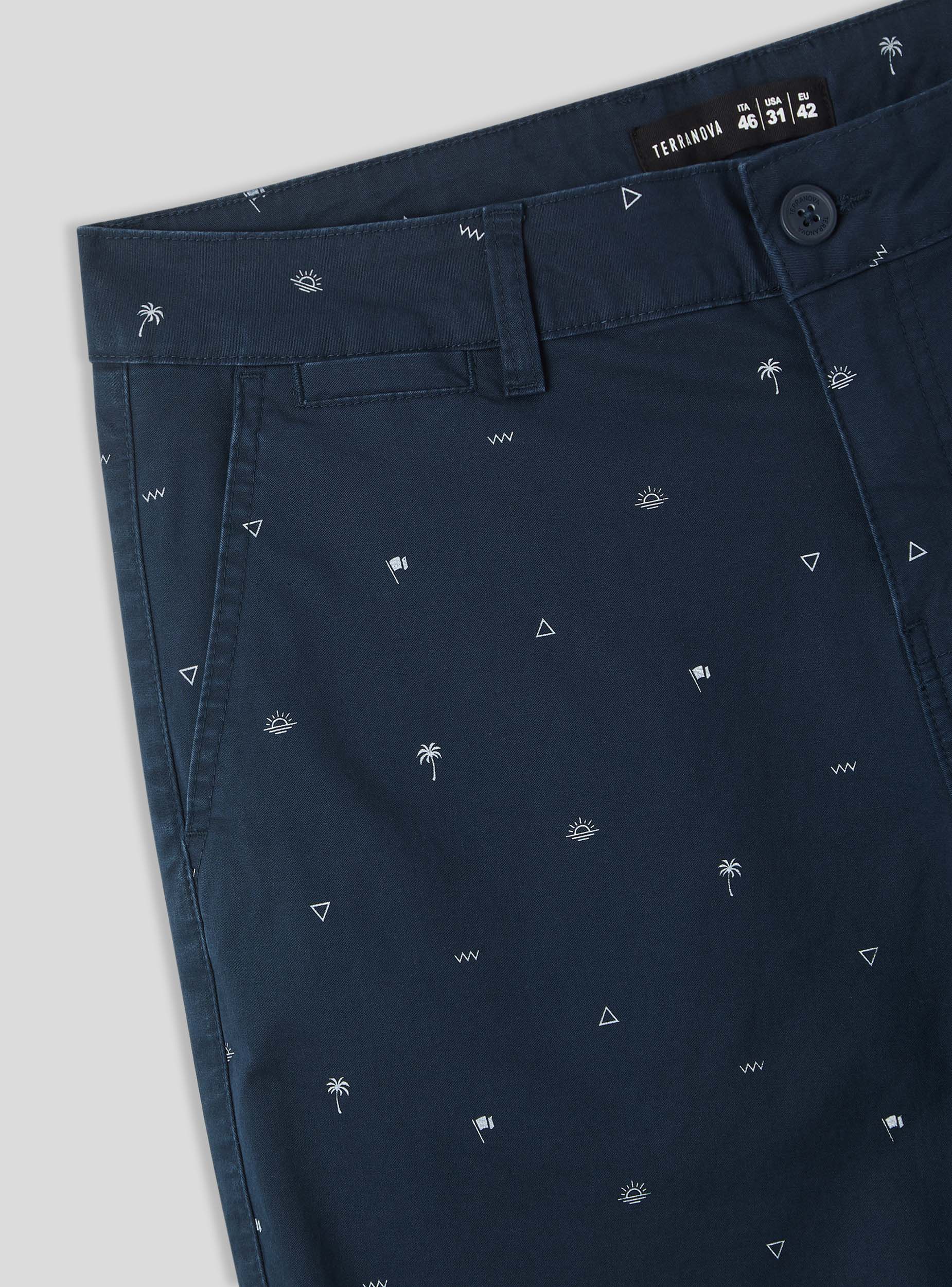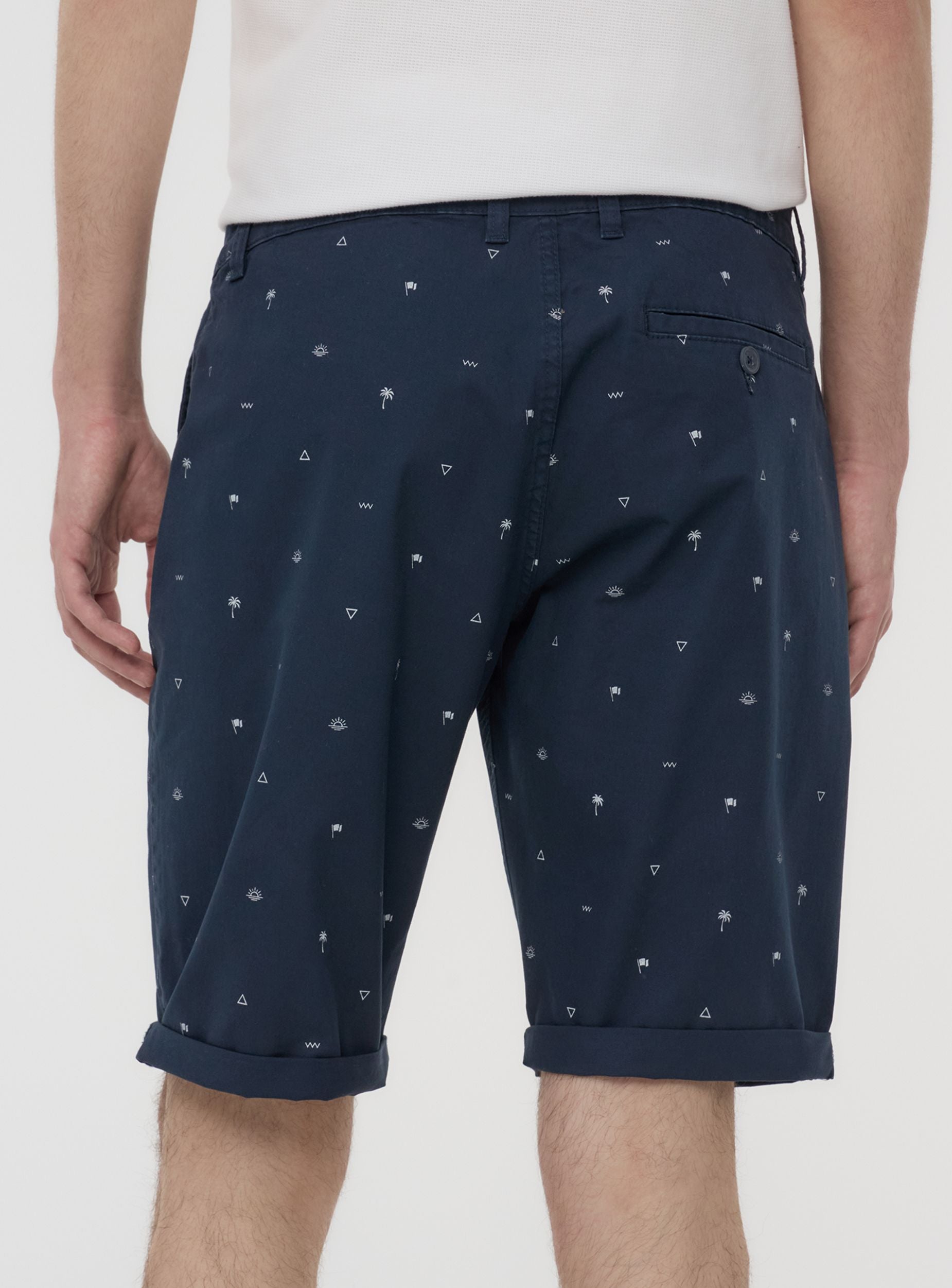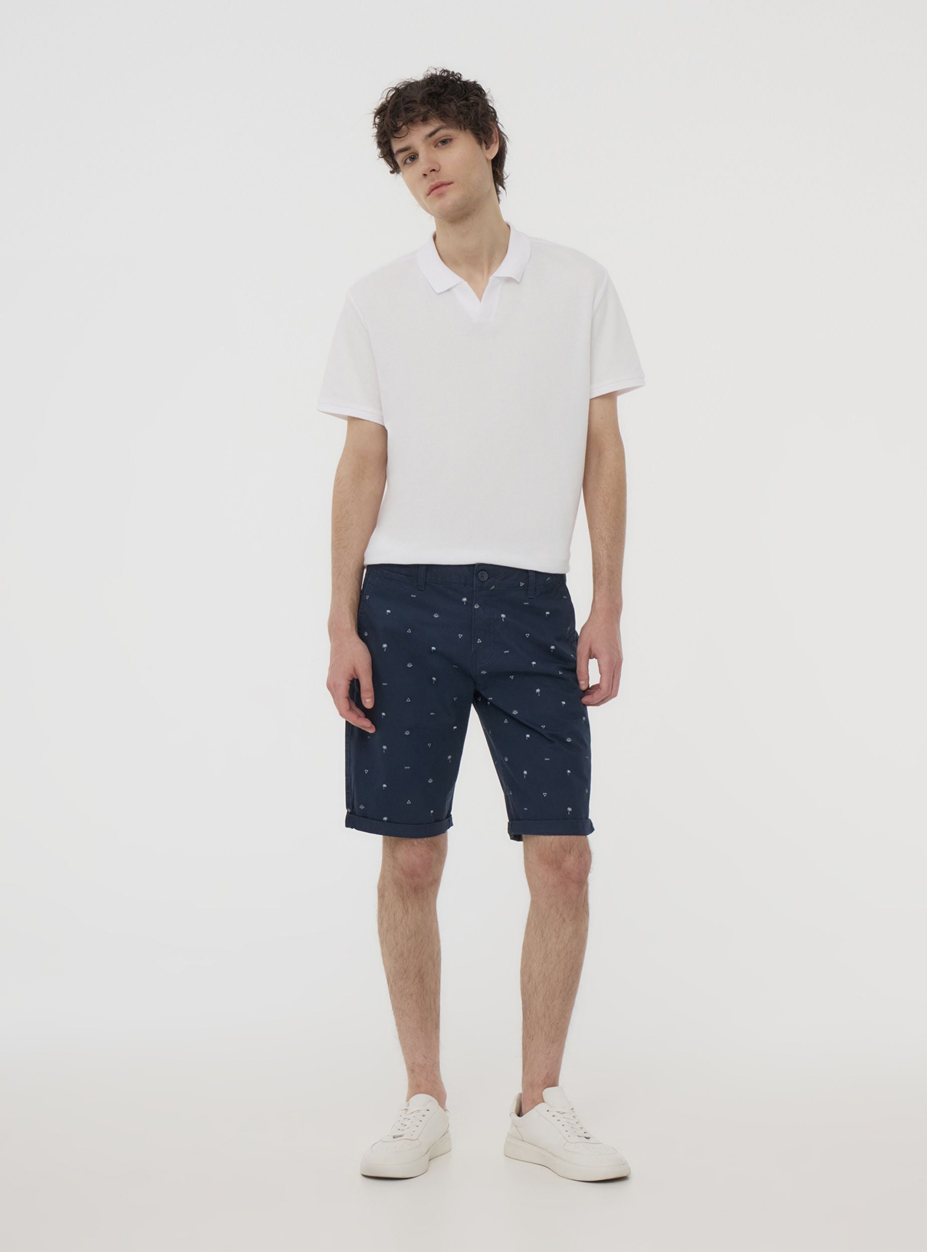 'Pantalones cortos de hombre, modelo chino, ideales para un look casual y relajado, perfectos para el tiempo libre o para un atuendo de verano. Caracterizados por un ajuste regular, presentan un cierre con botón y bolsillos oblicuos. El diseño con microestampado de tema marino añade un toque de originalidad, haciéndolos versátiles y adecuados para múltiples ocasiones.'Detalles