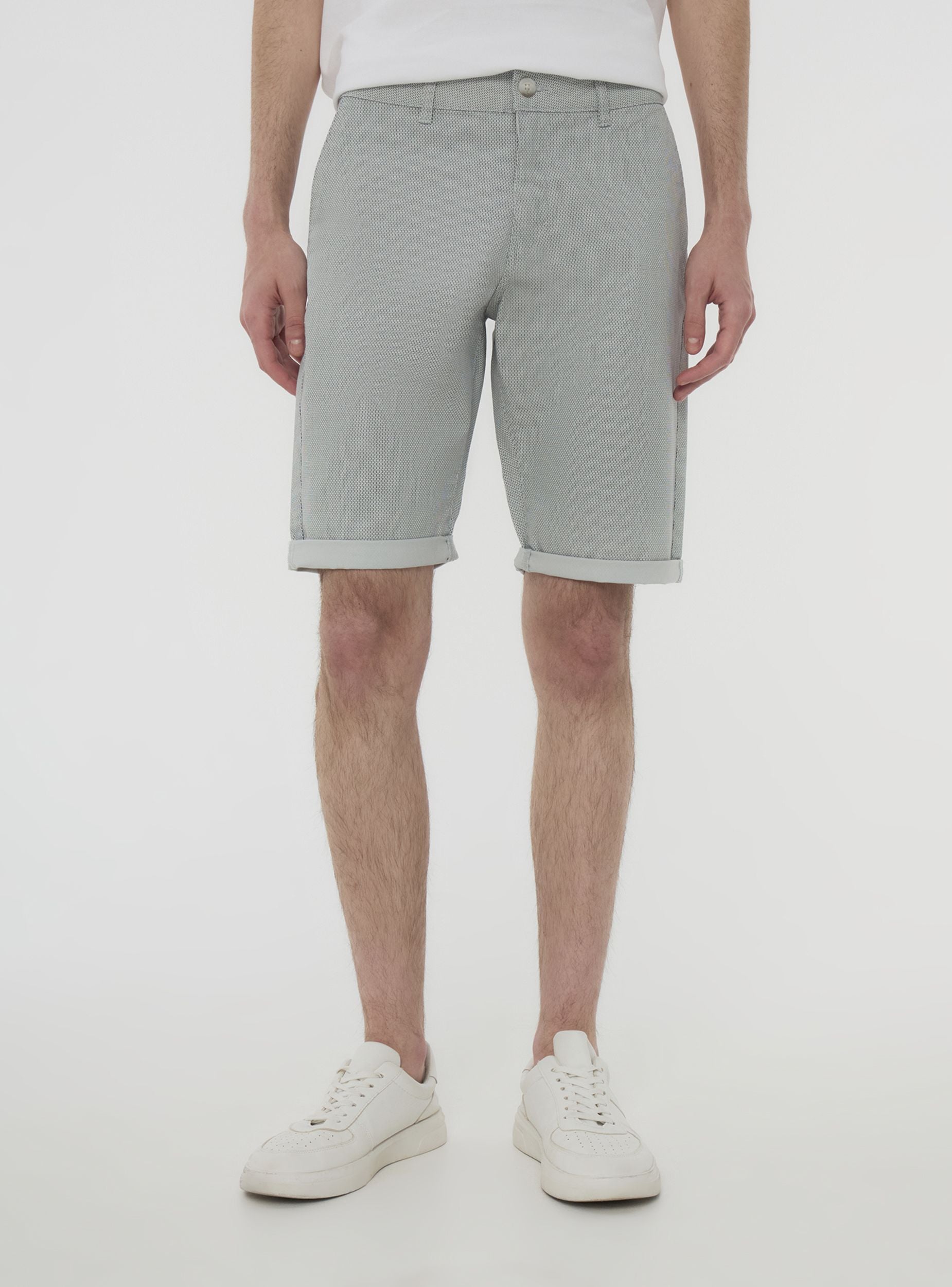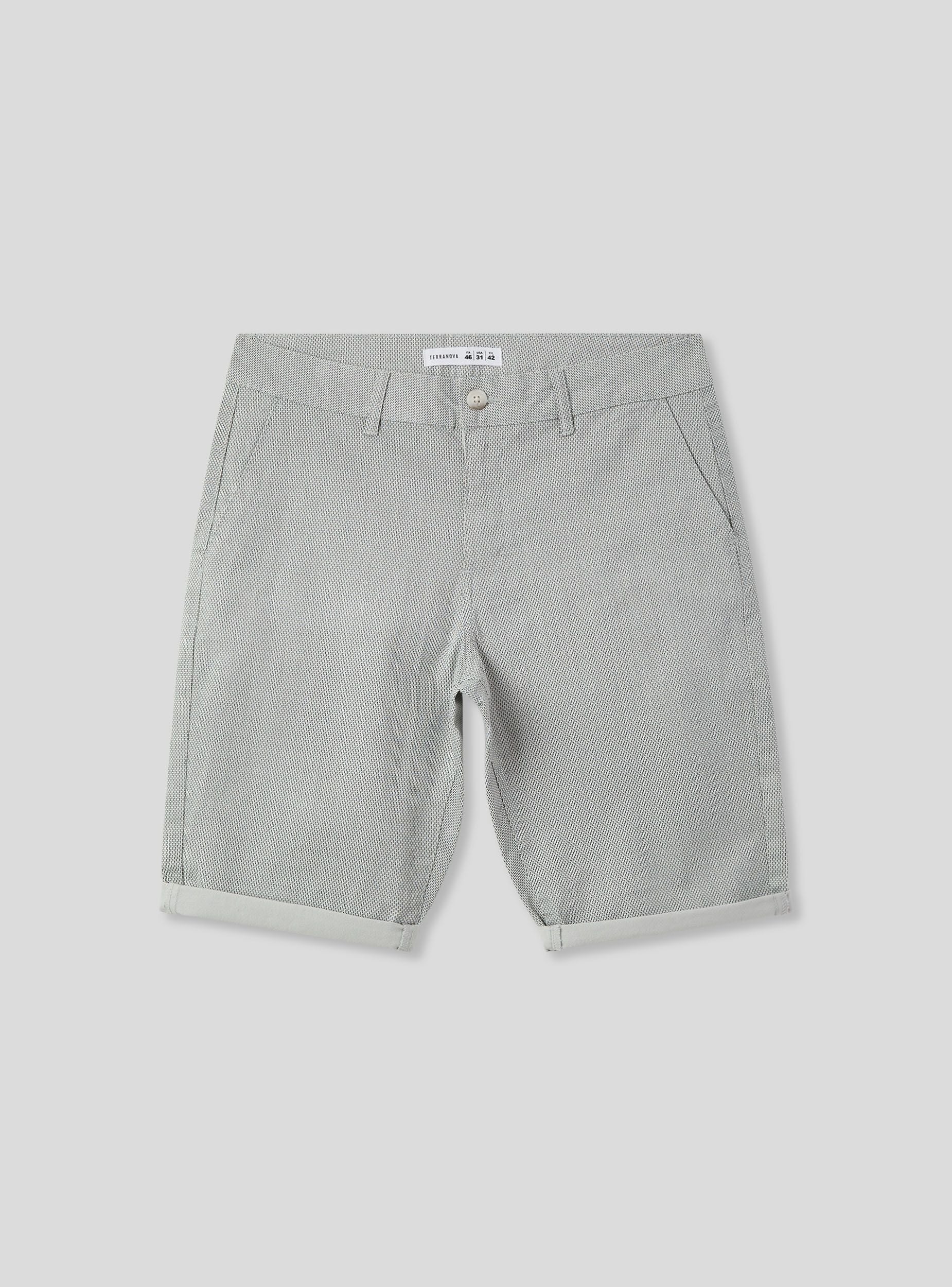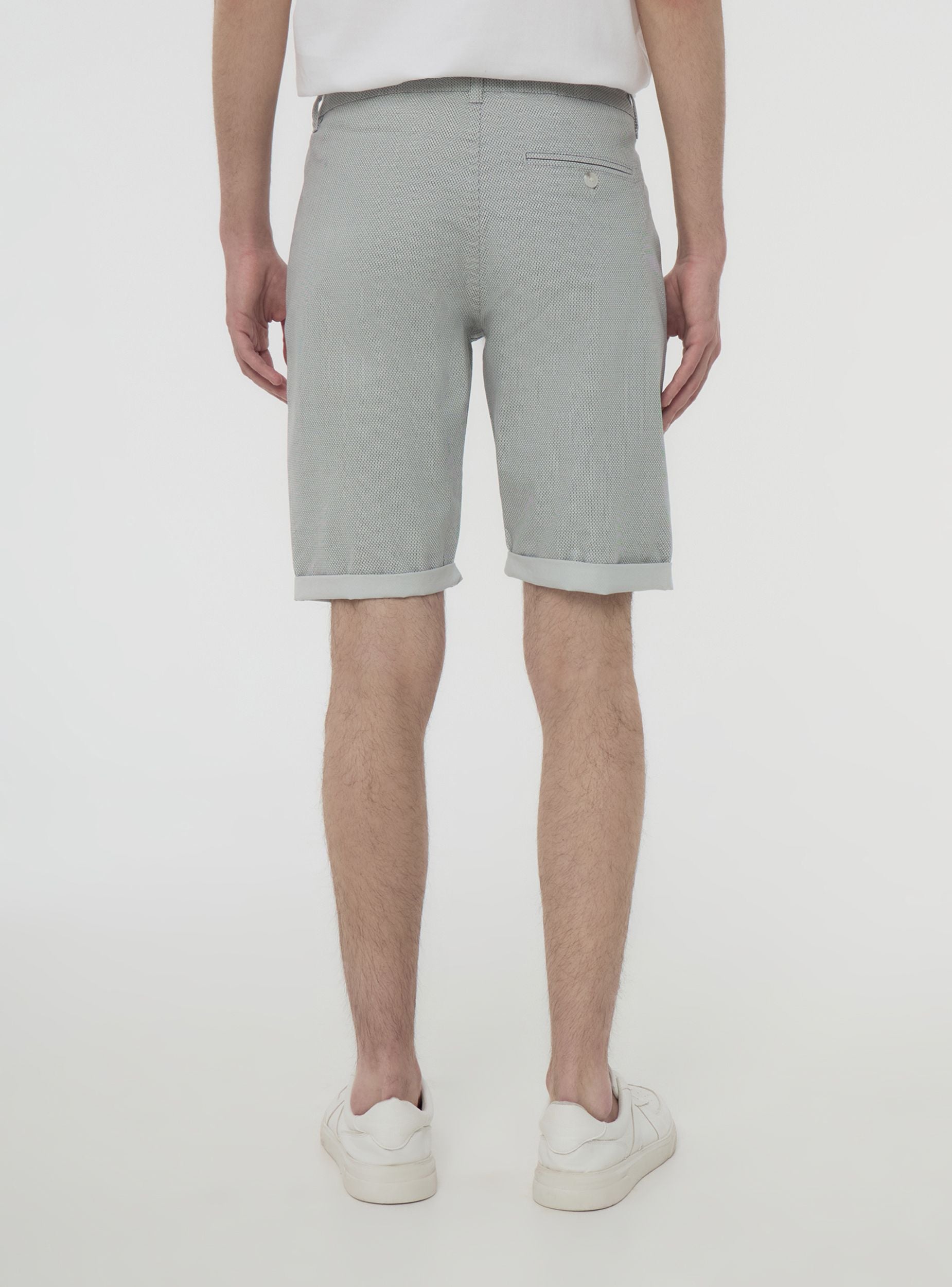 'Pantalones cortos de hombre, modelo chino, ideales para un look casual y versátil, perfectos para el tiempo libre o para un atuendo informal. Caracterizados por un ajuste regular, presentan una microfantasía geométrica y bolsillos oblicuos. Una prenda práctica y cómoda para quienes buscan estilo y funcionalidad.'Detalles