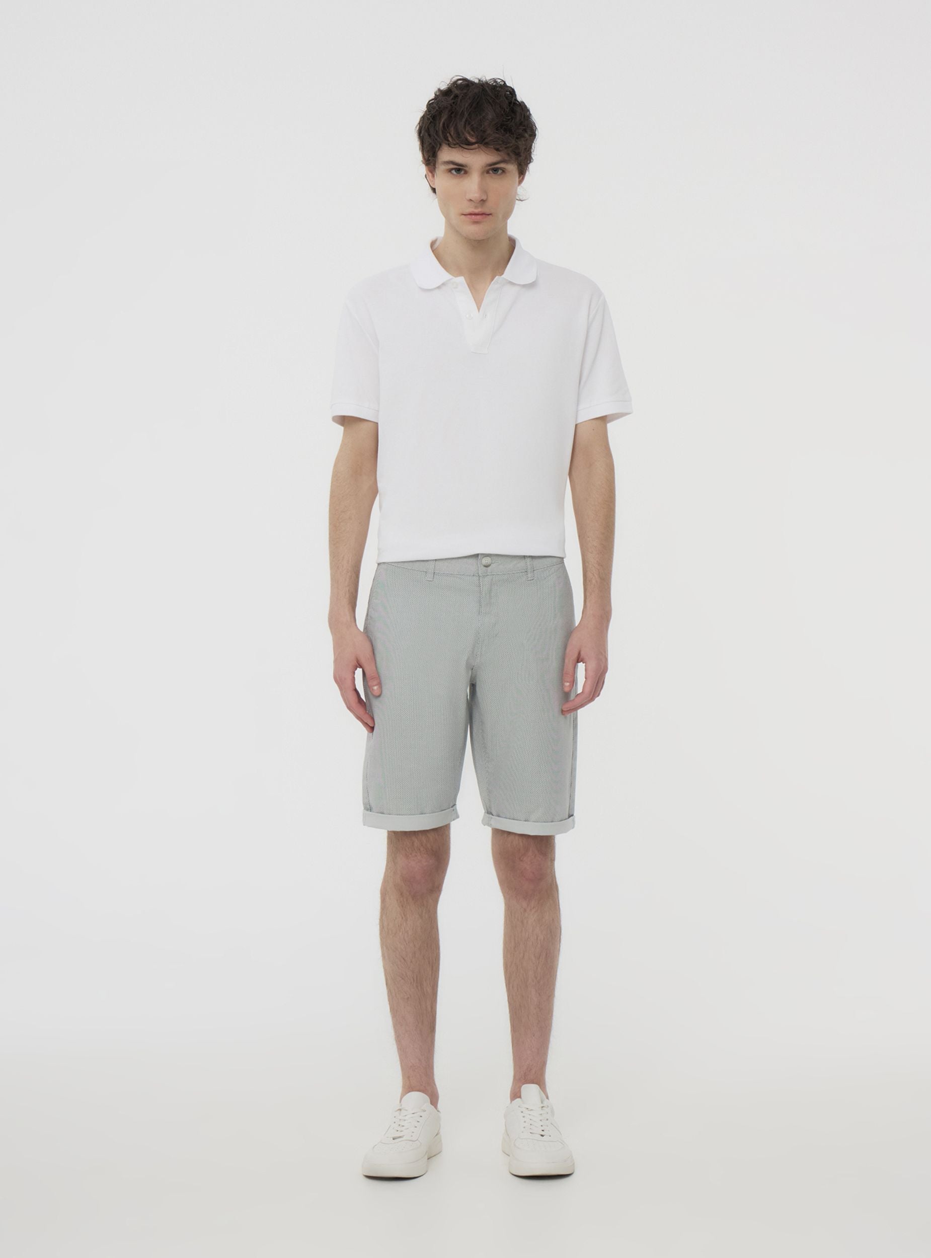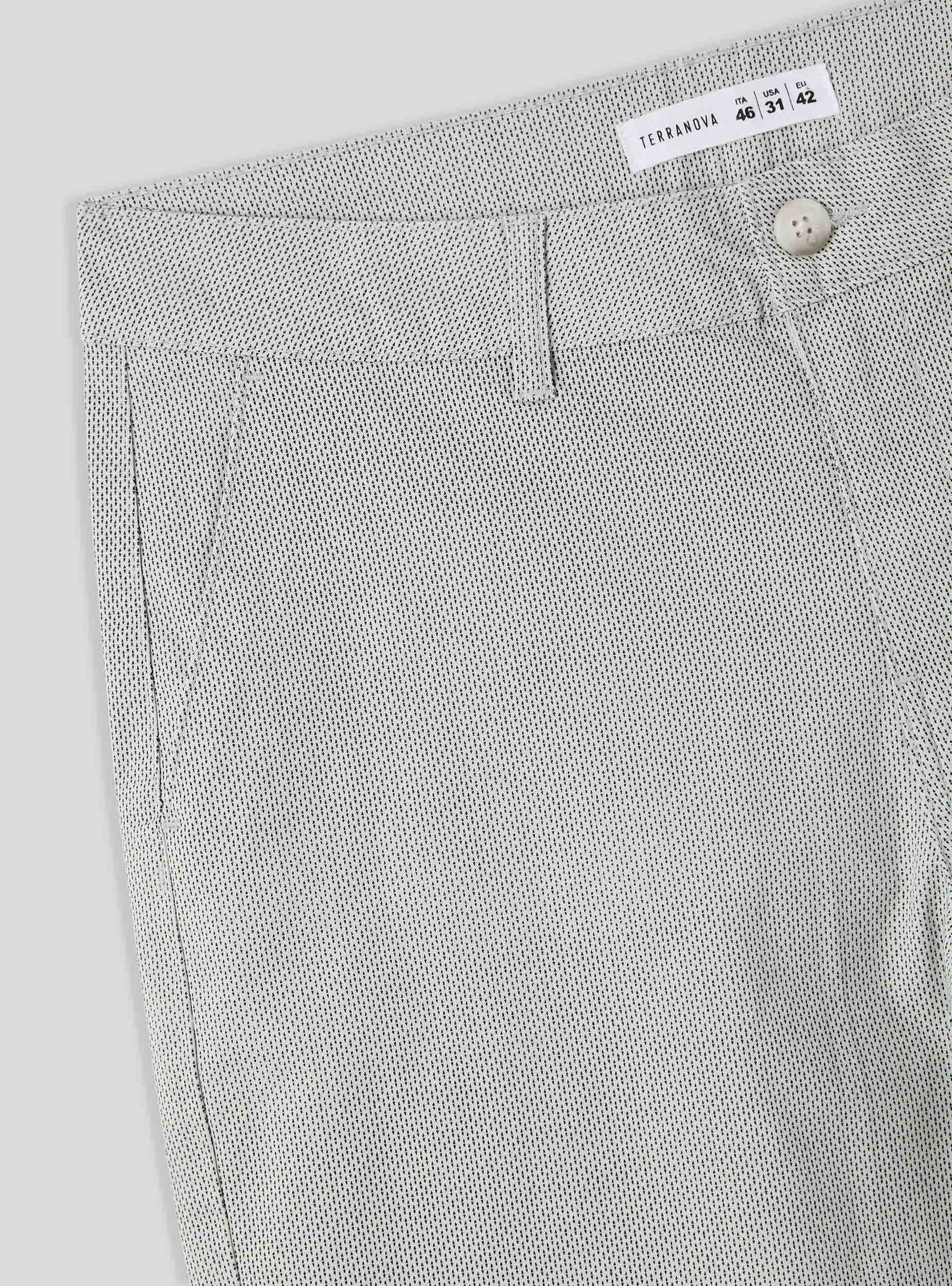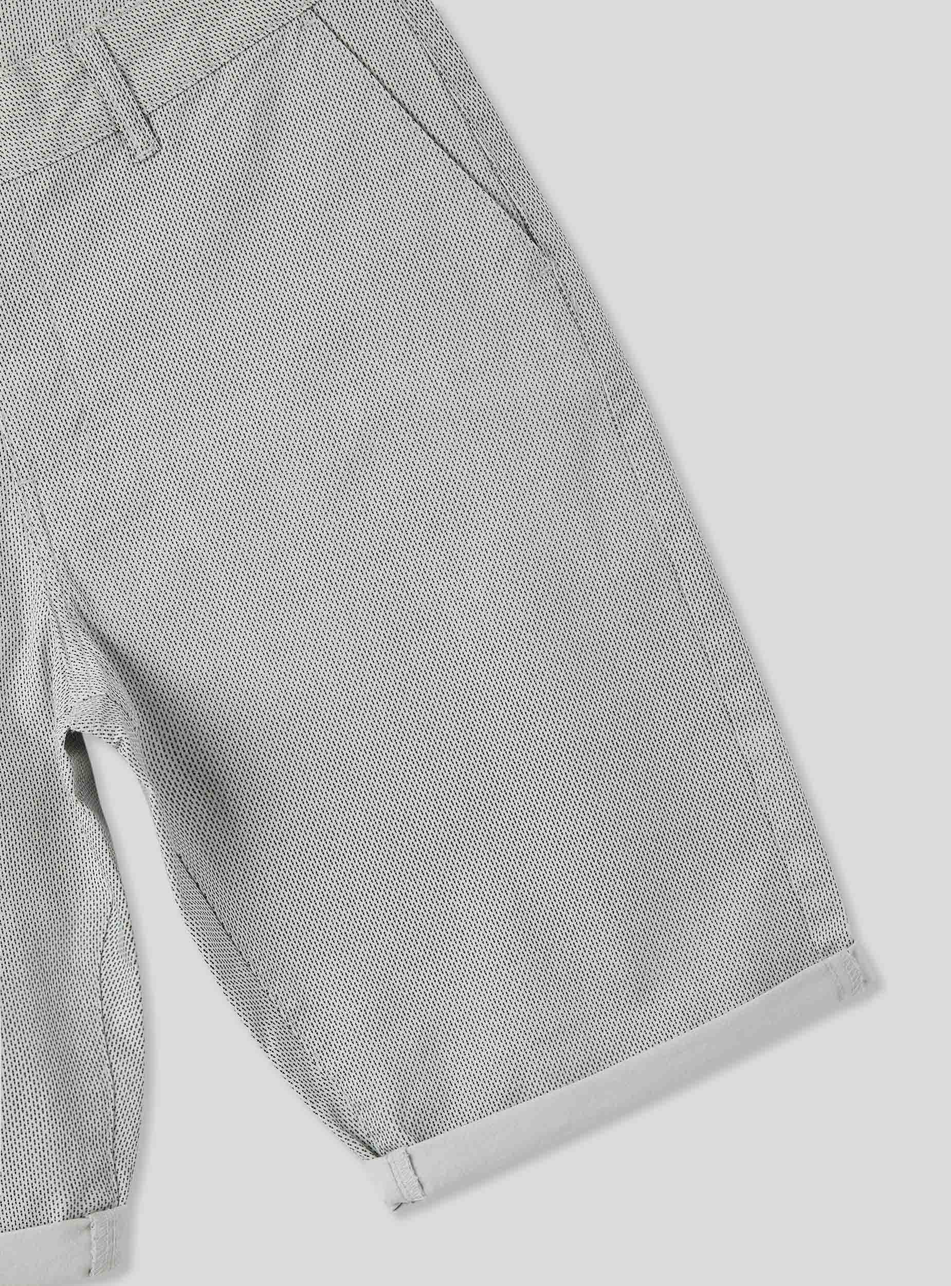 'Pantalones cortos de hombre, modelo chino, ideales para un look casual y versátil, perfectos para el tiempo libre o para un atuendo informal. Caracterizados por un ajuste regular, presentan una microfantasía geométrica y bolsillos oblicuos. Una prenda práctica y cómoda para quienes buscan estilo y funcionalidad.'Detalles