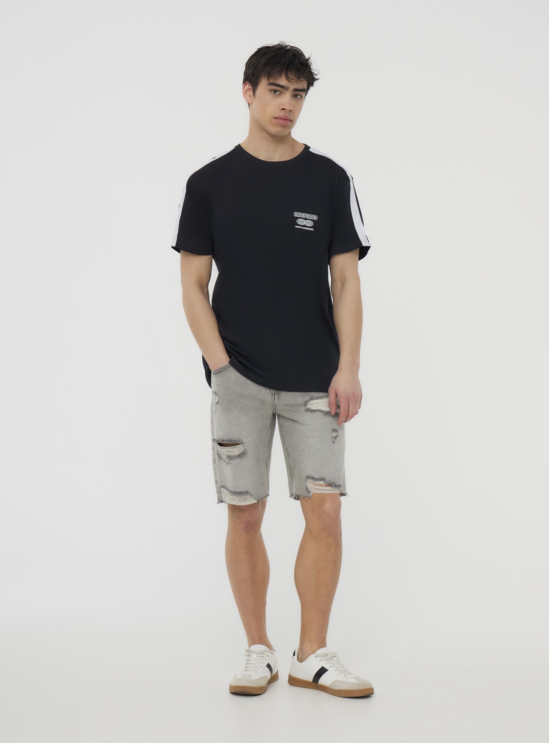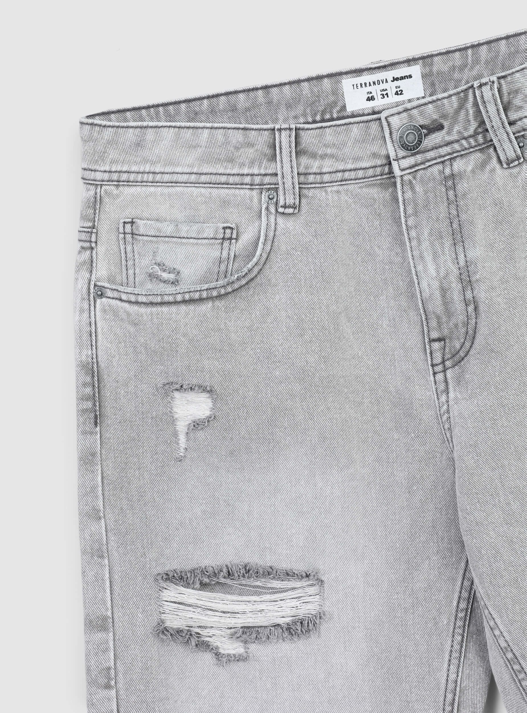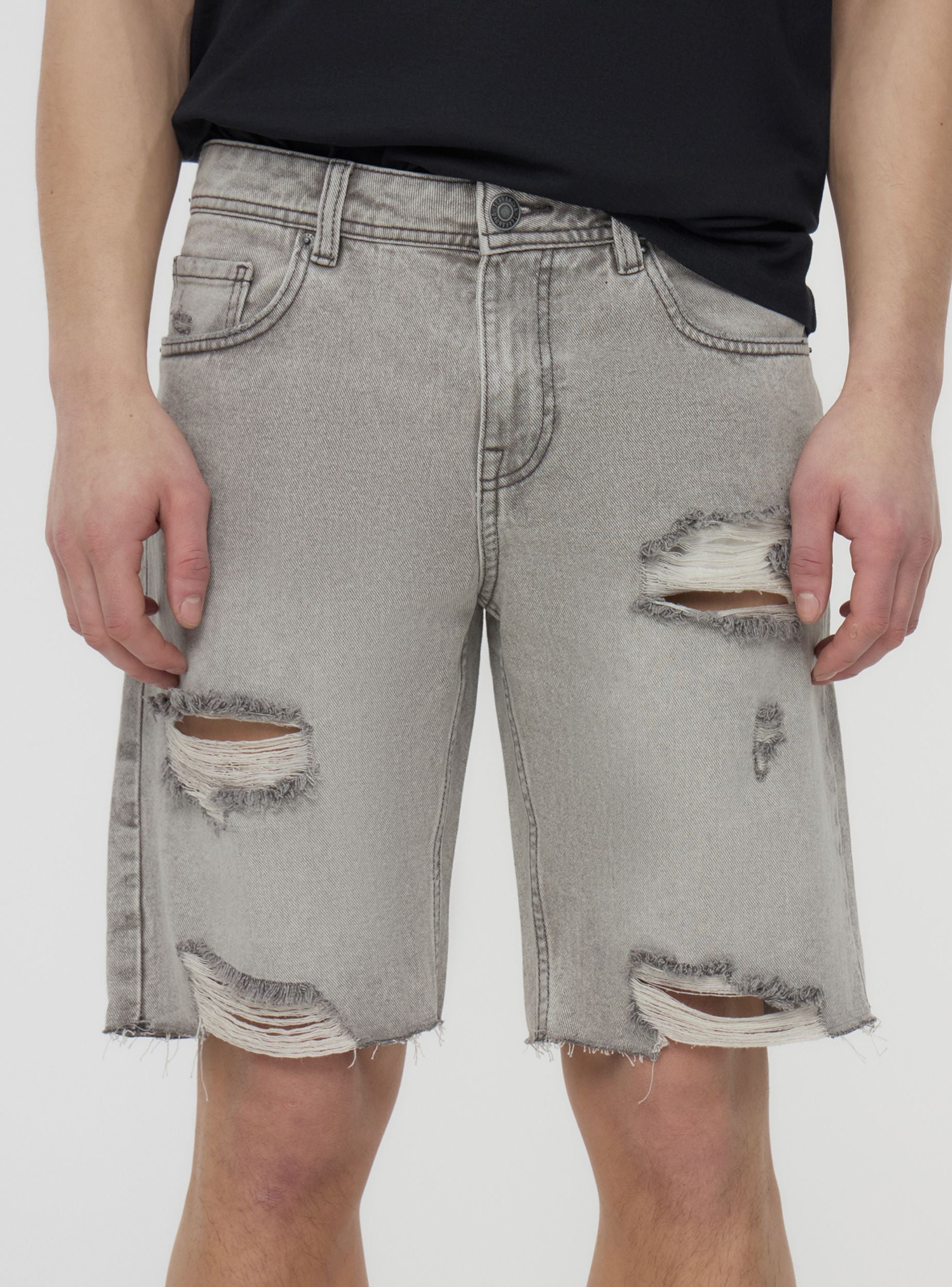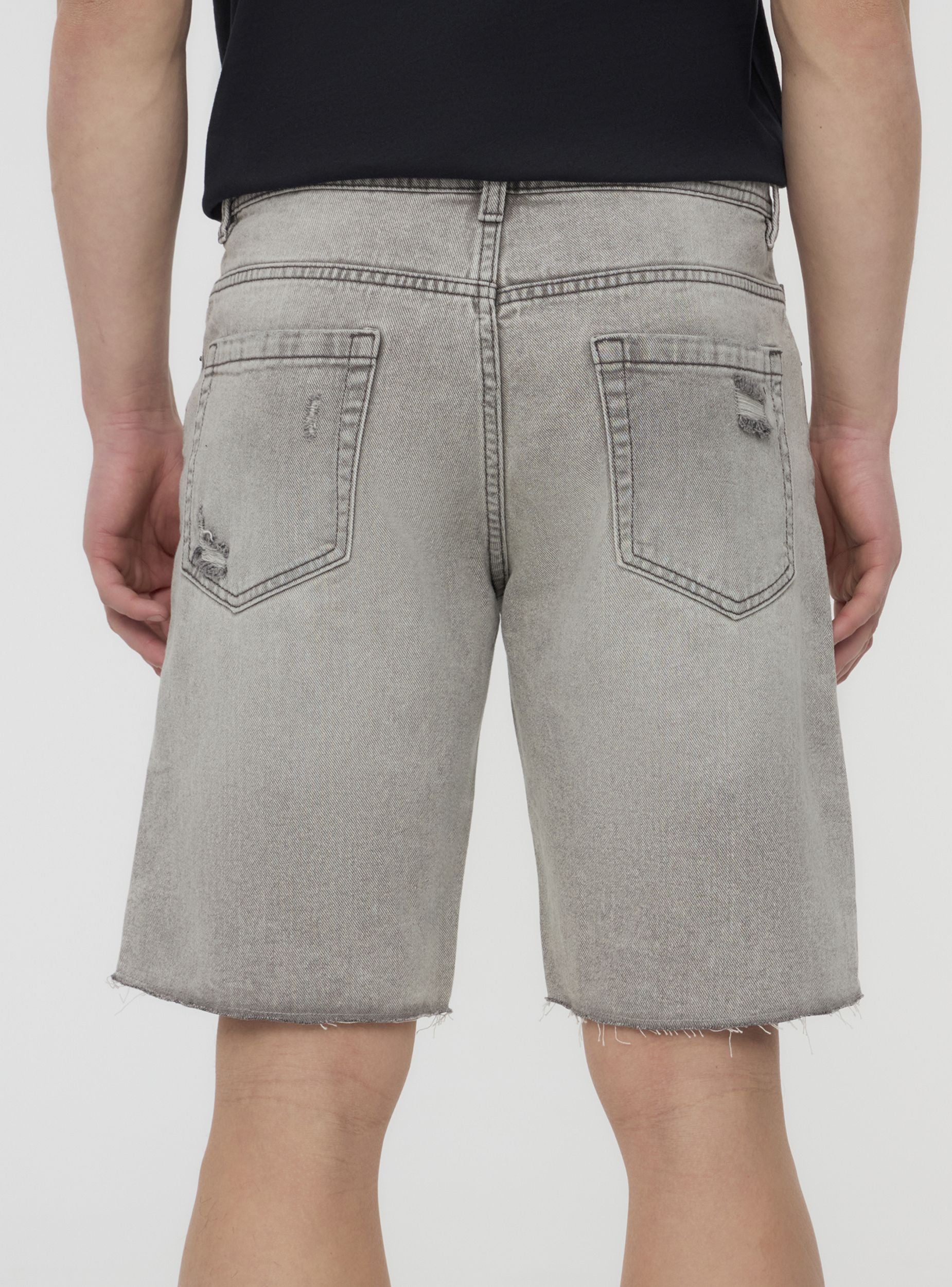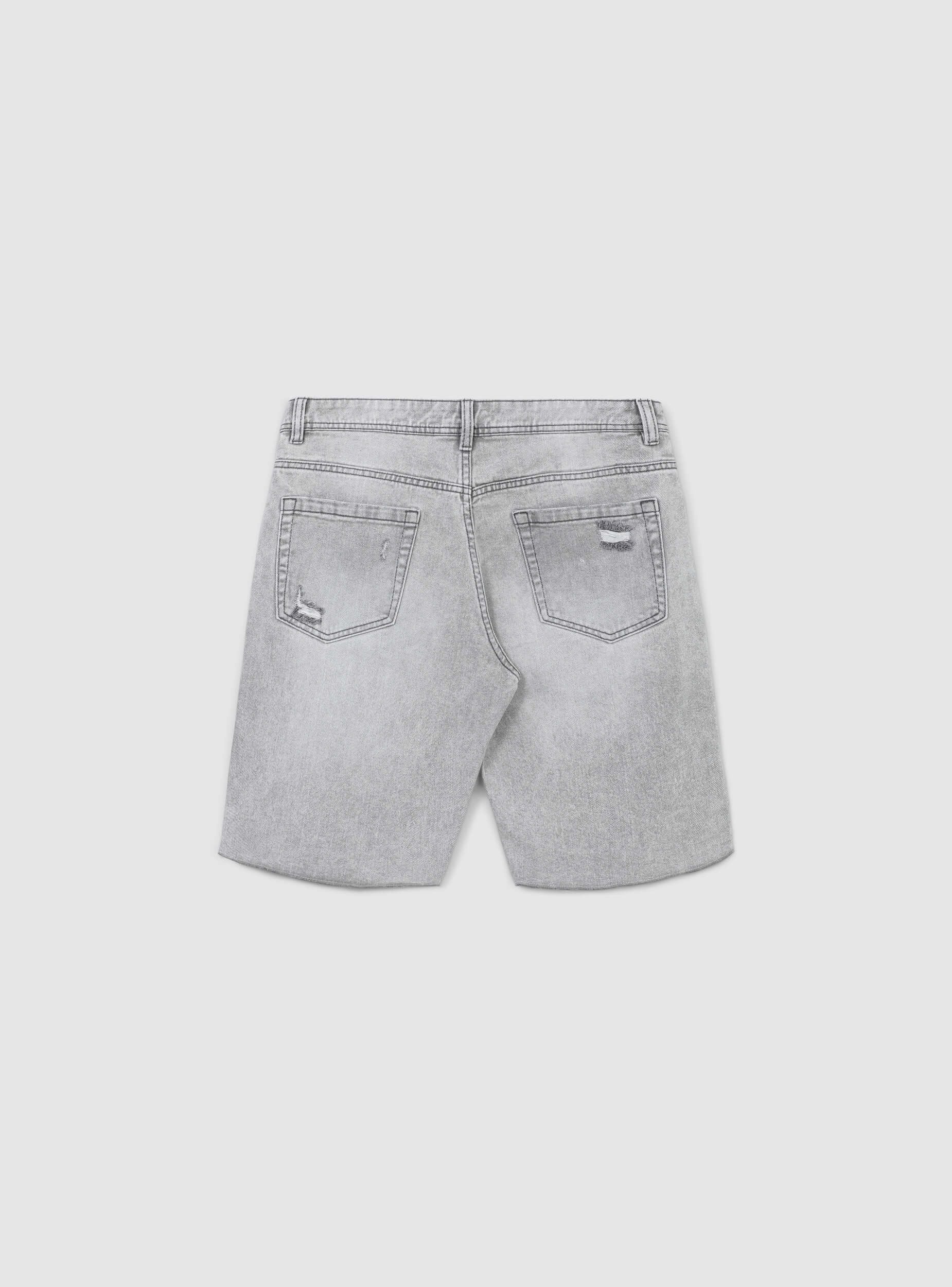 'Pantalones cortos de hombre en denim de lavado gris, ideales para un look casual y dinámico, perfectos para el tiempo libre. Caracterizados por un ajuste regular, presentan detalles deshilachados y rotos para un toque moderno y audaz. Cuentan con trabillas en la cintura, cinco bolsillos y cierre con botón y cremallera. Una prenda versátil para combinar con camisetas y zapatillas para un atuendo veraniego.'Detalles