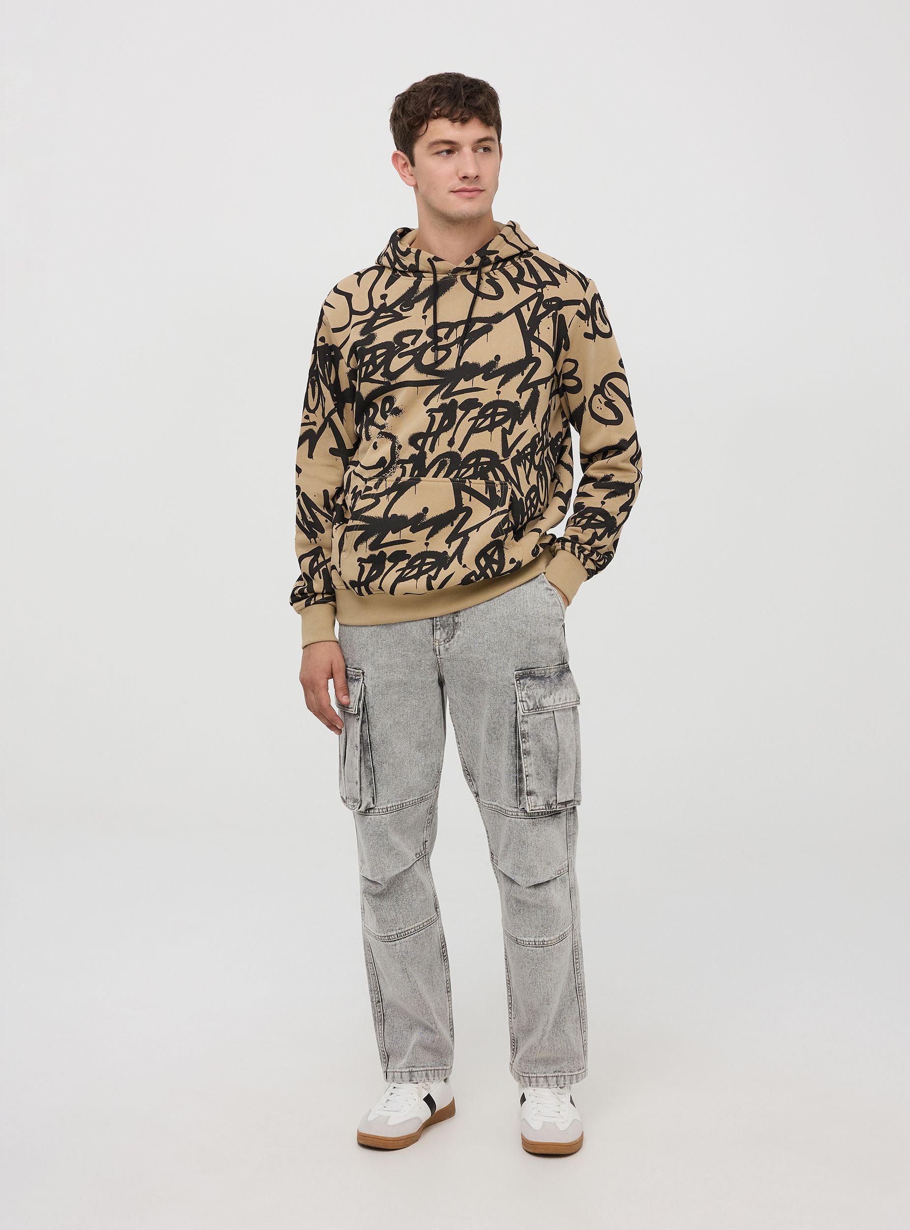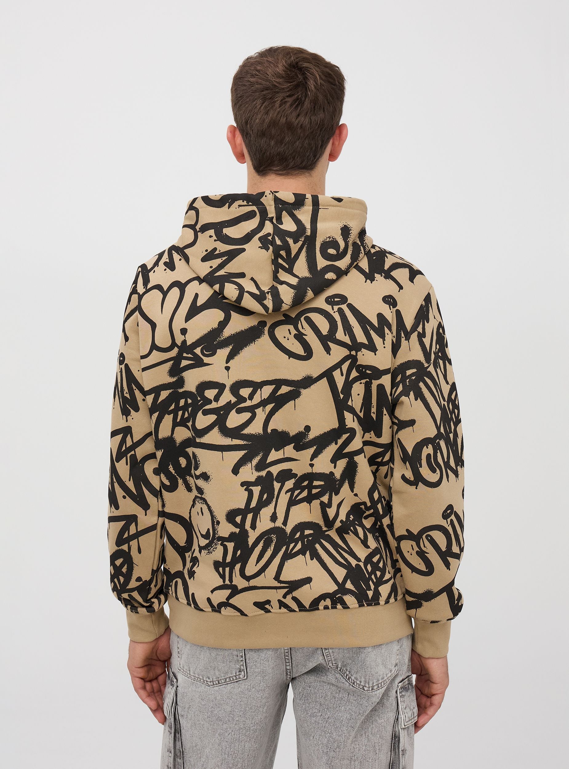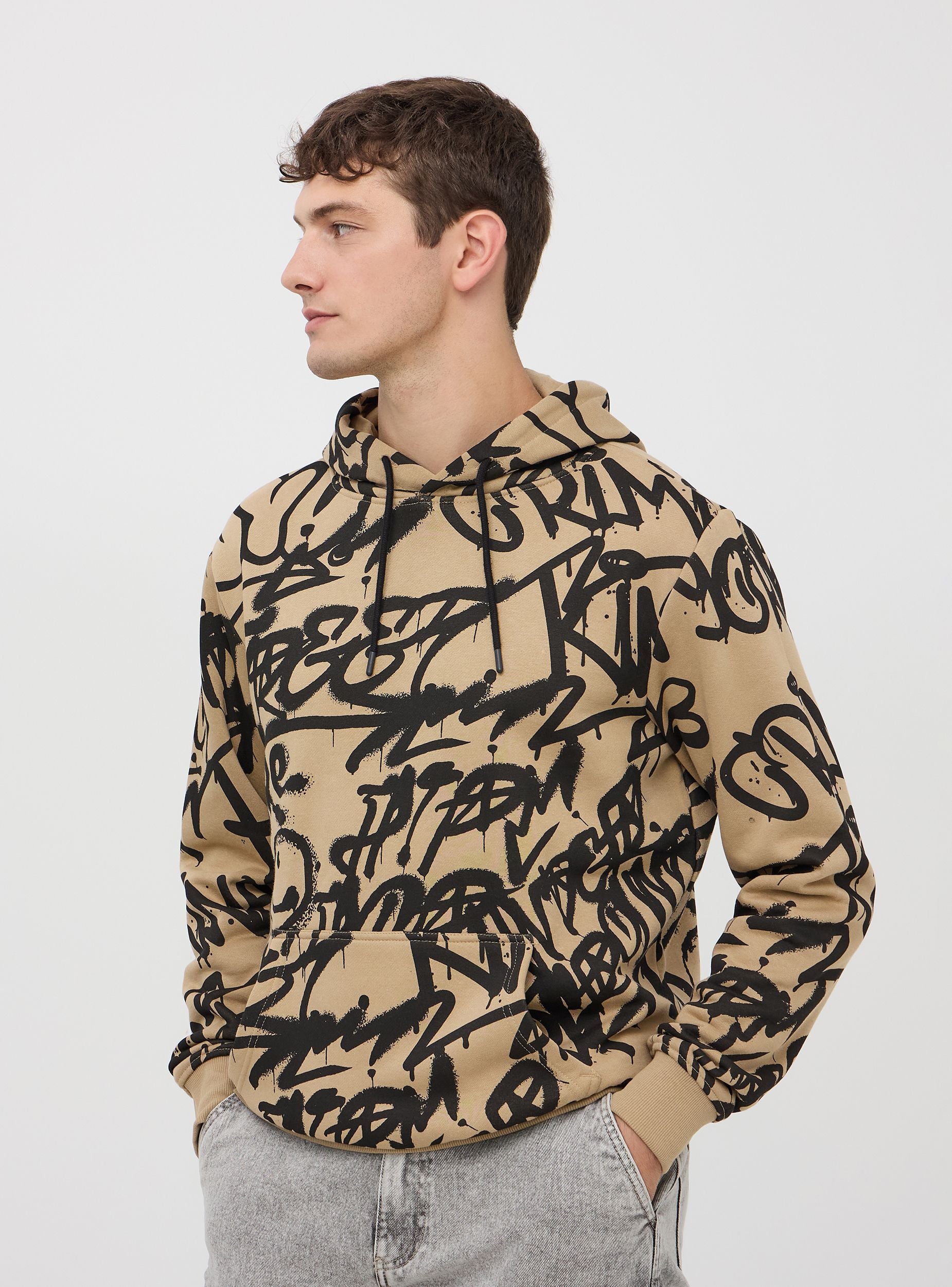 Sudadera de hombre con capucha equipada con cordón, de mangas largas. Tejido pesado con estampado estilo urbano en toda la prenda. Modelo con bolsillo tipo canguro y acabados de canalé. Corte regular.Detalles