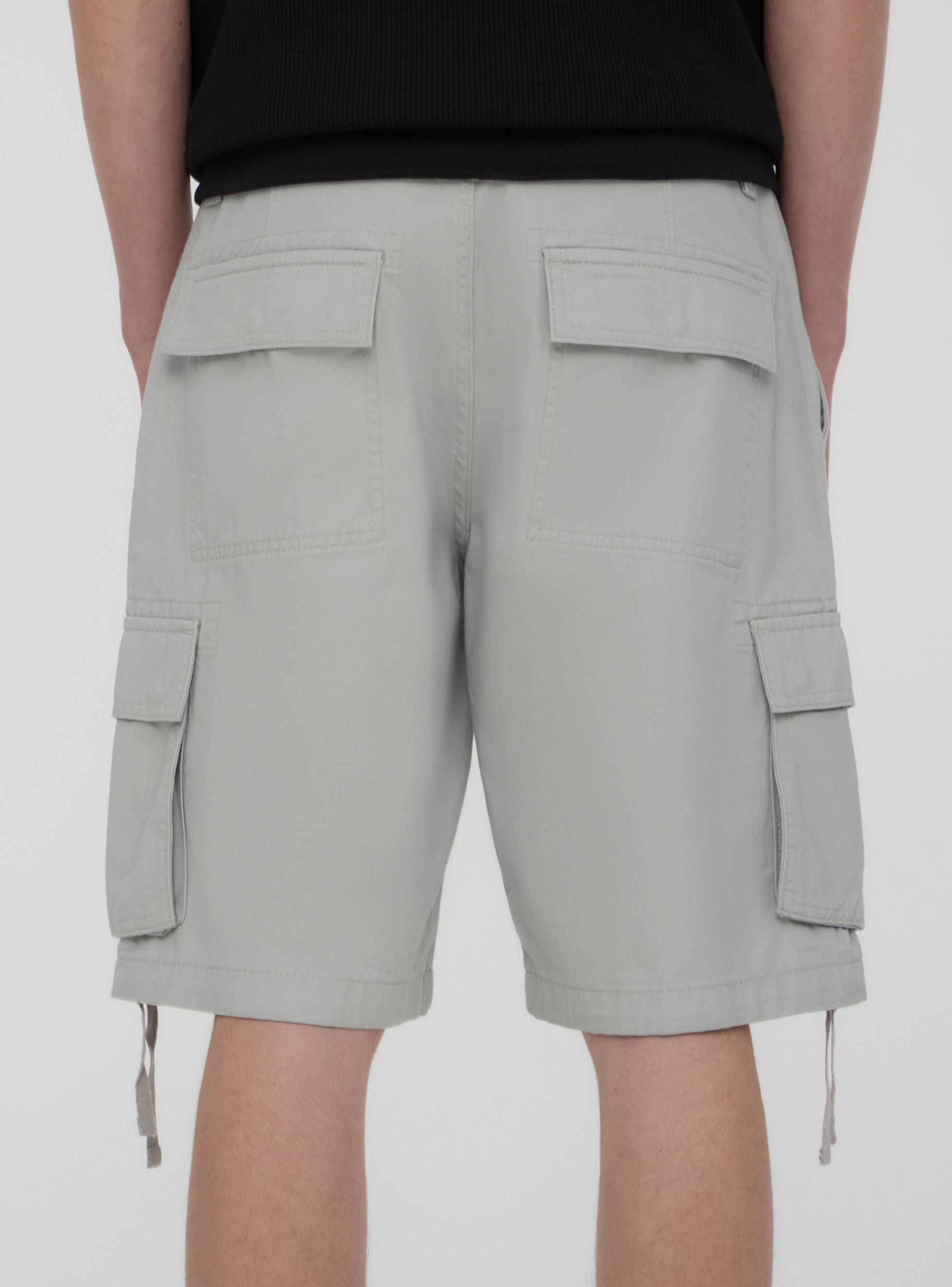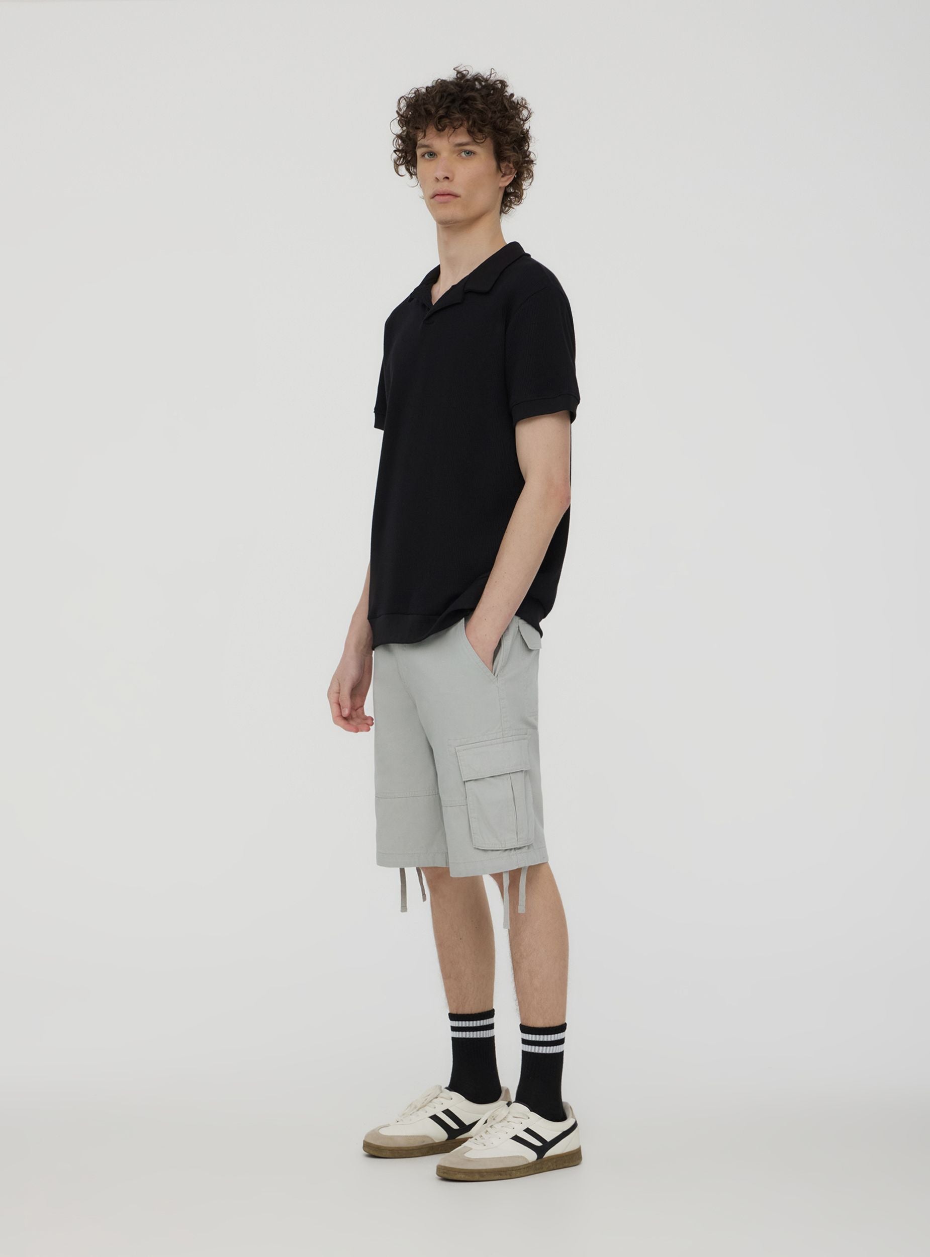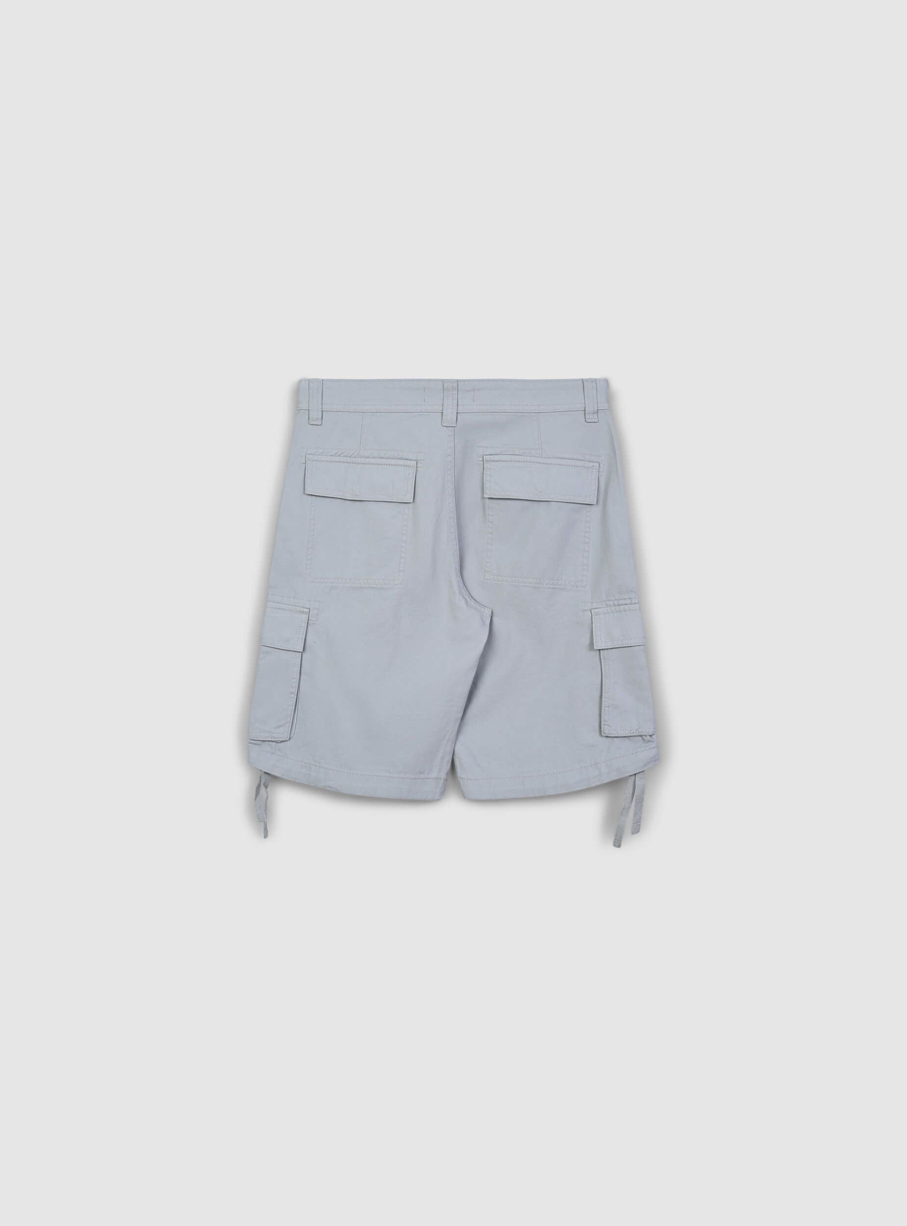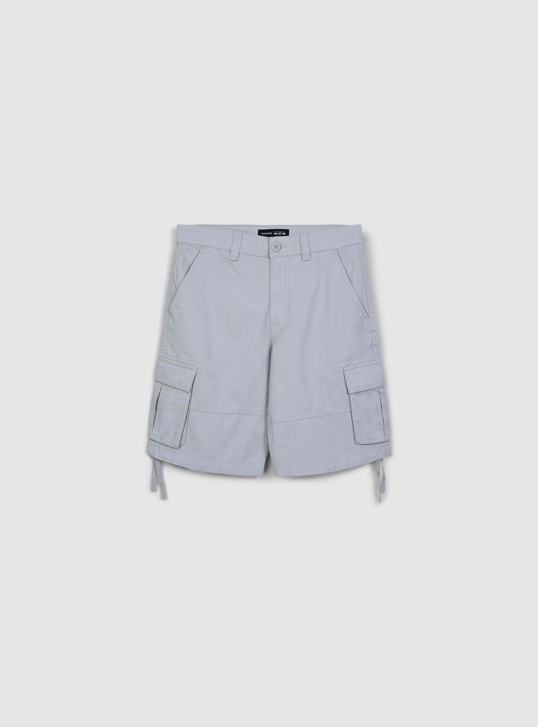 Pantalones cortos de hombre cargo con cierre de botón y cremallera. El diseño en un solo color se enriquece con amplios bolsillos laterales aplicados, ideales para guardar pequeños objetos, y cordones en los lados. Ideales para un look casual y práctico, estos pantalones cortos combinan estilo y versatilidad, adaptándose a diferentes ocasiones. El modelo cargo otorga un aspecto relajado, con bolsillos traseros con solapa para un look contemporáneo y práctico.Detalles