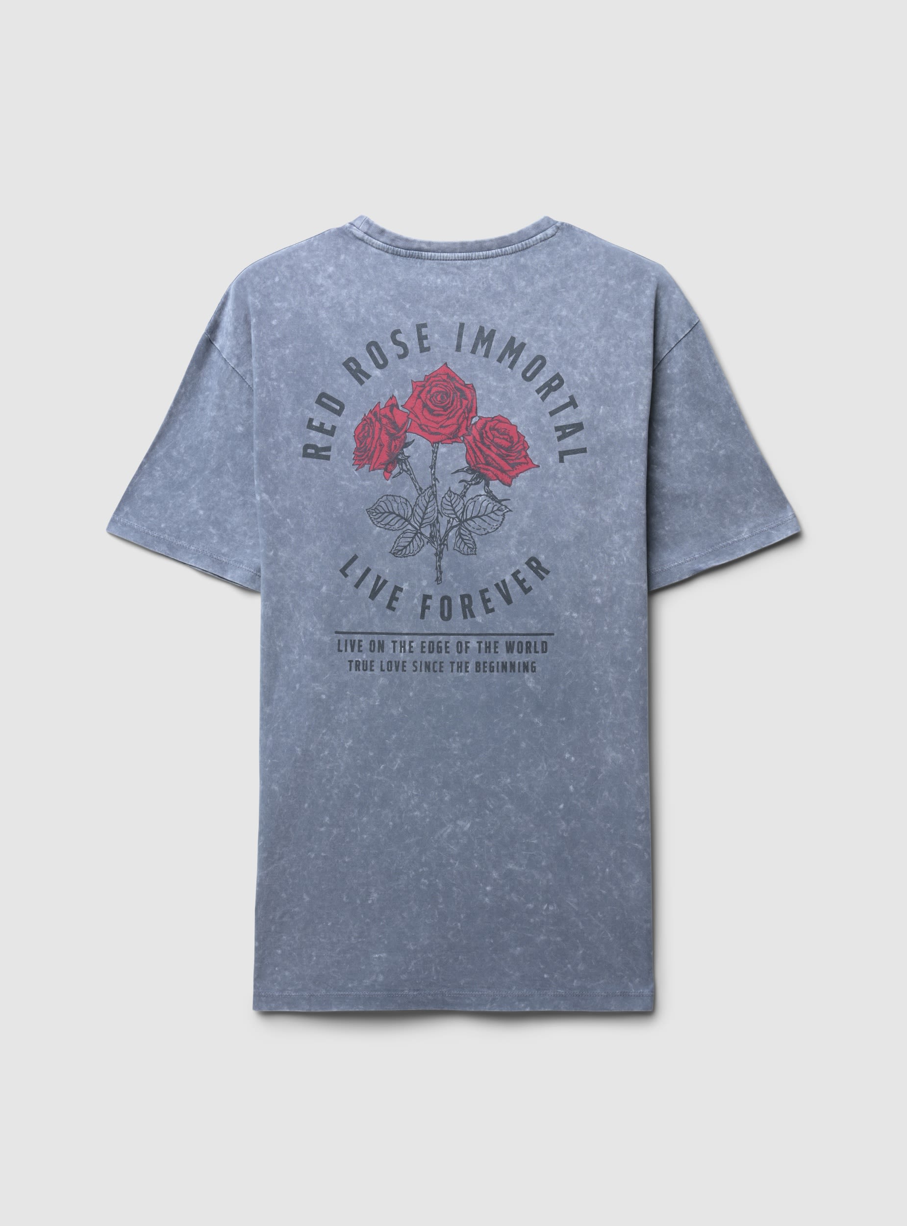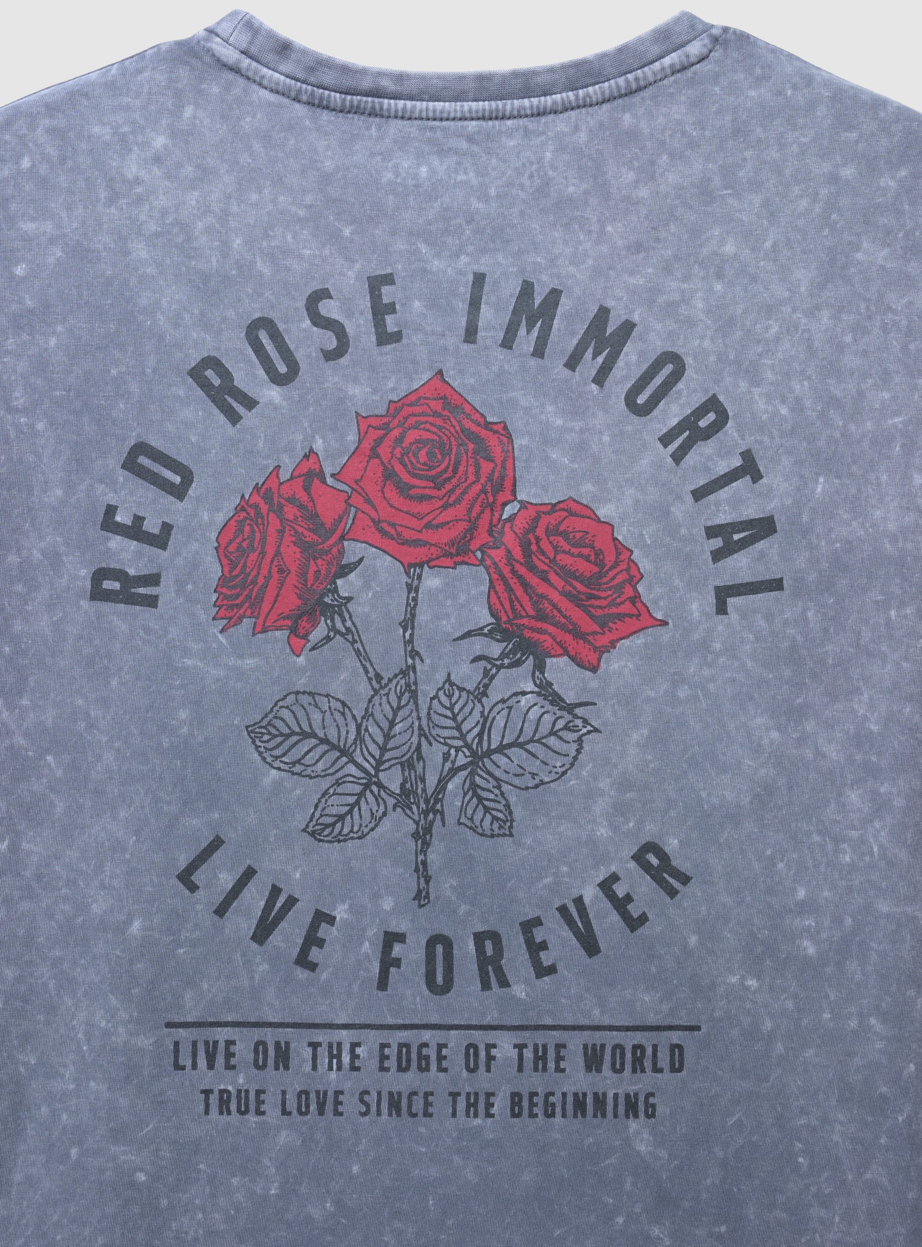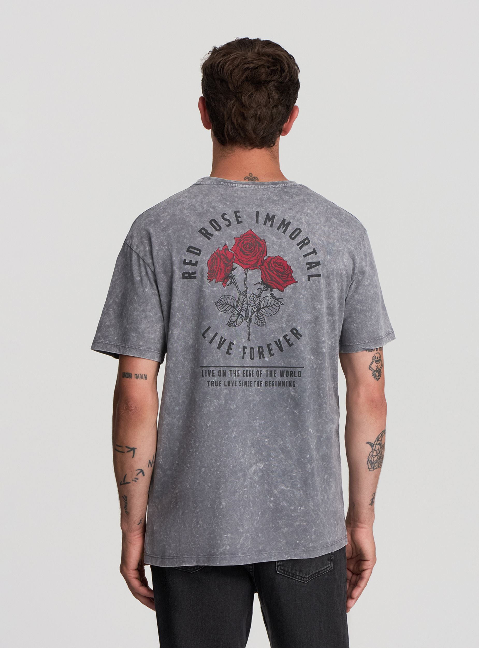 Camiseta de hombre de manga corta, ideal para un look casual y versátil. Perfecta para combinar con vaqueros o pantalones deportivos, se adapta a diversas ocasiones informales. El tejido acid wash está enriquecido con un estampado de rosas y letras pequeñas en la parte delantera y grande en la parte trasera. El ajuste cómodo y el diseño sencillo la convierten en una prenda esencial para el armario diario.Detalles