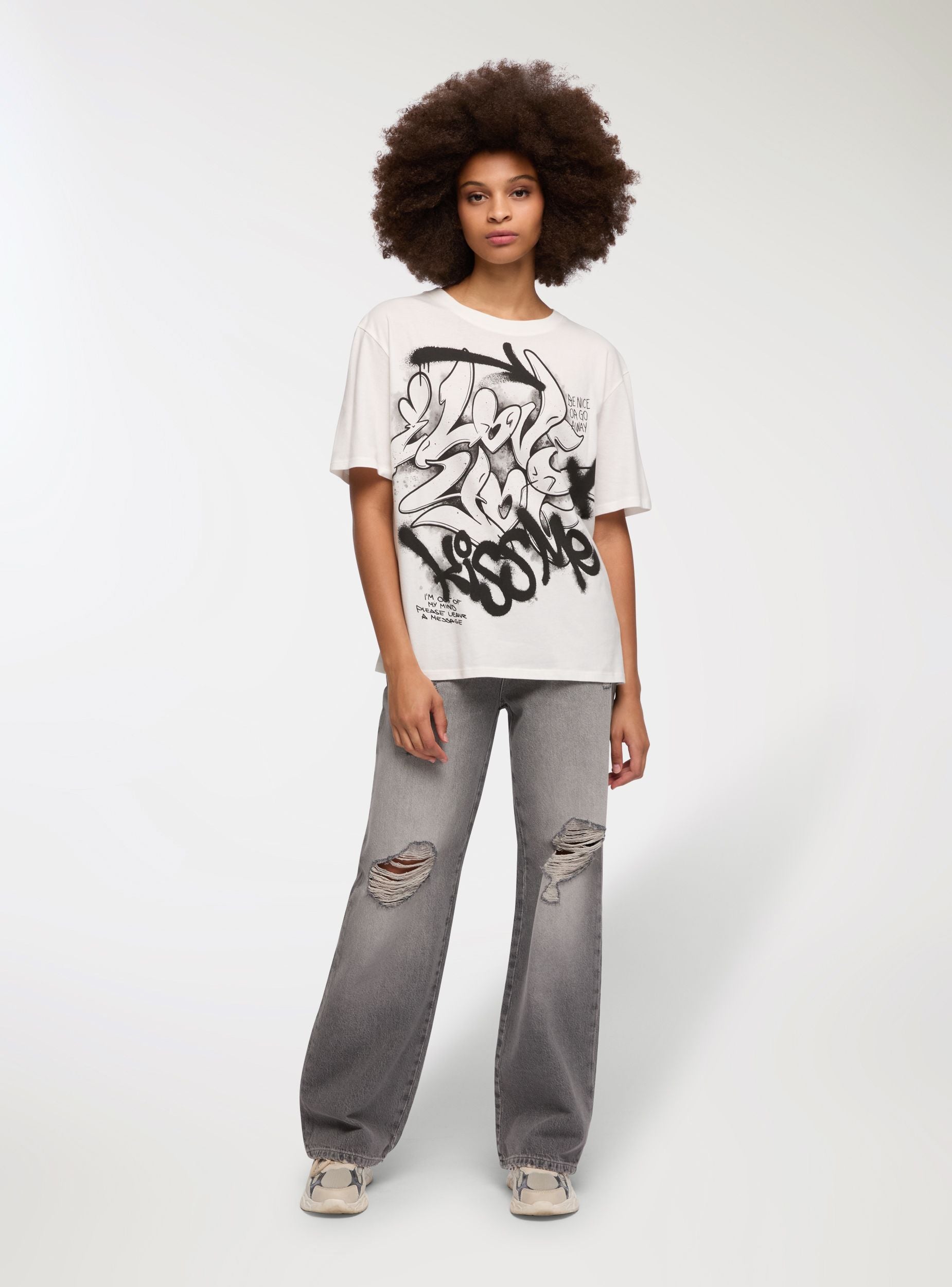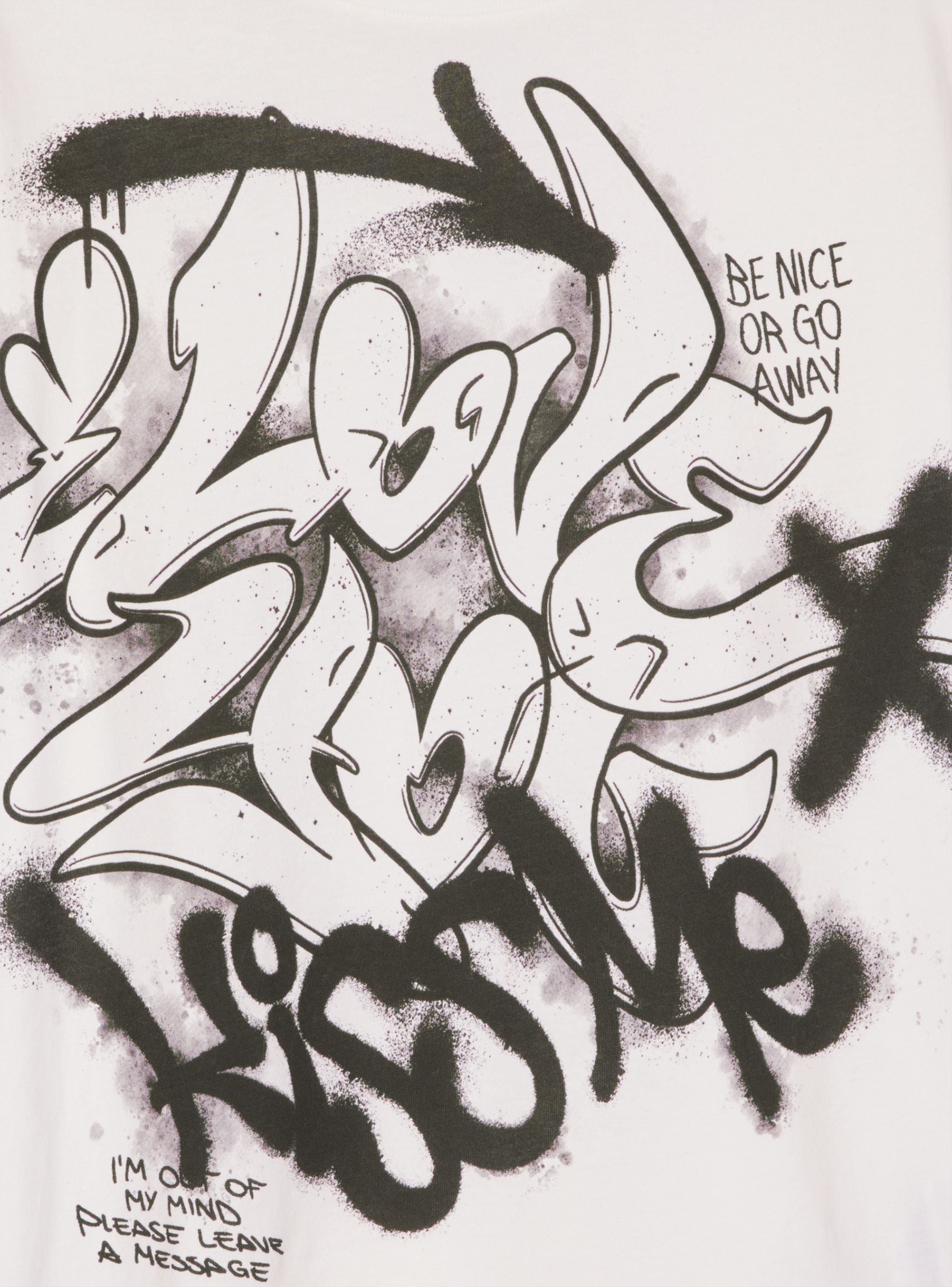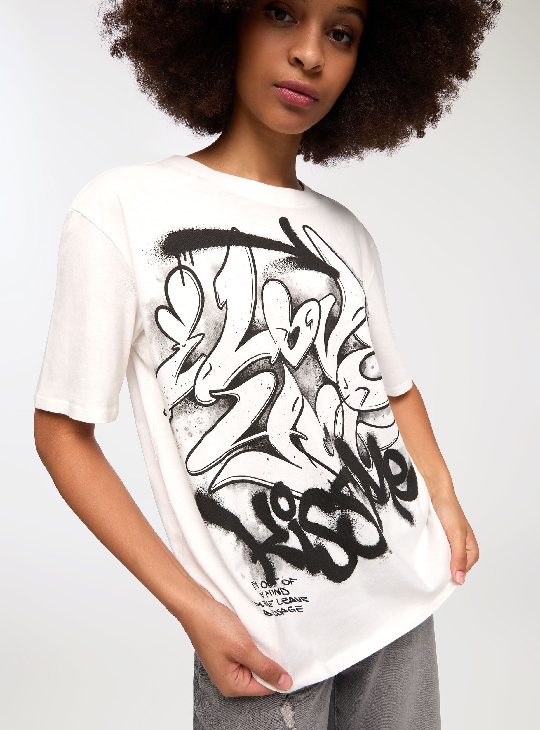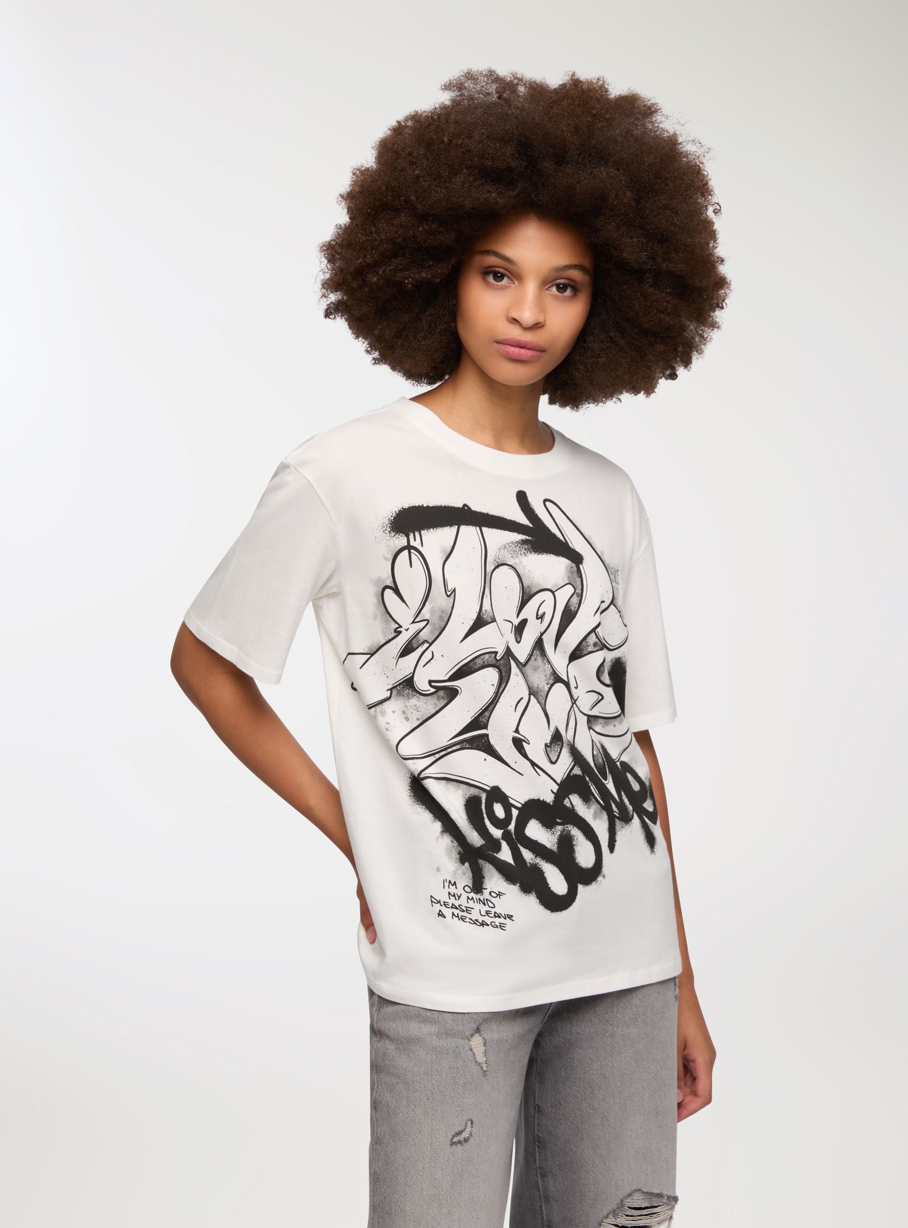 Camiseta de mujer con corte amplio, caracterizada por una estampación de graffiti con textos y motivos artísticos. Ideal para un look casual y moderno, perfecta para combinar con vaqueros o pantalones deportivos para un outfit urbano y dinámico. La camiseta presenta un diseño versátil que se adapta a diversas ocasiones informales, ofreciendo comodidad y estilo.Detalles