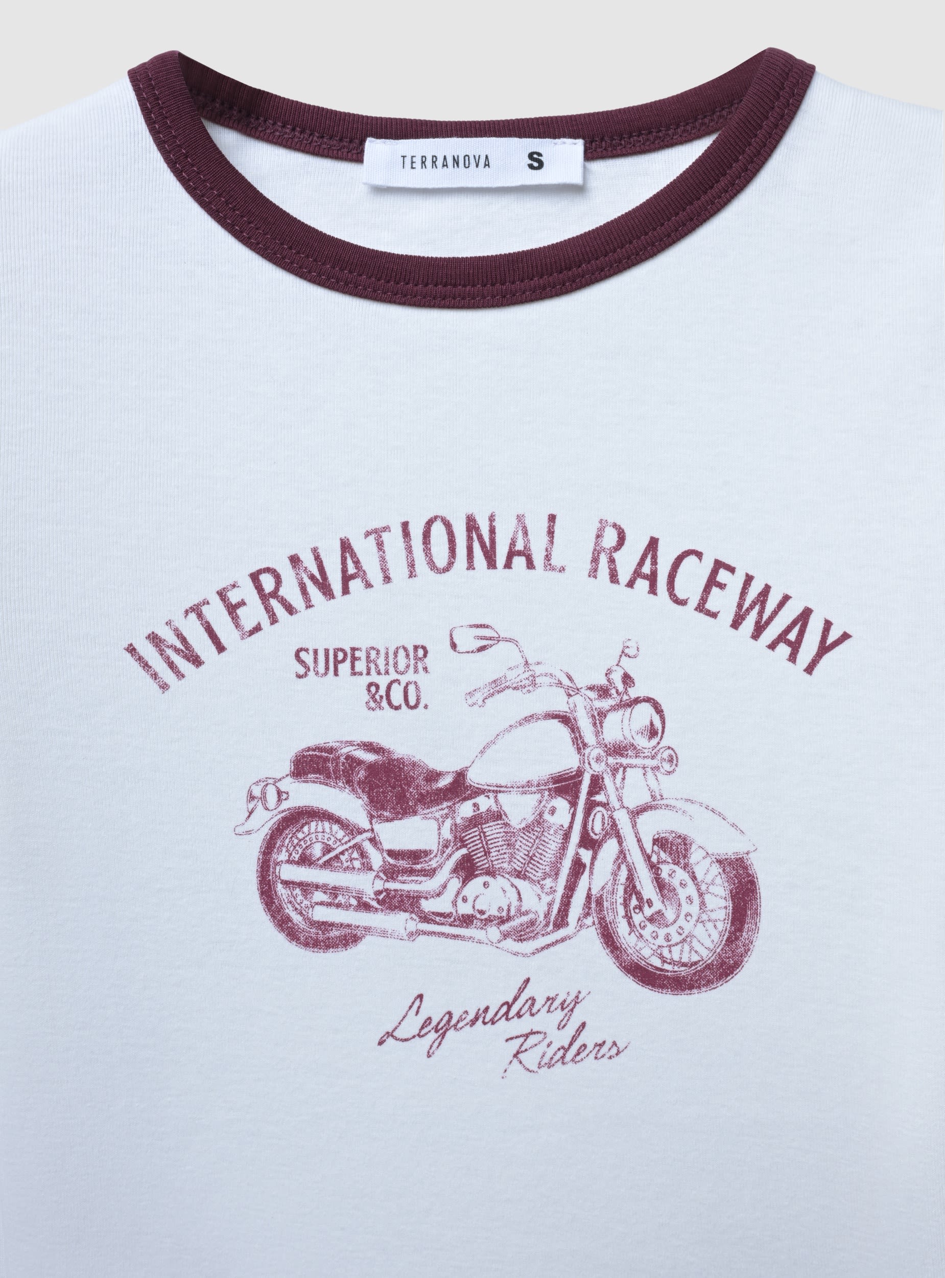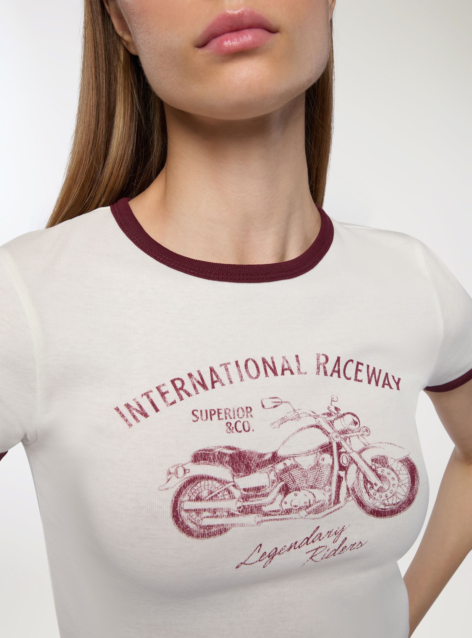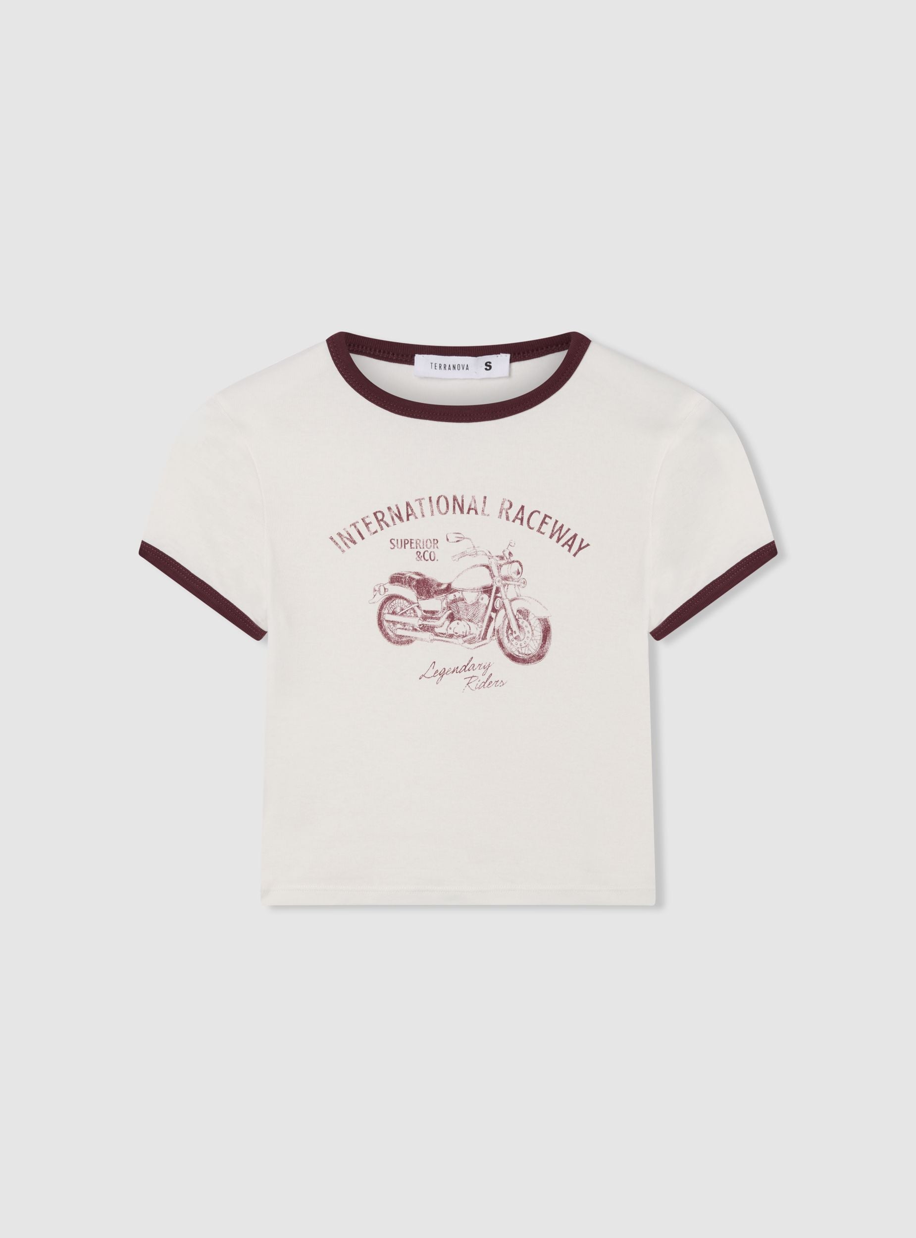 Camiseta de mujer con diseño crop y mangas cortas, ideal para un look casual y moderno. Presenta una estampación gráfica con temática motociclista y detalles en contraste en el cuello y las mangas. Perfecta para combinar con vaqueros o pantalones cortos para un conjunto informal y a la moda. El corte crop añade un toque de estilo contemporáneo.Detalles