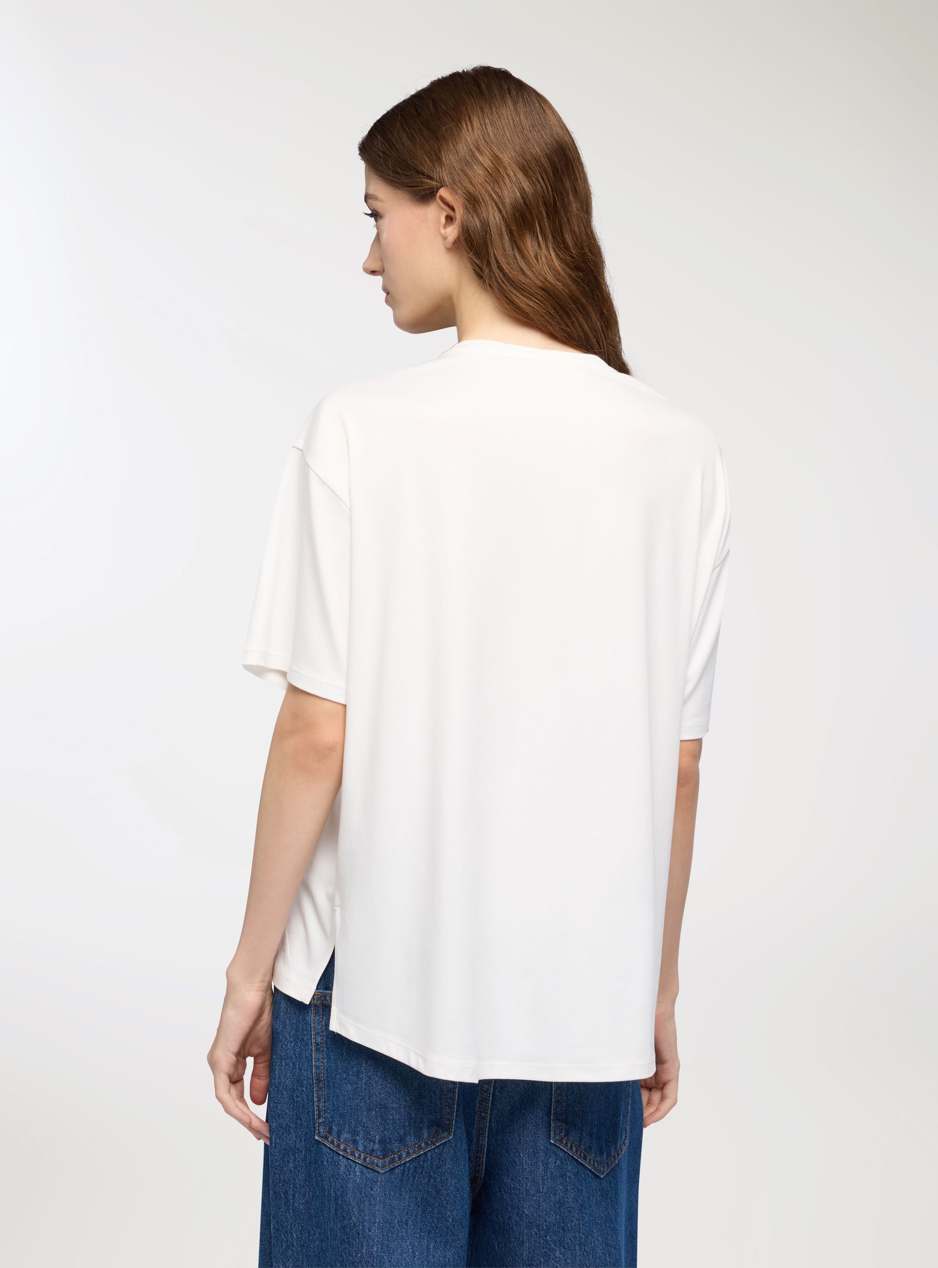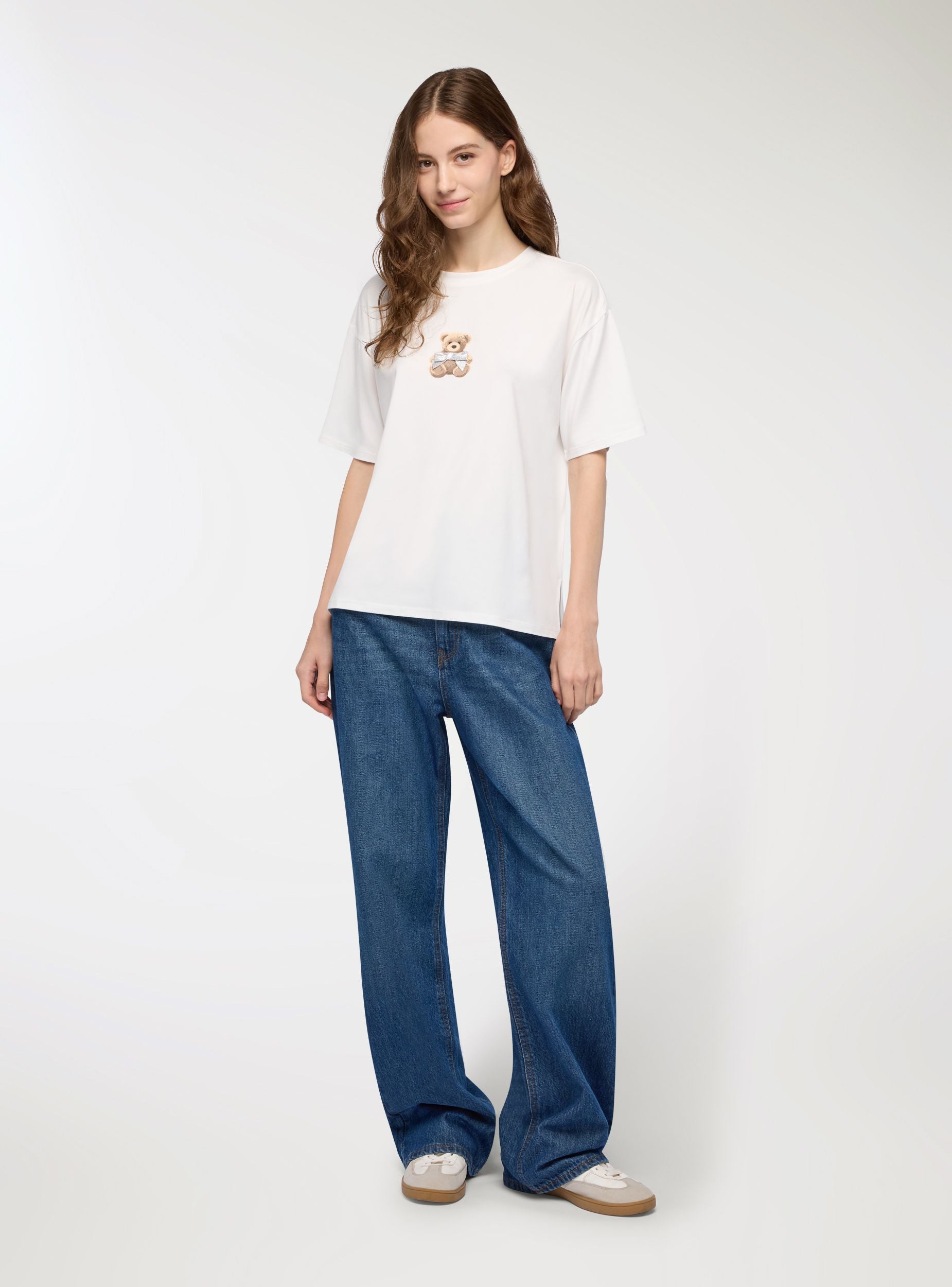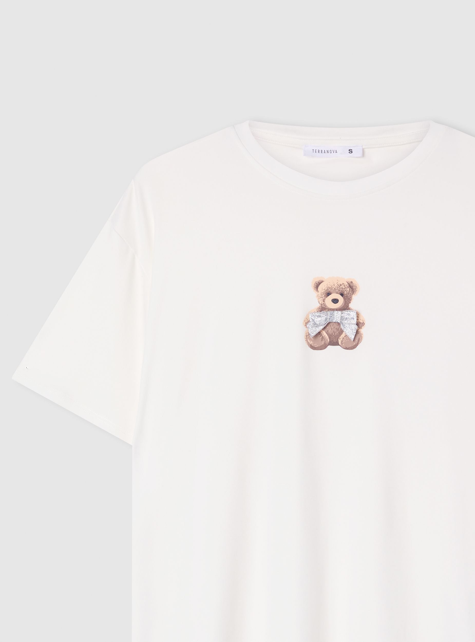 Camiseta de mujer de manga corta con cuello redondo y pequeño estampado frontal de un osito en el centro del pecho. Corte regular con hombros ligeramente caídos para un look relajado. Fácil de combinar con vaqueros o faldas para el tiempo libre, se puede llevar bajo chaquetas ligeras o cárdigans. Bajo recto ligeramente alargado por detrás. Diseño de color liso con estampado que añade un toque divertido.Detalles
