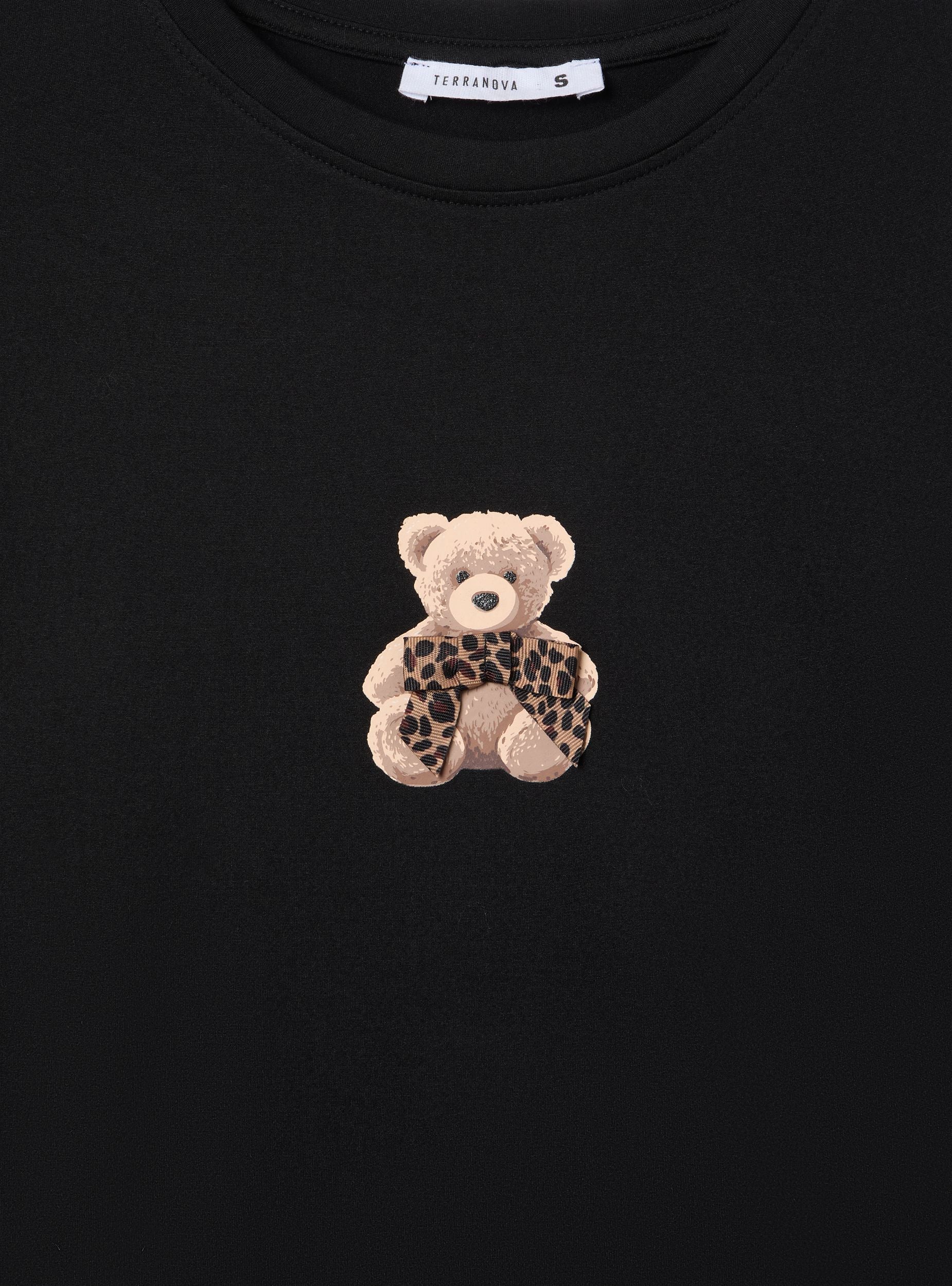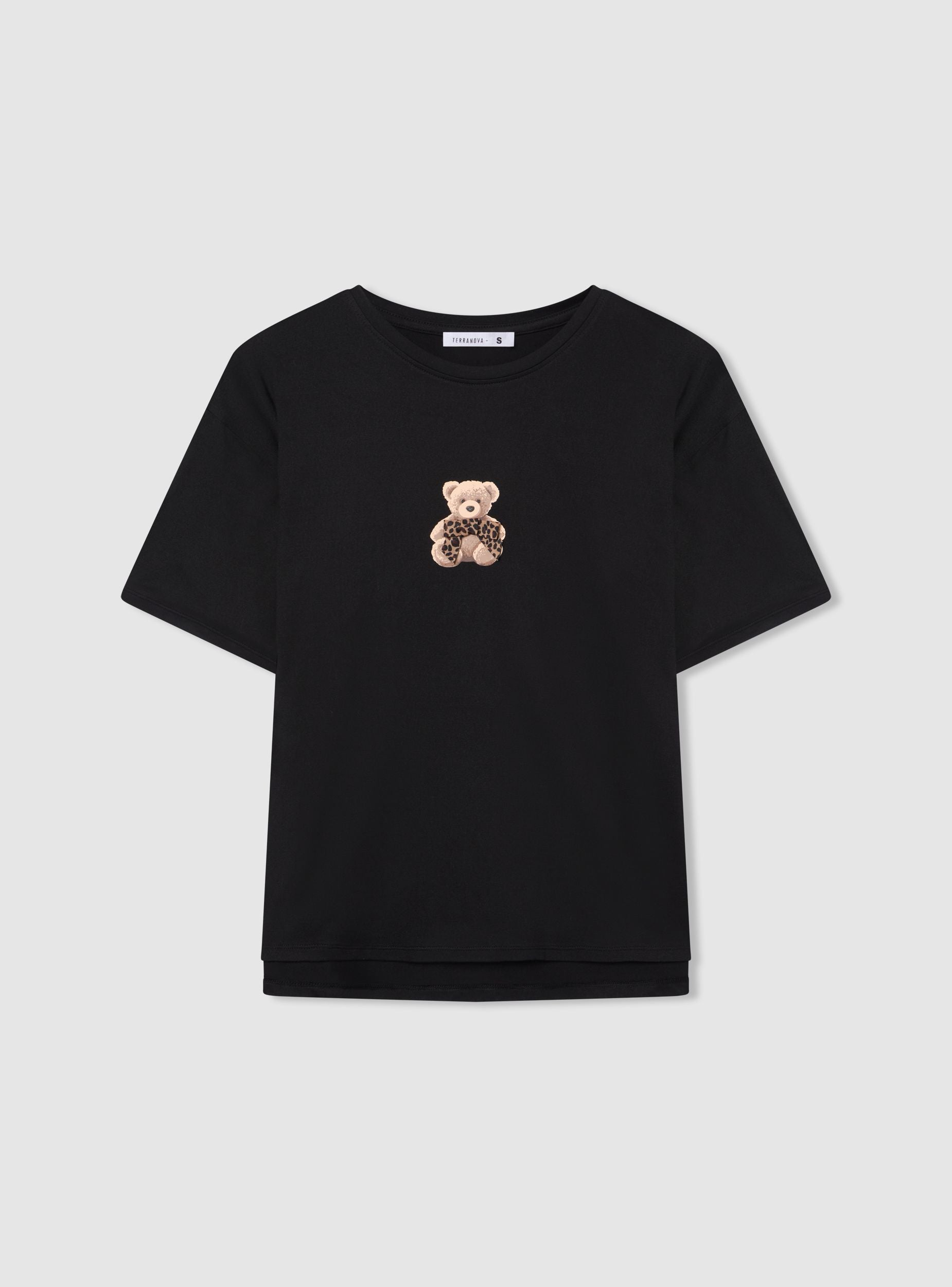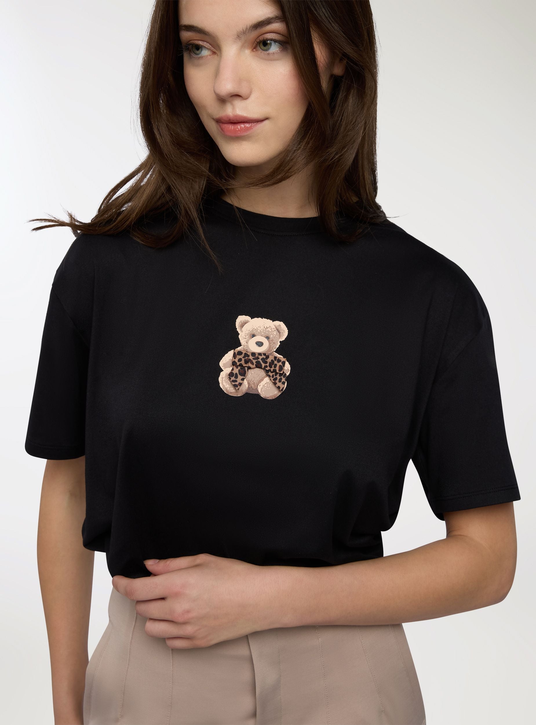 Camiseta de mujer de manga corta con cuello redondo y pequeño estampado frontal de un osito en el centro del pecho. Corte regular con hombros ligeramente caídos para un look relajado. Fácil de combinar con vaqueros o faldas para el tiempo libre, se puede llevar bajo chaquetas ligeras o cárdigans. Bajo recto ligeramente alargado por detrás. Diseño de color liso con estampado que añade un toque divertido.Detalles