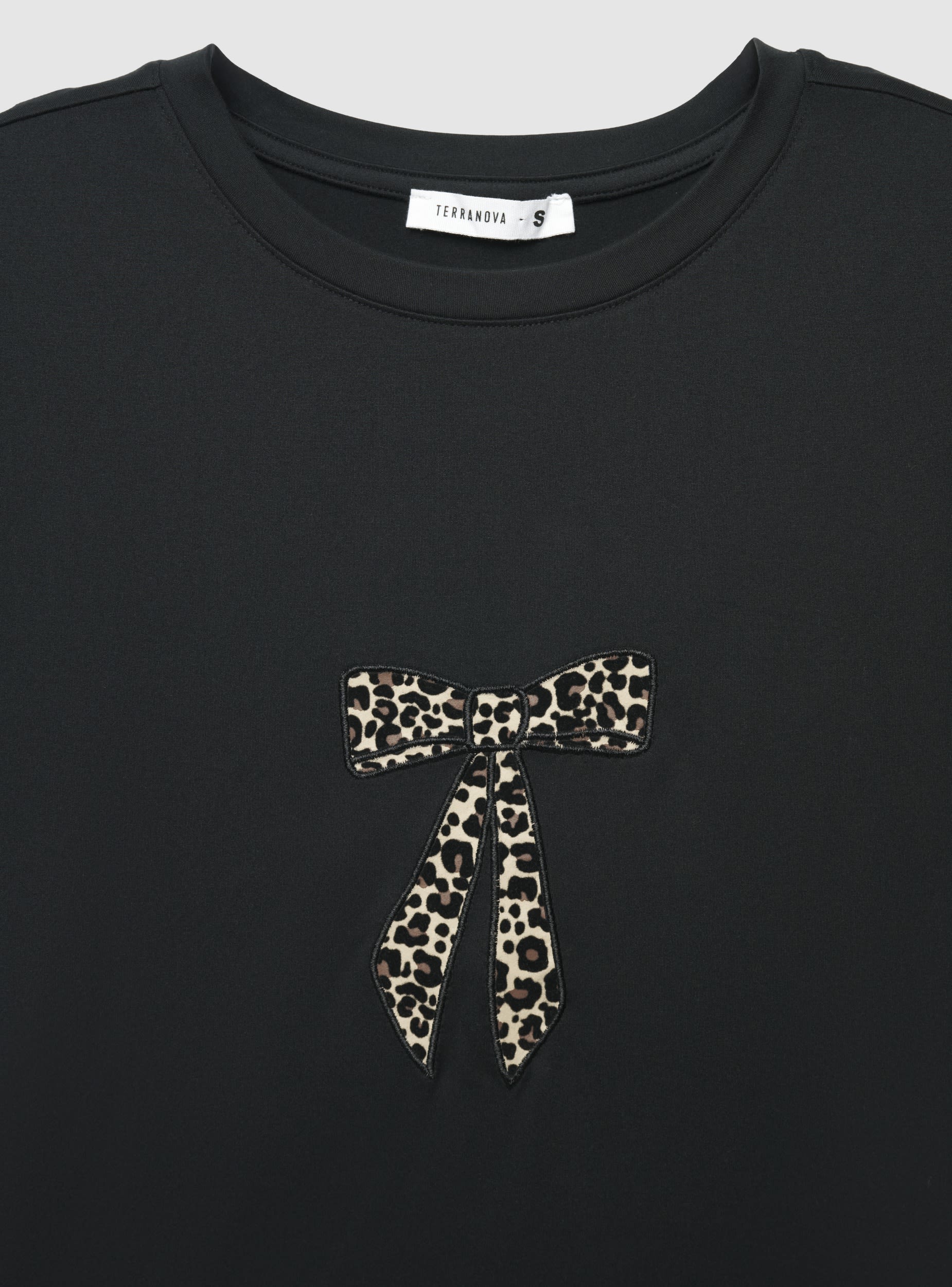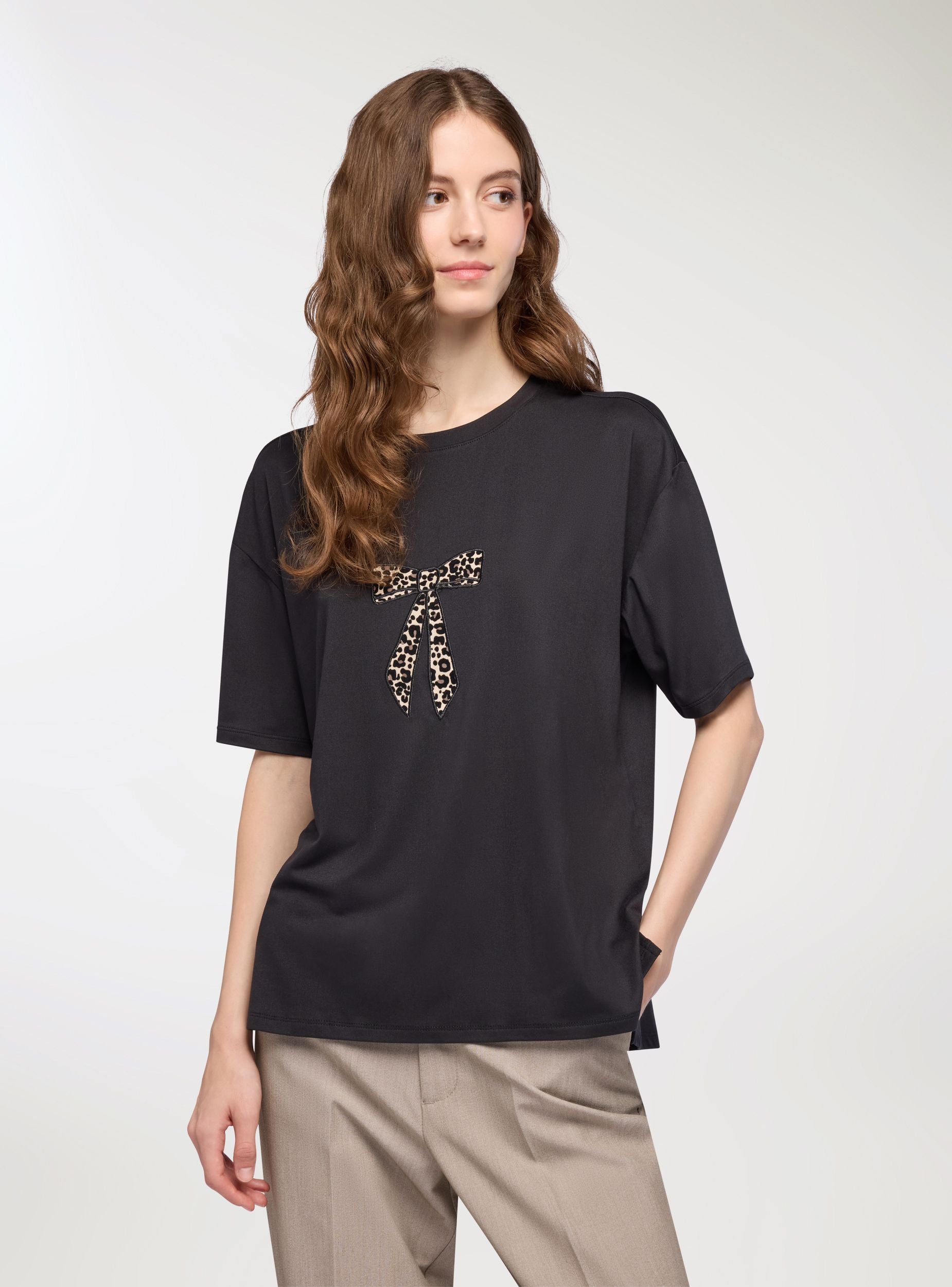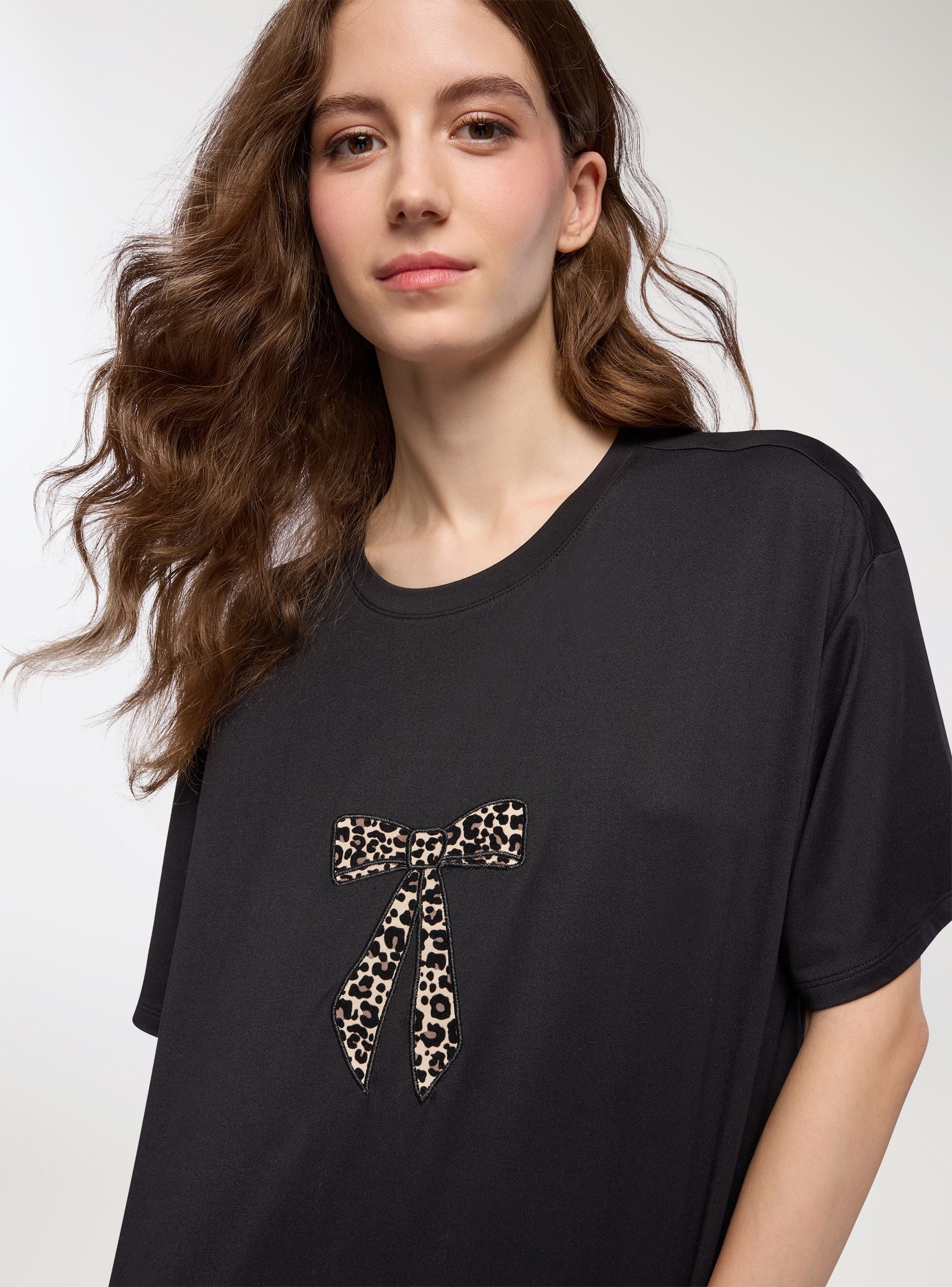 Camiseta de mujer con mangas cortas y escote redondo, adornada con un estampado de lazo en el pecho que aporta un toque femenino. Corte regular y largo hasta la cadera, ideal para looks diarios o salidas nocturnas. Fácil de combinar con vaqueros, pantalones pitillo o faldas. Perfecta también para llevar bajo blazers o cárdigans.Detalles