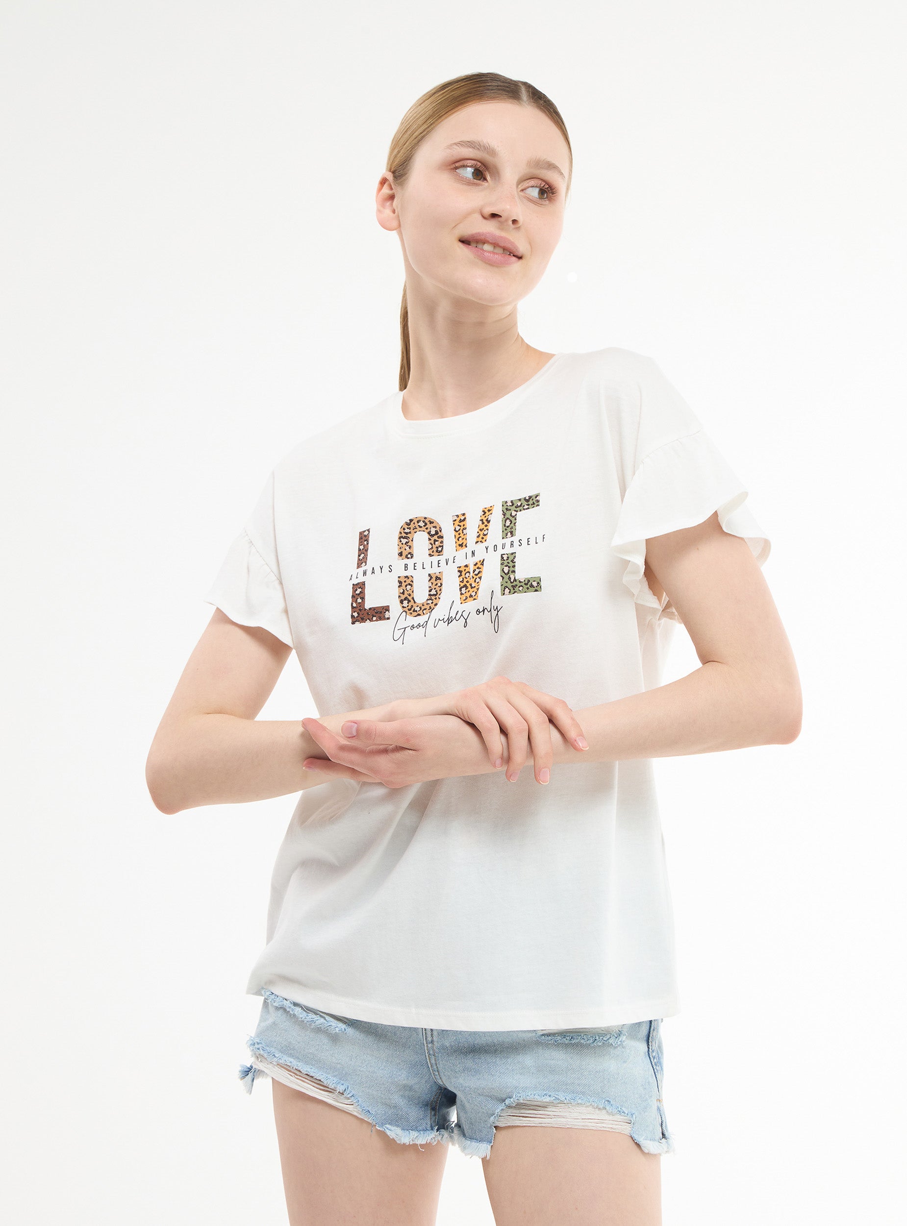 Maglietta da donna modello girocollo con scritta. Vestibilità è ampia.