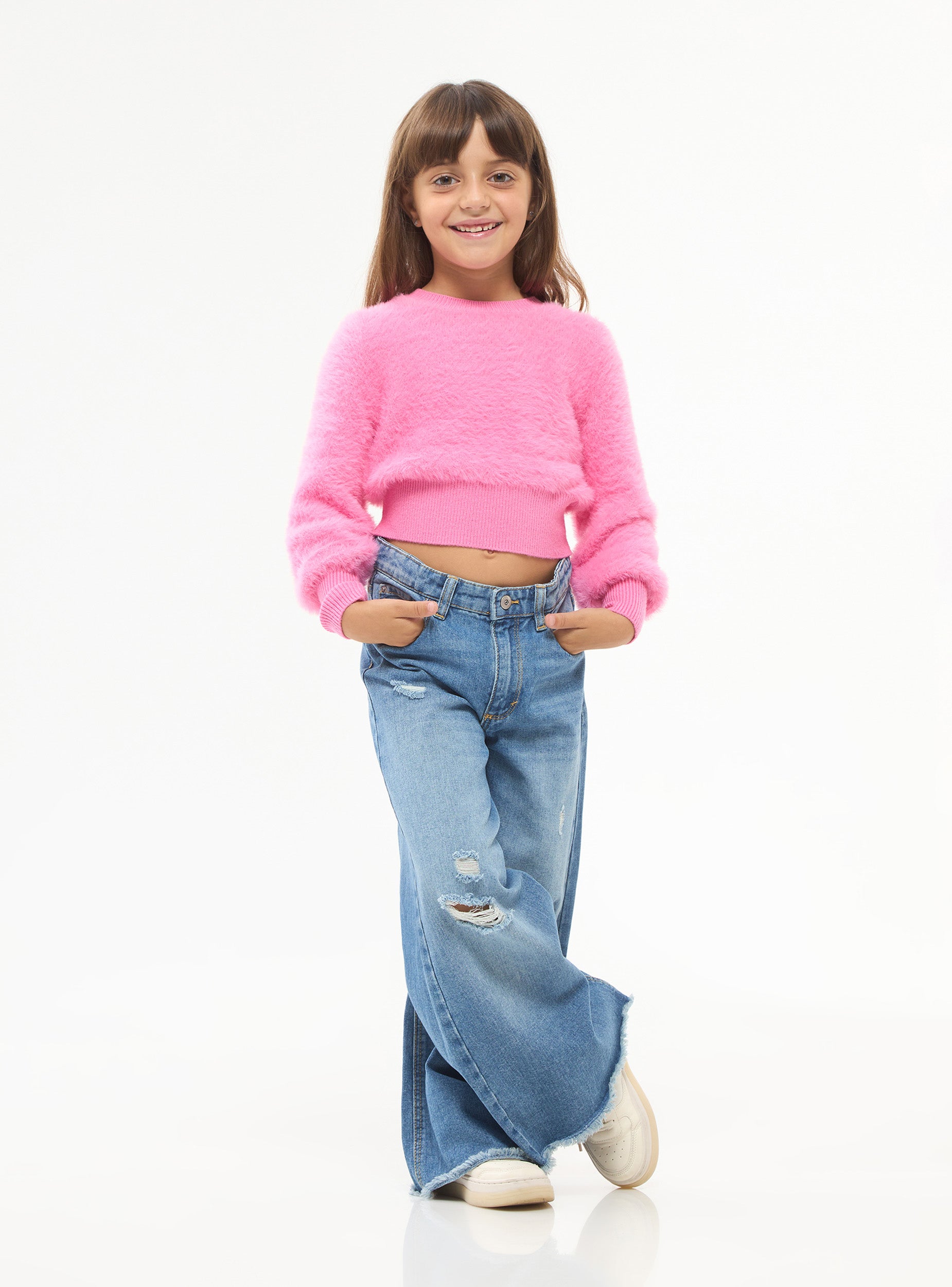 Maglia da bambina modello girocollo effetto pelo tinta unita. Vestibilità crop.