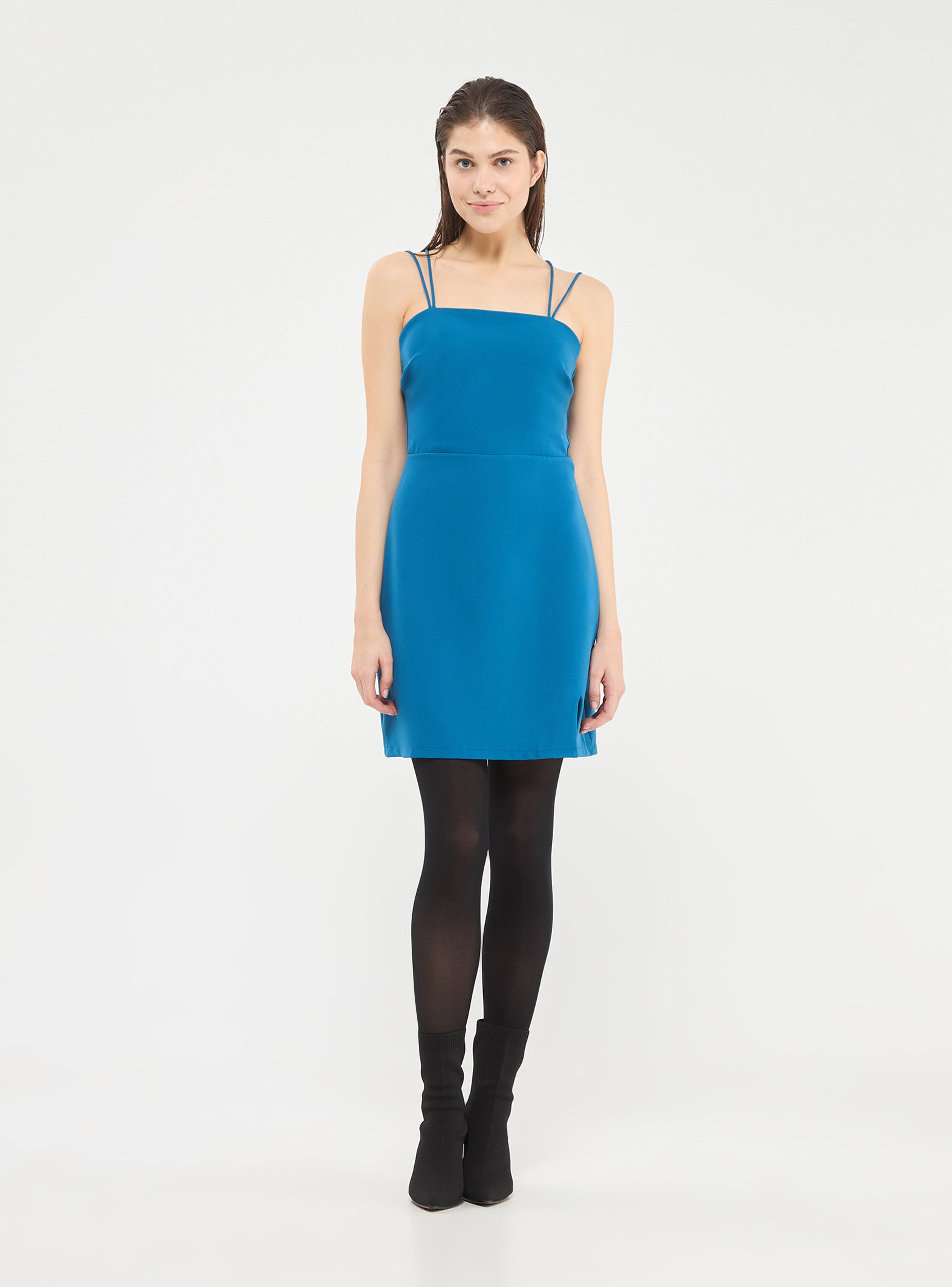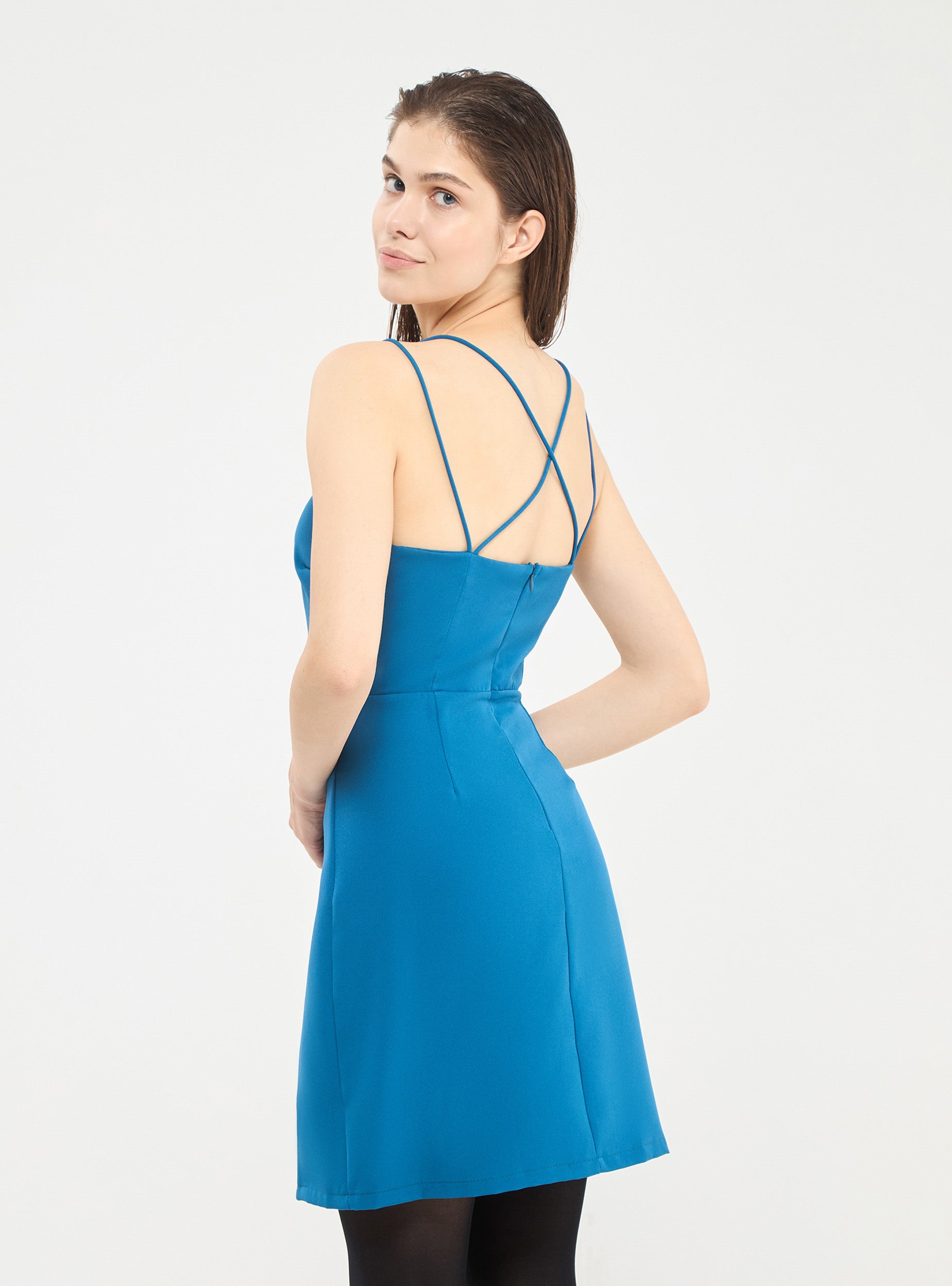 Vestito corto da donna , modello tubino a fascia con bretelline sottili incrociate sulla schiena e piccolo spacco frontale, Vestibilità  aderente.