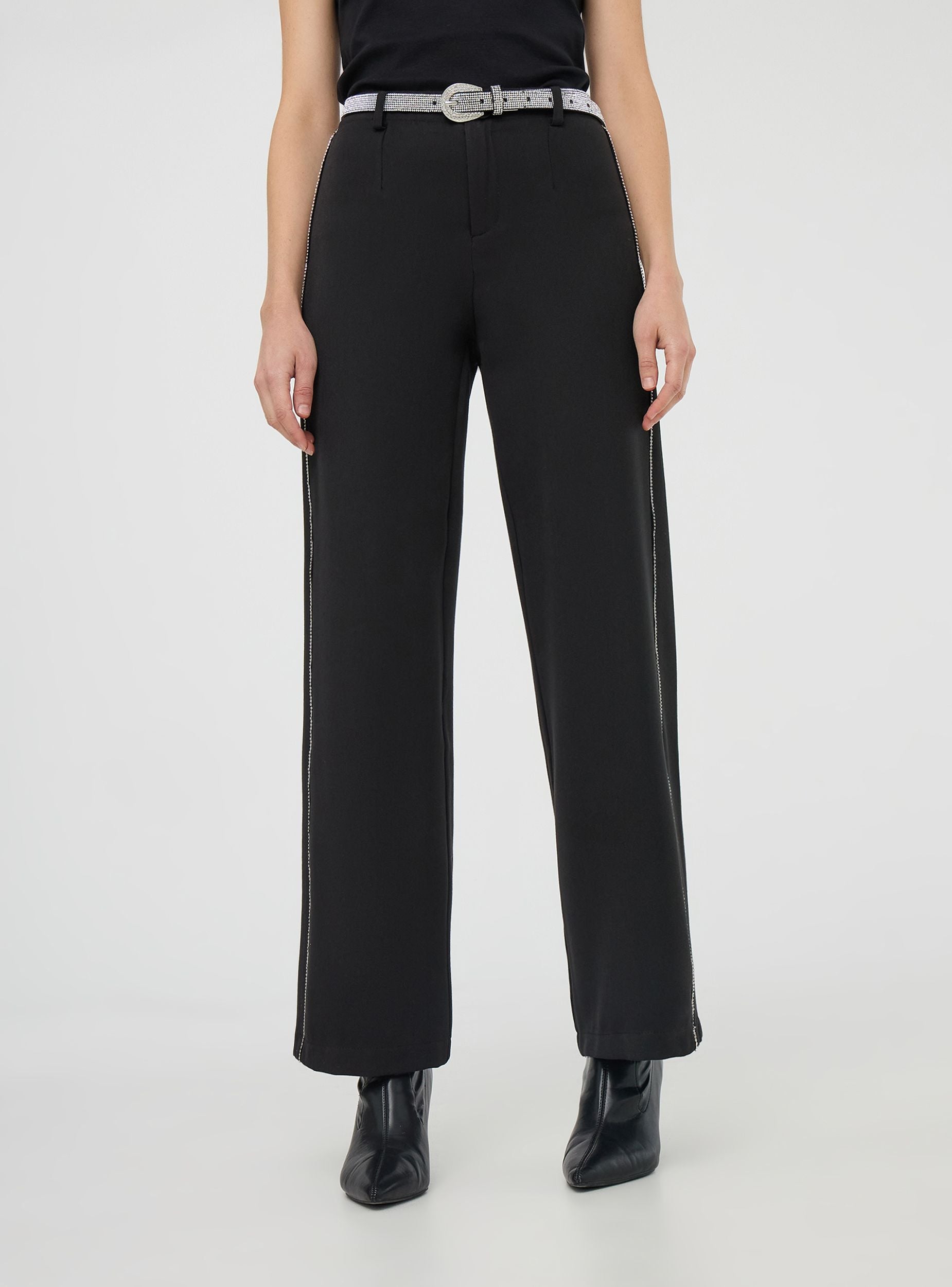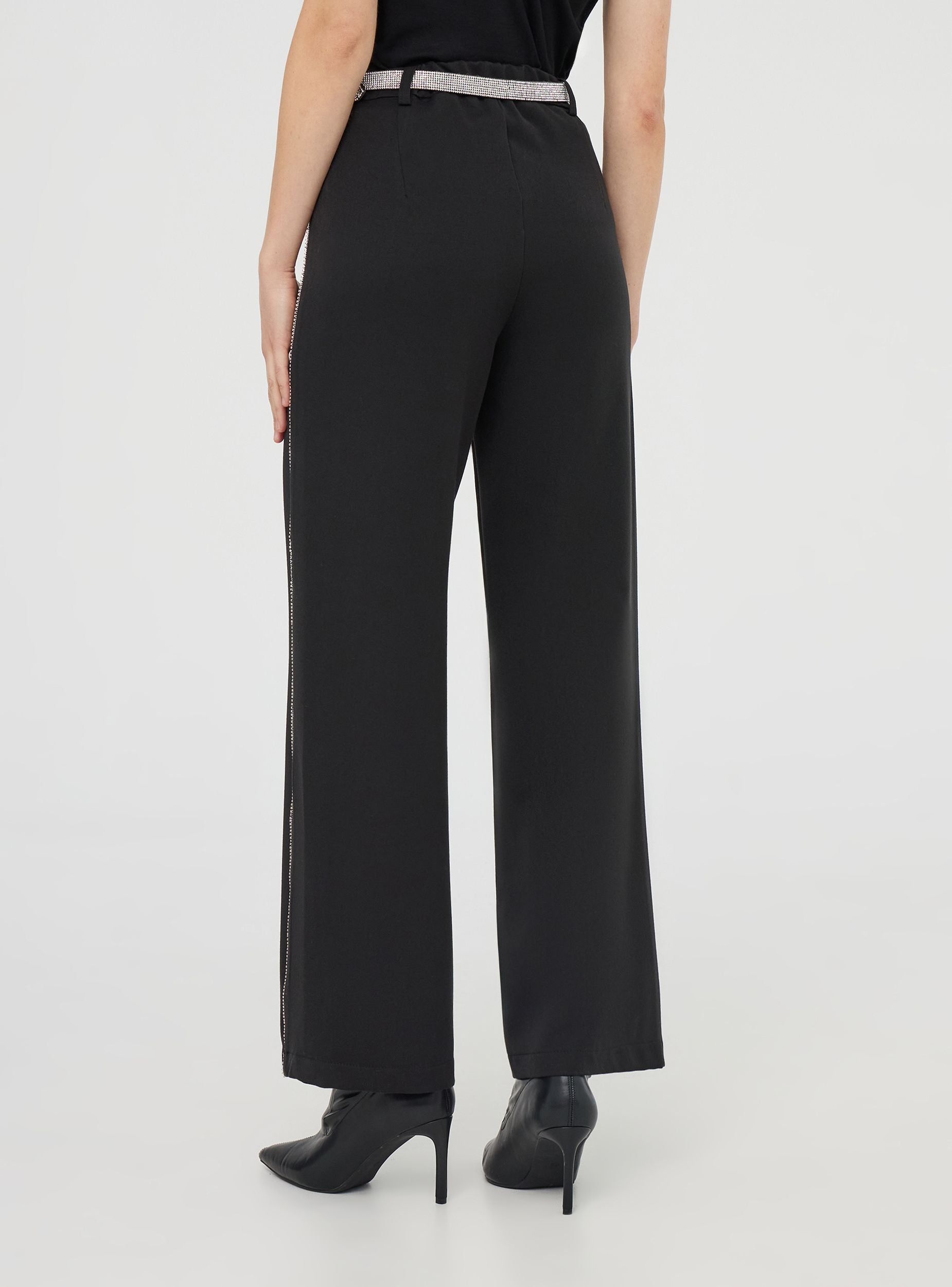 Pantalons pour femmes, modèle large, avec des strass. Ces pantalons sont l'expression parfaite de style et de confort. Fabriqués dans un tissu doux et fluide, ils offrent une silhouette élégante et moderne qui allonge la silhouette. Les strass appliqués ajoutent une touche de glamour et de raffinement, les rendant idéaux pour une soirée spéciale ou pour un look décontracté-chic. Parfaits à associer avec des talons ou des baskets pour une tenue polyvalente et à la mode.Détails