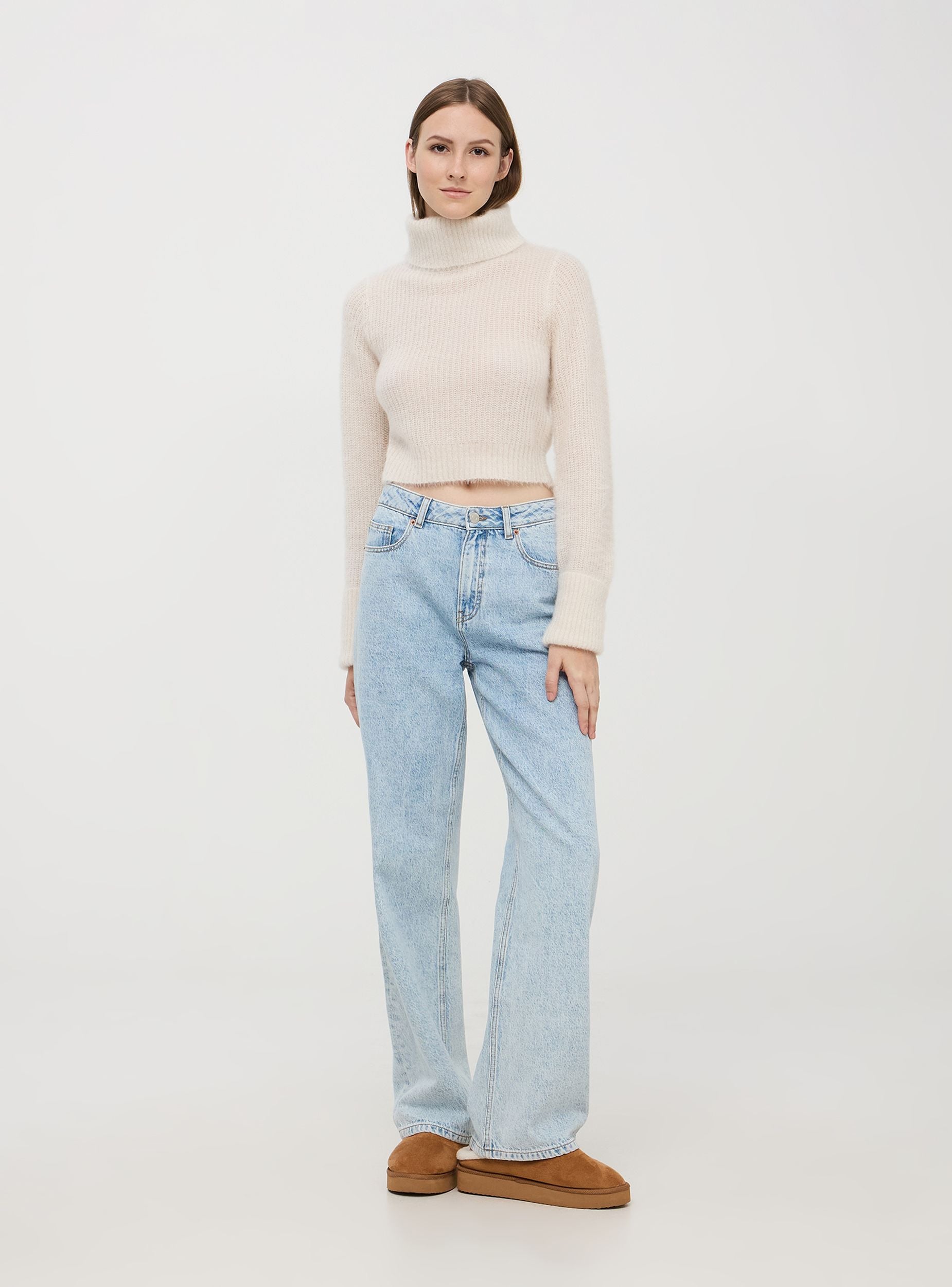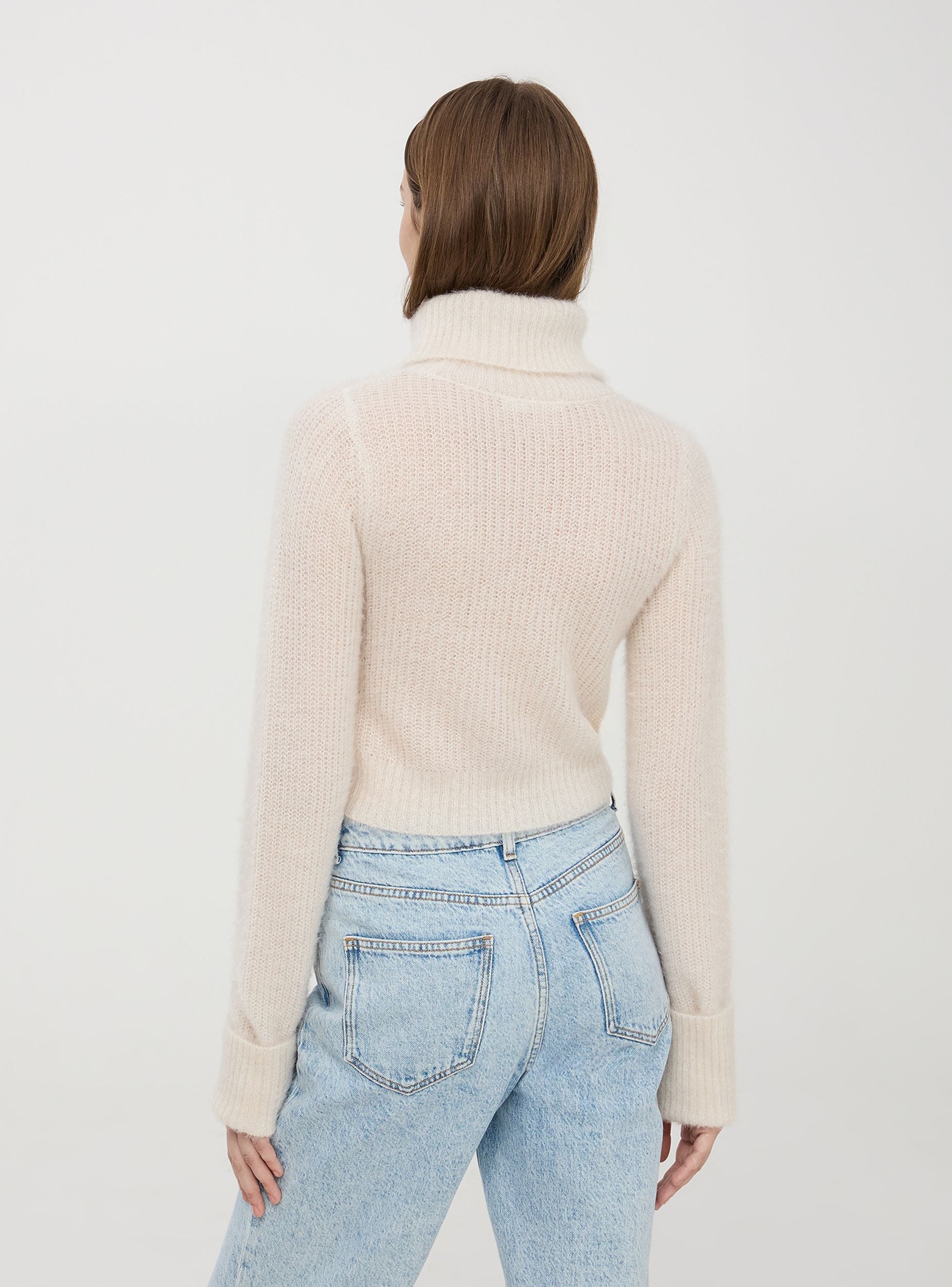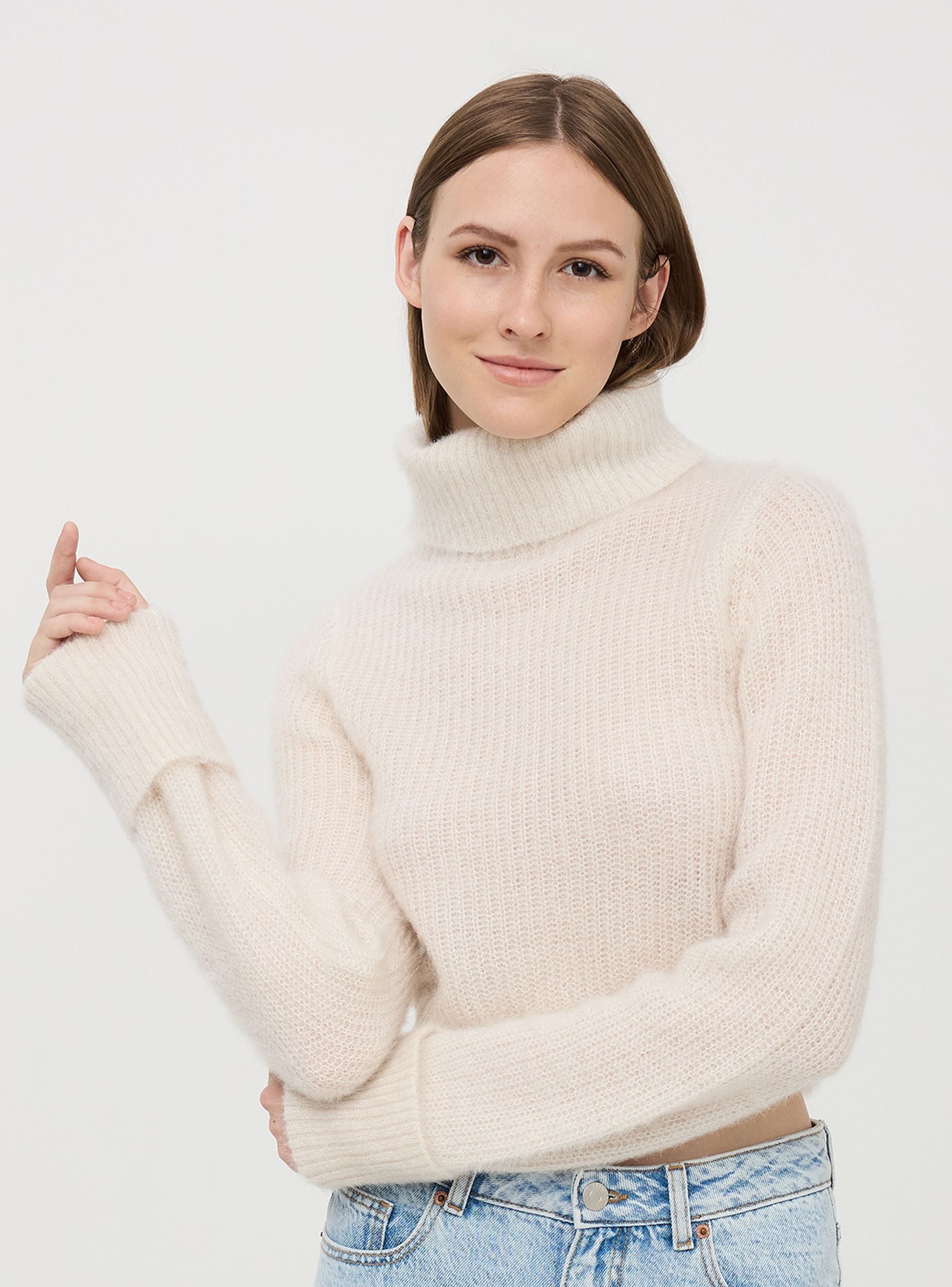 Pull femme à col montant, fabriqué en tissu uni avec des détails en lurex. Un incontournable à avoir dans le dressing. Coupe cropped.