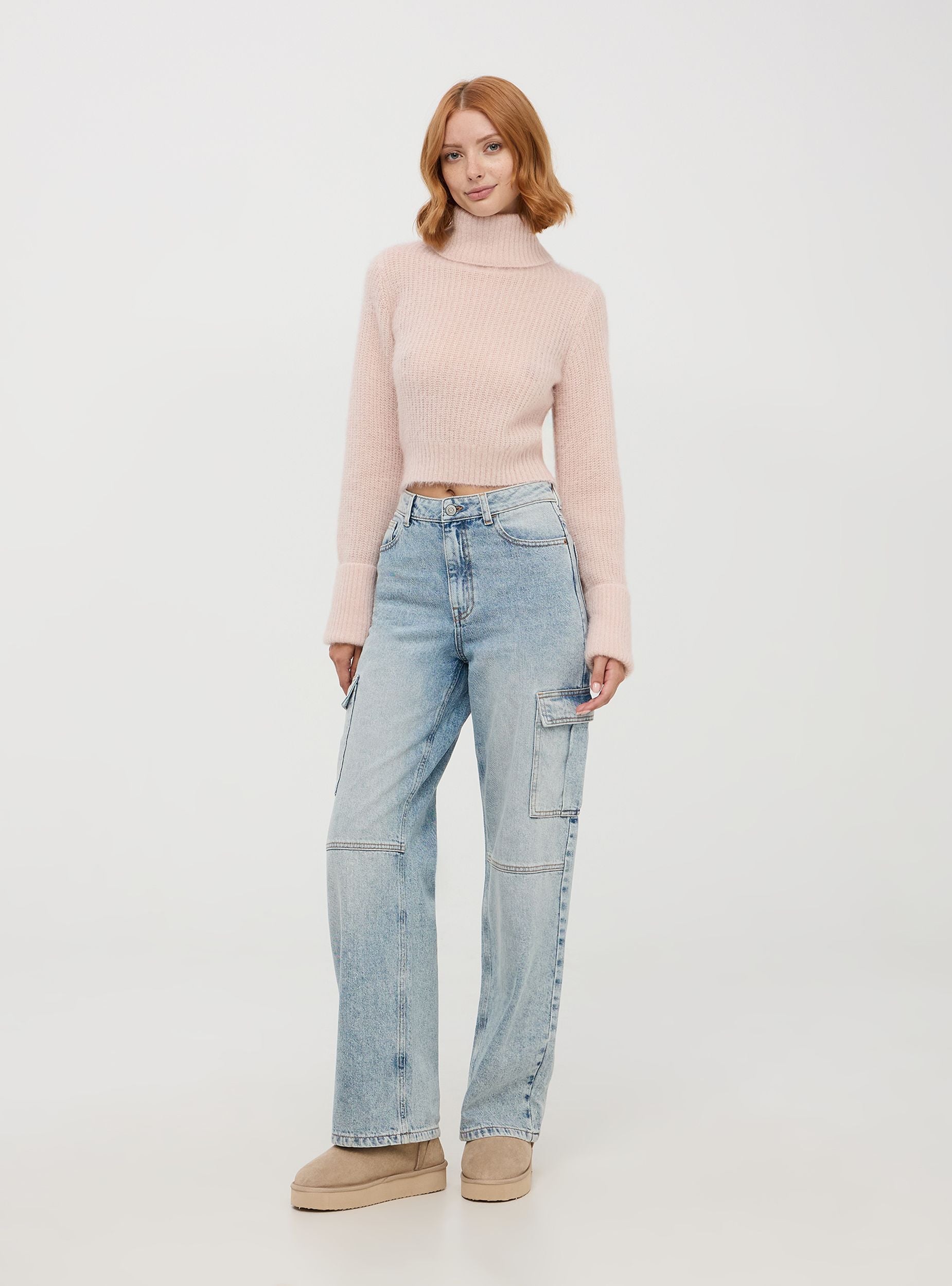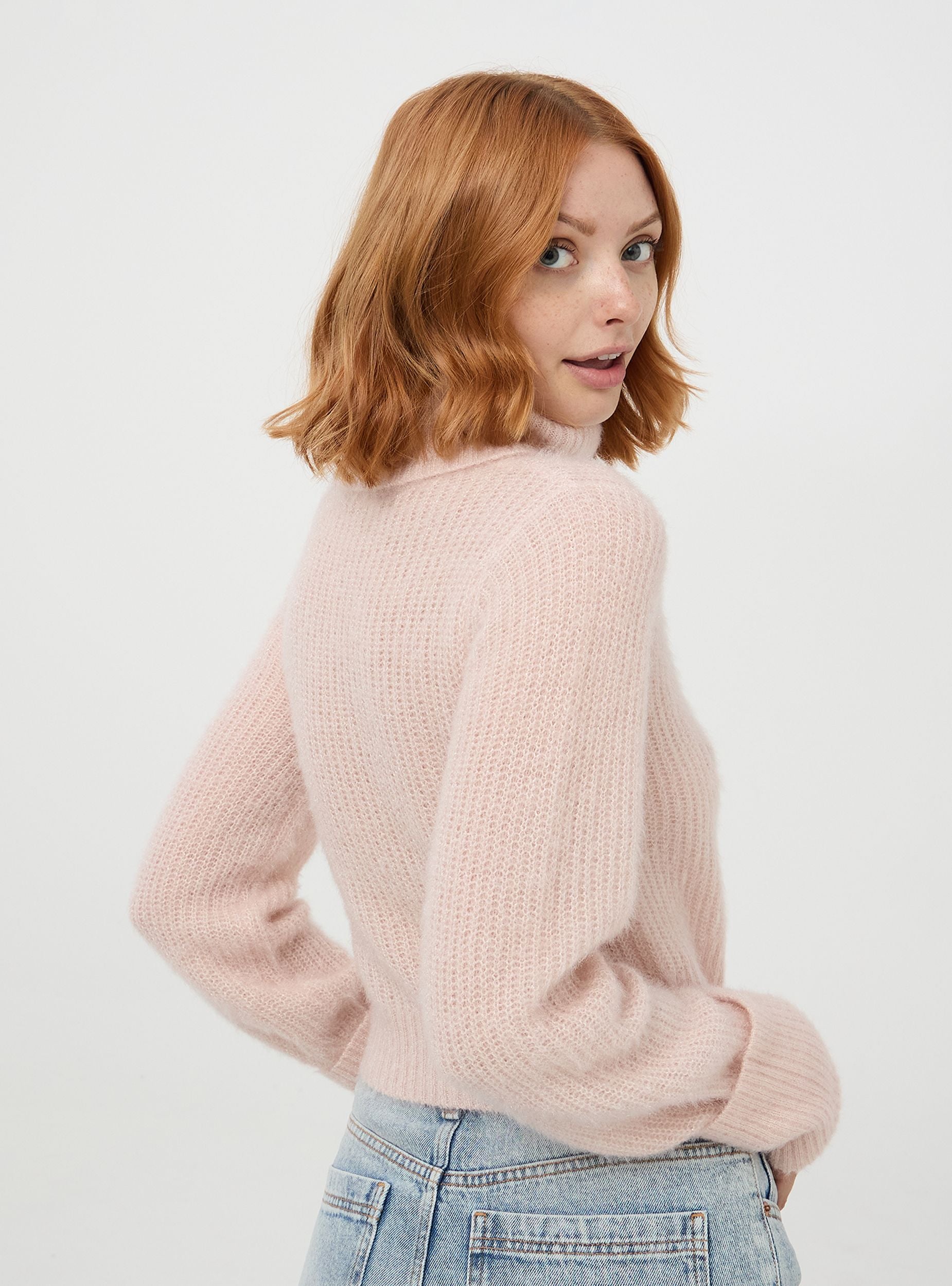 Pull femme à col montant, réalisé en tissu uni avec des détails lurex. Un indispensable à avoir dans sa garde-robe. Coupe cropped.Détails
