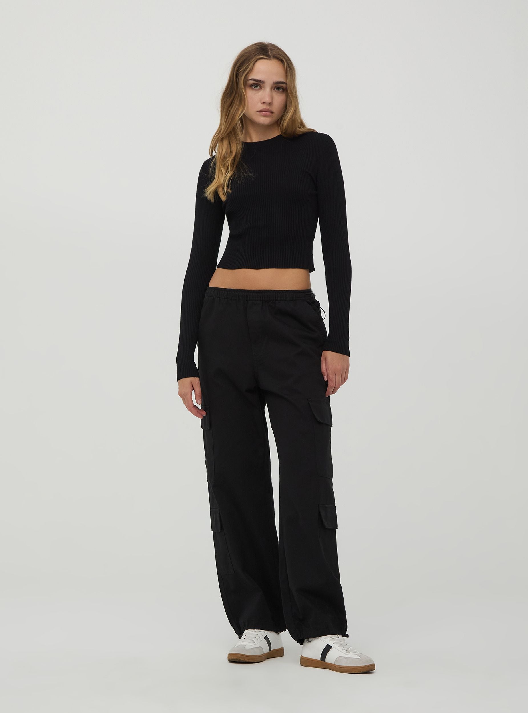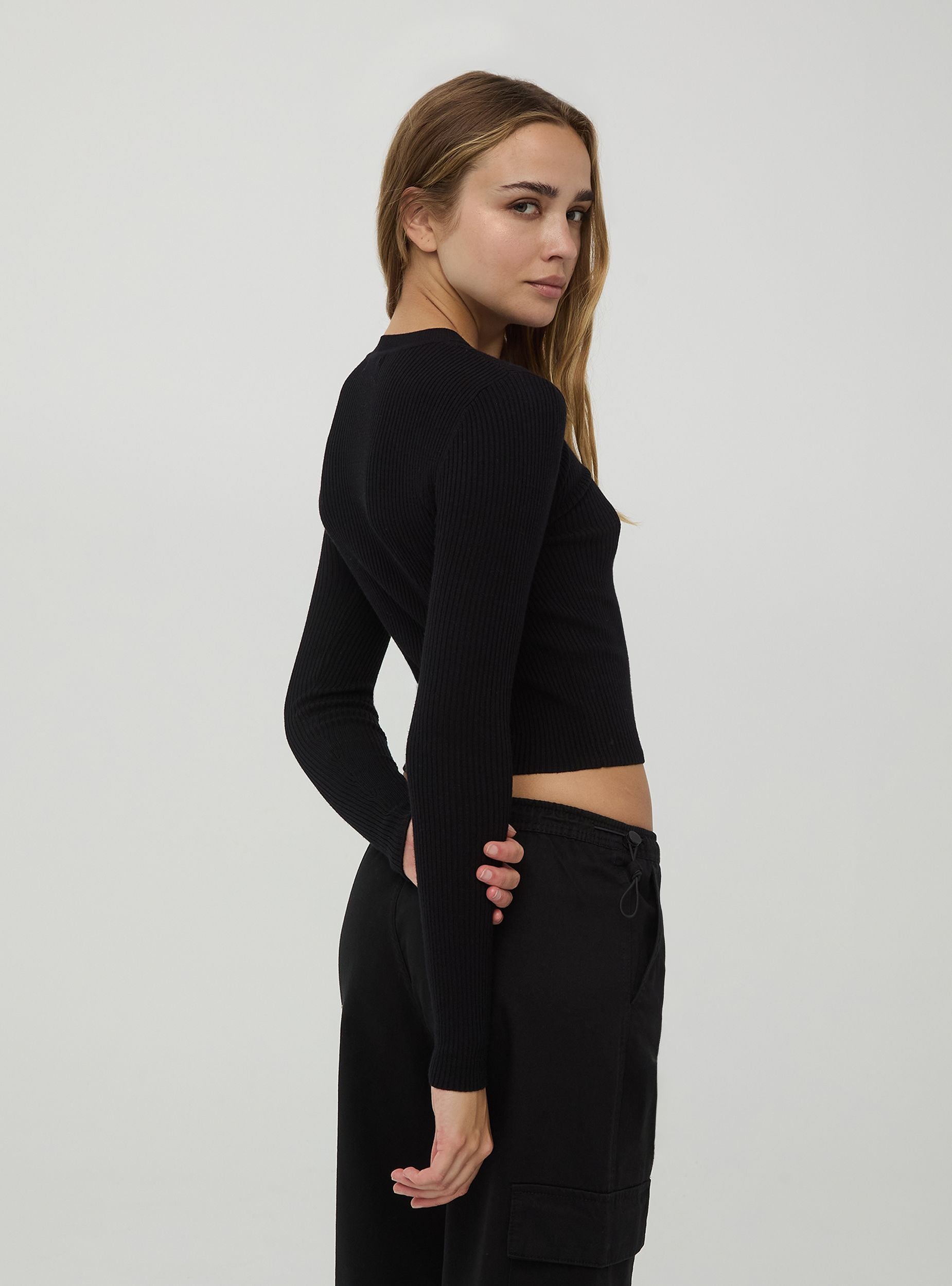 Top côtelé crop pour femme avec un design ajusté et moderne. Réalisé en tissu stretch côtelé, il garantit un ajustement parfait qui met en valeur la silhouette. Le haut est doté de manches longues et d'un col légèrement montant, offrant un look élégant et contemporain. La longueur crop, qui se termine juste au-dessus de la taille, rend ce haut idéal pour créer des tenues à la mode.Détails