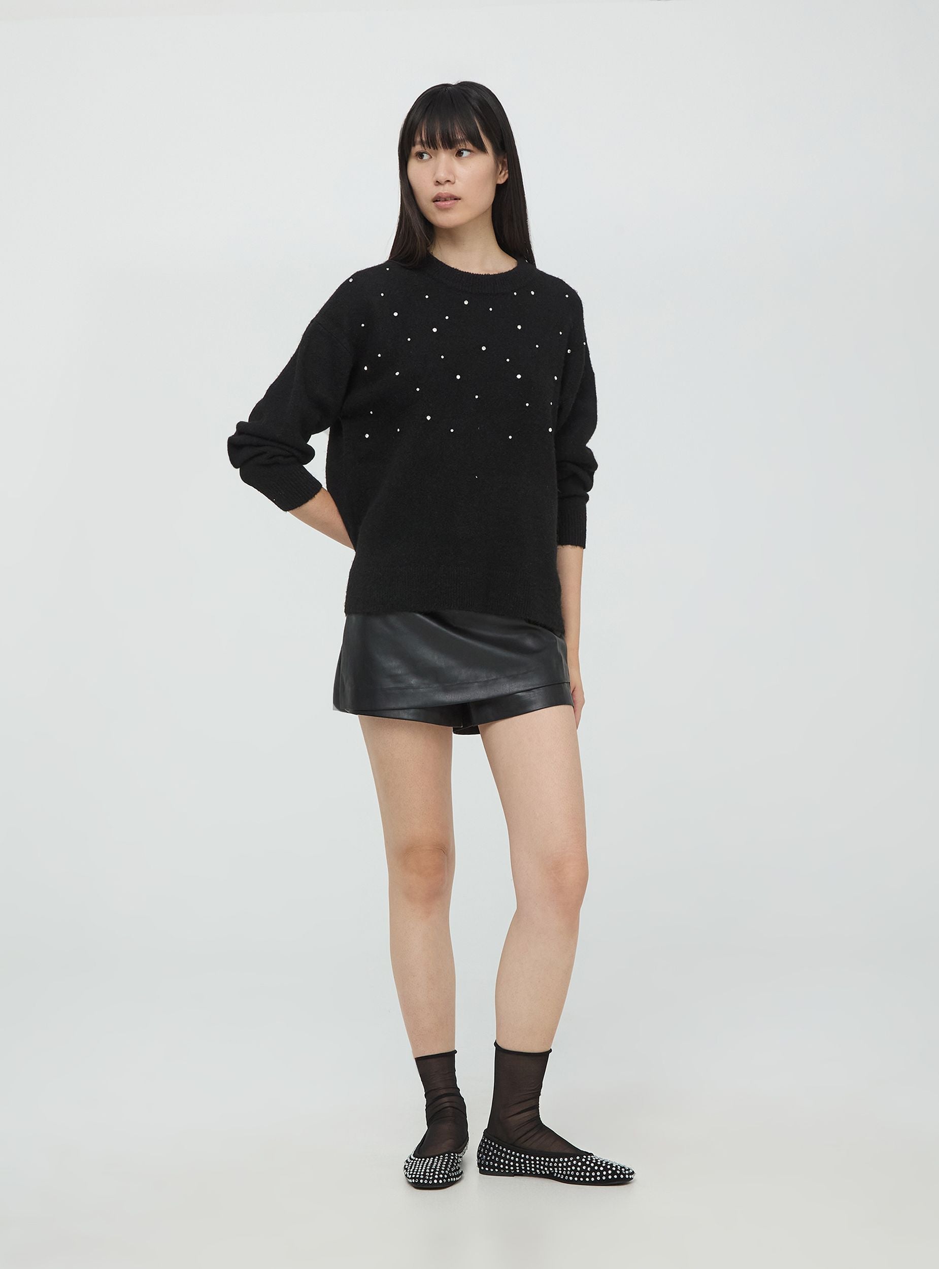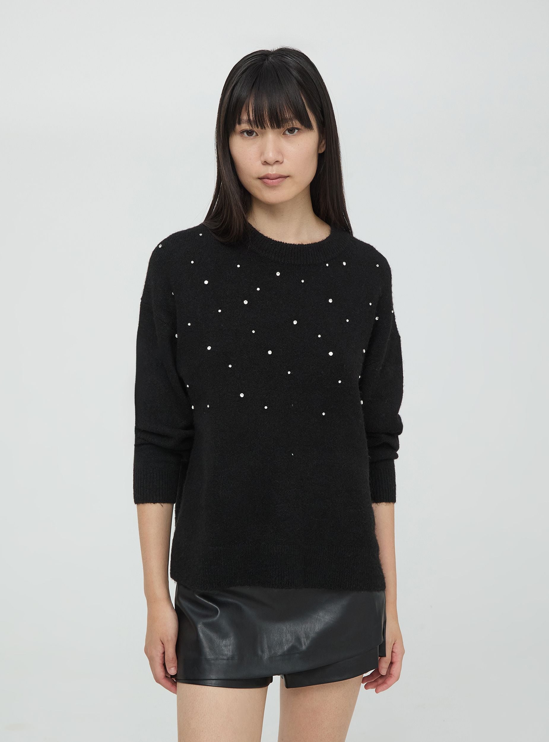 T-shirt femme à manches longues avec col rond, réalisée en tissu uni avec des applications de strass. Pièce incontournable à avoir dans votre garde-robe. Coupe ample.Détails