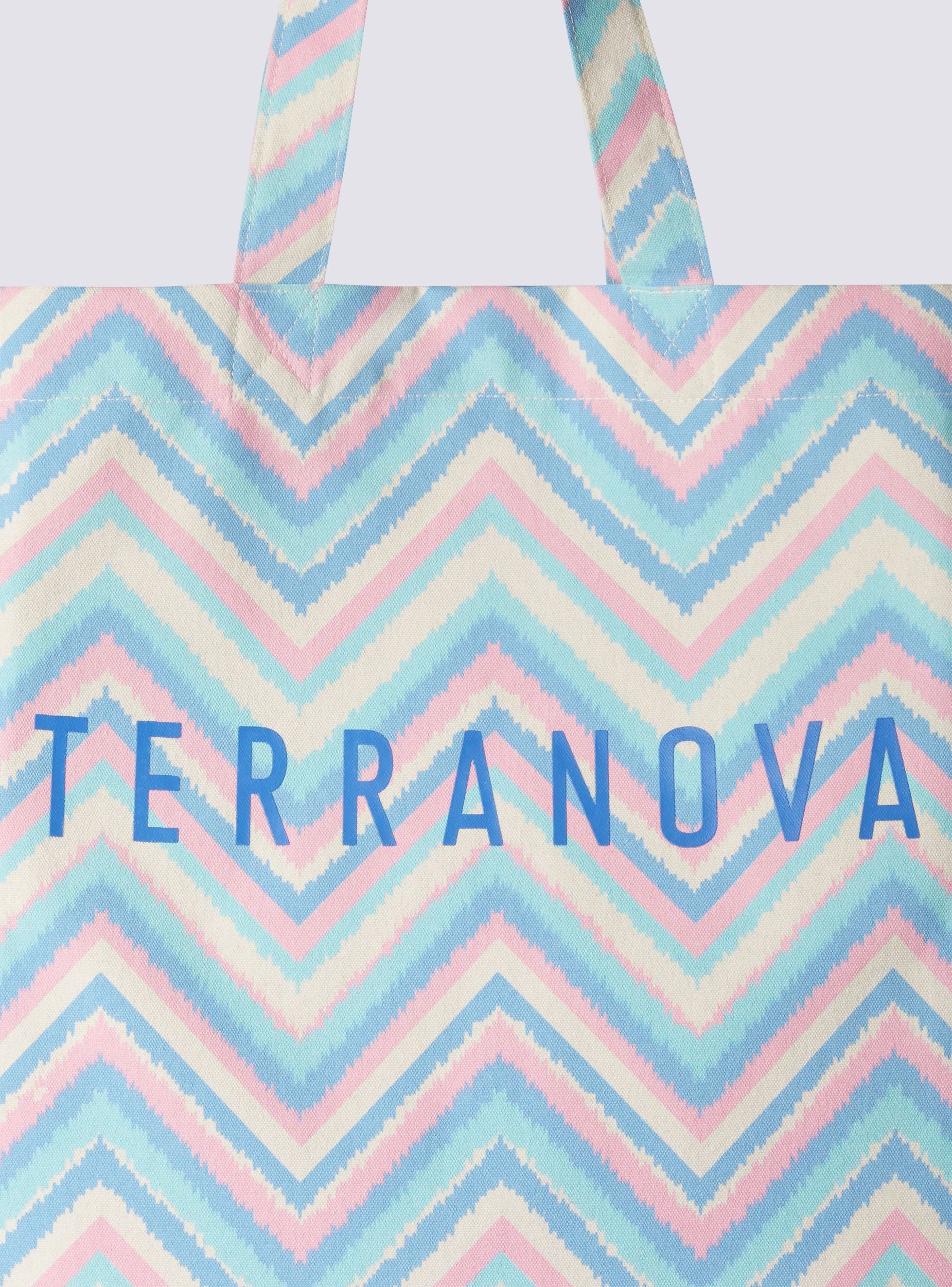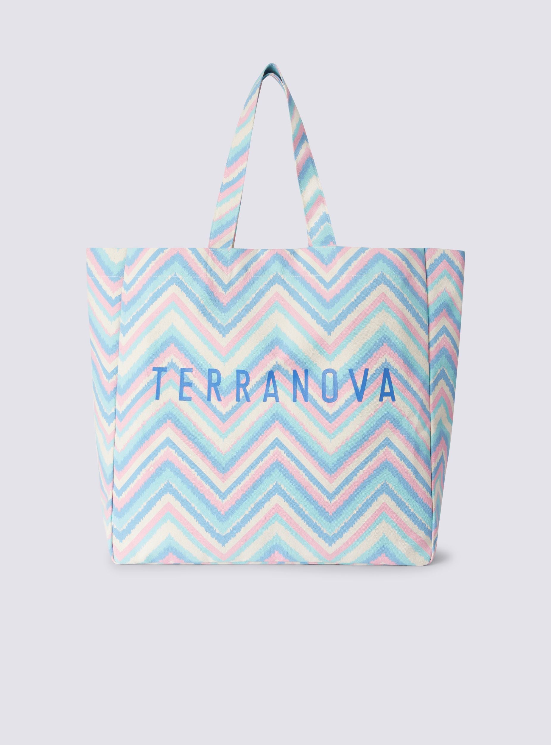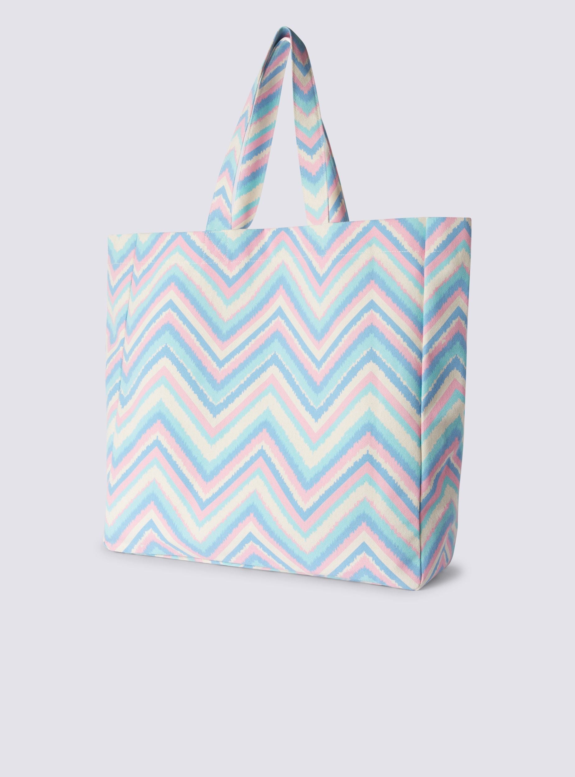 Sac shopping en toile pour femme au design tendance et polyvalent, caractérisé par un motif chevron vif et un imprimé multicolore qui ajoute une touche dynamique et à la mode. Le logo en évidence lui donne du caractère, la rendant parfaite pour les loisirs, les journées de shopping ou comme accessoire pratique et stylé pour la plage. Spacieuse et légère, elle s'associe avec des tenues décontractées, estivales et relaxées. Dimensions : Hauteur 47,5 cm, Longueur 47 cm, Profondeur 14 cm.Détails