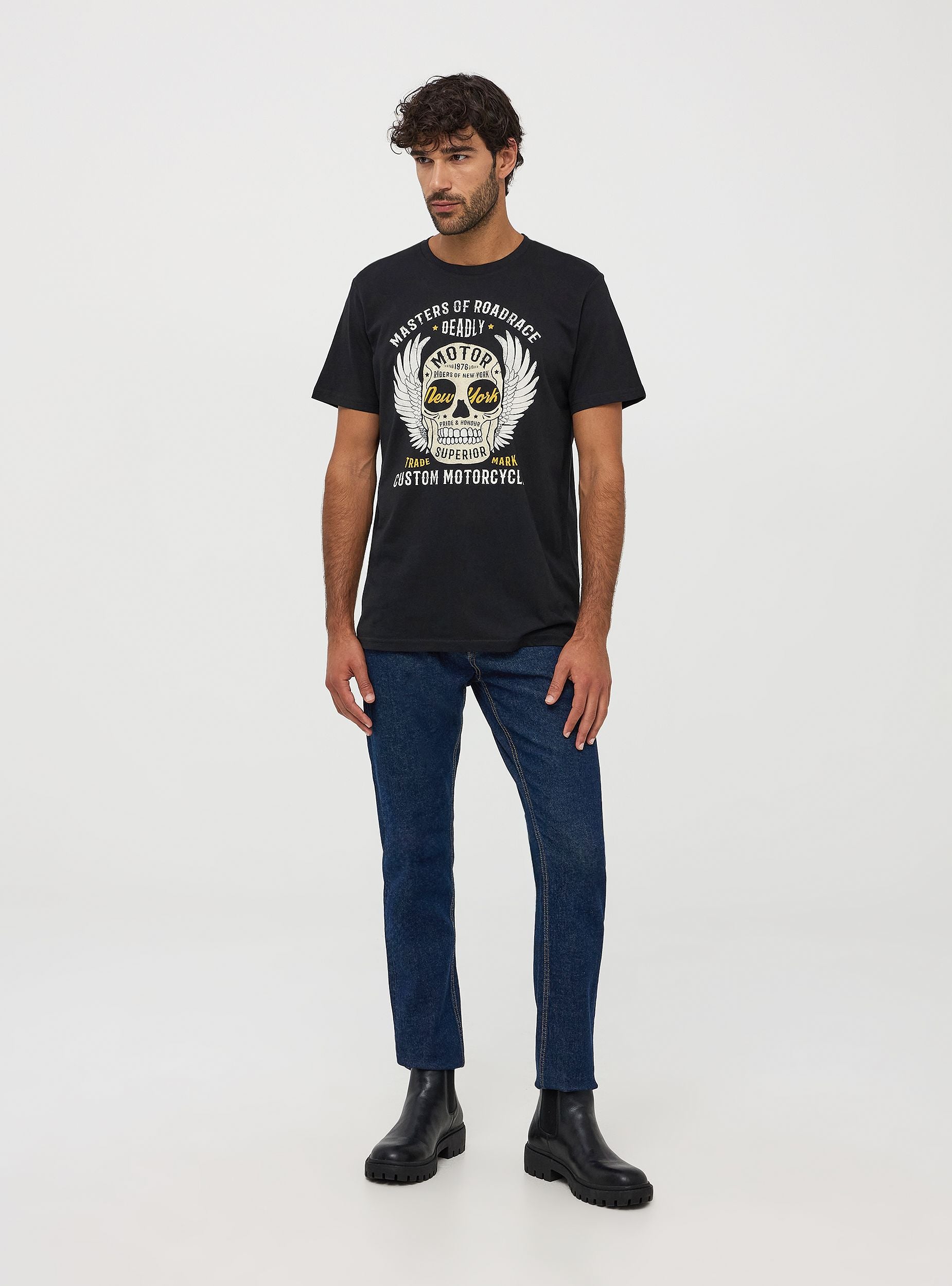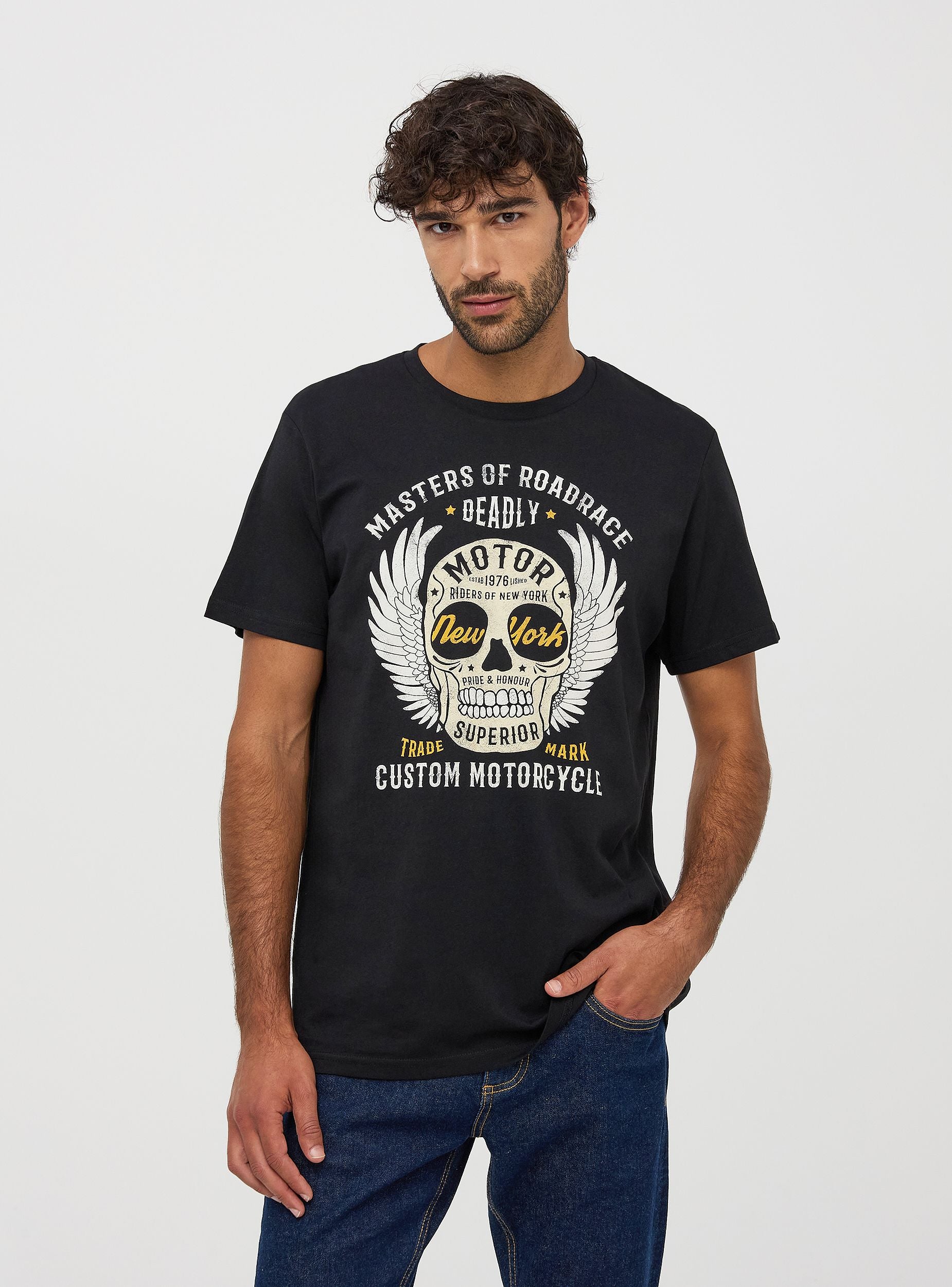 T-shirt pour homme en jersey de coton avec impression de crâne et écriture. Modèle col rond avec manches courtes. Coupe régulière.Détails