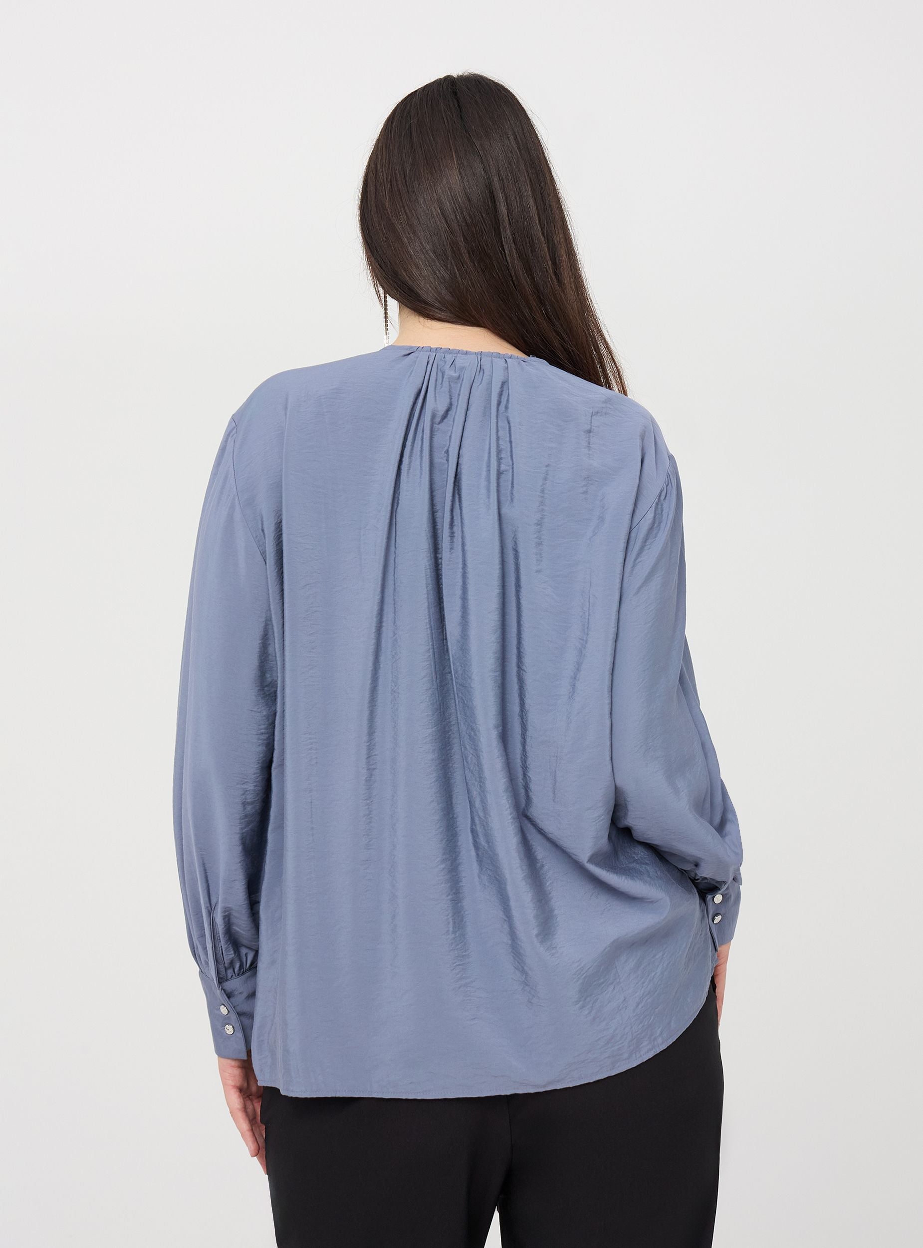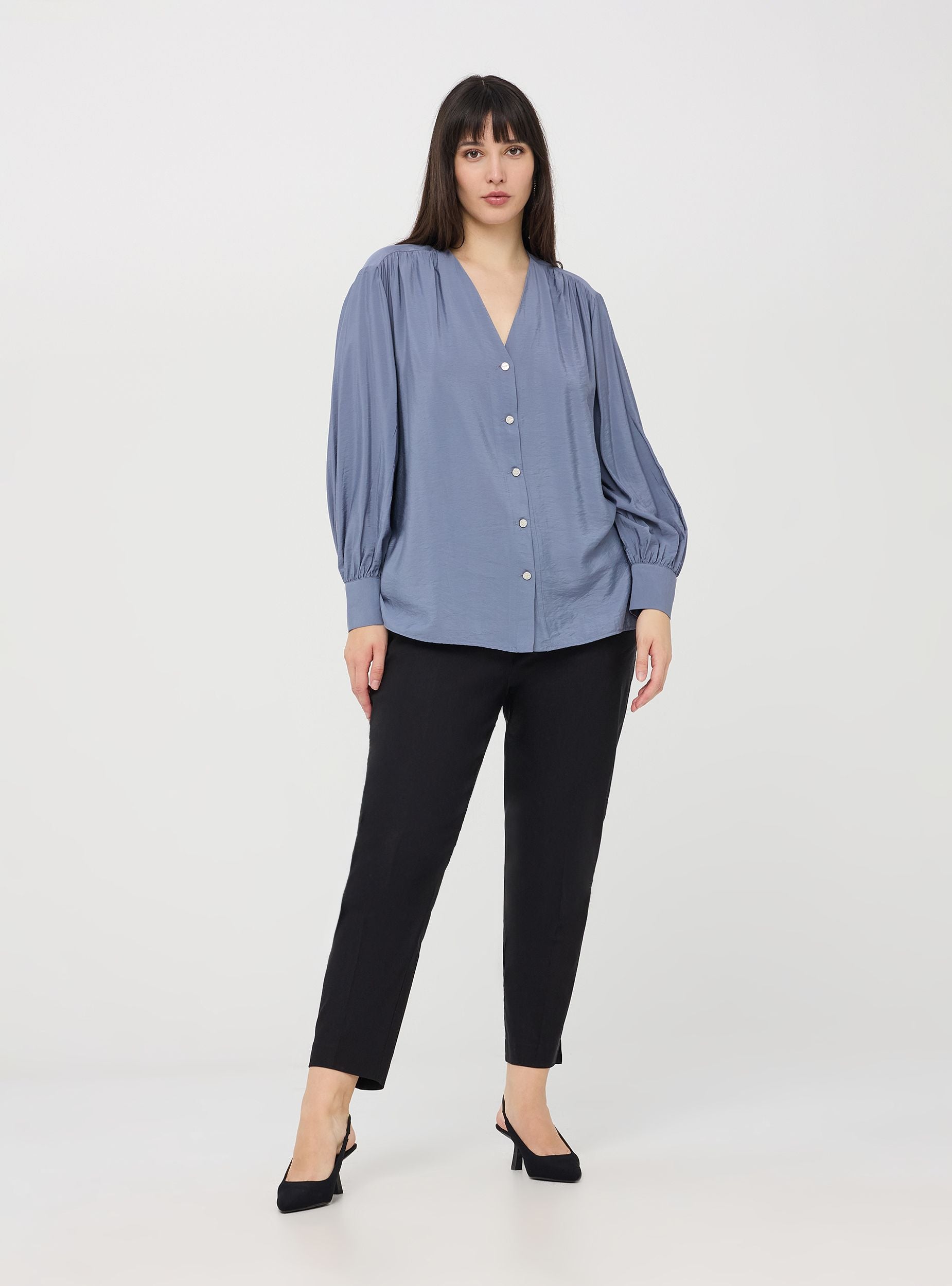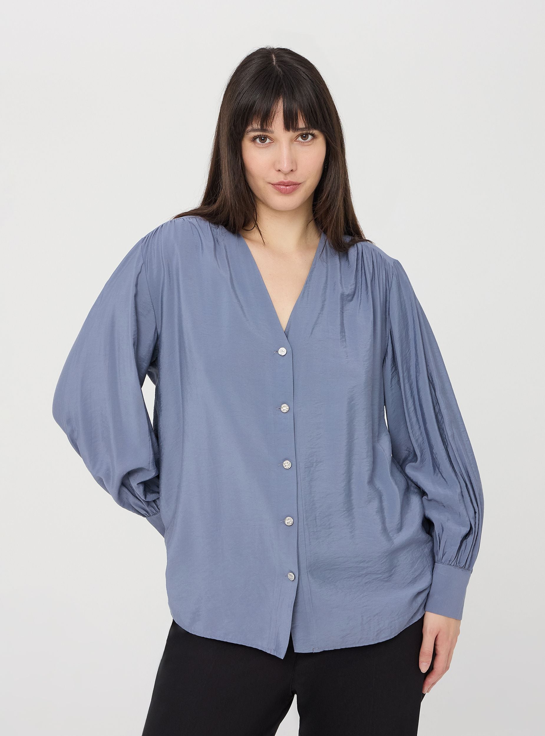 Chemisier pour femme caractérisé par un design sophistiqué avec un décolleté en V, des boutons décoratifs à l'avant et des manches longues qui se resserrent aux poignets. La coupe est douce et fluide, parfaite pour un look chic et à la mode. Polyvalente et raffinée, elle est idéale pour des occasions formelles, des événements en soirée et des looks de bureau.Détails