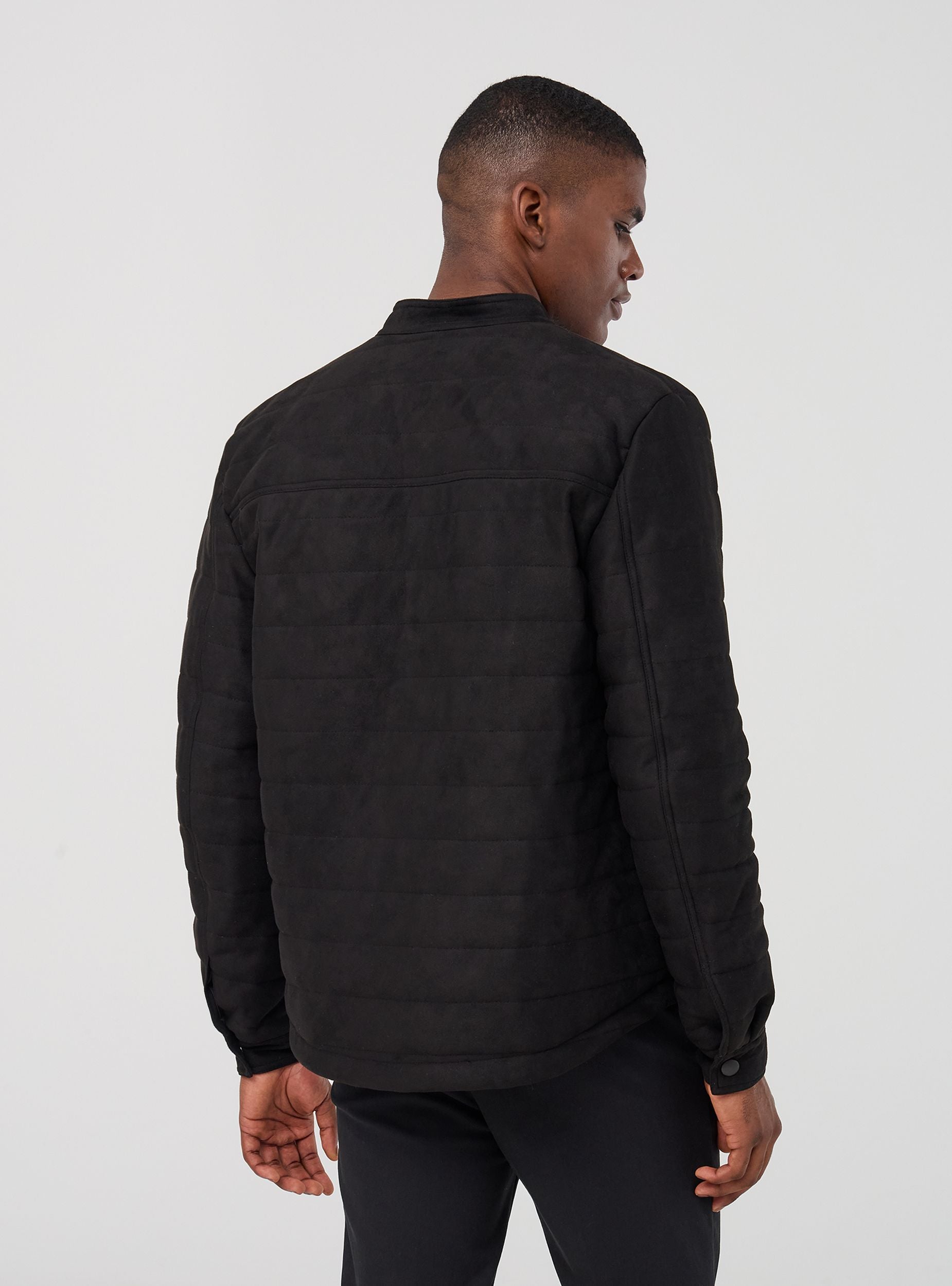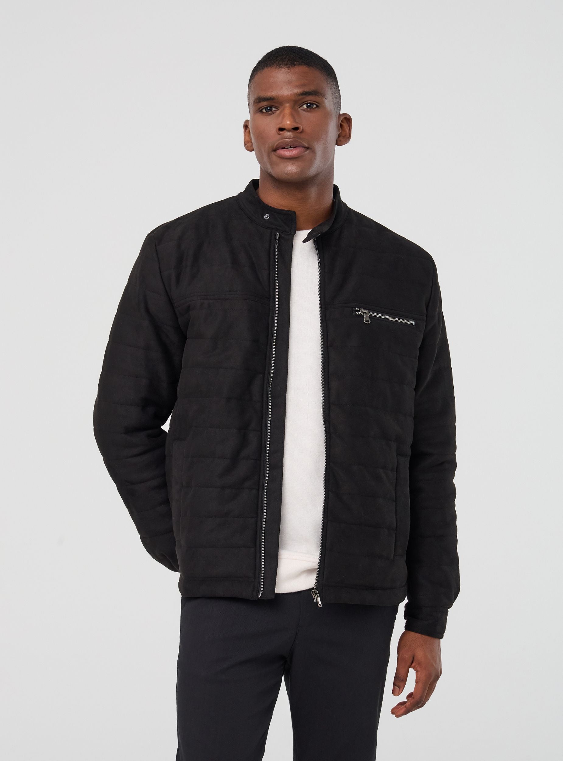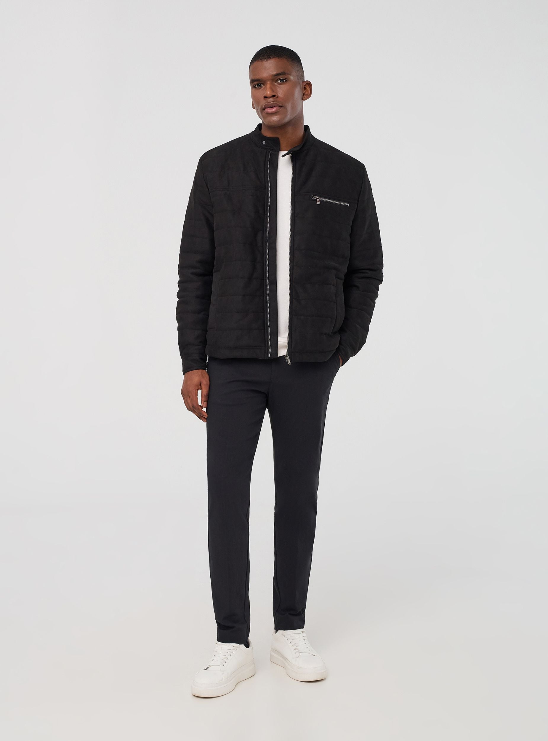Veste pour homme au design moderne et minimaliste, en tissu effet dainé. Elle se caractérise par un rembourrage matelassé offrant un look élégant et fonctionnel. La veste a une fermeture éclair frontale qui s'étend jusqu'au col coréen avec bouton à pression. Sur la poitrine, il y a une poche avec fermeture éclair horizontale, ajoutant un détail pratique au design. Les manches sont dotées d'une fermeture à bouton au poignet pour un ajustement réglable. La veste combine style et fonctionnalité, adaptée à un usage quotidien comme à des occasions décontractées.