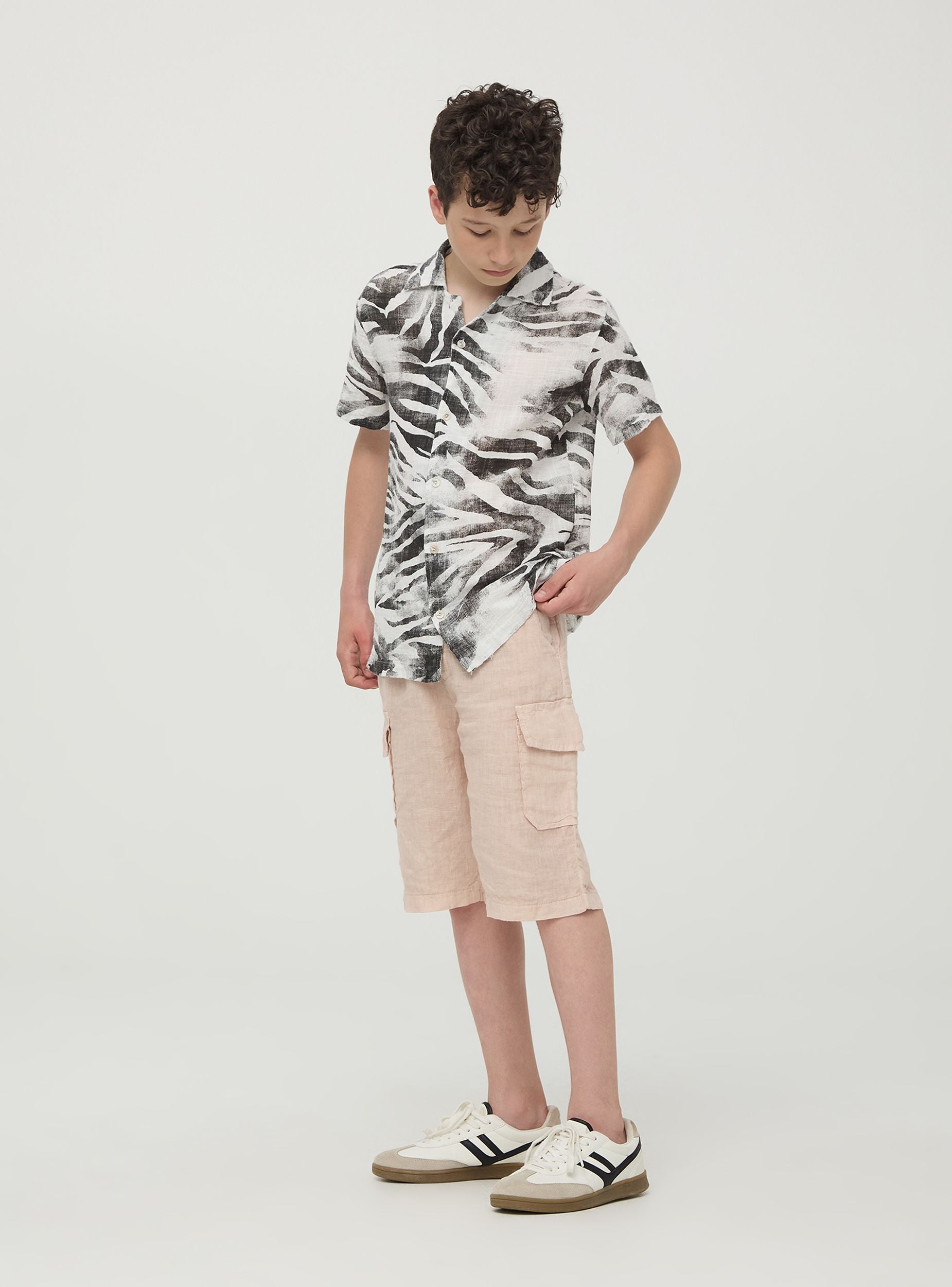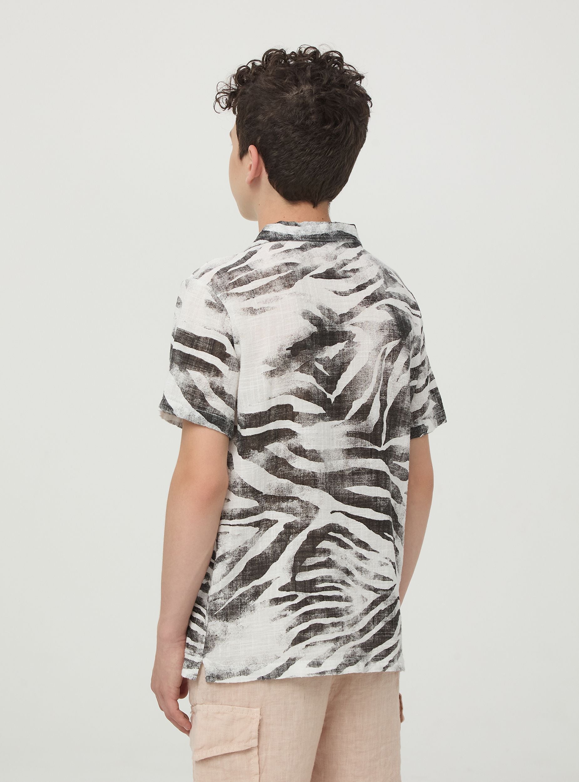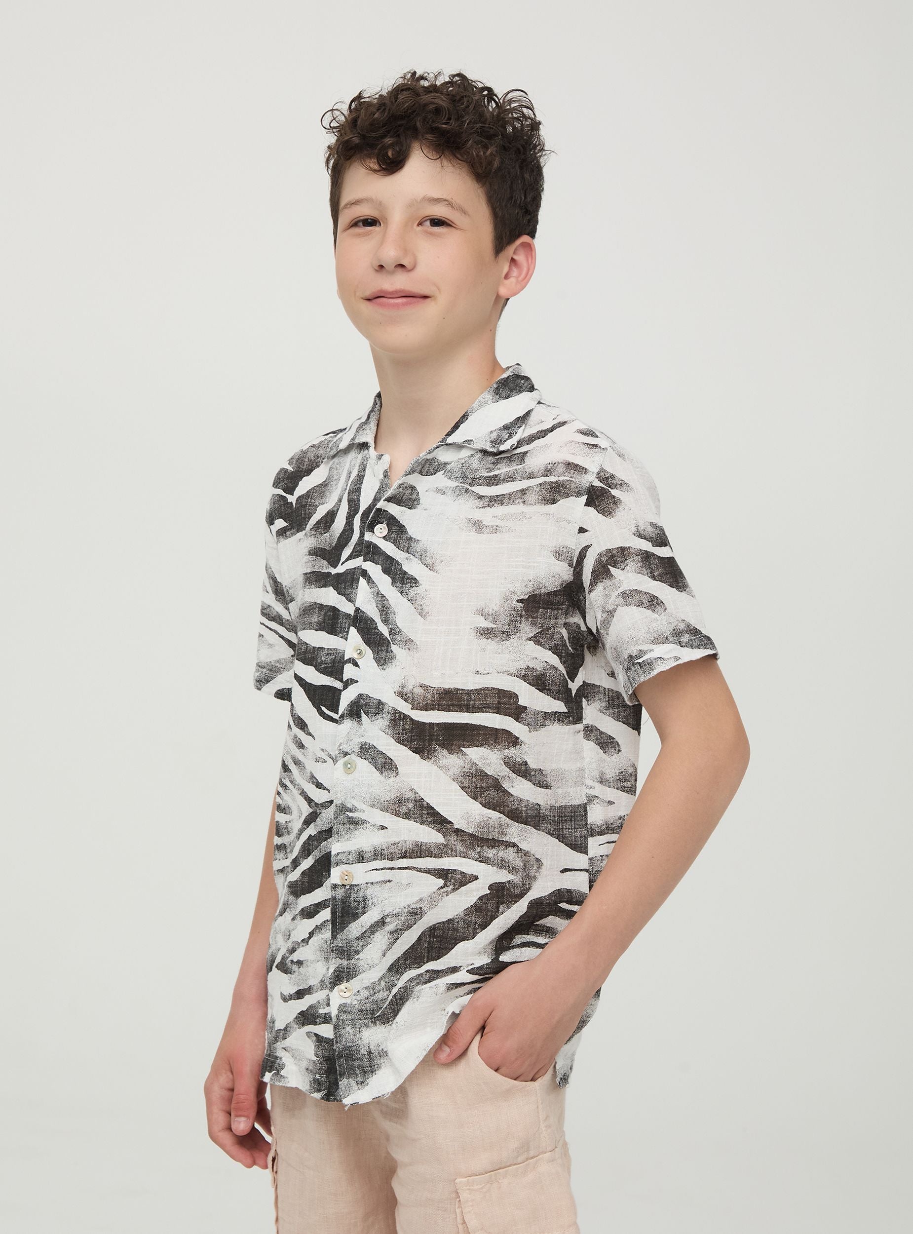 Chemise pour enfant avec imprimé savane, réalisée en tissu léger et respirant, idéale pour les journées les plus chaudes. Modèle à manches courtes avec fermeture à boutons. Parfaite pour les vacances d'été, les sorties à la mer ou pour ajouter une touche de fraîcheur à n'importe quelle tenue décontractée.Détails