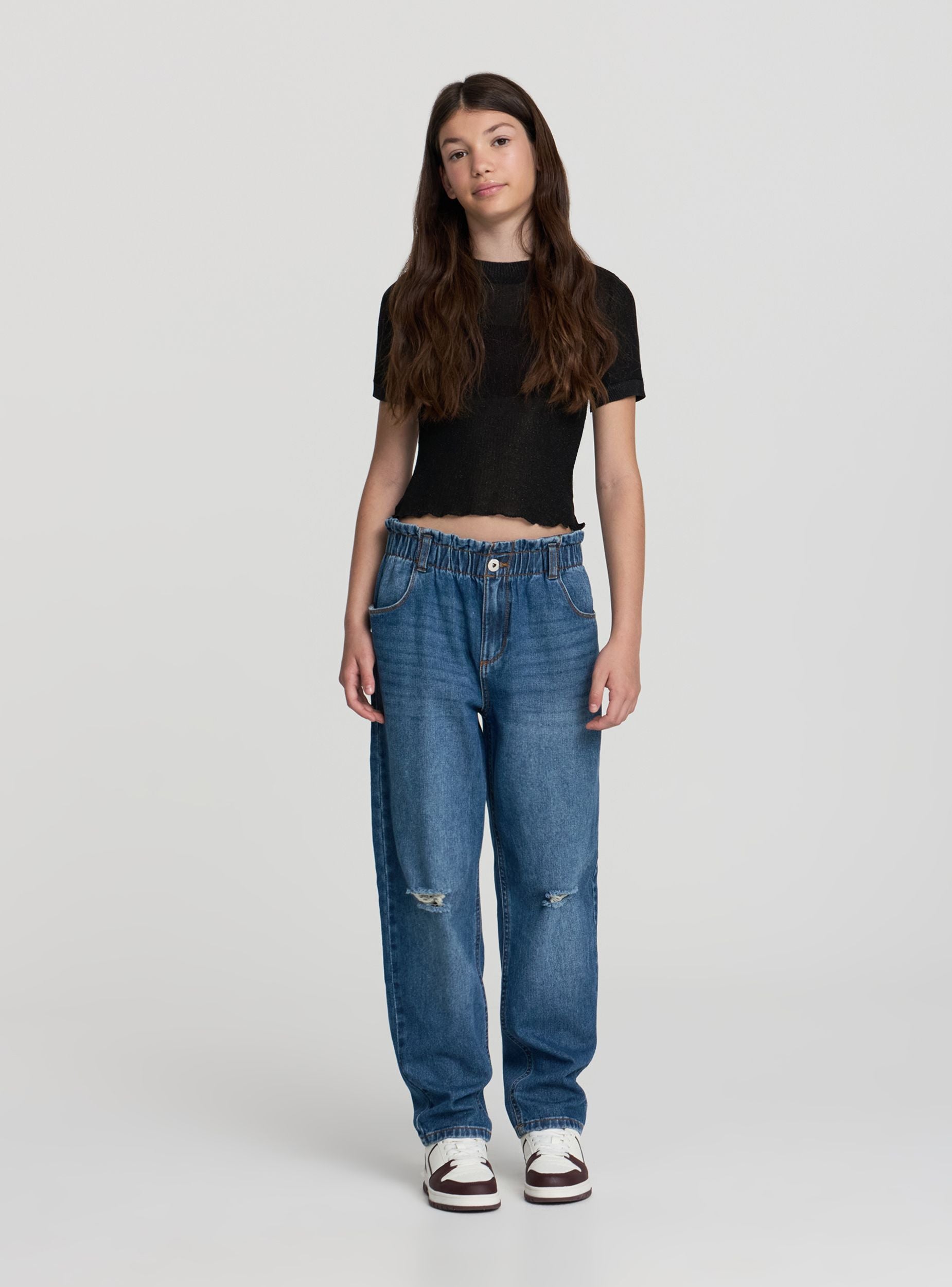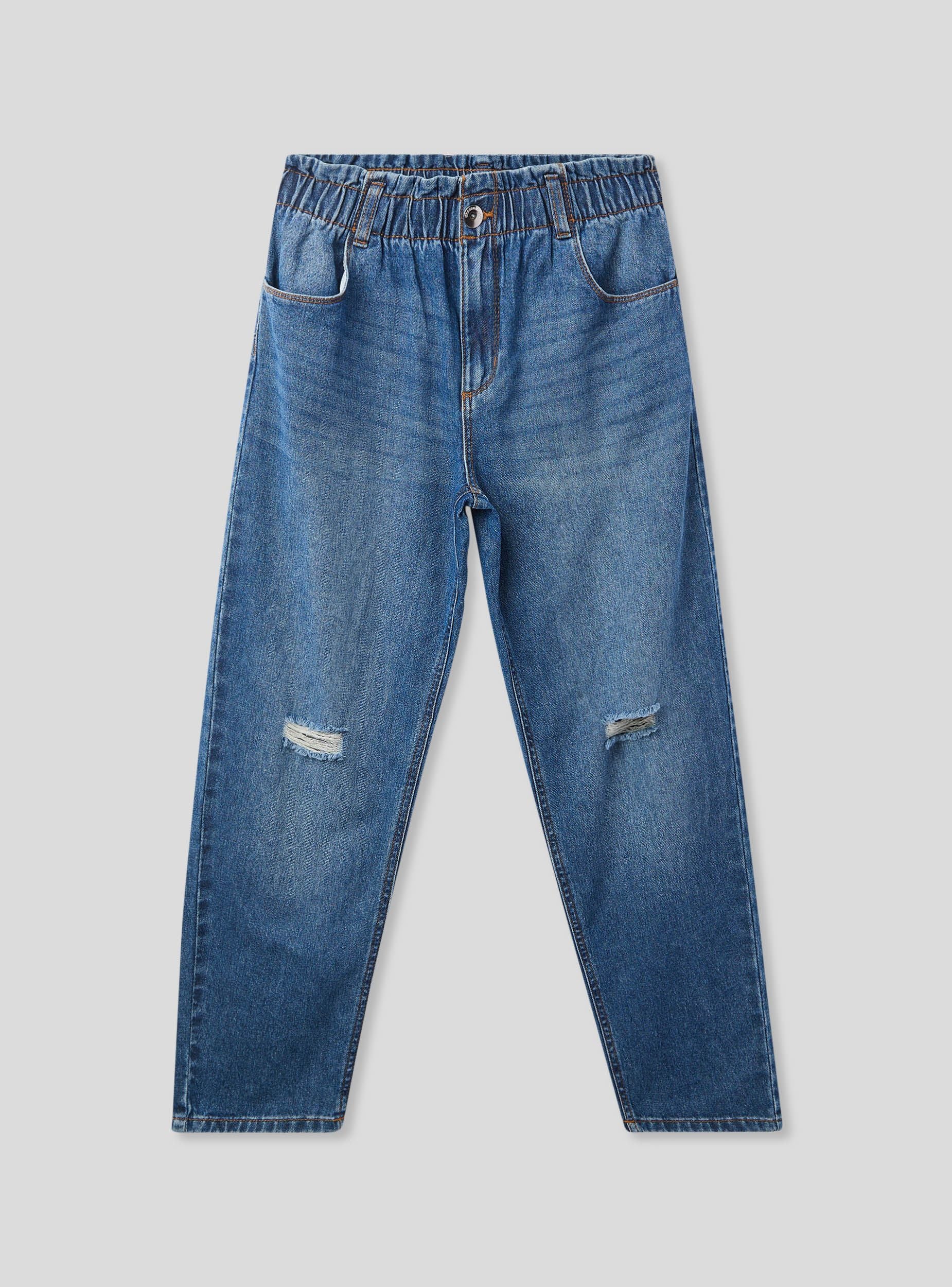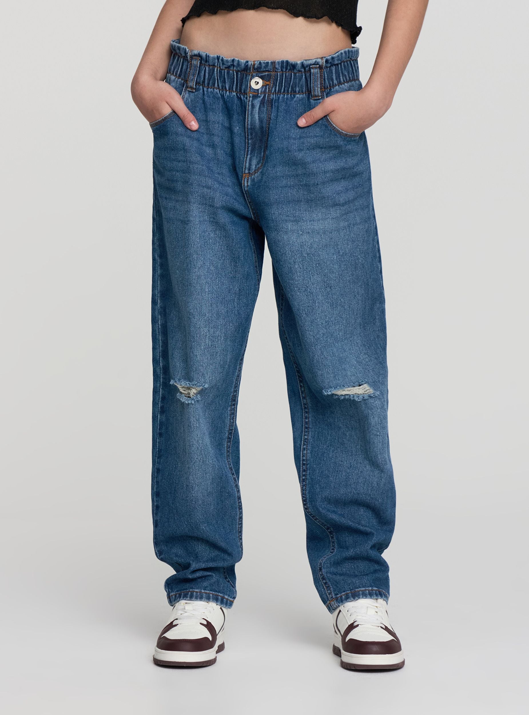 Jeans pour fille à coupe balloon avec taille paperbag, parfaits pour un look confortable et tendance. Caractérisés par des déchirures qui ajoutent une touche audacieuse, ils ont des passants à la taille, une fermeture éclair et un bouton, ainsi qu'un élastique intérieur pour un ajustement optimal. Idéaux à associer avec des sweats et des baskets pour les loisirs ou avec des pulls et des bottines pour une tenue plus soignée. Adaptés aux occasions informelles et aux journées dynamiques.