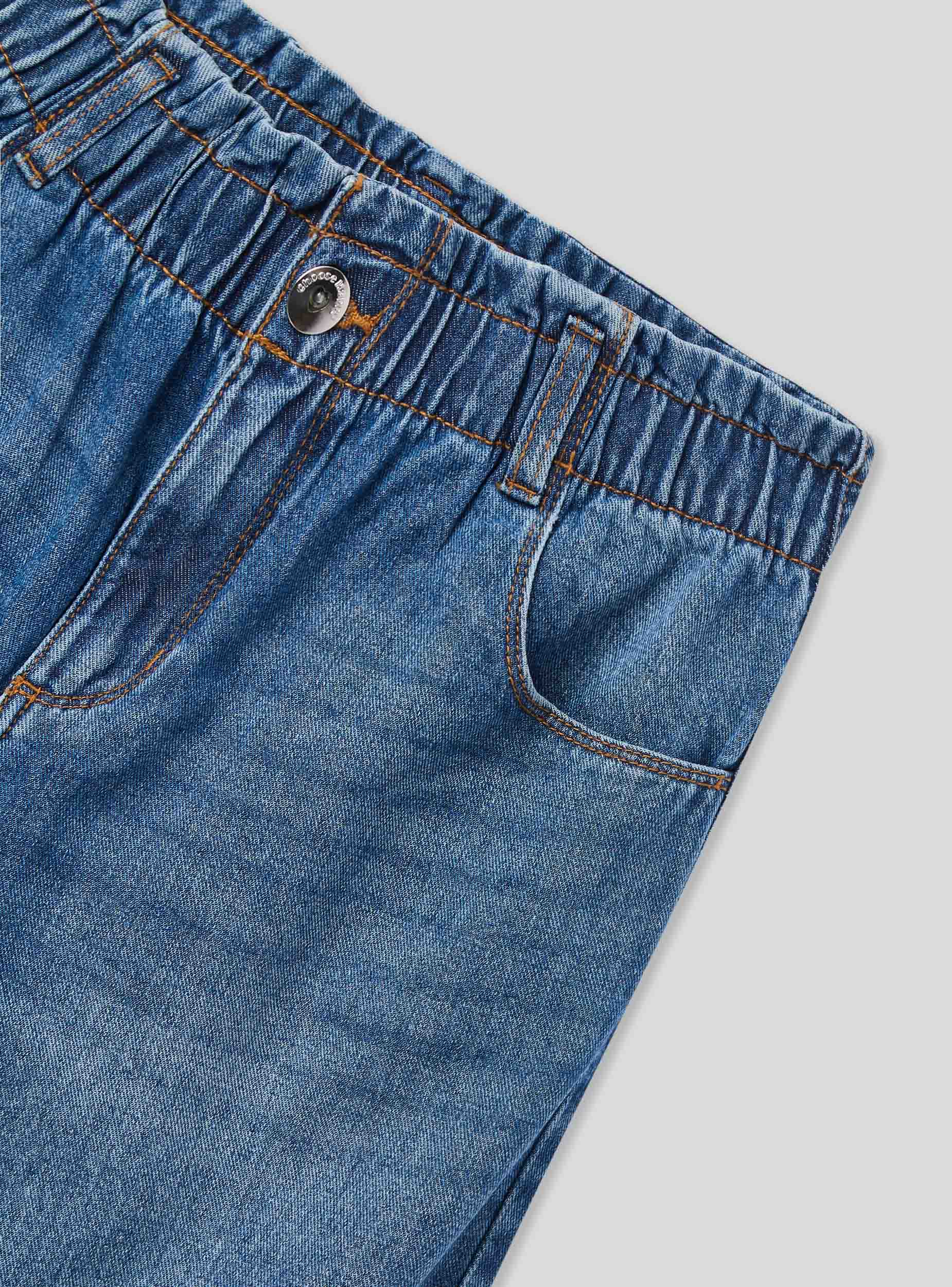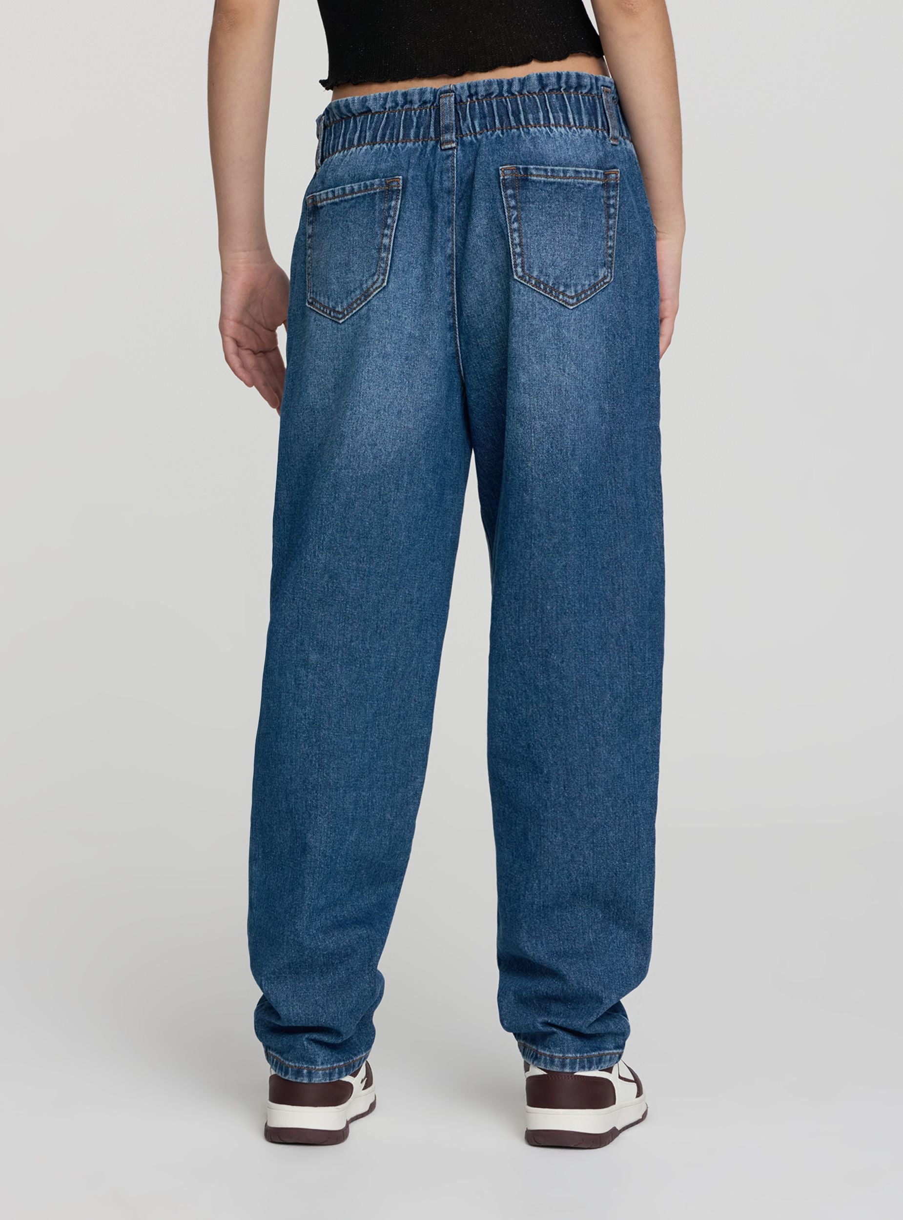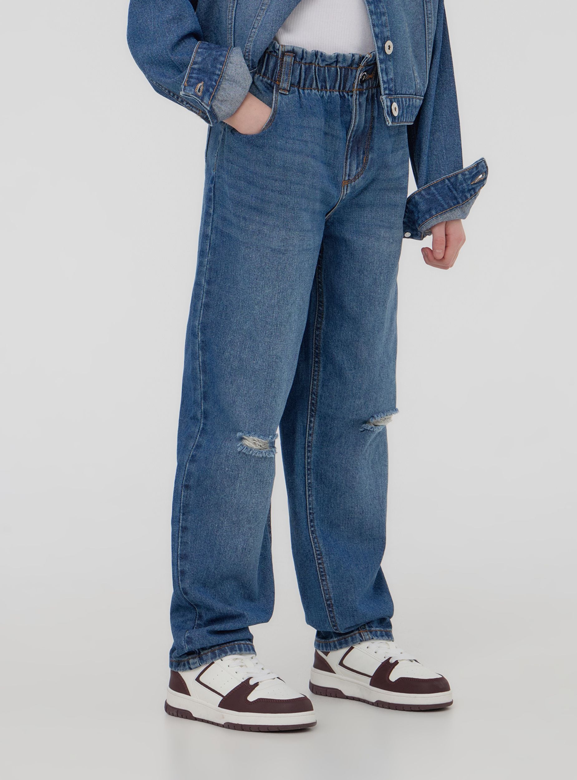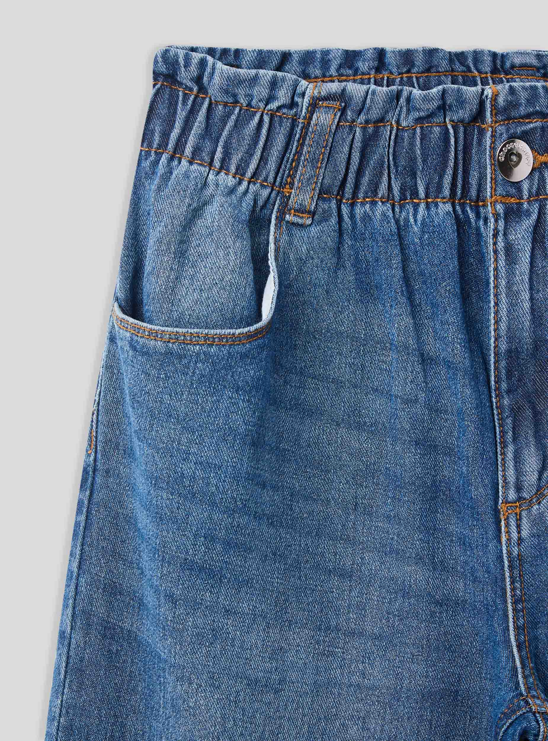 Jeans pour fille à coupe balloon avec taille paperbag, parfaits pour un look confortable et tendance. Caractérisés par des déchirures qui ajoutent une touche audacieuse, ils ont des passants à la taille, une fermeture éclair et un bouton, ainsi qu'un élastique intérieur pour un ajustement optimal. Idéaux à associer avec des sweats et des baskets pour les loisirs ou avec des pulls et des bottines pour une tenue plus soignée. Adaptés aux occasions informelles et aux journées dynamiques.