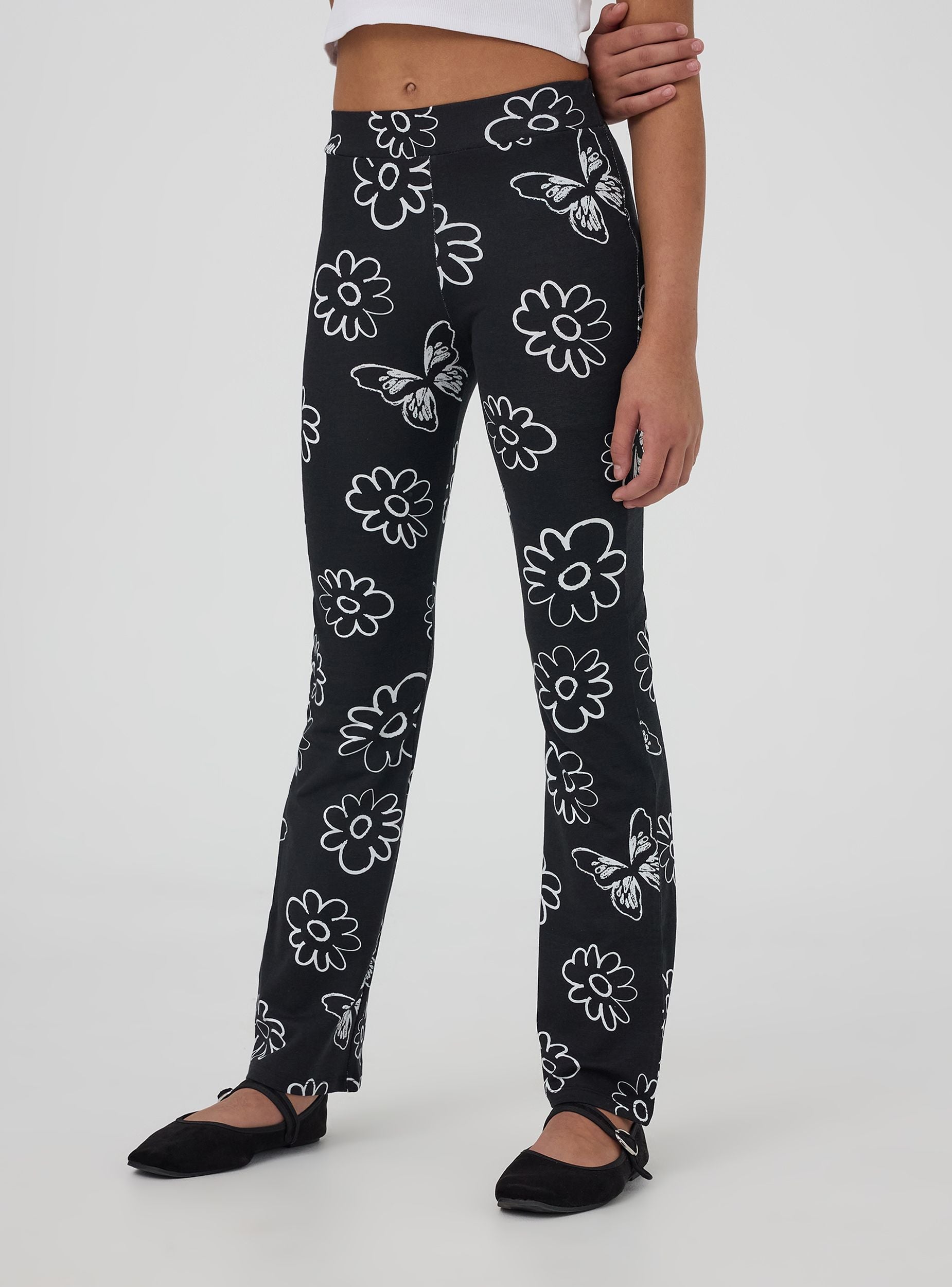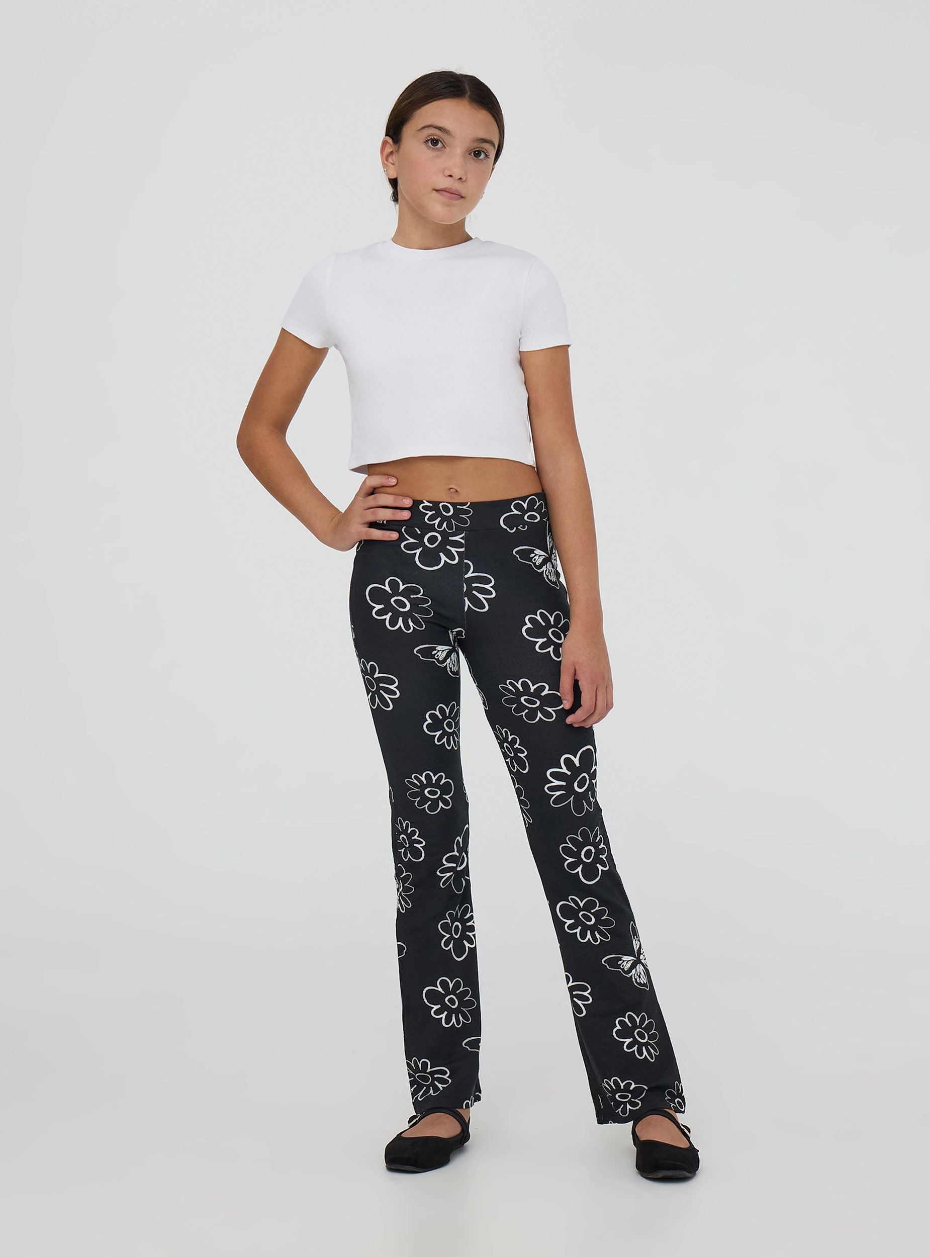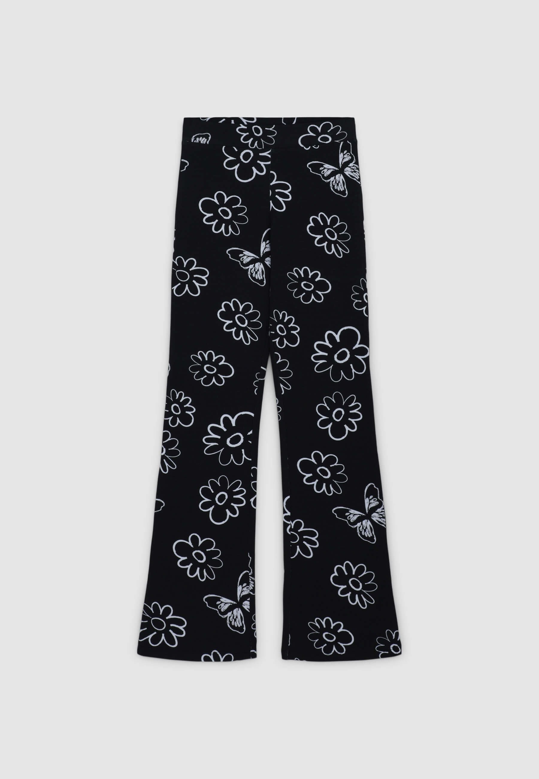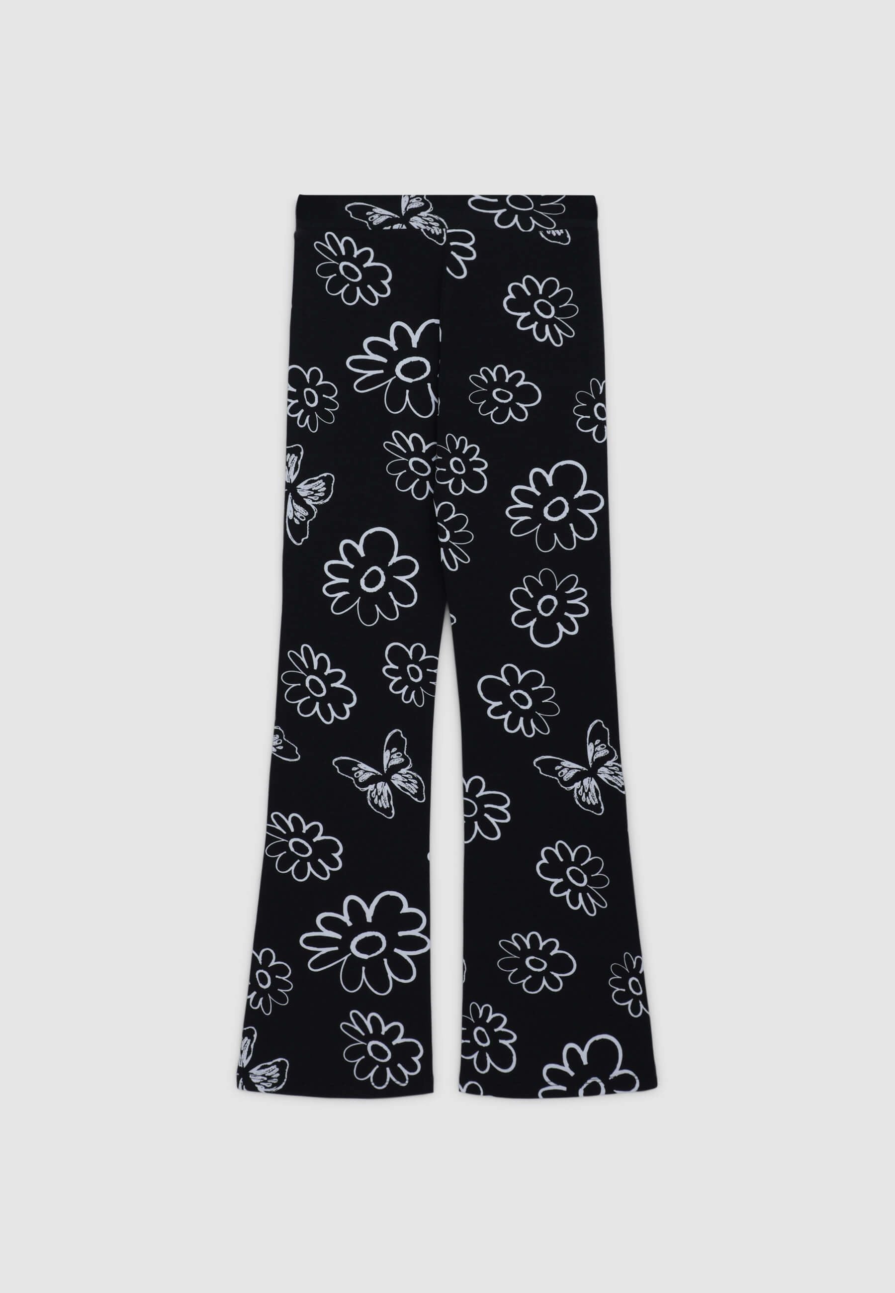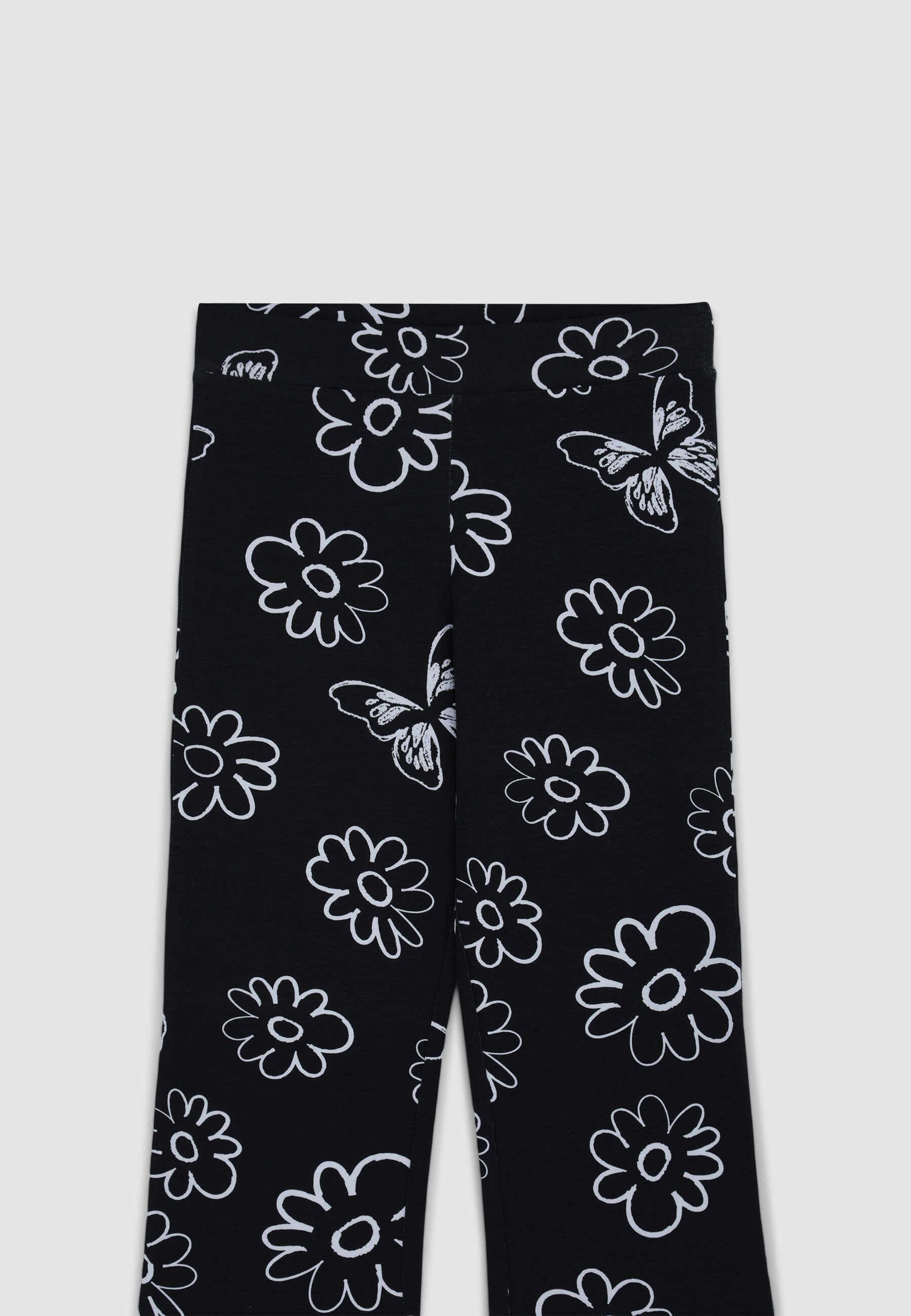 Leggings pour fille avec un design à motifs caractérisé par de grandes fleurs stylisées et des papillons répartis sur toute la surface. Les leggings présentent une coupe longue et une coupe ajustée jusqu'à la cuisse, avec une légère ouverture vers le bas en forme de cloche. Le motif graphique apporte une touche vive et joyeuse, idéale pour un look décontracté et amusant.Détails
