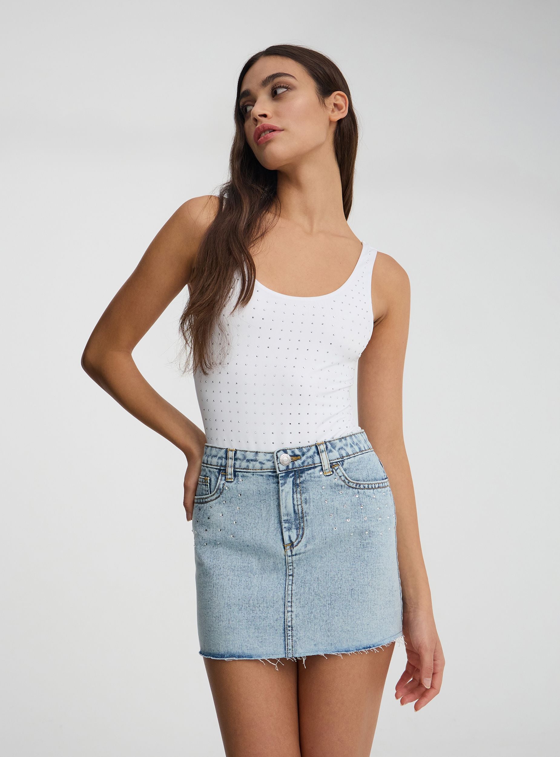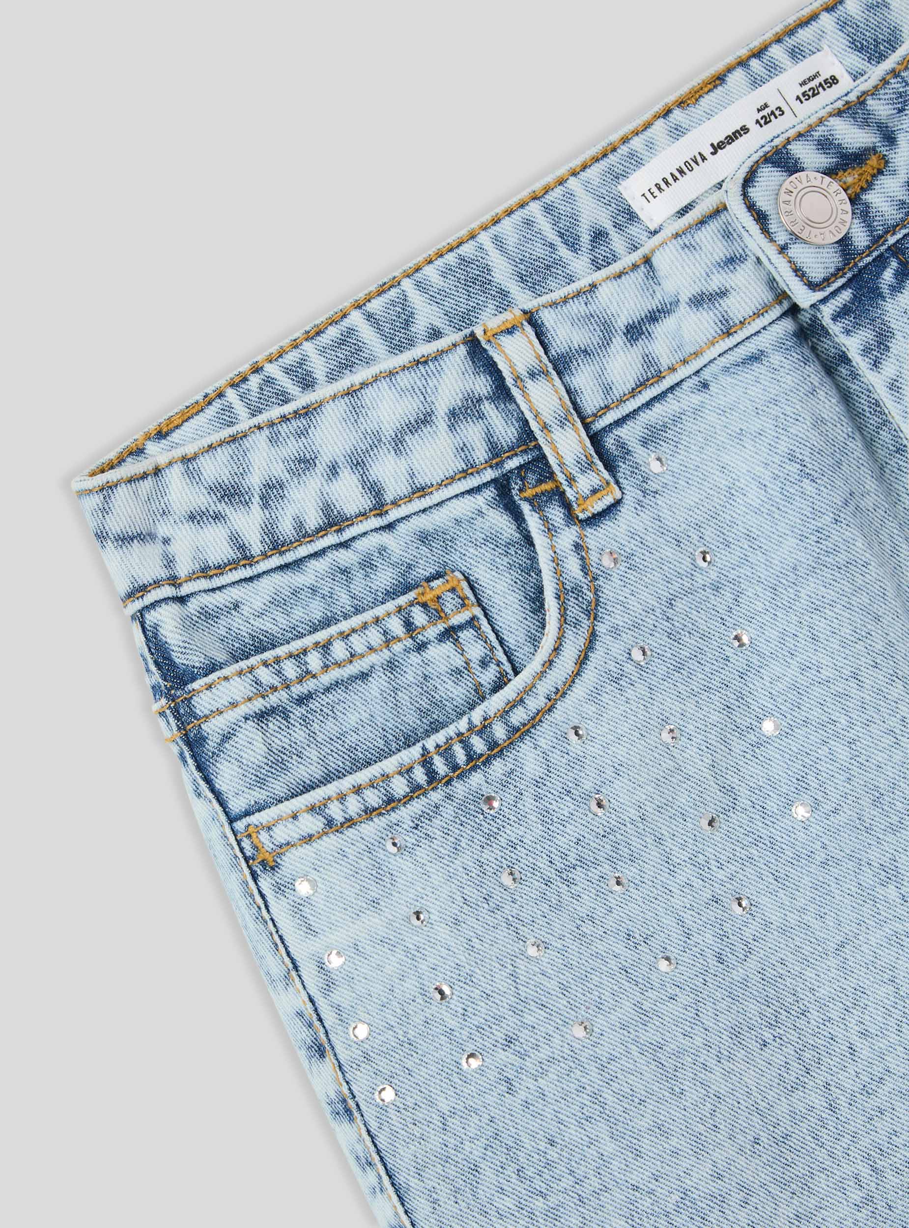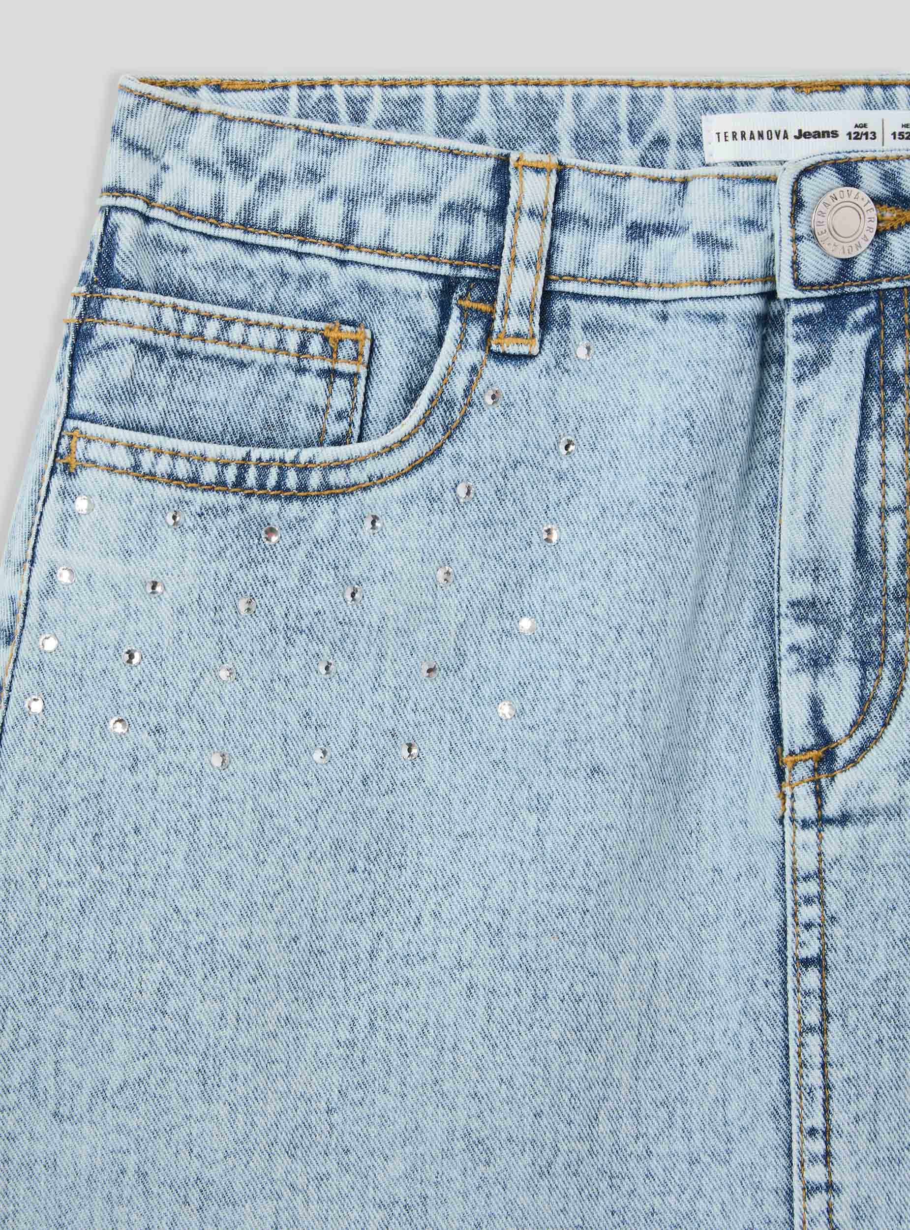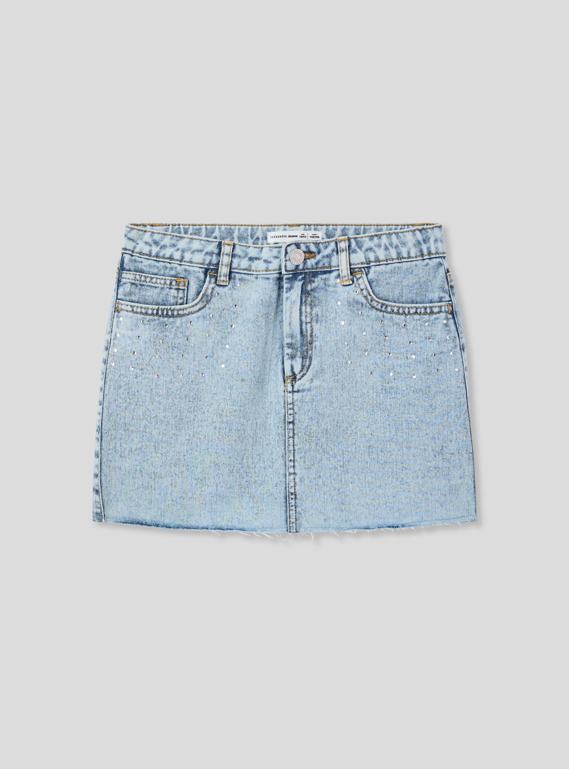 Jupe en denim pour fille avec des strass, caractérisée par une ligne casual-chic. Elle présente des passants à la taille pour l'ajout éventuel d'une ceinture et une fermeture à bouton à l'avant pour plus de praticité. Le design est complété par des poches confortables, parfaites pour ranger de petits objets. Idéale pour compléter des looks estivaux et dynamiques.Détails