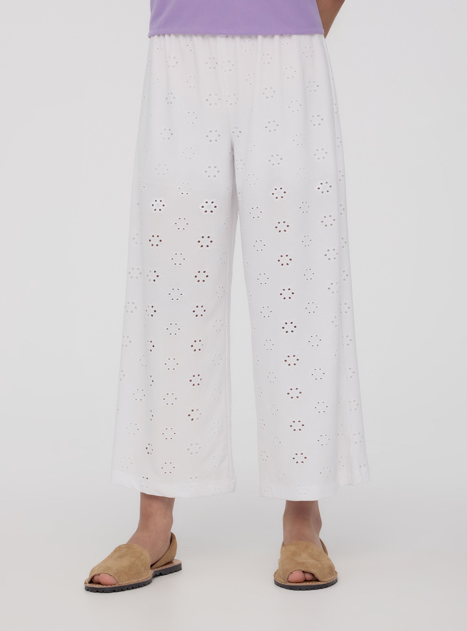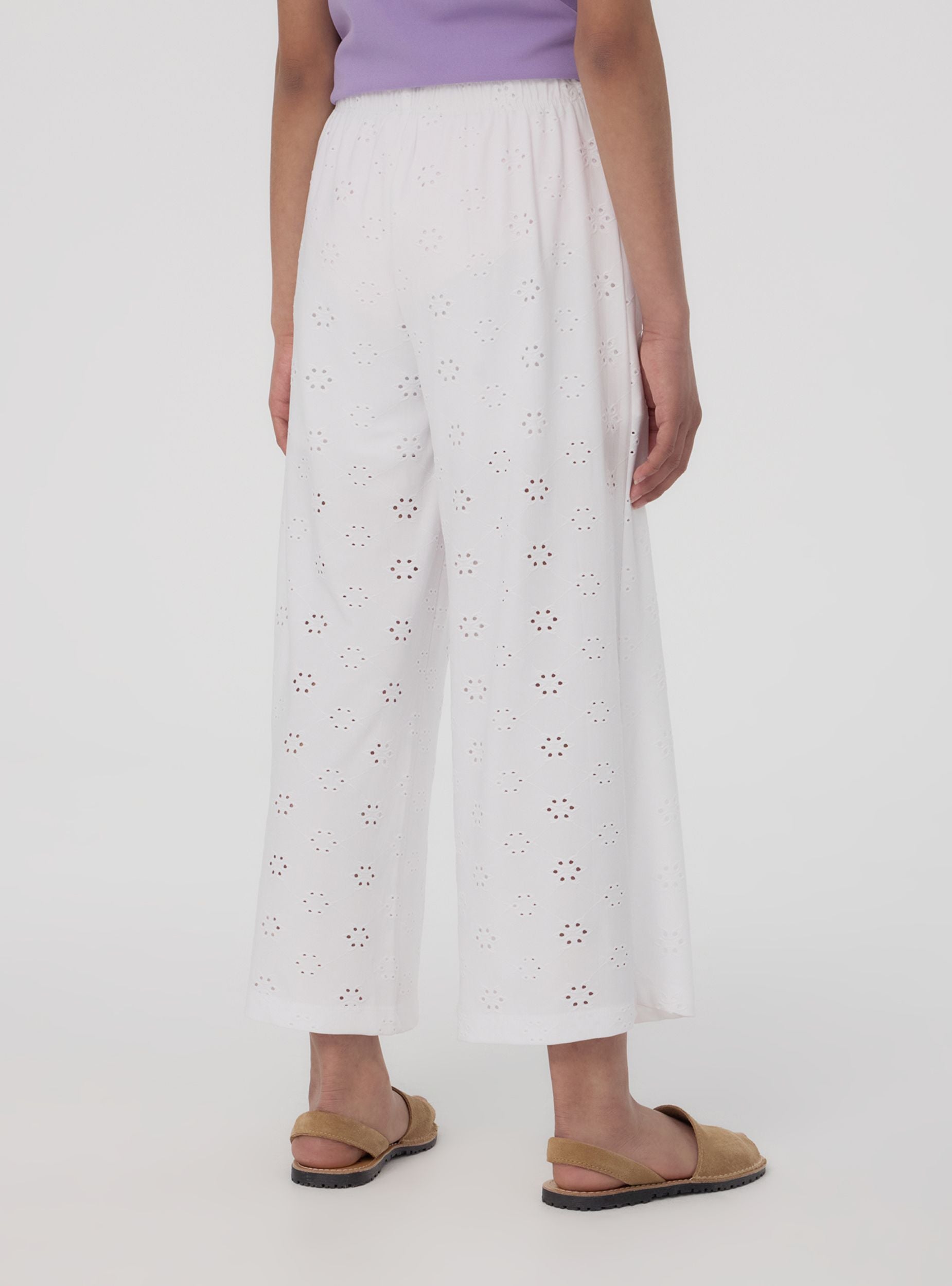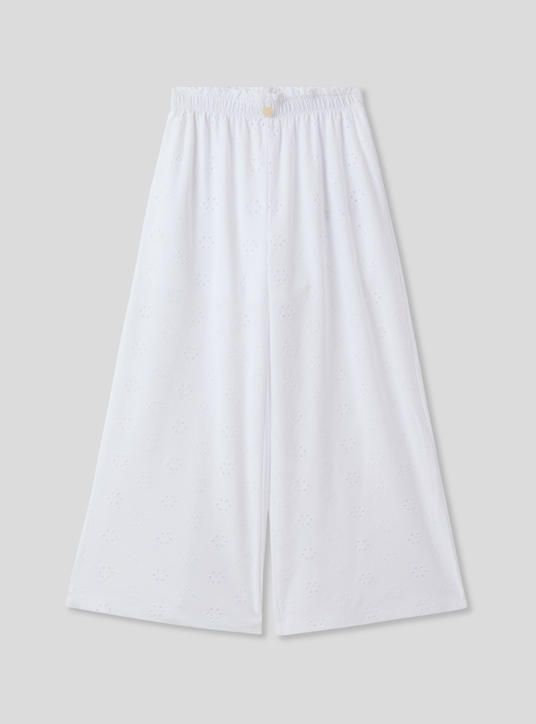 Pantalons longs pour fille au design large, parfaits pour les journées d'été grâce à leur coupe légère et confortable. Le motif broderie anglaise apporte une touche raffinée et délicate, idéale pour créer des looks romantiques et frais. Parfaits avec un blouse et des sandales pour une occasion spéciale ou avec un t-shirt et des baskets pour une tenue quotidienne au charme intemporel.Détails